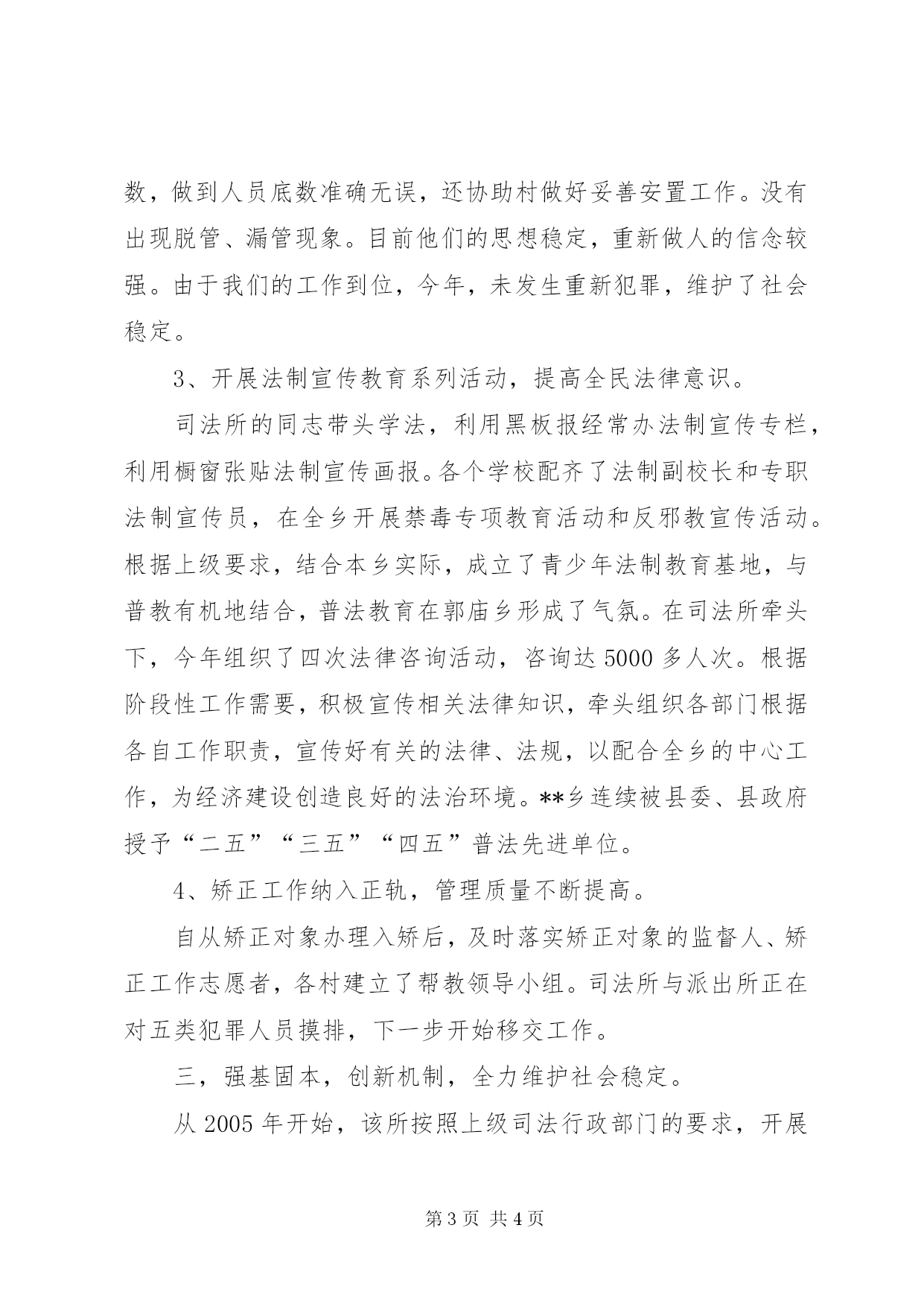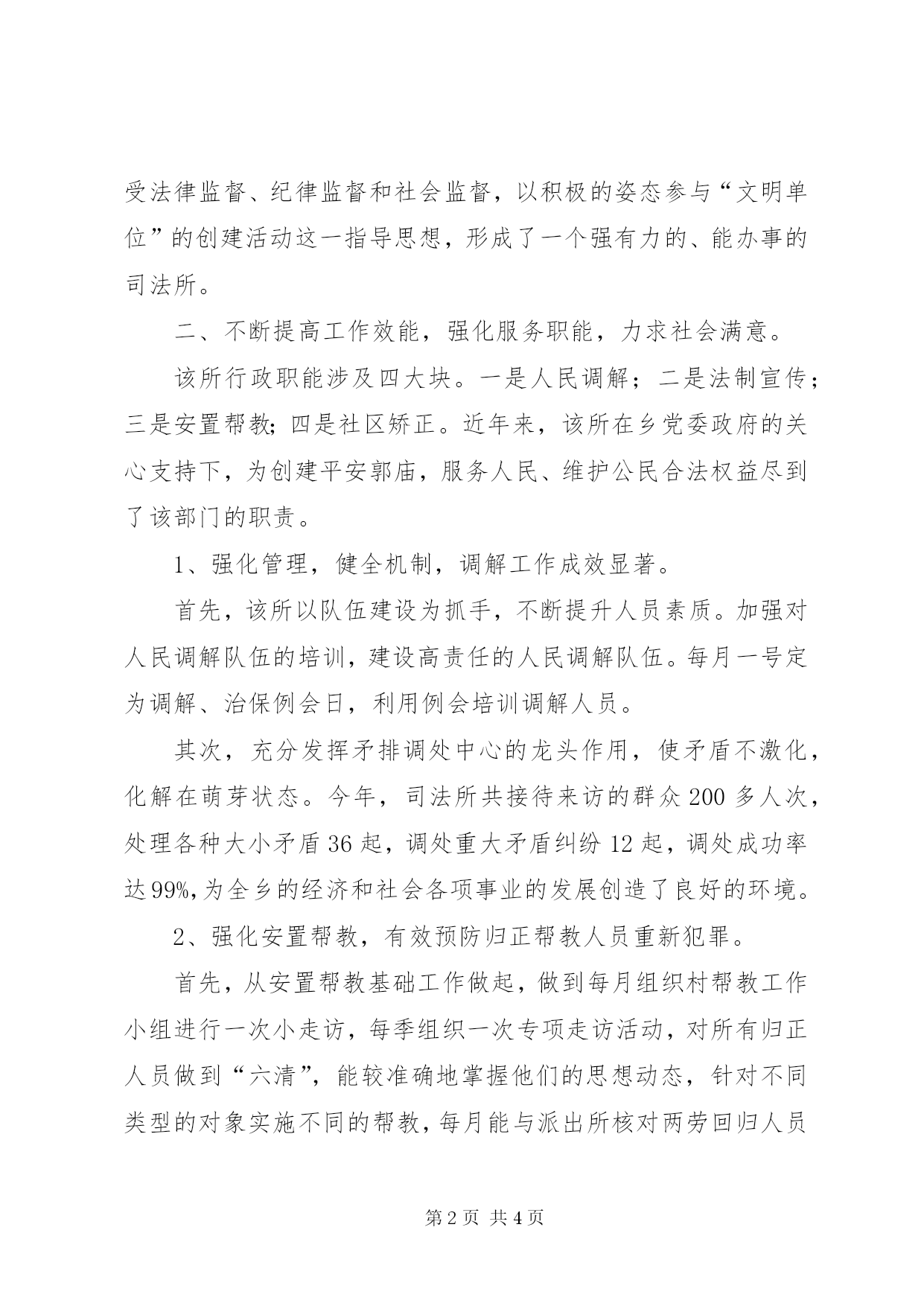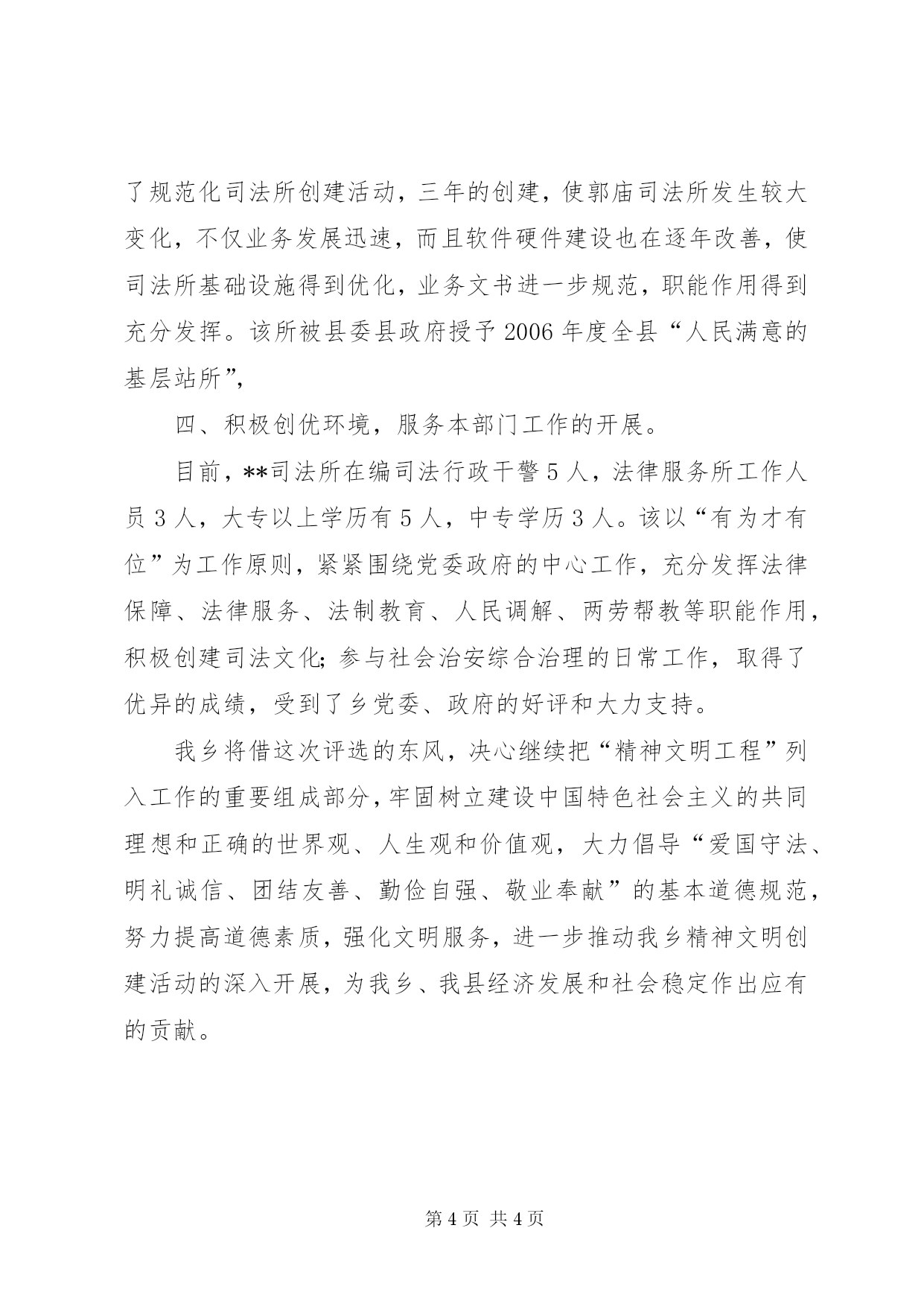 第PAGE\*Arabic\*MERGEFORMAT4页共NUMPAGES\*MERGEFORMAT4页乡司法所创建“文明单位”汇报材料近年来,**司法所在我们乡党委、政府的正确领导下,在县司法局的业务指导和监督下,坚持以邓小平理论和“三个代表”重要思想为指导,立足自身工作实际,在全所认真组织开展了争创“文明单位”活动,采取“加强领导,优化服务,努力争先创优”的创建形式,增强服务大局意识,认真开展各项司法行政工作,取得了一定成绩,该所被县委、县政府授予“三五”“四五”普法先进单位,近三年连续被县司法局评为“先进单位”。2006年被县委县政府授予全县“人民满意的基层站所”,该所在创建活动中不断加强自身的政风、行风建设,提高自身的服务能力和水平,有力地推动了我乡两个文明建设。现将该所创建活动的情况说明如下:一、加强队伍建设,不断提高队伍素质水平“火车跑得快,全靠车头带”。创建“文明单位”,是新形势下党和人民对基层站所提出的新要求,我乡党委、政府按照县文明委的要求,精心组织,认真评选,最后推选出我乡司法所为“精神文明单位”。该所能够按照乡党委、政府的要求,制定出了具体的工作措施和工作目标,以服务我乡经济建设和人民群众为宗旨,本着“服务中心、突出重点、有所为有所不为”的原则,不断加强自身的政治、业务、工作技能的学习、锻炼和提高;不断完善有关工作制度,改进工作作风;不断提高工作效率,诚意接受法律监督、纪律监督和社会监督,以积极的姿态参与“文明单位”的创建活动这一指导思想,形成了一个强有力的、能办事的司法所。二、不断提高工作效能,强化服务职能,力求社会满意。该所行政职能涉及四大块。一是人民调解;二是法制宣传;三是安置帮教;四是社区矫正。近年来,该所在乡党委政府的关心支持下,为创建平安郭庙,服务人民、维护公民合法权益尽到了该部门的职责。1、强化管理,健全机制,调解工作成效显著。首先,该所以队伍建设为抓手,不断提升人员素质。加强对人民调解队伍的培训,建设高责任的人民调解队伍。每月一号定为调解、治保例会日,利用例会培训调解人员。其次,充分发挥矛排调处中心的龙头作用,使矛盾不激化,化解在萌芽状态。今年,司法所共接待来访的群众200多人次,处理各种大小矛盾36起,调处重大矛盾纠纷12起,调处成功率达99%,为全乡的经济和社会各项事业的发展创造了良好的环境。2、强化安置帮教,有效预防归正帮教人员重新犯罪。首先,从安置帮教基础工作做起,做到每月组织村帮教工作小组进行一次小走访,每季组织一次专项走访活动,对所有归正人员做到“六清”,能较准确地掌握他们的思想动态,针对不同类型的对象实施不同的帮教,每月能与派出所核对两劳回归人员数,做到人员底数准确无误,还协助村做好妥善安置工作。没有出现脱管、漏管现象。目前他们的思想稳定,重新做人的信念较强。由于我们的工作到位,今年,未发生重新犯罪,维护了社会稳定。3、开展法制宣传教育系列活动,提高全民法律意识。司法所的同志带头学法,利用黑板报经常办法制宣传专栏,利用橱窗张贴法制宣传画报。各个学校配齐了法制副校长和专职法制宣传员,在全乡开展禁毒专项教育活动和反邪教宣传活动。根据上级要求,结合本乡实际,成立了青少年法制教育基地,与普教有机地结合,普法教育在郭庙乡形成了气氛。在司法所牵头下,今年组织了四次法律咨询活动,咨询达5000多人次。根据阶段性工作需要,积极宣传相关法律知识,牵头组织各部门根据各自工作职责,宣传好有关的法律、法规,以配合全乡的中心工作,为经济建设创造良好的法治环境。**乡连续被县委、县政府授予“二五”“三五”“四五”普法先进单位。4、矫正工作纳入正轨,管理质量不断提高。自从矫正对象办理入矫后,及时落实矫正对象的监督人、矫正工作志愿者,各村建立了帮教领导小组。司法所与派出所正在对五类犯罪人员摸排,下一步开始移交工作。三,强基固本,创新机制,全力维护社会稳定。从2005年开始,该所按照上级司法行政部门的要求,开展了规范化司法所创建活动,三年的创建,使郭庙司法所发生较大变化,不仅业务发展迅速,而且软件硬件建设也在逐年改善,使司法所基础设施得到优化,业务文书进一步规范,职能作用得到充分发挥。该所被县委县政府授予2006年度全县“人民满意的基层站所”,四、积极创优环境,服务本部门工作的开展。目前,**司法所在编司法行政干警5人,法律服务所工作人员3人,大专以上学历有5人,中专学历3人。该以“有为才有位”为工作原则,紧紧围绕党委政府的中心工作,充分发挥法律保障、法律服务、法制教育、人民调解、两劳帮教等职能作用,积极创建司法文化;参与社会治安综合治理的日常工作,取得了优异的成绩,受到了乡党委、政府的好评和大力支持。我乡将借这次评选的东风,决心继续把“精神文明工程”列入工作的重要组成部分,牢固树立