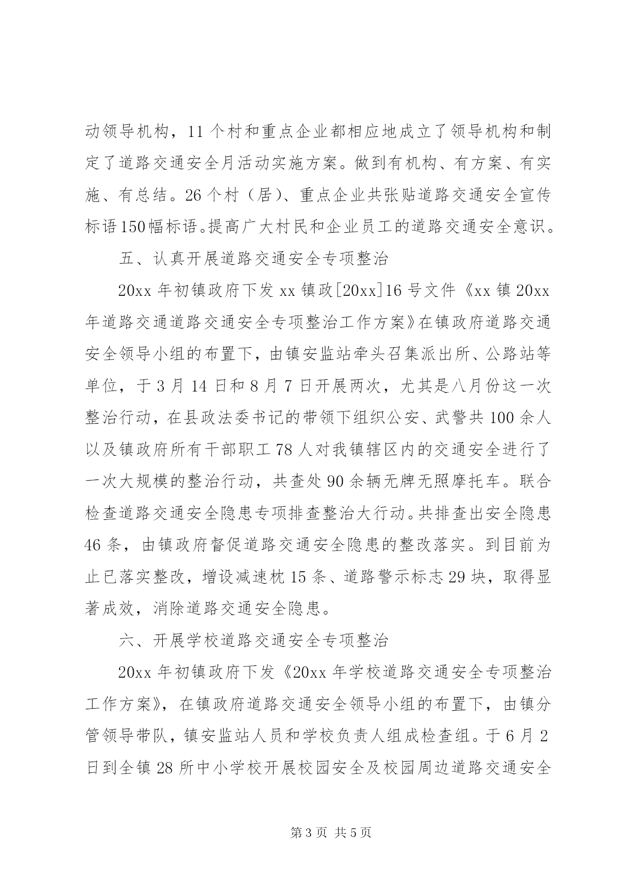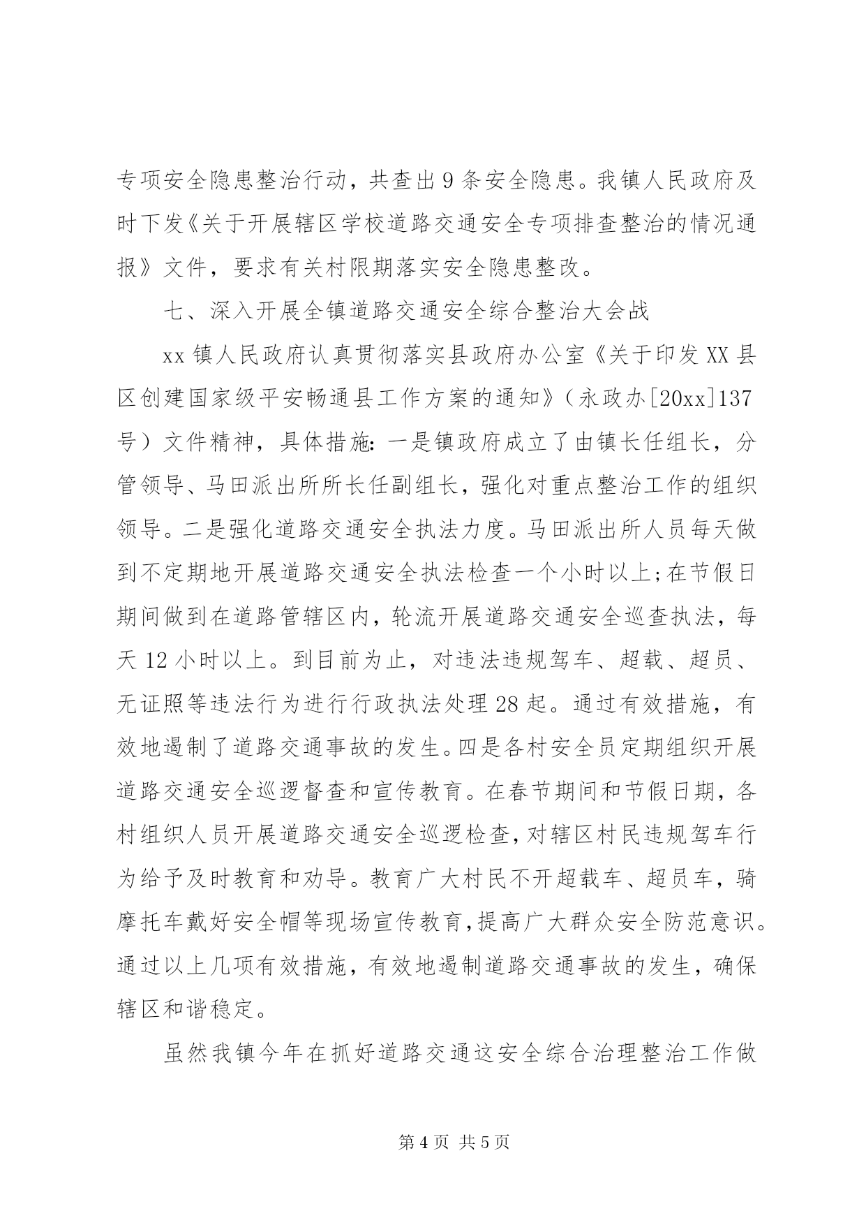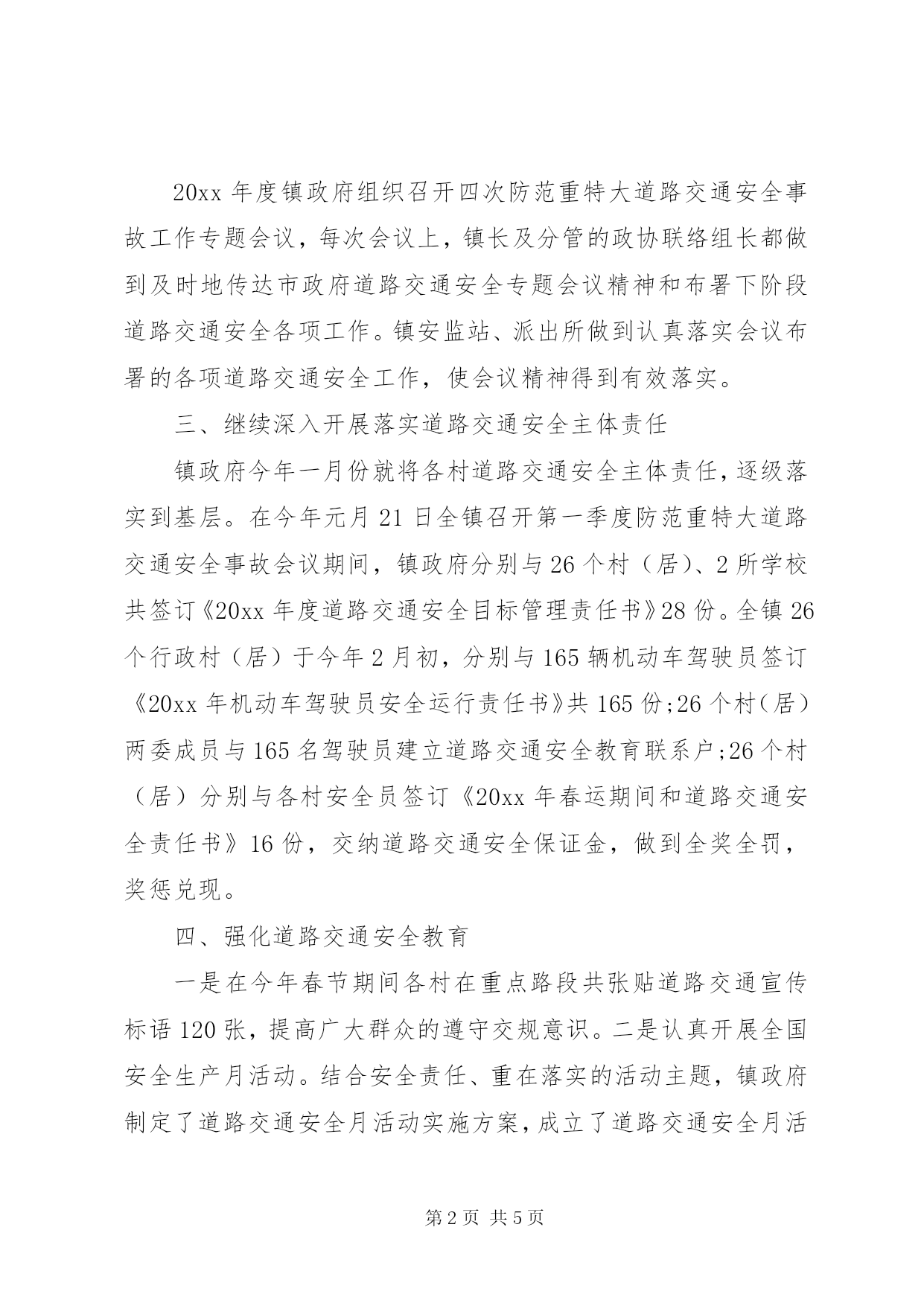 第PAGE\*Arabic\*MERGEFORMAT5页共NUMPAGES\*MERGEFORMAT5页乡镇交通安全工作总结xx镇道路交通安全工作在县政府、县安委会、镇党委政府的领导下和各部门积极支持协调配合下,牢固树立安全第一、预防为主、综合治理的方针。继续深入开展全国道路交通安全年和全省责任落实年各项工作、积极落实道路交通安全主体责任、强化安全教育培训、加强道路交通安全行政执法力度和重点整治道路交通安全隐患的三项行动。20xx年度我镇辖区道路交通安全形势总体平稳,取得了阶段性成效。回顾20xx年xx镇道路交通安全各项工作,主要抓好以下几个方面:一、加强领导、落实责任xx镇党委政府始终高度重视道路交通安全工作的领导,把道路交通安全工作作为头等大事来抓。一是镇政府于20xx年初就成立了,xx镇道路交通安全领导小组,组长由镇长担任,副组长由分管交通的领导担任,成员有派出所、镇安监站、公路站、农机站、镇府办及各村主任。办公室设在马田派出所。二是20xx年1至10月份镇政府共下发道路交通安全各类文件20份,镇安站下发文件6份。三是辖区26个村(居)成立了道路交通安全工作领导小组,组长由村主任担任,副组长由村安全员担任。四是分工明确,建立健全道路交通安全规章制度、岗位职责和一岗双责。二、定期组织召开道路交通安全专题会议20xx年度镇政府组织召开四次防范重特大道路交通安全事故工作专题会议,每次会议上,镇长及分管的政协联络组长都做到及时地传达市政府道路交通安全专题会议精神和布署下阶段道路交通安全各项工作。镇安监站、派出所做到认真落实会议布署的各项道路交通安全工作,使会议精神得到有效落实。三、继续深入开展落实道路交通安全主体责任镇政府今年一月份就将各村道路交通安全主体责任,逐级落实到基层。在今年元月21日全镇召开第一季度防范重特大道路交通安全事故会议期间,镇政府分别与26个村(居)、2所学校共签订《20xx年度道路交通安全目标管理责任书》28份。全镇26个行政村(居)于今年2月初,分别与165辆机动车驾驶员签订《20xx年机动车驾驶员安全运行责任书》共165份;26个村(居)两委成员与165名驾驶员建立道路交通安全教育联系户;26个村(居)分别与各村安全员签订《20xx年春运期间和道路交通安全责任书》16份,交纳道路交通安全保证金,做到全奖全罚,奖惩兑现。四、强化道路交通安全教育一是在今年春节期间各村在重点路段共张贴道路交通宣传标语120张,提高广大群众的遵守交规意识。二是认真开展全国安全生产月活动。结合安全责任、重在落实的活动主题,镇政府制定了道路交通安全月活动实施方案,成立了道路交通安全月活动领导机构,11个村和重点企业都相应地成立了领导机构和制定了道路交通安全月活动实施方案。做到有机构、有方案、有实施、有总结。26个村(居)、重点企业共张贴道路交通安全宣传标语150幅标语。提高广大村民和企业员工的道路交通安全意识。五、认真开展道路交通安全专项整治20xx年初镇政府下发xx镇政[20xx]16号文件《xx镇20xx年道路交通道路交通安全专项整治工作方案》在镇政府道路交通安全领导小组的布置下,由镇安监站牵头召集派出所、公路站等单位,于3月14日和8月7日开展两次,尤其是八月份这一次整治行动,在县政法委书记的带领下组织公安、武警共100余人以及镇政府所有干部职工78人对我镇辖区内的交通安全进行了一次大规模的整治行动,共查处90余辆无牌无照摩托车。联合检查道路交通安全隐患专项排查整治大行动。共排查出安全隐患46条,由镇政府督促道路交通安全隐患的整改落实。到目前为止已落实整改,增设减速枕15条、道路警示标志29块,取得显著成效,消除道路交通安全隐患。六、开展学校道路交通安全专项整治20xx年初镇政府下发《20xx年学校道路交通安全专项整治工作方案》,在镇政府道路交通安全领导小组的布置下,由镇分管领导带队,镇安监站人员和学校负责人组成检查组。于6月2日到全镇28所中小学校开展校园安全及校园周边道路交通安全专项安全隐患整治行动,共查出9条安全隐患。我镇人民政府及时下发《关于开展辖区学校道路交通安全专项排查整治的情况通报》文件,要求有关村限期落实安全隐患整改。七、深入开展全镇道路交通安全综合整治大会战xx镇人民政府认真贯彻落实县政府办公室《关于印发XX县区创建国家级平安畅通县工作方案的通知》(永政办[20xx]137号)文件精神,具体措施:一是镇政府成立了由镇长任组长,分管领导、马田派出所所长任副组长,强化对重点整治工作的组织领导。二是强化道路交通安全执法力度。马田派出所人员每天做到不定期地开展道路交通安全执法检查一个小时以上;在节假日期间做到在道路管辖区内,轮流开展道路交通安全巡查执法,每天12小时以上。到目前为止,对违法