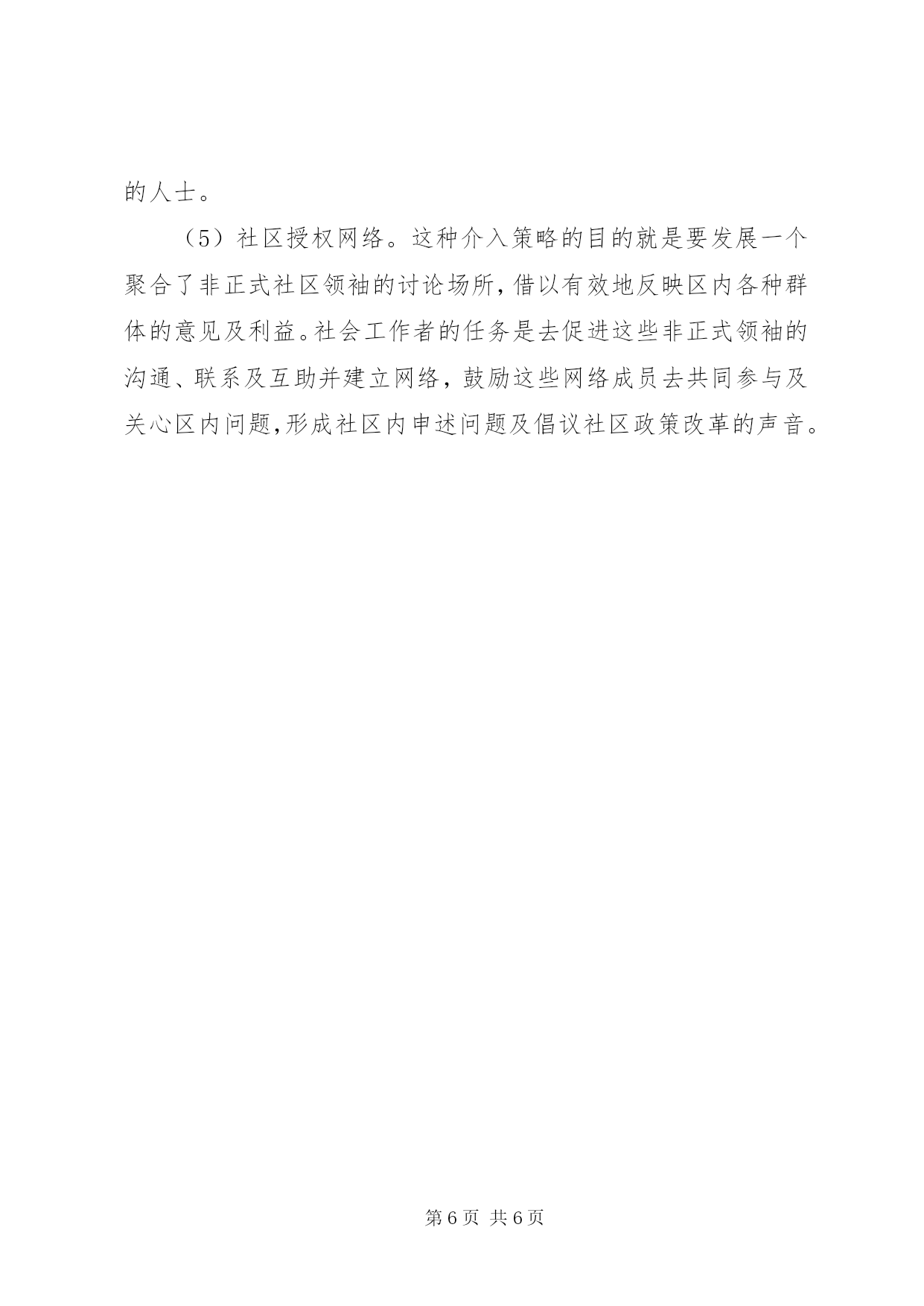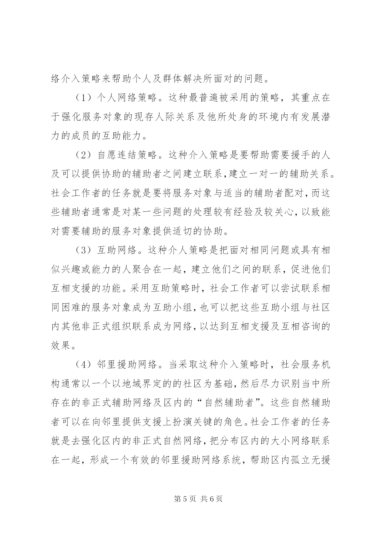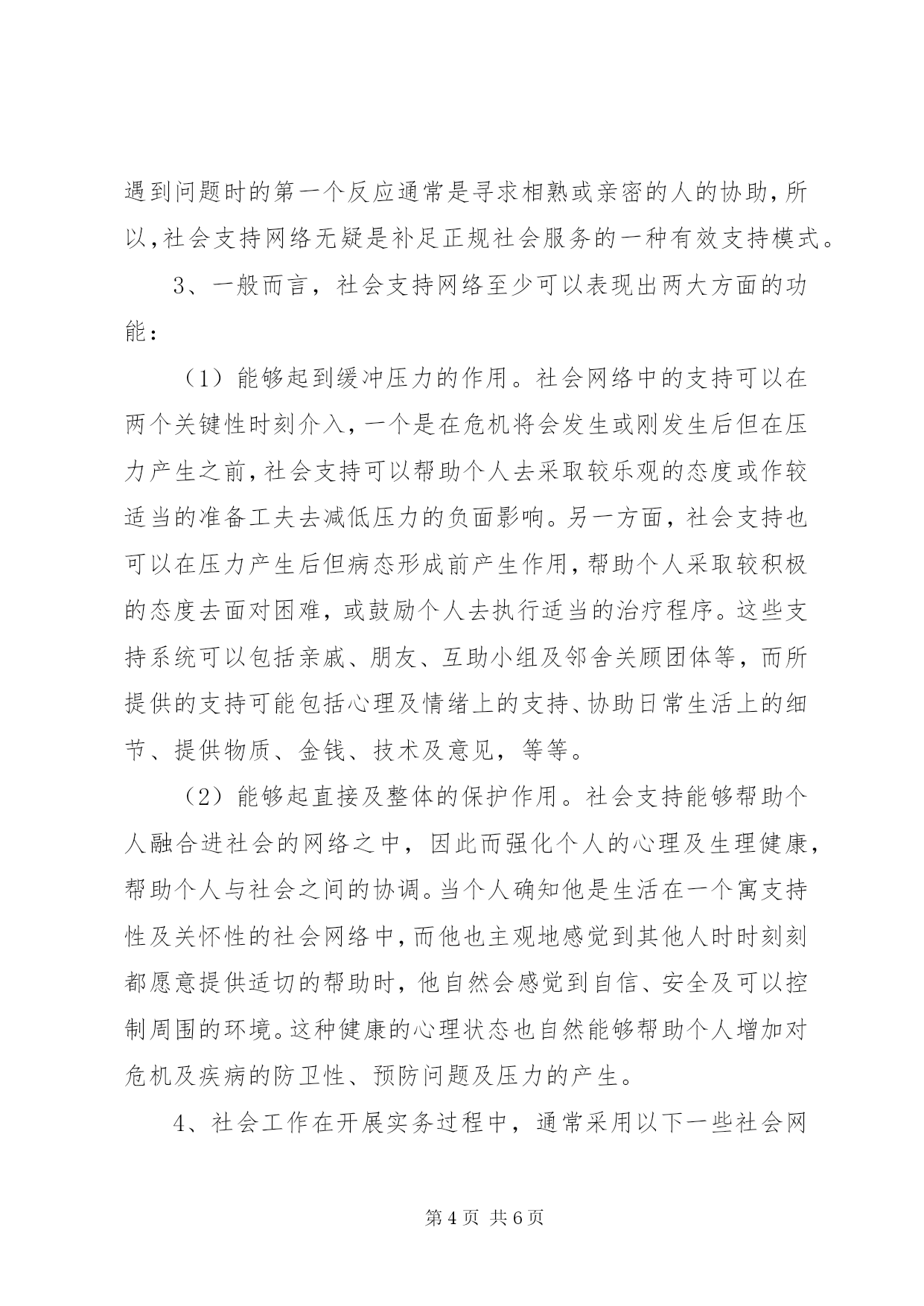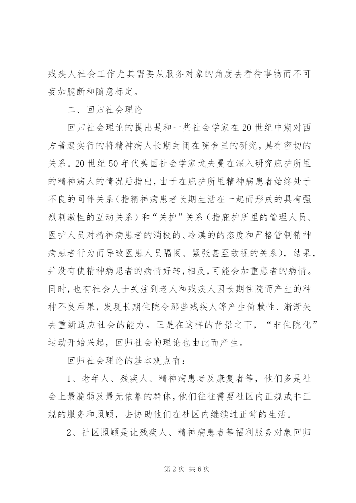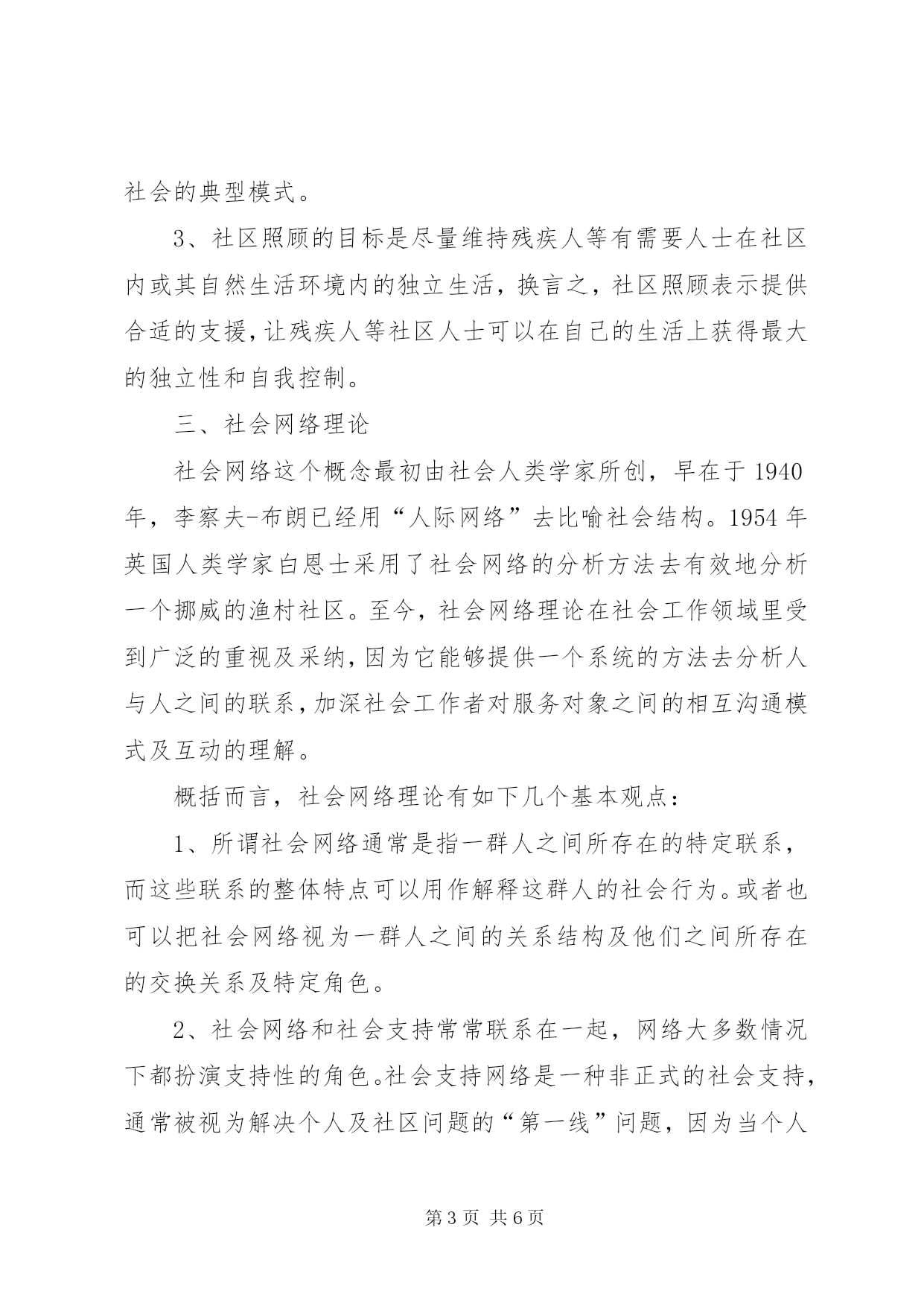 第PAGE\*Arabic\*MERGEFORMAT6页共NUMPAGES\*MERGEFORMAT6页残疾人社会工作理论学习材料一、正常化理论正常化理论是用来分析和如何看待诸如精神病患者及其它伤残人士等某些特殊的社会群体的理论。在社会工作领域中,正常化理论一般有两种含义:1、以服务对象为本的社会工作价值理念认为,由于贴标签的缘故,以往把残疾人等一些工作对象的行为视为异常,并采用主流社会通行的所谓“正常”的方法去治疗他们实际上是有失偏颇的,因为在一些社会工作者和治疗者或助人者眼里被视为不正常的行为,其实在服务对象群体那里完全是再也正常不过的事情,关键是助人者把自己看问题的眼光强加于受助者身上,换而言之,问题实际上是出在助人者对服务对象的任意标定上。2、所谓正常化就是为受助者提供与平常人相似的生活环境,包括让他们回到自己熟悉的平常社会,过常人的生活。英国倡导和推行的社区照顾就含有这种意义。美国全国智力迟钝公民协会曾对正常化所作的界定是:所谓正常化就是帮助残疾人获得一种尽量接近正常人的生活方式,使他们的日常生活模式及条件尽量与社会中大多数人一样而不是有意地将他们区隔开来。在社会工作实务中之所以强调这一点,盖源于社会工作承认所有人(包括残疾人等)都具有尊严和价值。上述正常化理论引出一个对残疾人社会工作共同的启示,即残疾人社会工作尤其需要从服务对象的角度去看待事物而不可妄加臆断和随意标定。二、回归社会理论回归社会理论的提出是和一些社会学家在20世纪中期对西方普遍实行的将精神病人长期封闭在院舍里的研究,具有密切的关系。20世纪50年代美国社会学家戈夫曼在深入研究庇护所里的精神病人的情况后指出,由于在庇护所里精神病患者始终处于不良的同伴关系(指精神病患者长期生活在一起而形成的具有强烈刺激性的互动关系)和“关护”关系(指庇护所里的管理人员、医护人员对精神病患者的消极的、冷漠的的态度和严格管制精神病患者行为而导致医患人员隔阂、紧张甚至敌视的关系),结果,并没有使精神病患者的病情好转,相反,可能会加重患者的病情。同时,也有社会人士关注到老人和残疾人因长期住院而产生的种种不良后果,发现长期住院令那些残疾人等产生倚赖性、渐渐失去重新适应社会的能力。正是在这样的背景之下,“非住院化”运动开始兴起,回归社会的理论也由此而产生。回归社会理论的基本观点有:1、老年人、残疾人、精神病患者及康复者等,他们多是社会上最脆弱及最无依靠的群体,他们往往需要社区内正规或非正规的服务和照顾,去协助他们在社区内继续过正常的生活。2、社区照顾是让残疾人、精神病患者等福利服务对象回归社会的典型模式。3、社区照顾的目标是尽量维持残疾人等有需要人士在社区内或其自然生活环境内的独立生活,换言之,社区照顾表示提供合适的支援,让残疾人等社区人士可以在自己的生活上获得最大的独立性和自我控制。三、社会网络理论社会网络这个概念最初由社会人类学家所创,早在于1940年,李察夫-布朗已经用“人际网络”去比喻社会结构。1954年英国人类学家白恩士采用了社会网络的分析方法去有效地分析一个挪威的渔村社区。至今,社会网络理论在社会工作领域里受到广泛的重视及采纳,因为它能够提供一个系统的方法去分析人与人之间的联系,加深社会工作者对服务对象之间的相互沟通模式及互动的理解。概括而言,社会网络理论有如下几个基本观点:1、所谓社会网络通常是指一群人之间所存在的特定联系,而这些联系的整体特点可以用作解释这群人的社会行为。或者也可以把社会网络视为一群人之间的关系结构及他们之间所存在的交换关系及特定角色。2、社会网络和社会支持常常联系在一起,网络大多数情况下都扮演支持性的角色。社会支持网络是一种非正式的社会支持,通常被视为解决个人及社区问题的“第一线”问题,因为当个人遇到问题时的第一个反应通常是寻求相熟或亲密的人的协助,所以,社会支持网络无疑是补足正规社会服务的一种有效支持模式。3、一般而言,社会支持网络至少可以表现出两大方面的功能:(1)能够起到缓冲压力的作用。社会网络中的支持可以在两个关键性时刻介入,一个是在危机将会发生或刚发生后但在压力产生之前,社会支持可以帮助个人去采取较乐观的态度或作较适当的准备工夫去减低压力的负面影响。另一方面,社会支持也可以在压力产生后但病态形成前产生作用,帮助个人采取较积极的态度去面对困难,或鼓励个人去执行适当的治疗程序。这些支持系统可以包括亲戚、朋友、互助小组及邻舍关顾团体等,而所提供的支持可能包括心理及情绪上的支持、协助日常生活上的细节、提供物质、金钱、技术及意见,等等。(2)能够起直接及整体的保护作用。社会支持能够帮助个人融合进社会的网络之中,因此而强化个人的心理及生理健康,帮助个人与社会之间的协调。当个人确知他是生活在一个寓支持性及关怀性的社会网络中,而