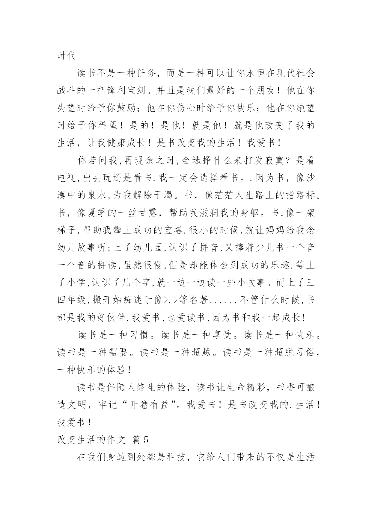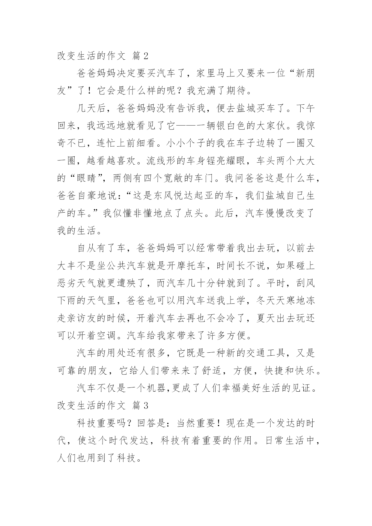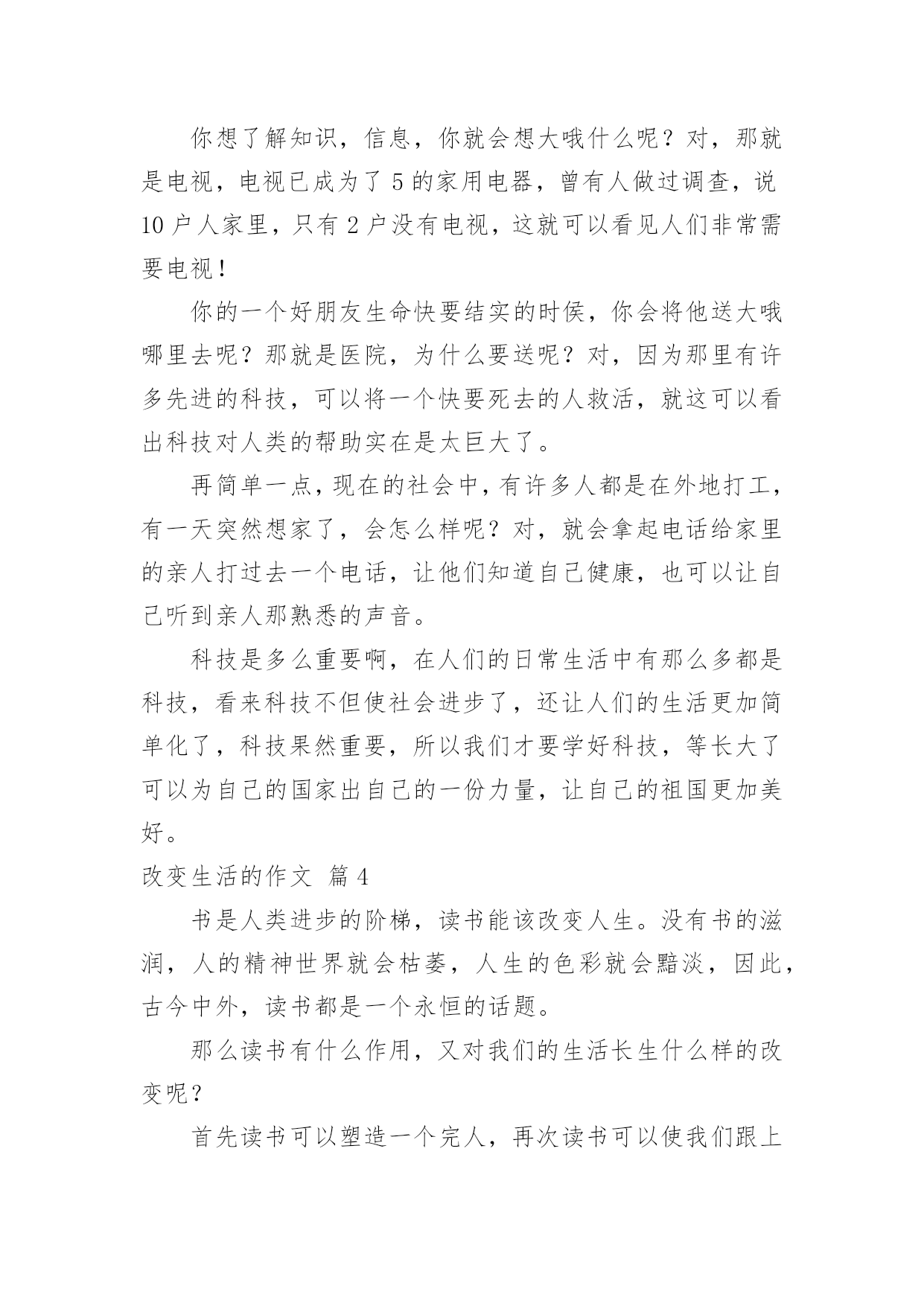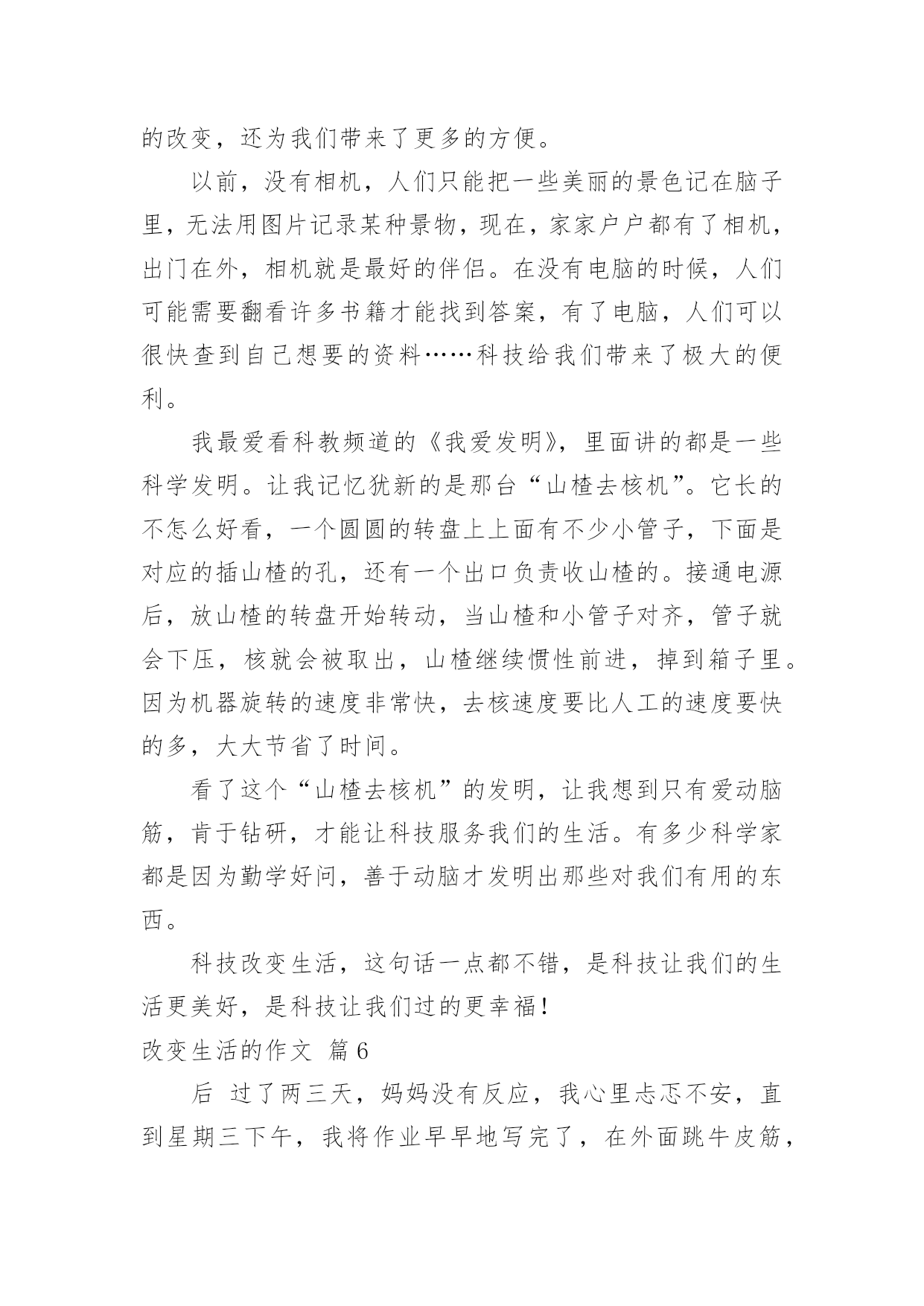 改变生活的作文改变生活的作文六篇在学习、工作、生活中,大家一定都接触过作文吧,作文要求篇章结构完整,一定要避免无结尾作文的出现。怎么写作文才能避免踩雷呢?下面是小编为大家收集的改变生活的作文7篇,欢迎大家分享。改变生活的作文篇1如今的社会,电脑的存在已成为普遍现象,人人手中都有一台电脑,以显示人们在当今的社会经济的快速发达,科技的发展……有一句话,全世界就是一个地球村,指在电脑的世界里面,不管是全球世界各地只要有电脑,有互联网,都可以接受到对方传来的信息,即使是相隔着大洋彼岸的国家,消息的传播只要一秒钟,甚至一秒钟都不到,如今社会早已离不开电脑。我用电脑,时间一般是都花在看小说的时间上面和查资料学习解决不懂的难题。电脑就是我的另外一个老师,一个全能的老师,它懂天文地理,化学物理……它博大精深,脑海里藏着许许多多我不曾经历过,听过的故事。互联网上的小说是应有尽有,无奇不有……我每每流连在小说的世界里面难以忘怀,忘却时间的流逝,而时间却往往在我们快乐、兴奋所有的积极情绪中飞快的流逝,仿佛一个眨眼就是白天到黑夜。看小说看得双眼红肿,疼痛难忍,但是我还是坚持的看下去,即使知道网络上的东西不会消失,时时刻刻都存在的,哪里有着无数的好看的小说等着我去看;有着无数的电影等着我去看;有着无数的音乐等着我去听……网络上也有许多好看的精彩的电影,各种片段。有言情的,有武侠的,有玄幻的……我喜欢在电脑上面看电影,因为在电脑上面看电影实在是一种享受,没有广告的骚扰,还是很好的。毕竟不用等着时间,不用苦苦的等着电视,电影的播放,而在电脑上面可以一下子跳到结局,可以跳到中间,随便自己怎样都可以,它可以充分地满足我们人类的控制欲,达到一种伟大的“自我成就感”我不大喜欢玩游戏,不过弟弟很喜欢,我常常坐在弟弟旁,看着弟弟玩游戏,电脑里面的任务非常的逼真,就像是真人似的,游戏有着各种各样的,以前小时候的游戏,变来变去还是以前的哪几种,很无聊。现在的游戏真是五花八门的,弟弟一上网查找游戏,就见一个个不同的网站。每当弟弟玩游戏,弟弟的神色都充斥着亢奋的情绪,不经意间的举动告诉我了,他沉醉在其中,不可自拔……不过,电脑也并不都是好的,网络上也充斥着许多不良信息,诈骗信息等等,常常听说,小女孩子网络上面交朋友被拐卖,这种恐怖的消息……还有些什么黄色……常有些学生沉迷于网络忘记了学习;忘记了吃饭;更忘记了人类的道德底线。便传出学生因付不起网吧里面的费用而偷盗,打劫……如今电脑丰富了我们的业余生活,改变了我们的生活习惯,电脑已成为我们不可或缺的一部分……改变生活的作文篇2爸爸妈妈决定要买汽车了,家里马上又要来一位“新朋友”了!它会是什么样的呢?我充满了期待。几天后,爸爸妈妈没有告诉我,便去盐城买车了。下午回来,我远远地就看见了它——一辆银白色的大家伙。我惊奇不已,连忙上前细看。小小个子的我在车子边转了一圈又一圈,越看越喜欢。流线形的车身锃亮耀眼,车头两个大大的“眼睛”,两侧有四个宽敞的车门。我问爸爸这是什么车,爸爸自豪地说:“这是东风悦达起亚的车,我们盐城自己生产的车。”我似懂非懂地点了点头。此后,汽车慢慢改变了我的生活。自从有了车,爸爸妈妈可以经常带着我出去玩,以前去大丰不是坐公共汽车就是开摩托车,时间长不说,如果碰上恶劣天气就更遭殃了,而汽车几十分钟就到了。平时,刮风下雨的天气里,爸爸也可以用汽车送我上学,冬天天寒地冻走亲访友的时候,开着汽车去再也不会冷了,夏天出去玩还可以开着空调。汽车给我家带来了许多方便。汽车的用处还有很多,它既是一种新的交通工具,又是可靠的朋友,它给人们带来来了舒适,方便,快捷和快乐。汽车不仅是一个机器,更成了人们幸福美好生活的见证。改变生活的作文篇3科技重要吗?回答是:当然重要!现在是一个发达的时代,使这个时代发达,科技有着重要的作用。日常生活中,人们也用到了科技。你想了解知识,信息,你就会想大哦什么呢?对,那就是电视,电视已成为了5的家用电器,曾有人做过调查,说10户人家里,只有2户没有电视,这就可以看见人们非常需要电视!你的一个好朋友生命快要结实的时侯,你会将他送大哦哪里去呢?那就是医院,为什么要送呢?对,因为那里有许多先进的科技,可以将一个快要死去的人救活,就这可以看出科技对人类的帮助实在是太巨大了。再简单一点,现在的社会中,有许多人都是在外地打工,有一天突然想家了,会怎么样呢?对,就会拿起电话给家里的亲人打过去一个电话,让他们知道自己健康,也可以让自己听到亲人那熟悉的声音。科技是多么重要啊,在人们的日常生活中有那么多都是科技,看来科技不但使社会进步了,还让人们的生活更加简单化了,科技果然重要,所以我们才要学好科技,等长大了可以为自己的国家出自己的一份力量,让自己的祖国更加美好。改变生活的作文篇4书是人类进步的阶梯,读书能该改变人生。没