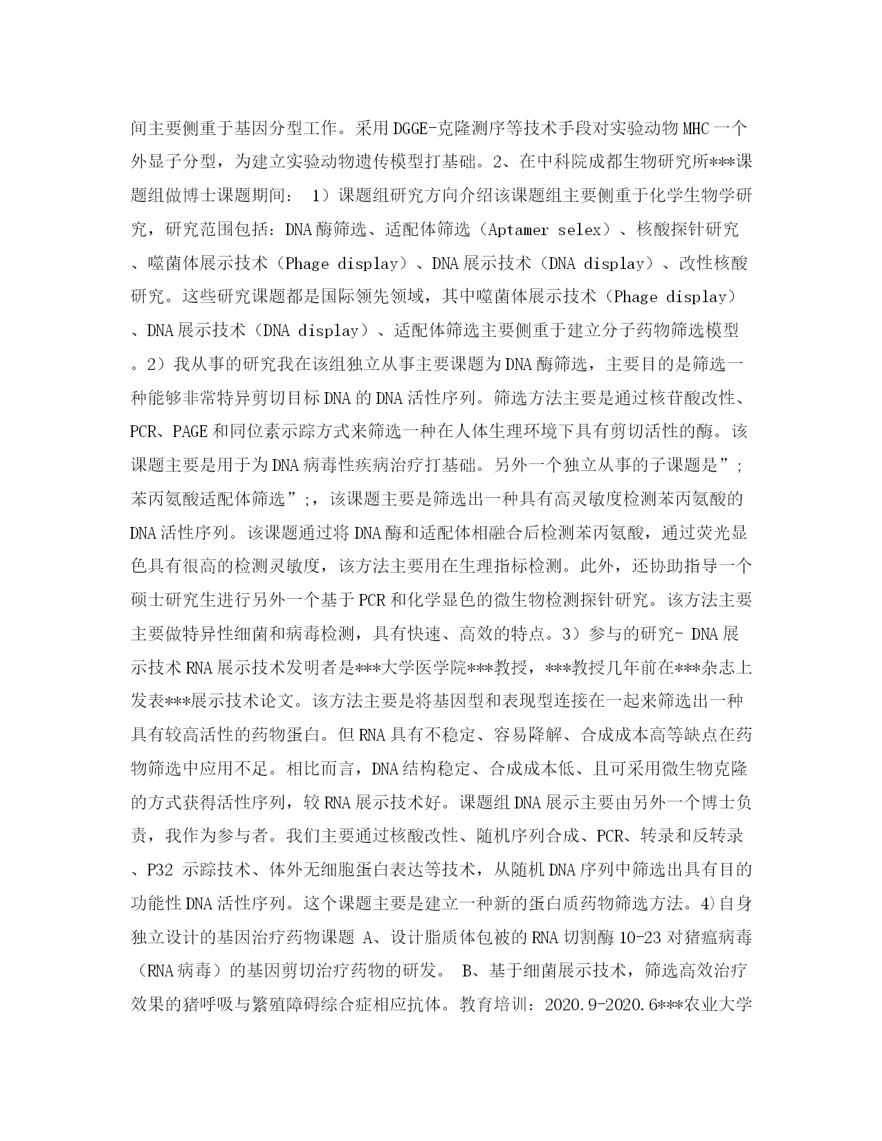 此资料由网络收集而来,如有侵权请告知上传者立即删除。资料共分享,我们负责传递知识。研究生简历表格简历中如果工作时间长那么一般单单从时间上看,只要把最近五年的工作经历摆出来即可,如果时间过长就没有什么意义了。好比你在大学生时说自己小学数学多牛,但是小学数学牛对大学数学有任何影响吗?有些求职者认为我在八年前做过服装设计而且做得还是挺不错的,那么八年后你仍然这么牛吗?不能说你现在应聘服装设计岗位那么这八年前的同种工作经历对现在就有用。当然,如果你在最近没有从事过同类工作那么可以把这段经历摆出来,不过用不着做过于详细的描述,因为时间间隔太久,而摆出来的目的只是说明你以前做过,这样总比没做过要好一些。此外我们还要注意在最近五六年工作过的公司有多少家,如果公司数量超过五家,那么把工作时间过短的经历删掉以免给人形成心浮气躁的感受。要知道你此时工作了五六年以上,仍然处于频繁换工作当中,那么这些年你在社会上还是没有形成一个稳定的心理,动不动就跳槽那么哪个企业会喜欢你?一般如果在工作前两三年跳槽多一些倒是没关系,如果在两三年后仍然如此那么我们就得好好调整下工作经历,不要营造出这种不好的印象。下面是小编分享的研究生简历表格,更多内容请关注简历表格栏目。姓名:XXX性别:男出生年月:***联系电话:学历:本科专业:动物遗传育种与繁殖工作经验:5年民族:汉毕业学校:***农业大学住址:***电子信箱:www.XXX.com自我简介:经过三年的硕士研究生学习和一年的博士研究工作,不仅在科研方面学到了很多知识,而且在解决问题与思维方法上得到了锻炼。熟练掌握核酸、蛋白、细菌和细胞多项操作技能。经过一年博士研究工作,掌握功能性核酸分子体外筛选技术、DNA展示技术、噬菌体展示技术等筛选新药方法。求职意向:目标职位:生物工程;生物制药|药品生产;质量管理|科研人员目标行业:制药;生物工程|教育;培训;科研;院校|政府;非营利机构期望薪资:面议期望地区:***到岗时间:面谈工作经历:2020.10-2020.8***生物研究所项目研究员职责和业绩:工作经历:1、在***农业大学读硕士研究生期间在***农业大学读硕士期间主要侧重于基因分型工作。采用DGGE-克隆测序等技术手段对实验动物MHC一个外显子分型,为建立实验动物遗传模型打基础。2、在中科院成都生物研究所***课题组做博士课题期间:1)课题组研究方向介绍该课题组主要侧重于化学生物学研究,研究范围包括:DNA酶筛选、适配体筛选(Aptamerselex)、核酸探针研究、噬菌体展示技术(Phagedisplay)、DNA展示技术(DNAdisplay)、改性核酸研究。这些研究课题都是国际领先领域,其中噬菌体展示技术(Phagedisplay)、DNA展示技术(DNAdisplay)、适配体筛选主要侧重于建立分子药物筛选模型。2)我从事的研究我在该组独立从事主要课题为DNA酶筛选,主要目的是筛选一种能够非常特异剪切目标DNA的DNA活性序列。筛选方法主要是通过核苷酸改性、PCR、PAGE和同位素示踪方式来筛选一种在人体生理环境下具有剪切活性的酶。该课题主要是用于为DNA病毒性疾病治疗打基础。另外一个独立从事的子课题是”;苯丙氨酸适配体筛选”;,该课题主要是筛选出一种具有高灵敏度检测苯丙氨酸的DNA活性序列。该课题通过将DNA酶和适配体相融合后检测苯丙氨酸,通过荧光显色具有很高的检测灵敏度,该方法主要用在生理指标检测。此外,还协助指导一个硕士研究生进行另外一个基于PCR和化学显色的微生物检测探针研究。该方法主要主要做特异性细菌和病毒检测,具有快速、高效的特点。3)参与的研究-DNA展示技术RNA展示技术发明者是***大学医学院***教授,***教授几年前在***杂志上发表***展示技术论文。该方法主要是将基因型和表现型连接在一起来筛选出一种具有较高活性的药物蛋白。但RNA具有不稳定、容易降解、合成成本高等缺点在药物筛选中应用不足。相比而言,DNA结构稳定、合成成本低、且可采用微生物克隆的方式获得活性序列,较RNA展示技术好。课题组DNA展示主要由另外一个博士负责,我作为参与者。我们主要通过核酸改性、随机序列合成、PCR、转录和反转录、P32示踪技术、体外无细胞蛋白表达等技术,从随机DNA序列中筛选出具有目的功能性DNA活性序列。这个课题主要是建立一种新的蛋白质药物筛选方法。4)自身独立设计的基因治疗药物课题A、设计脂质体包被的RNA切割酶10-23对猪瘟病毒(RNA病毒)的基因剪切治疗药物的研发。B、基于细菌展示技术,筛选高效治疗效果的猪呼吸与繁殖障碍综合症相应抗体。教育培训:2020.9-2020.6***农业大学硕士专业:动物遗传育种与繁殖专业描述与主修课程:动物遗传育种与繁殖专业是***重点专业,该专业