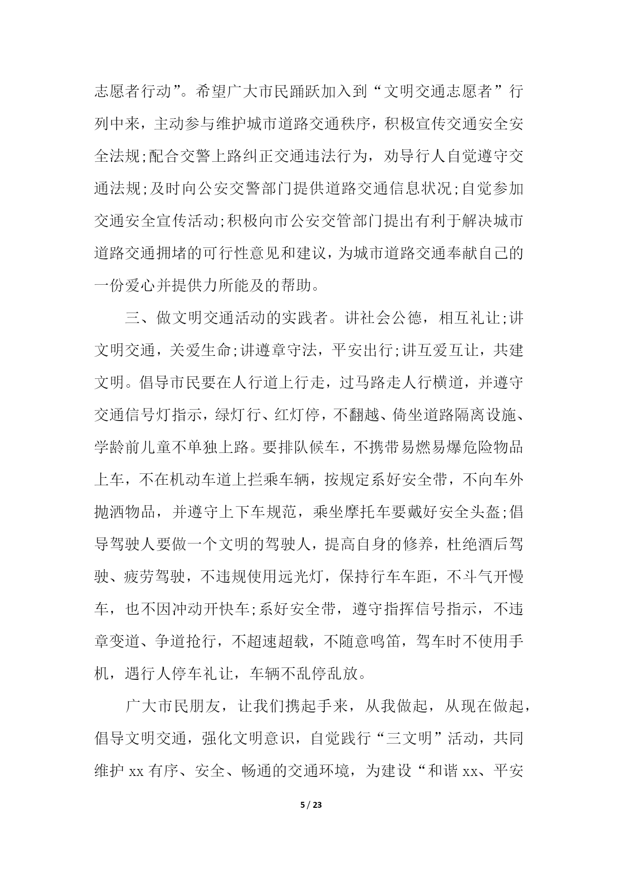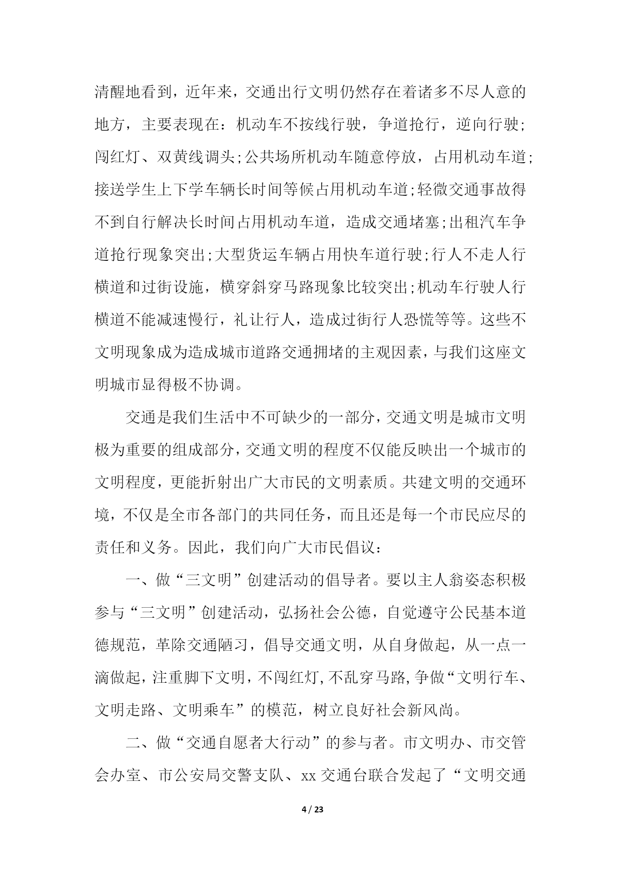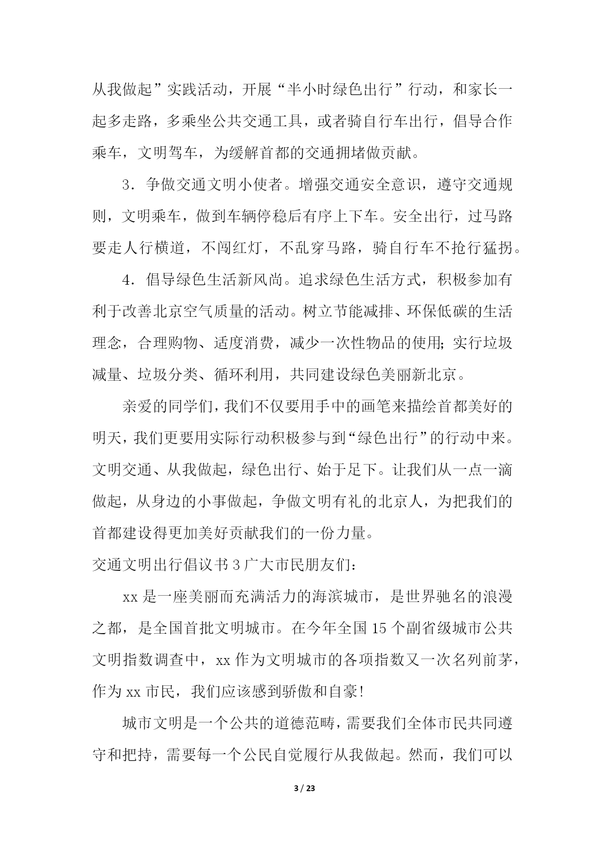 PAGE23/NUMPAGES23交通文明出行倡议书交通文明出行倡议书1尊敬的家长朋友、亲爱的同学们:大家好!为确保学生的出行安全,我校特开展了“文明交通绿色出行”的活动,因此我们倡议同学们认真学习交通安全知识,提高交通安全意识和自我防护能力,同时希望家长朋友规范自己的交通行为,以自身的一言一行引导孩子养成良好的交通习惯。为此,我们倡议全校师生及家长做到以下几点:1、在道路上行走时,要在人行道内行走或靠路边行走。不要在道路两侧嬉戏、追逐或长时间逗留,不要突然横过道路。横过道路时,必须从人行横道、天桥及其他行人过街设施通过;在通过人行横道时,也要注意观察来往车辆,加强自身安全防范。2、通过设有交通信号灯和人行横道的路口时,应当注意观察人行横道指示灯,在绿灯亮时通行;通过没有交通信号灯或人行横道的路口,应注意避让通行的车辆,在没有车辆通行的前提下安全通行。3、横过道路要做到:左看、右看、再左看,三次确认保安全,即;左看,确认近处无驶来车辆;再右看,确认远处无车辆通过;再次左看确认安全,才能迅速安全通过。4、家长要带头并教育自己的孩子不乘坐无牌、无证及无证人员驾驶的机动车、农用车三轮车、电瓶三轮车和拖拉机等交通工具;不乘坐车况差、改装车座和超员、超载的车辆。5、每一名小学生要自觉学习交通安全知识,学会自我保护,并劝告家长文明通行,不酒后驾驶、不超速、不违法超车、不疲劳驾驶、不闯红灯、不乱停乱放,驾驶和乘坐二轮摩托车时须戴好安全头盔。交通的文明需要大家共同建设,文明的交通需要大家共同呵护。让我们携起手来,倡导文明交通,树立文明新风,为创设安全、畅通、和谐、文明的交通环境作出自已应有的贡献!倡议人:六年级全体学生20xx.3.30交通文明出行倡议书2当前,我们美丽的家园——首都北京正在加快“人文北京、科技北京、绿色北京”和中国特色世界城市的建设步伐,为了表达我们广大中小学生对首都美好未来的期盼、憧憬,为建设首都贡献我们的一份力量,值此“绿色出行、文明交通、爱护环境——中韩少年儿童沙福杯绘画大赛”优秀作品展开幕之际,我们谨代表参加本次绘画大赛的一万多名参赛选手向全市未成年人发出“做文明有礼的北京人——”倡议:1.争当文明小宣传员。在学校、家庭、社会积极主动向自己的长辈、亲戚、同学、朋友宣传绿色出行、文明交通的理念,宣传健康环保的出行方式,倡导树立低碳、环保、文明意识,携起手来,共同参与到“绿色出行、文明交通”的行动中来。2.争创绿色出行小标兵。积极参与“绿色出行、文明交通、从我做起”实践活动,开展“半小时绿色出行”行动,和家长一起多走路,多乘坐公共交通工具,或者骑自行车出行,倡导合作乘车,文明驾车,为缓解首都的交通拥堵做贡献。3.争做交通文明小使者。增强交通安全意识,遵守交通规则,文明乘车,做到车辆停稳后有序上下车。安全出行,过马路要走人行横道,不闯红灯,不乱穿马路,骑自行车不抢行猛拐。4.倡导绿色生活新风尚。追求绿色生活方式,积极参加有利于改善北京空气质量的活动。树立节能减排、环保低碳的生活理念,合理购物、适度消费,减少一次性物品的使用;实行垃圾减量、垃圾分类、循环利用,共同建设绿色美丽新北京。亲爱的同学们,我们不仅要用手中的画笔来描绘首都美好的明天,我们更要用实际行动积极参与到“绿色出行”的行动中来。文明交通、从我做起,绿色出行、始于足下。让我们从一点一滴做起,从身边的小事做起,争做文明有礼的北京人,为把我们的首都建设得更加美好贡献我们的一份力量。交通文明出行倡议书3广大市民朋友们:xx是一座美丽而充满活力的海滨城市,是世界驰名的浪漫之都,是全国首批文明城市。在今年全国15个副省级城市公共文明指数调查中,xx作为文明城市的各项指数又一次名列前茅,作为xx市民,我们应该感到骄傲和自豪!城市文明是一个公共的道德范畴,需要我们全体市民共同遵守和把持,需要每一个公民自觉履行从我做起。然而,我们可以清醒地看到,近年来,交通出行文明仍然存在着诸多不尽人意的地方,主要表现在:机动车不按线行驶,争道抢行,逆向行驶;闯红灯、双黄线调头;公共场所机动车随意停放,占用机动车道;接送学生上下学车辆长时间等候占用机动车道;轻微交通事故得不到自行解决长时间占用机动车道,造成交通堵塞;出租汽车争道抢行现象突出;大型货运车辆占用快车道行驶;行人不走人行横道和过街设施,横穿斜穿马路现象比较突出;机动车行驶人行横道不能减速慢行,礼让行人,造成过街行人恐慌等等。这些不文明现象成为造成城市道路交通拥堵的主观因素,与我们这座文明城市显得极不协调。交通是我们生活中不可缺少的一部分,交通文明是城市文明极为重要的组成部分,交通文明的程度不仅能反映出一个城市的文明程度,更能折射出广大市民的文明素质。共建文明的交通环境,不仅是全市各部门的共同任务,而且还是每一个市民