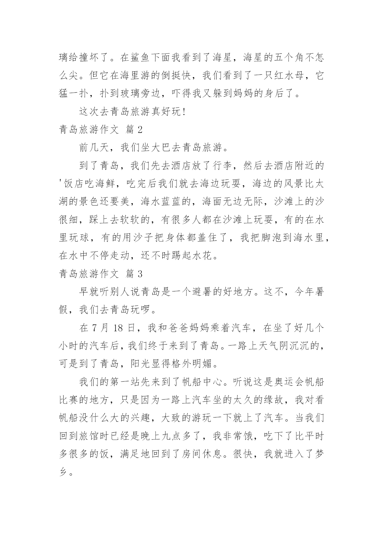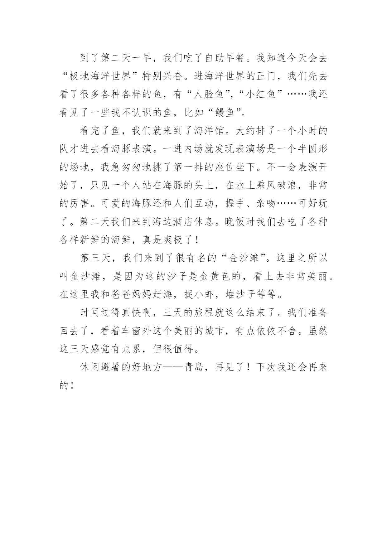 青岛旅游作文关于青岛旅游作文三篇在日常学习、工作和生活中,大家都经常看到作文的身影吧,借助作文可以提高我们的语言组织能力。那么你知道一篇好的作文该怎么写吗?下面是小编收集整理的青岛旅游作文3篇,欢迎阅读与收藏。青岛旅游作文篇120xx年8月,我和爸爸妈妈去青岛看大海。来到大海,我兴奋地对大海说:“大海,我来到你的身边了。”说完我就扑到大海的怀抱里。我和爸爸妈妈在海里游玩,我对爸爸妈妈说:“我们玩捉迷藏吧!”玩了一个小时,我们玩累了,就去沙滩上休息。我坐在软绵绵的沙滩上,对爸爸妈妈说:“我们盖一座城堡吧。”爸爸和妈妈说:“好吧。”我盖底层,又在房子里做了一对小板登和两张桌子,其中一张放了一台电脑,另一张放了一台电视。忽然,一只小螃蟹走到了城堡里。它好像在说:“城堡里太好看了,太美丽了。”贝壳在海里跑来跑去,好像在与海龟赛跑,谁也不让谁。我来到海底世界,看到了鲨鱼,我看到了鲨鱼旁边还有几条小鲨鱼在旁边睡觉。我敲了一下玻璃,对小鲨鱼和大鲨鱼做了一个鬼脸,他们过来了。大鲨鱼很长,大鲨鱼张了一下嘴巴,吓了我一跳,马上躲到爸爸的身后。就怕它们把玻璃给撞坏了。在鲨鱼下面我看到了海星,海星的五个角不怎么尖。但它在海里游的倒挺快,我们看到了一只红水母,它猛一扑,扑到玻璃旁边,吓得我又躲到妈妈的身后了。这次去青岛旅游真好玩!青岛旅游作文篇2前几天,我们坐大巴去青岛旅游。到了青岛,我们先去酒店放了行李,然后去酒店附近的'饭店吃海鲜,吃完后我们就去海边玩耍,海边的风景比太湖的景色还要美,海水蓝蓝的,海面无边无际,沙滩上的沙很细,踩上去软软的,有很多人都在沙滩上玩耍,有的在水里玩球,有的用沙子把身体都盖住了,我把脚泡到海水里,在水中不停走动,还不时踢起水花。青岛旅游作文篇3早就听别人说青岛是一个避暑的好地方。这不,今年暑假,我们去青岛玩啰。在7月18日,我和爸爸妈妈乘着汽车,在坐了好几个小时的汽车后,我们终于来到了青岛。一路上天气阴沉沉的,可是到了青岛,阳光显得格外明媚。我们的第一站先来到了帆船中心。听说这是奥运会帆船比赛的地方,只是因为一路上汽车坐的太久的缘故,我对看帆船没什么大的兴趣,大致的游玩一下就上了汽车。当我们回到旅馆时已经是晚上九点多了,我非常饿,吃下了比平时多很多的饭,满足地回到了房间休息。很快,我就进入了梦乡。到了第二天一早,我们吃了自助早餐。我知道今天会去“极地海洋世界”特别兴奋。进海洋世界的正门,我们先去看了很多各种各样的鱼,有“人脸鱼”,“小红鱼”……我还看见了一些我不认识的鱼,比如“鳗鱼”。看完了鱼,我们就来到了海洋馆。大约排了一个小时的队才进去看海豚表演。一进内场就发现表演场是一个半圆形的场地,我急匆匆地挑了第一排的座位坐下。不一会表演开始了,只见一个人站在海豚的头上,在水上乘风破浪,非常的厉害。可爱的海豚还和人们互动,握手、亲吻……可好玩了。第二天我们来到海边酒店休息。晚饭时我们去吃了各种各样新鲜的海鲜,真是爽极了!第三天,我们来到了很有名的“金沙滩”。这里之所以叫金沙滩,是因为这的沙子是金黄色的,看上去非常美丽。在这里我和爸爸妈妈赶海,捉小虾,堆沙子等等。时间过得真快啊,三天的旅程就这么结束了。我们准备回去了,看着车窗外这个美丽的城市,有点依依不舍。虽然这三天感觉有点累,但很值得。休闲避暑的好地方——青岛,再见了!下次我还会再来的!