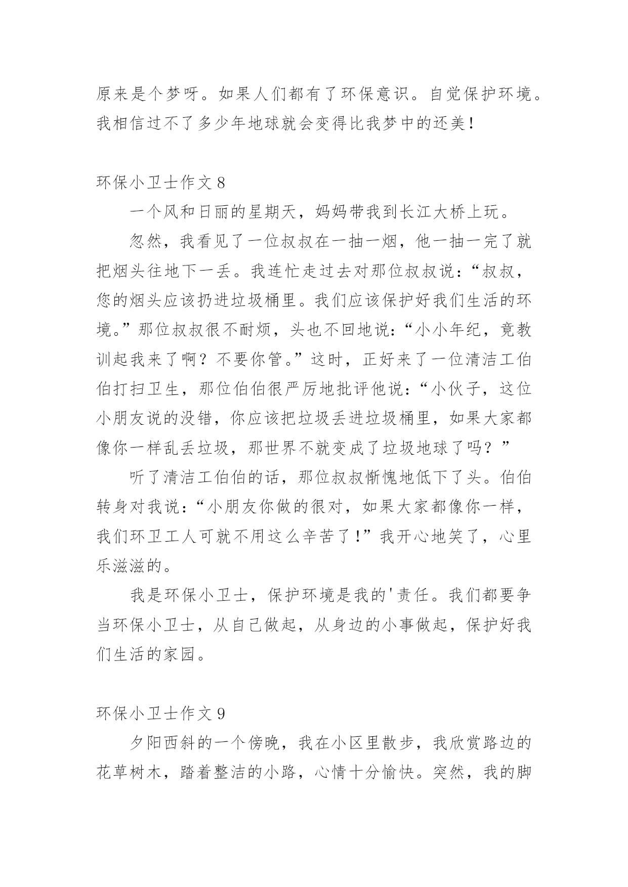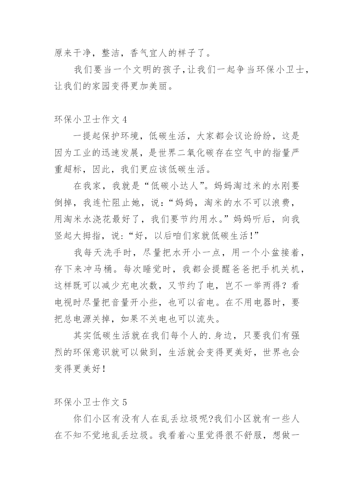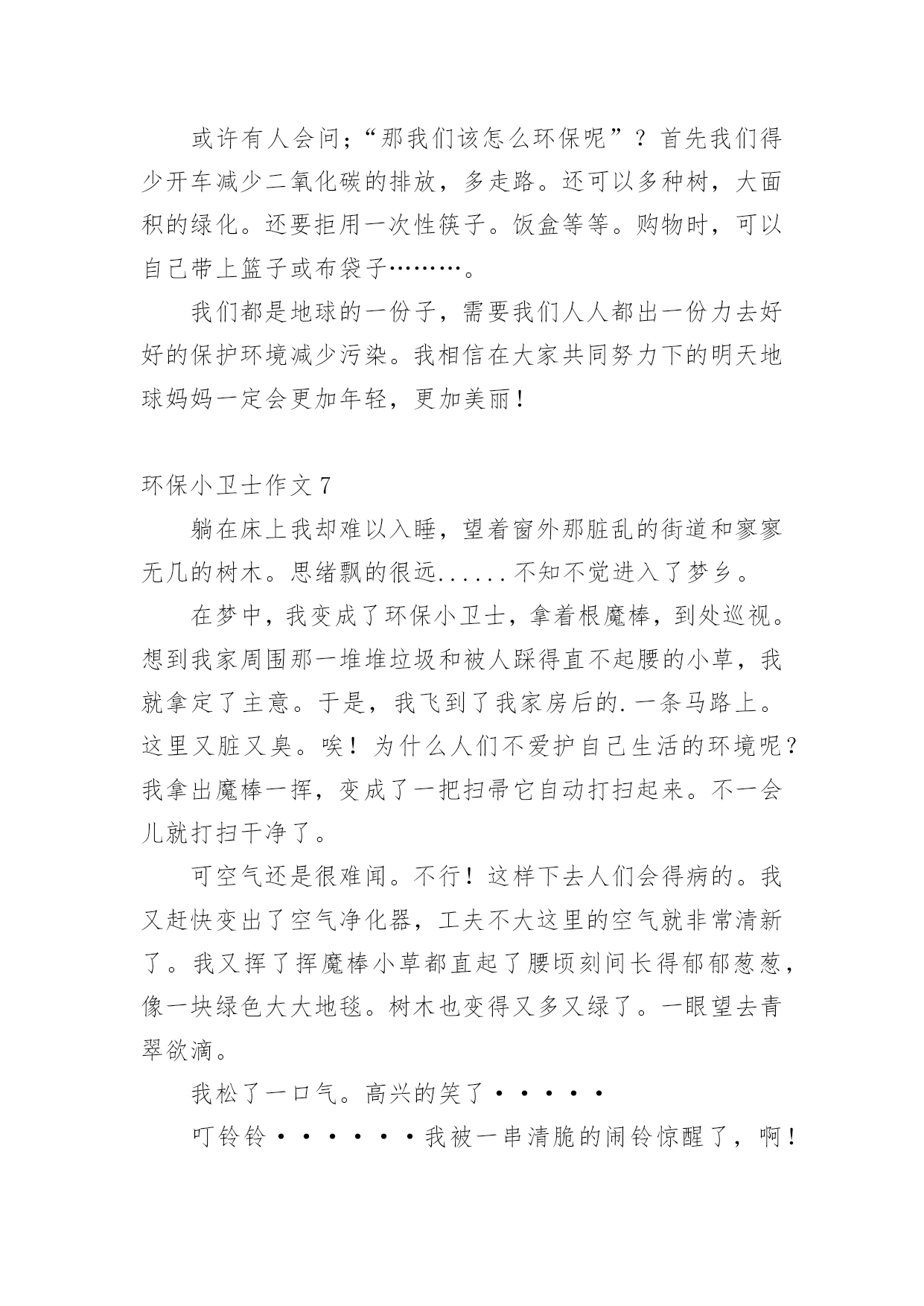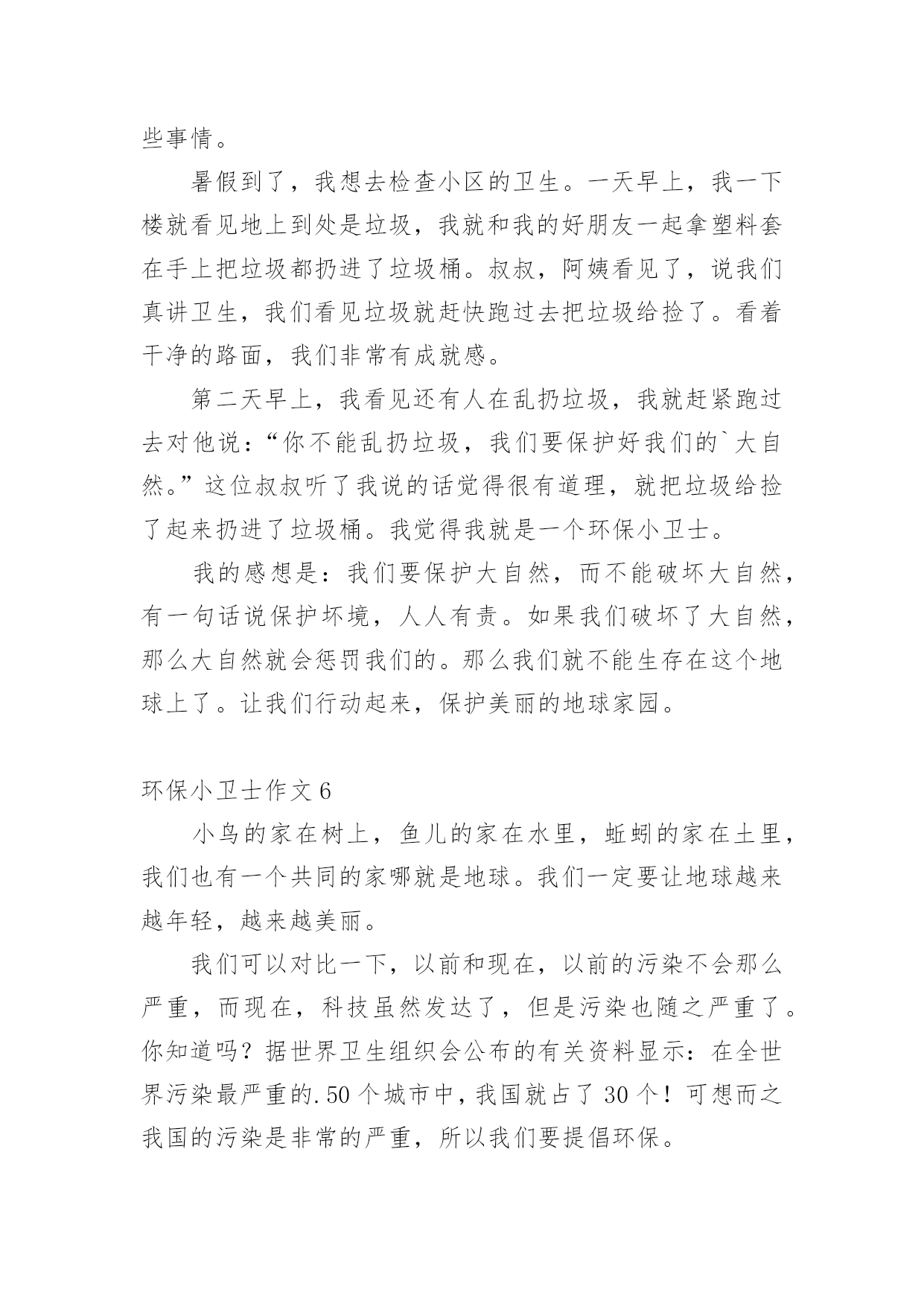 环保小卫士作文环保小卫士作文【推荐】在学习、工作、生活中,大家都尝试过写作文吧,作文是通过文字来表达一个主题意义的记叙方法。相信很多朋友都对写作文感到非常苦恼吧,下面是小编帮大家整理的环保小卫士作文,希望对大家有所帮助。环保小卫士作文1今天是一个太阳火辣辣的日子,下午时分外婆、妈妈、姐姐、弟弟和我一起到湿地公园去玩。那里风光秀丽、景色迷人、十分美丽。我们一来到心目中的'“美丽之城”就看见了许多东西。有大树、绿草、青蛙等。外婆叫我们快看湖面,并说:“瞧瞧!多么干净的湖水啊!”我还看见了高大的摩天轮,摩天轮下面有五光十色的彩灯。我和弟弟用飞快的速度向摩天轮下跑去,姐姐大声喊道:“赶快过来照像啊!”开始照像了,弟弟和姐姐都看着照像机的镜头,而我却发现地上有垃圾,我赶紧把它捡起来丢进垃圾桶里,姐姐说:“表弟,向前一小步,文明一大步。你真是咱们遂宁的‘创卫模范’呢!”我希望小朋友们都能和我一样爱护清洁、保护环境,人人争做“环保小卫士”!环保小卫士作文2随着环境的恶化,白色的垃圾越来越多,街道旁有许多小朋友扔掉的`包装袋,看!这些包装袋翩翩起舞给大家带来了不便,这些垃圾随风飘到了校园。我们的学校就变成了一个垃圾学校,垃圾再飘到教室,教室就变成了垃圾工厂,随着垃圾在各个地方出现,因此在学校开展了一次环保小卫士签名活动,当我签名的哪一刻时,我心想:“我一定要做一名环保小卫士。”我们的教室,校园,奎屯,新疆,中国,这样我们的每一天会更加美丽,把垃圾通通去除,爱护我们的国家从我们身边做起。环保小卫士作文3我住在一个美丽的小区里,开始那里空气是清新的,树木郁郁葱葱,路上们看见了都夸我们这里是瑞安最好的小区。有一天,我又去楼下玩,可我发现了一个奇怪的现象,空气特别难闻非常刺鼻,树木不再那么茂盛的.,路人们看到都说这环境怎么这么差,垃圾怎么那么多,怎么都没人清理啊。我站了好一会儿,才醒悟过来,我心里嘀咕着应该让小伙伴们一起来帮忙打扫啊,让我意想不到的是小伙伴们接到我的电话都痛快的答应了,过了一会她们都来了,我们几个人坐在一起讨论了很久,最后大家决定分组进行工作。第一组去买“不要乱摘花草”和“不要乱丢垃圾的警示牌,买来后摆好,第二组扫地冲洗楼梯走廊,第三组打理花草和枝叶并且把地上的垃圾也扫一遍。我们打扫好了,小区变回了原来干净,整洁,香气宜人的样子了。我们要当一个文明的孩子,让我们一起争当环保小卫士,让我们的家园变得更加美丽。环保小卫士作文4一提起保护环境,低碳生活,大家都会议论纷纷,这是因为工业的迅速发展,是世界二氧化碳存在空气中的指量严重超标,因此,我们更应该低碳生活。在我家,我就是“低碳小达人”。妈妈淘过米的水刚要倒掉,我连忙阻止她,说:“妈妈,淘米的水不可以浪费,用淘米水浇花最好了,我们要节约用水。”妈妈听后,向我竖起大拇指,说:“好,以后咱们家就低碳生活!”我每天洗手时,尽量把水开小一点,用一个小盆接着,存下来冲马桶。每次睡觉时,我都会提醒爸爸把手机关机,这样既可以减少充电次数,又节约了电,岂不一举两得?看电视时尽量把音量开小些,也可以省电。在不用电器时,要把总电源关掉,如果不关电也可以流失。其实低碳生活就在我们每个人的.身边,只要我们有强烈的环保意识就可以做到,生活就会变得更美好,世界也会变得更美好!环保小卫士作文5你们小区有没有人在乱丢垃圾呢?我们小区就有一些人在不知不觉地乱丢垃圾。我看着心里觉得很不舒服,想做一些事情。暑假到了,我想去检查小区的卫生。一天早上,我一下楼就看见地上到处是垃圾,我就和我的好朋友一起拿塑料套在手上把垃圾都扔进了垃圾桶。叔叔,阿姨看见了,说我们真讲卫生,我们看见垃圾就赶快跑过去把垃圾给捡了。看着干净的路面,我们非常有成就感。第二天早上,我看见还有人在乱扔垃圾,我就赶紧跑过去对他说:“你不能乱扔垃圾,我们要保护好我们的`大自然。”这位叔叔听了我说的话觉得很有道理,就把垃圾给捡了起来扔进了垃圾桶。我觉得我就是一个环保小卫士。我的感想是:我们要保护大自然,而不能破坏大自然,有一句话说保护坏境,人人有责。如果我们破坏了大自然,那么大自然就会惩罚我们的。那么我们就不能生存在这个地球上了。让我们行动起来,保护美丽的地球家园。环保小卫士作文6小鸟的家在树上,鱼儿的家在水里,蚯蚓的家在土里,我们也有一个共同的家哪就是地球。我们一定要让地球越来越年轻,越来越美丽。我们可以对比一下,以前和现在,以前的污染不会那么严重,而现在,科技虽然发达了,但是污染也随之严重了。你知道吗?据世界卫生组织会公布的有关资料显示:在全世界污染最严重的.50个城市中,我国就占了30个!可想而之我国的污染是非常的严重,所以我们要提倡环保。或许有人会问;“那我们该怎么环保呢”?首先我们得少开车减少二氧化碳的排放,多走路。还可以多种树,大面积的绿化。还要拒用一