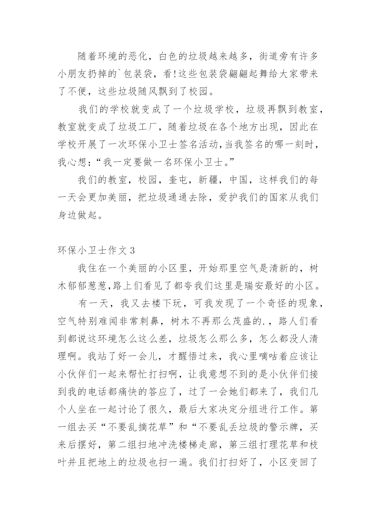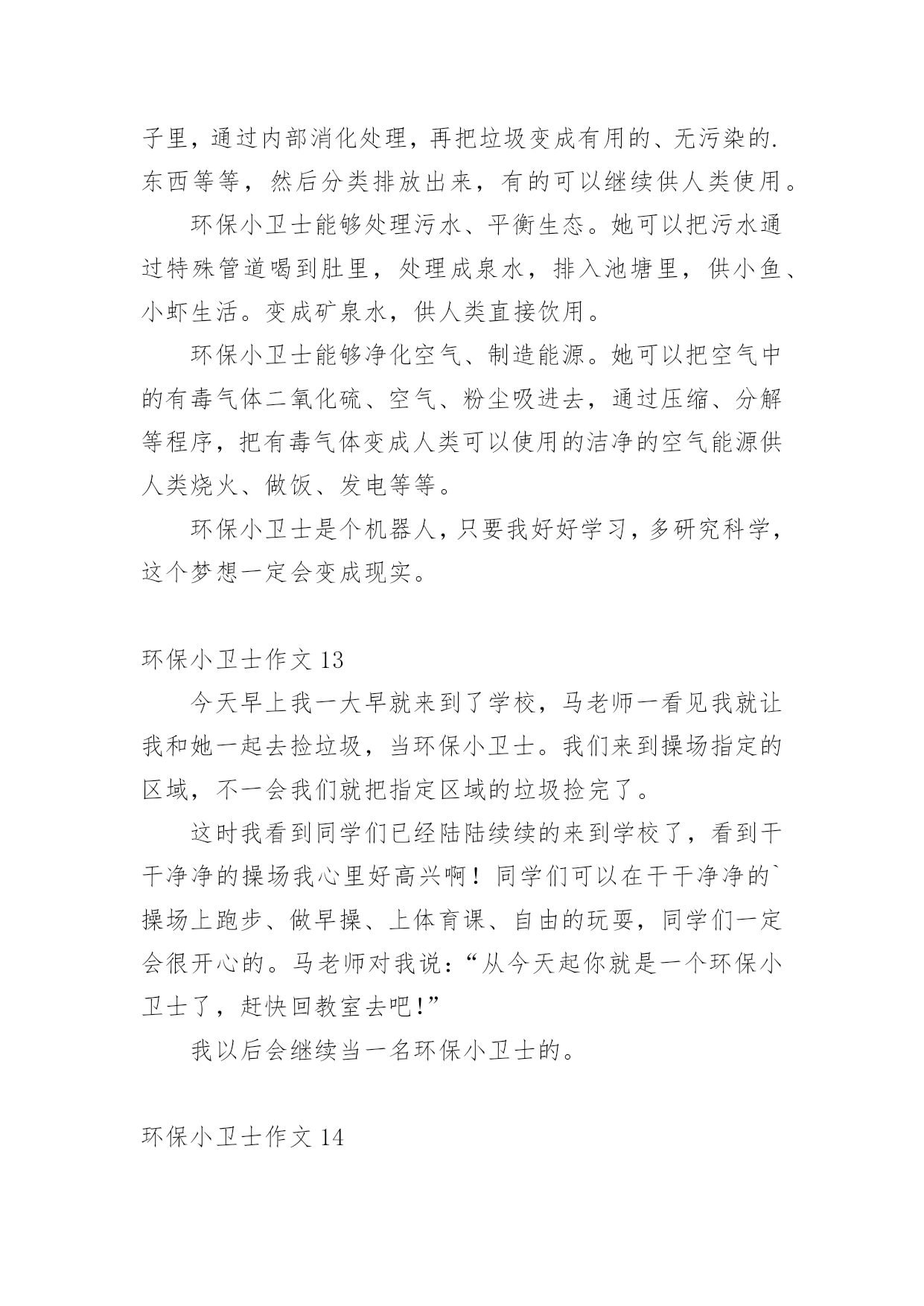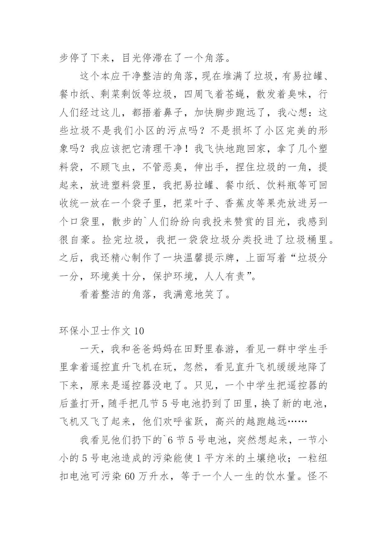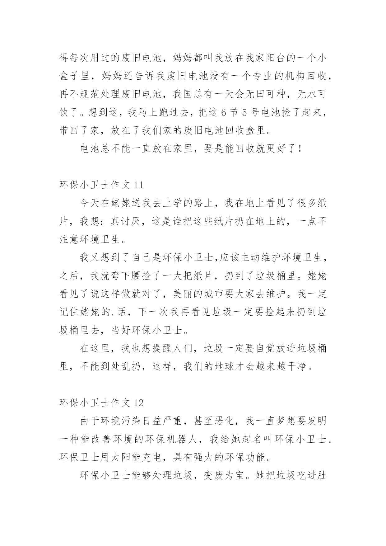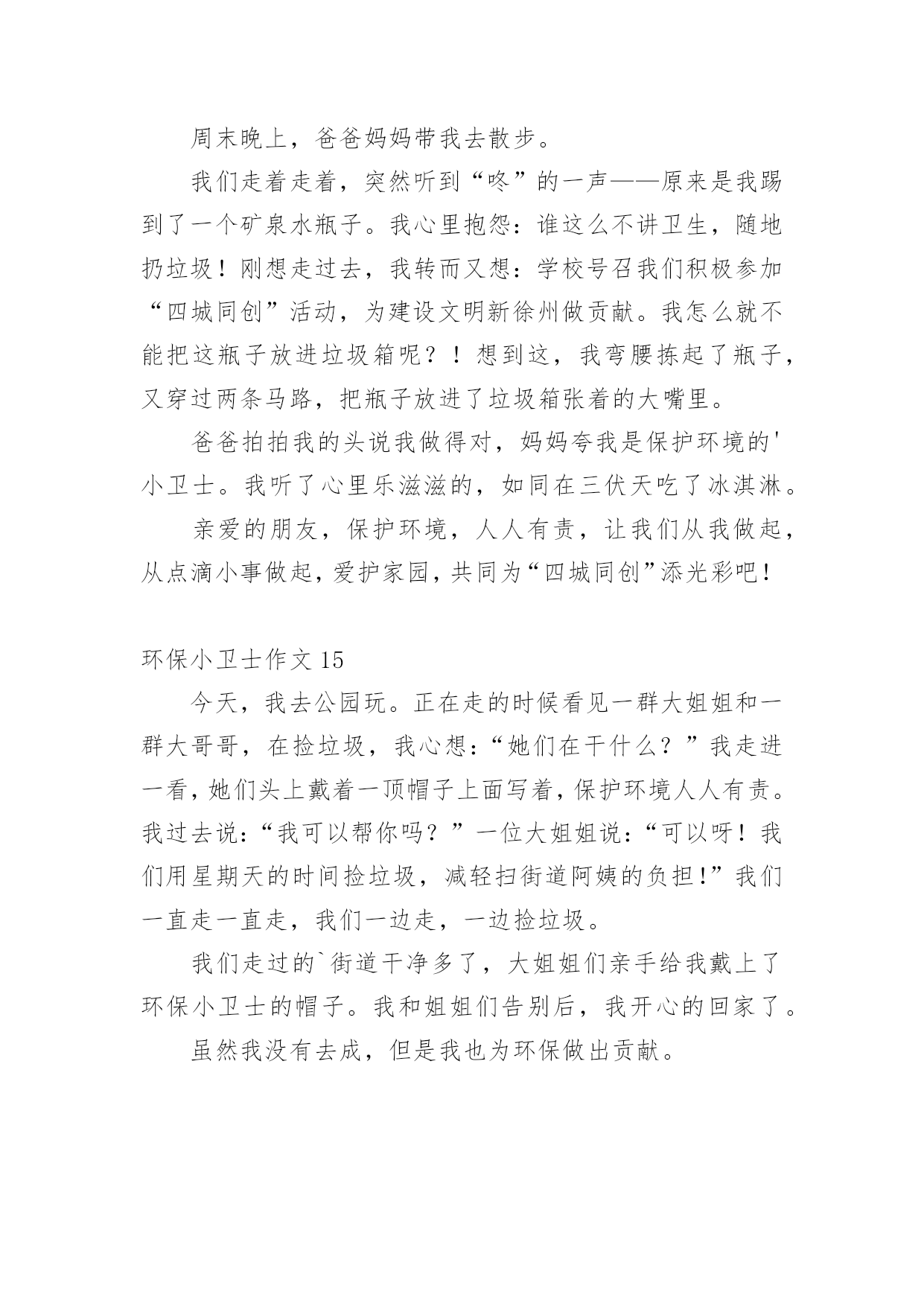 环保小卫士作文环保小卫士作文【推荐】在学习、工作、生活中,大家都尝试过写作文吧,作文是通过文字来表达一个主题意义的记叙方法。相信很多朋友都对写作文感到非常苦恼吧,下面是小编帮大家整理的环保小卫士作文,希望对大家有所帮助。环保小卫士作文1今天是一个太阳火辣辣的日子,下午时分外婆、妈妈、姐姐、弟弟和我一起到湿地公园去玩。那里风光秀丽、景色迷人、十分美丽。我们一来到心目中的'“美丽之城”就看见了许多东西。有大树、绿草、青蛙等。外婆叫我们快看湖面,并说:“瞧瞧!多么干净的湖水啊!”我还看见了高大的摩天轮,摩天轮下面有五光十色的彩灯。我和弟弟用飞快的速度向摩天轮下跑去,姐姐大声喊道:“赶快过来照像啊!”开始照像了,弟弟和姐姐都看着照像机的镜头,而我却发现地上有垃圾,我赶紧把它捡起来丢进垃圾桶里,姐姐说:“表弟,向前一小步,文明一大步。你真是咱们遂宁的‘创卫模范’呢!”我希望小朋友们都能和我一样爱护清洁、保护环境,人人争做“环保小卫士”!环保小卫士作文2随着环境的恶化,白色的垃圾越来越多,街道旁有许多小朋友扔掉的`包装袋,看!这些包装袋翩翩起舞给大家带来了不便,这些垃圾随风飘到了校园。我们的学校就变成了一个垃圾学校,垃圾再飘到教室,教室就变成了垃圾工厂,随着垃圾在各个地方出现,因此在学校开展了一次环保小卫士签名活动,当我签名的哪一刻时,我心想:“我一定要做一名环保小卫士。”我们的教室,校园,奎屯,新疆,中国,这样我们的每一天会更加美丽,把垃圾通通去除,爱护我们的国家从我们身边做起。环保小卫士作文3我住在一个美丽的小区里,开始那里空气是清新的,树木郁郁葱葱,路上们看见了都夸我们这里是瑞安最好的小区。有一天,我又去楼下玩,可我发现了一个奇怪的现象,空气特别难闻非常刺鼻,树木不再那么茂盛的.,路人们看到都说这环境怎么这么差,垃圾怎么那么多,怎么都没人清理啊。我站了好一会儿,才醒悟过来,我心里嘀咕着应该让小伙伴们一起来帮忙打扫啊,让我意想不到的是小伙伴们接到我的电话都痛快的答应了,过了一会她们都来了,我们几个人坐在一起讨论了很久,最后大家决定分组进行工作。第一组去买“不要乱摘花草”和“不要乱丢垃圾的警示牌,买来后摆好,第二组扫地冲洗楼梯走廊,第三组打理花草和枝叶并且把地上的垃圾也扫一遍。我们打扫好了,小区变回了原来干净,整洁,香气宜人的样子了。我们要当一个文明的孩子,让我们一起争当环保小卫士,让我们的家园变得更加美丽。环保小卫士作文4一提起保护环境,低碳生活,大家都会议论纷纷,这是因为工业的迅速发展,是世界二氧化碳存在空气中的指量严重超标,因此,我们更应该低碳生活。在我家,我就是“低碳小达人”。妈妈淘过米的水刚要倒掉,我连忙阻止她,说:“妈妈,淘米的水不可以浪费,用淘米水浇花最好了,我们要节约用水。”妈妈听后,向我竖起大拇指,说:“好,以后咱们家就低碳生活!”我每天洗手时,尽量把水开小一点,用一个小盆接着,存下来冲马桶。每次睡觉时,我都会提醒爸爸把手机关机,这样既可以减少充电次数,又节约了电,岂不一举两得?看电视时尽量把音量开小些,也可以省电。在不用电器时,要把总电源关掉,如果不关电也可以流失。其实低碳生活就在我们每个人的.身边,只要我们有强烈的环保意识就可以做到,生活就会变得更美好,世界也会变得更美好!环保小卫士作文5你们小区有没有人在乱丢垃圾呢?我们小区就有一些人在不知不觉地乱丢垃圾。我看着心里觉得很不舒服,想做一些事情。暑假到了,我想去检查小区的卫生。一天早上,我一下楼就看见地上到处是垃圾,我就和我的好朋友一起拿塑料套在手上把垃圾都扔进了垃圾桶。叔叔,阿姨看见了,说我们真讲卫生,我们看见垃圾就赶快跑过去把垃圾给捡了。看着干净的路面,我们非常有成就感。第二天早上,我看见还有人在乱扔垃圾,我就赶紧跑过去对他说:“你不能乱扔垃圾,我们要保护好我们的`大自然。”这位叔叔听了我说的话觉得很有道理,就把垃圾给捡了起来扔进了垃圾桶。我觉得我就是一个环保小卫士。我的感想是:我们要保护大自然,而不能破坏大自然,有一句话说保护坏境,人人有责。如果我们破坏了大自然,那么大自然就会惩罚我们的。那么我们就不能生存在这个地球上了。让我们行动起来,保护美丽的地球家园。环保小卫士作文6小鸟的家在树上,鱼儿的家在水里,蚯蚓的家在土里,我们也有一个共同的家哪就是地球。我们一定要让地球越来越年轻,越来越美丽。我们可以对比一下,以前和现在,以前的污染不会那么严重,而现在,科技虽然发达了,但是污染也随之严重了。你知道吗?据世界卫生组织会公布的有关资料显示:在全世界污染最严重的.50个城市中,我国就占了30个!可想而之我国的污染是非常的严重,所以我们要提倡环保。或许有人会问;“那我们该怎么环保呢”?首先我们得少开车减少二氧化碳的排放,多走路。还可以多种树,大面积的绿化。还要拒用一