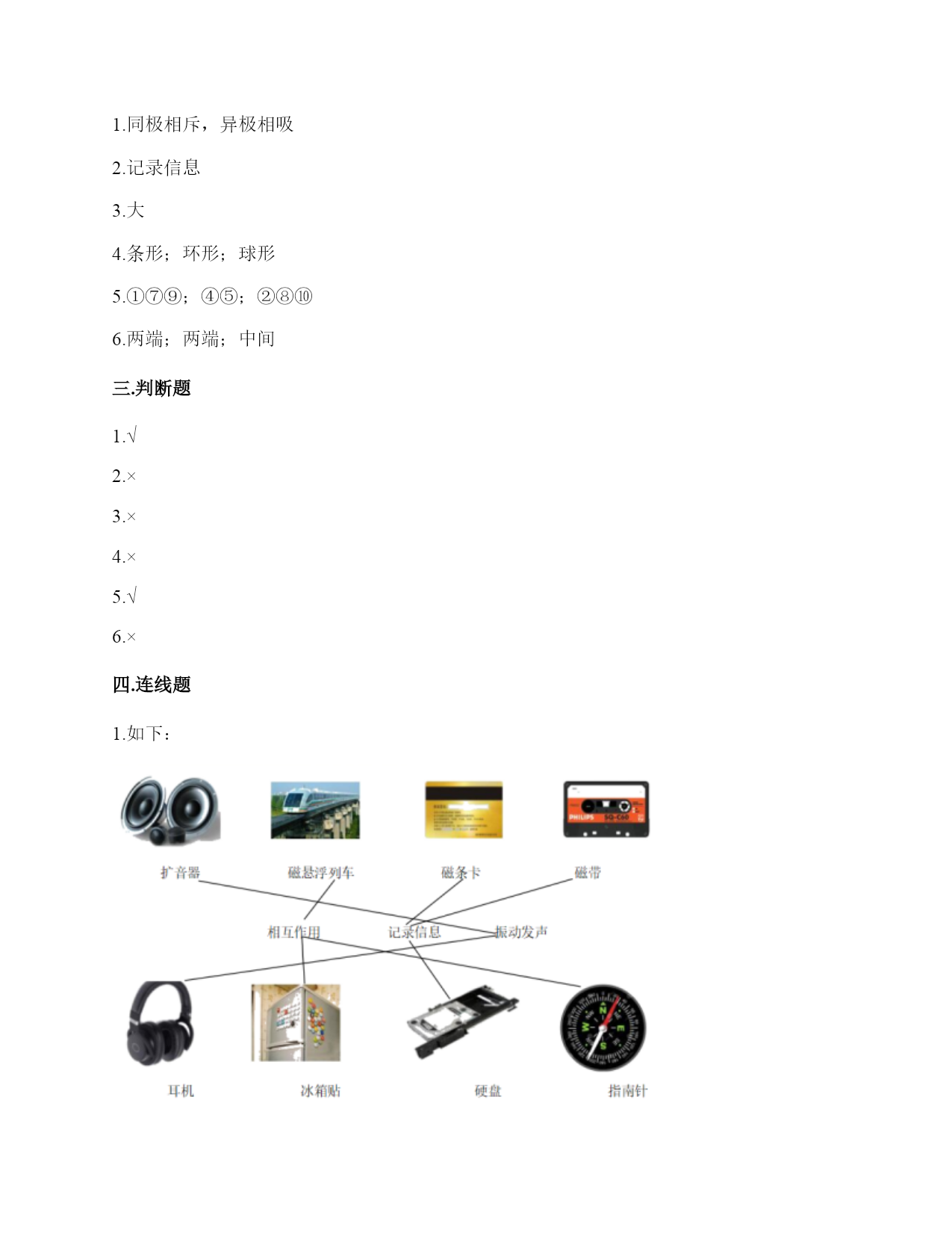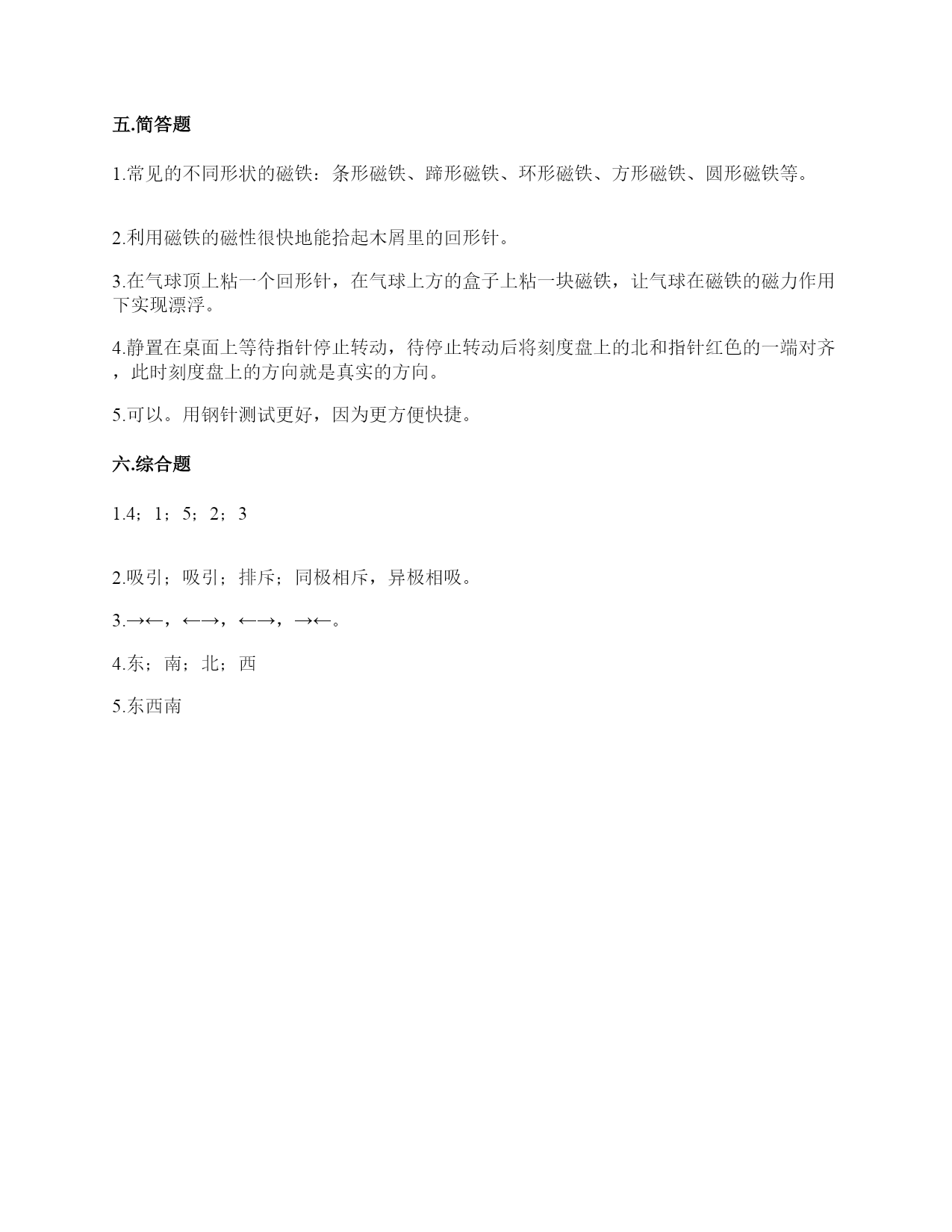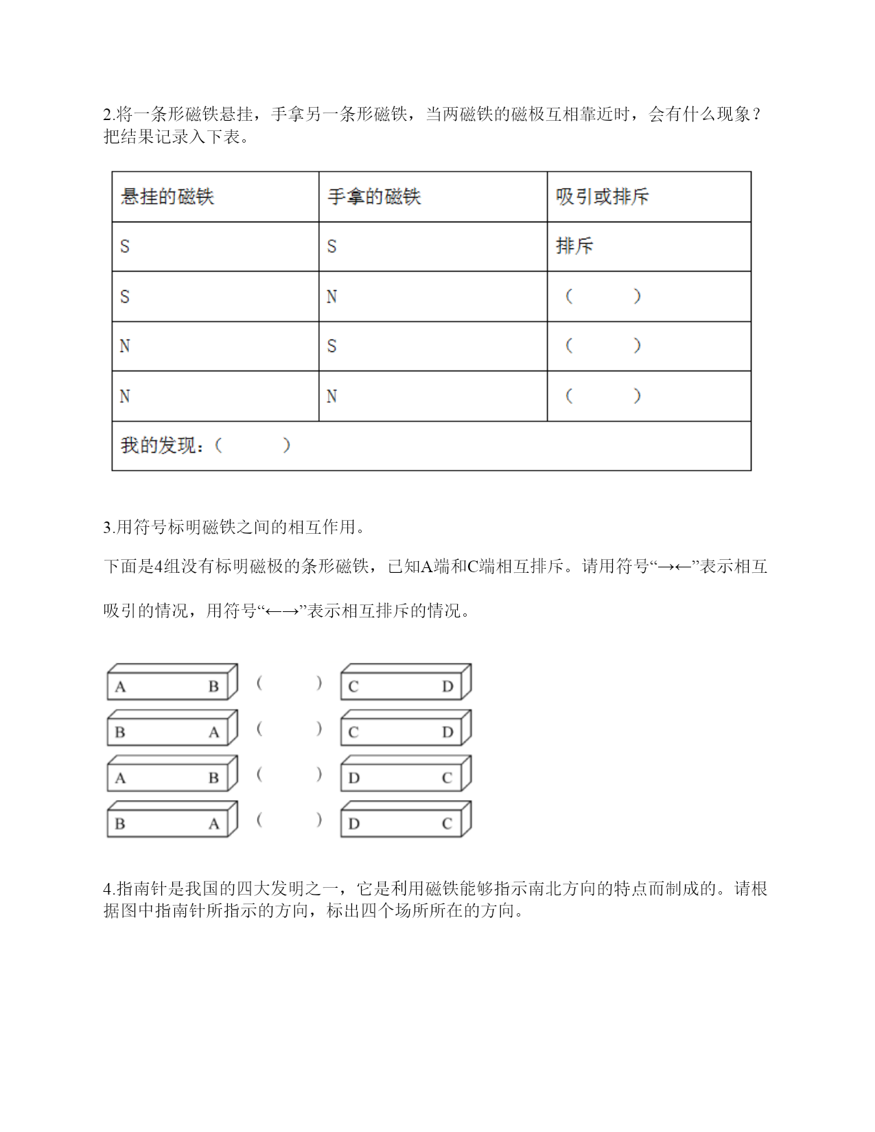小学科学《磁铁》练习题一.选择题(共6题,共12分)1.下列说法错误的是()。A.把条形磁铁摔成两个半块,每个半块剩下一个磁极B.球形磁铁也有两个磁极C.不同形状的磁铁之间也是同极相斥、异极相吸2.将一颗小钢珠放在磁力非常强的条形磁铁的中间,松开手,小钢珠会()A.掉下来B.滚向一端C.不动3.雨轩用环形磁铁指示方向时,按实际方向把纸放好后,环形磁铁的状态应该是()A.B.C.4.有的硬币能被磁铁吸引是因为含有()。A.铁B.磁铁C.镍5.指南针是利用磁铁什么性质制成的?()A.磁铁能指示南北方向的特点B.隔空吸物的特点C.吸铁的特点6.我们可以用“支架法”给()磁铁进行指示方向的实验。A.蹄形B.环形C.条形二.填空题(共6题,共26分)1.两个相同的磁极叫同极,不相同的磁极叫异极。当两块磁铁相互靠近时,()。2.磁带中磁铁的作用是()。3.磁极是磁铁磁力最()的地方。4.磁铁从形状上看可以分为()磁铁、蹄形磁铁、()磁铁、()磁铁等等。5.分一分,将序号填在相应的磁铁功能横线上。①硬盘②冰箱贴③瓷勺④耳机⑤扬声器⑥钢针⑦磁带⑧磁悬浮列车⑨磁条卡⑩门吸记录信息:()振动发声:()相互作用:()6.我们在借助“曲别针感受条形磁铁不同部位的磁力大小”实验时,我们感受到的现象是曲别针在磁铁()时受到了更大的吸力,远离()吸力也来越小,在()的位置几乎没有感觉到吸力。三.判断题(共6题,共12分)1.磁铁可以在不接触小车的情况下吸引小车,使小车运动。()2.摔断的磁铁就不再具有磁极了。()3.我们在做“磁铁能隔着这些物体吸引小车”时,只要做一次就能判断出结果了。()4.隔着水是不能使小车动起来的。()5.我们在做“条形磁铁能指示方向”时,先要把磁铁用白纸包裹起来,并在两端写上数字或(字母),便于观察。()6.小明的铜钥匙掉进了树洞里,我们可以用磁铁把它吸出来。()四.连线题(共1题,共8分)1.下列物品中的磁铁都利用了什么原理?连一连。扩音器磁悬浮列车磁条卡磁带相互作用记录信息振动发声耳机冰箱贴硬盘指南针五.简答题(共5题,共30分)1.请写出4种不同形状的磁铁的名称。2.如何尽快地拾起木屑中的回形针(如下图)?3.我们在游乐场会看到有卖向上漂浮的气球,这是因为里面装入了比空气轻的氢气或氦气,你能用磁铁的原理代替氢气做出漂浮气球的效果吗?(请想一想,画出你的设计想法)4.如何使用指南针辨认方向?5.制作水浮式指南针时,我们是用摩擦过的钢针去吸引其他钢针来测试它有没有磁性的。可以用磁铁来测试吗?如果可以,哪种方法更好?如果不可以,为什么?六.综合题(共5题,共35分)1.请将下列步骤排序。()转动指南针。()把指南针放平。()使刻度盘上的南、北方向与磁针所指方向一致。()让磁针自由转动。()磁针静止后红色一端指北方,白色一端指南方。顺序是()。2.将一条形磁铁悬挂,手拿另一条形磁铁,当两磁铁的磁极互相靠近时,会有什么现象?把结果记录入下表。3.用符号标明磁铁之间的相互作用。下面是4组没有标明磁极的条形磁铁,已知A端和C端相互排斥。请用符号“→←”表示相互吸引的情况,用符号“←→”表示相互排斥的情况。4.指南针是我国的四大发明之一,它是利用磁铁能够指示南北方向的特点而制成的。请根据图中指南针所指示的方向,标出四个场所所在的方向。游泳馆()学校()邮局()书店()5.在图中标出东、南、西三个方向。参考答案一.选择题1.A2.B3.A4.C5.A6.C二.填空题1.同极相斥,异极相吸2.记录信息3.大4.条形;环形;球形5.①⑦⑨;④⑤;②⑧⑩6.两端;两端;中间三.判断题1.√2.×3.×4.×5.√6.×四.连线题1.如下:五.简答题1.常见的不同形状的磁铁:条形磁铁、蹄形磁铁、环形磁铁、方形磁铁、圆形磁铁等。2.利用磁铁的磁性很快地能拾起木屑里的回形针。3.在气球顶上粘一个回形针,在气球上方的盒子上粘一块磁铁,让气球在磁铁的磁力作用下实现漂浮。4.静置在桌面上等待指针停止转动,待停止转动后将刻度盘上的北和指针红色的一端对齐,此时刻度盘上的方向就是真实的方向。5.可以。用钢针测试更好,因为更方便快捷。六.综合题1.4;1;5;2;32.吸引;吸引;排斥;同极相斥,异极相吸。3.→←,←→,←→,→←。4.东;南;北;西5.东西南