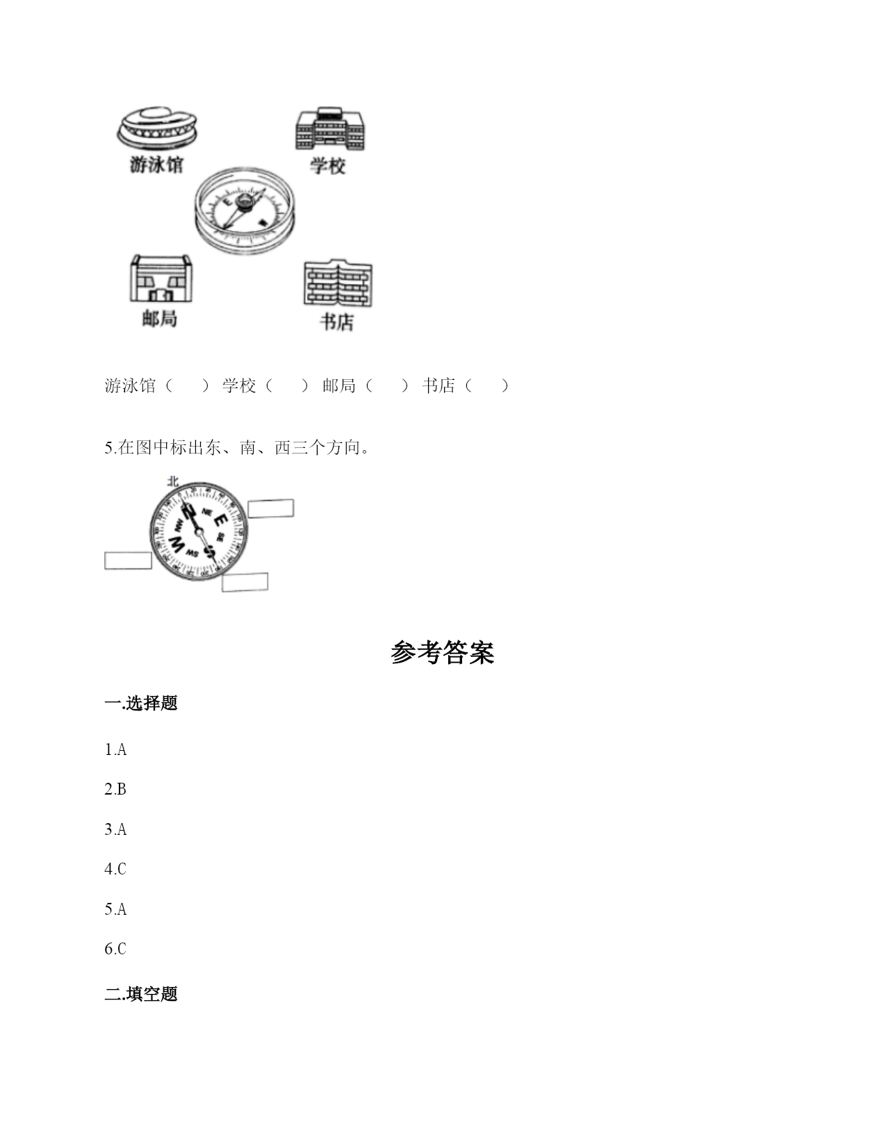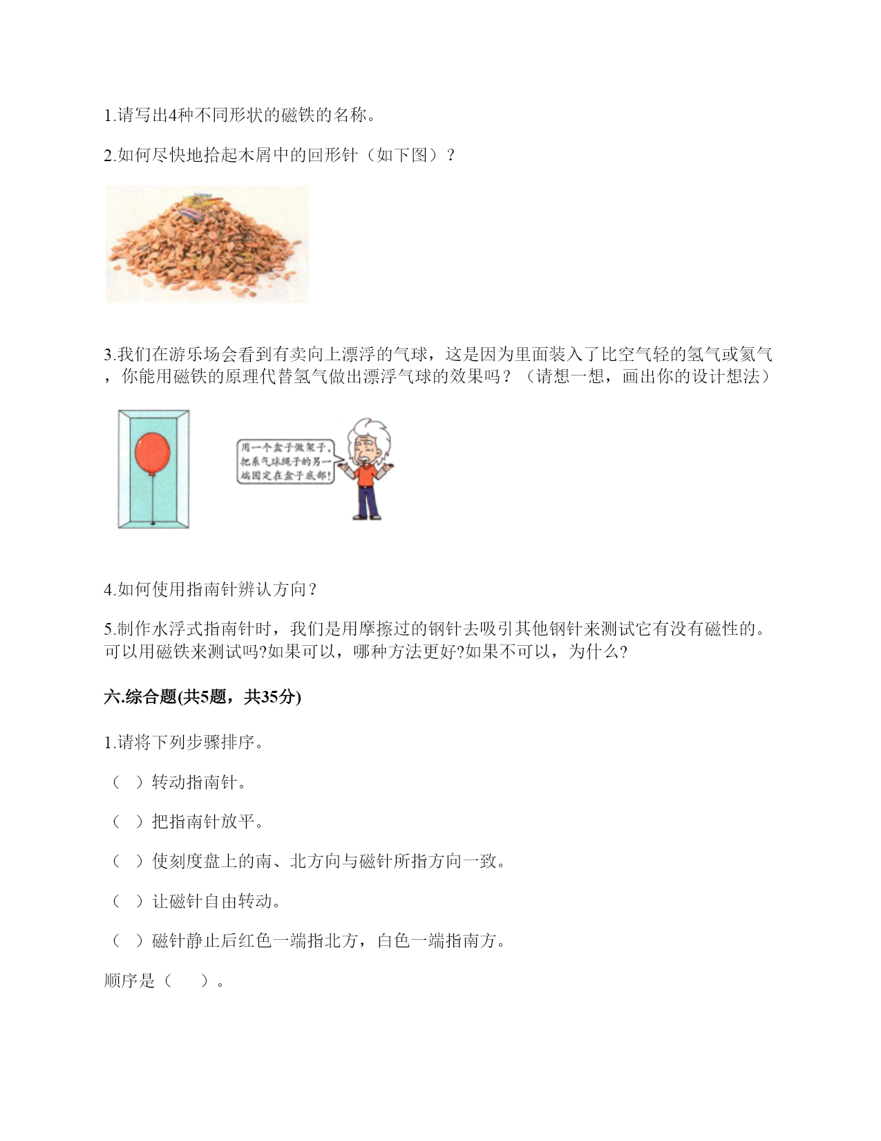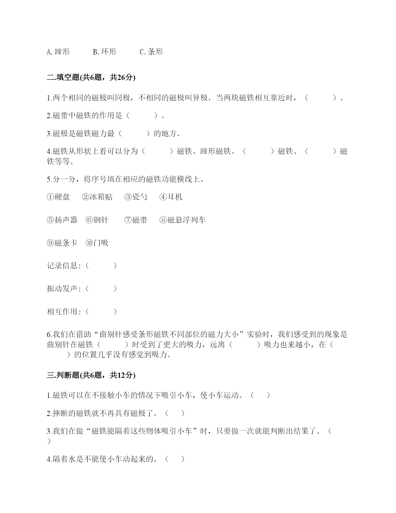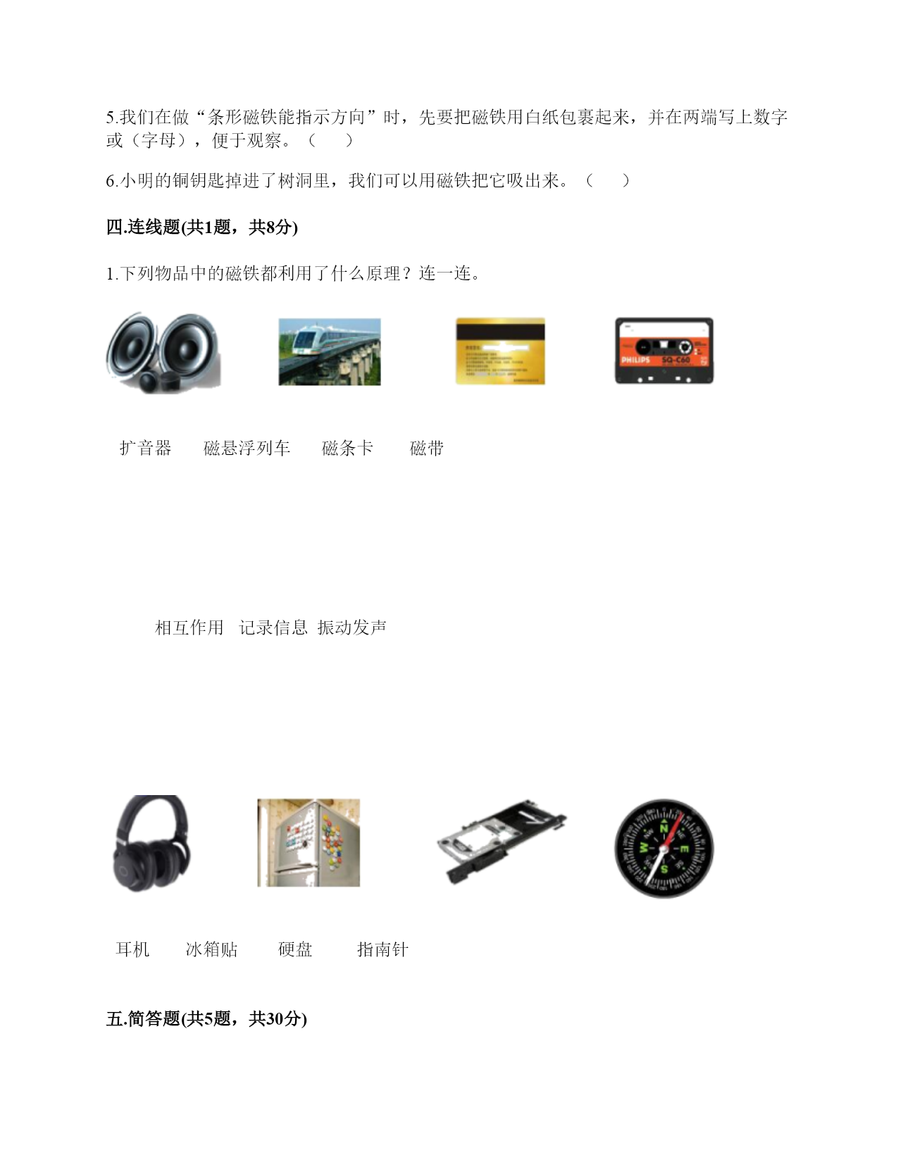 小学科学《磁铁》练习题一.选择题(共6题,共12分)1.下列说法错误的是()。A.把条形磁铁摔成两个半块,每个半块剩下一个磁极B.球形磁铁也有两个磁极C.不同形状的磁铁之间也是同极相斥、异极相吸2.将一颗小钢珠放在磁力非常强的条形磁铁的中间,松开手,小钢珠会()A.掉下来B.滚向一端C.不动3.雨轩用环形磁铁指示方向时,按实际方向把纸放好后,环形磁铁的状态应该是()A.B.C.4.有的硬币能被磁铁吸引是因为含有()。A.铁B.磁铁C.镍5.指南针是利用磁铁什么性质制成的?()A.磁铁能指示南北方向的特点B.隔空吸物的特点C.吸铁的特点6.我们可以用“支架法”给()磁铁进行指示方向的实验。A.蹄形B.环形C.条形二.填空题(共6题,共26分)1.两个相同的磁极叫同极,不相同的磁极叫异极。当两块磁铁相互靠近时,()。2.磁带中磁铁的作用是()。3.磁极是磁铁磁力最()的地方。4.磁铁从形状上看可以分为()磁铁、蹄形磁铁、()磁铁、()磁铁等等。5.分一分,将序号填在相应的磁铁功能横线上。①硬盘②冰箱贴③瓷勺④耳机⑤扬声器⑥钢针⑦磁带⑧磁悬浮列车⑨磁条卡⑩门吸记录信息:()振动发声:()相互作用:()6.我们在借助“曲别针感受条形磁铁不同部位的磁力大小”实验时,我们感受到的现象是曲别针在磁铁()时受到了更大的吸力,远离()吸力也来越小,在()的位置几乎没有感觉到吸力。三.判断题(共6题,共12分)1.磁铁可以在不接触小车的情况下吸引小车,使小车运动。()2.摔断的磁铁就不再具有磁极了。()3.我们在做“磁铁能隔着这些物体吸引小车”时,只要做一次就能判断出结果了。()4.隔着水是不能使小车动起来的。()5.我们在做“条形磁铁能指示方向”时,先要把磁铁用白纸包裹起来,并在两端写上数字或(字母),便于观察。()6.小明的铜钥匙掉进了树洞里,我们可以用磁铁把它吸出来。()四.连线题(共1题,共8分)1.下列物品中的磁铁都利用了什么原理?连一连。扩音器磁悬浮列车磁条卡磁带相互作用记录信息振动发声耳机冰箱贴硬盘指南针五.简答题(共5题,共30分)1.请写出4种不同形状的磁铁的名称。2.如何尽快地拾起木屑中的回形针(如下图)?3.我们在游乐场会看到有卖向上漂浮的气球,这是因为里面装入了比空气轻的氢气或氦气,你能用磁铁的原理代替氢气做出漂浮气球的效果吗?(请想一想,画出你的设计想法)4.如何使用指南针辨认方向?5.制作水浮式指南针时,我们是用摩擦过的钢针去吸引其他钢针来测试它有没有磁性的。可以用磁铁来测试吗?如果可以,哪种方法更好?如果不可以,为什么?六.综合题(共5题,共35分)1.请将下列步骤排序。()转动指南针。()把指南针放平。()使刻度盘上的南、北方向与磁针所指方向一致。()让磁针自由转动。()磁针静止后红色一端指北方,白色一端指南方。顺序是()。2.将一条形磁铁悬挂,手拿另一条形磁铁,当两磁铁的磁极互相靠近时,会有什么现象?把结果记录入下表。3.用符号标明磁铁之间的相互作用。下面是4组没有标明磁极的条形磁铁,已知A端和C端相互排斥。请用符号“→←”表示相互吸引的情况,用符号“←→”表示相互排斥的情况。4.指南针是我国的四大发明之一,它是利用磁铁能够指示南北方向的特点而制成的。请根据图中指南针所指示的方向,标出四个场所所在的方向。游泳馆()学校()邮局()书店()5.在图中标出东、南、西三个方向。参考答案一.选择题1.A2.B3.A4.C5.A6.C二.填空题1.同极相斥,异极相吸2.记录信息3.大4.条形;环形;球形5.①⑦⑨;④⑤;②⑧⑩6.两端;两端;中间三.判断题1.√2.×3.×4.×5.√6.×四.连线题1.如下:五.简答题1.常见的不同形状的磁铁:条形磁铁、蹄形磁铁、环形磁铁、方形磁铁、圆形磁铁等。2.利用磁铁的磁性很快地能拾起木屑里的回形针。3.在气球顶上粘一个回形针,在气球上方的盒子上粘一块磁铁,让气球在磁铁的磁力作用下实现漂浮。4.静置在桌面上等待指针停止转动,待停止转动后将刻度盘上的北和指针红色的一端对齐,此时刻度盘上的方向就是真实的方向。5.可以。用钢针测试更好,因为更方便快捷。六.综合题1.4;1;5;2;32.吸引;吸引;排斥;同极相斥,异极相吸。3.→←,←→,←→,→←。4.东;南;北;西5.东西南