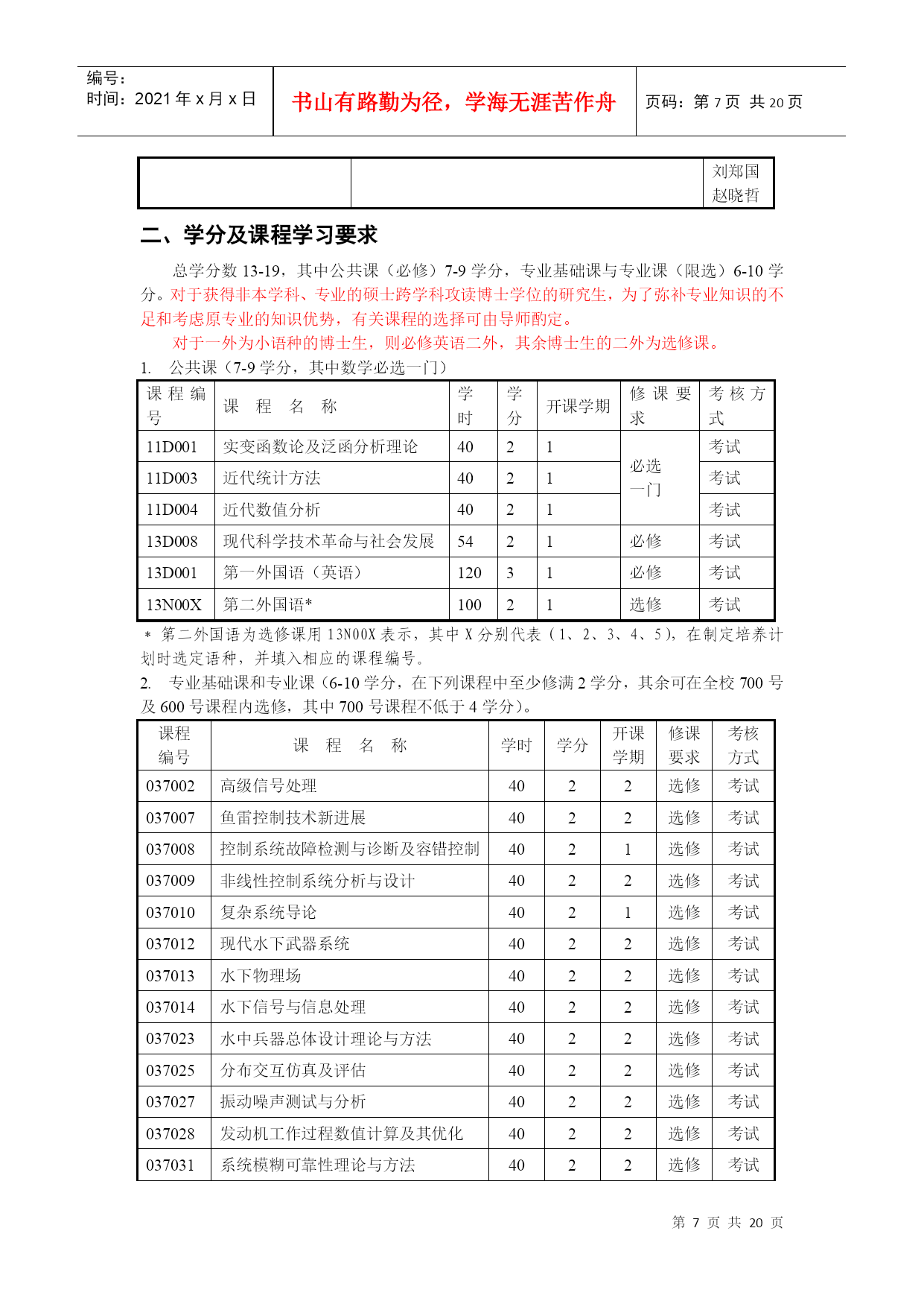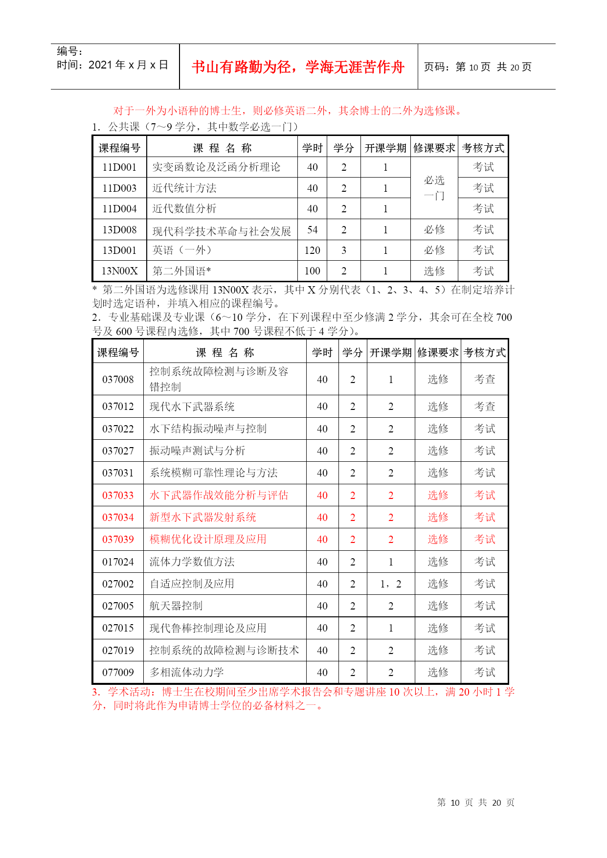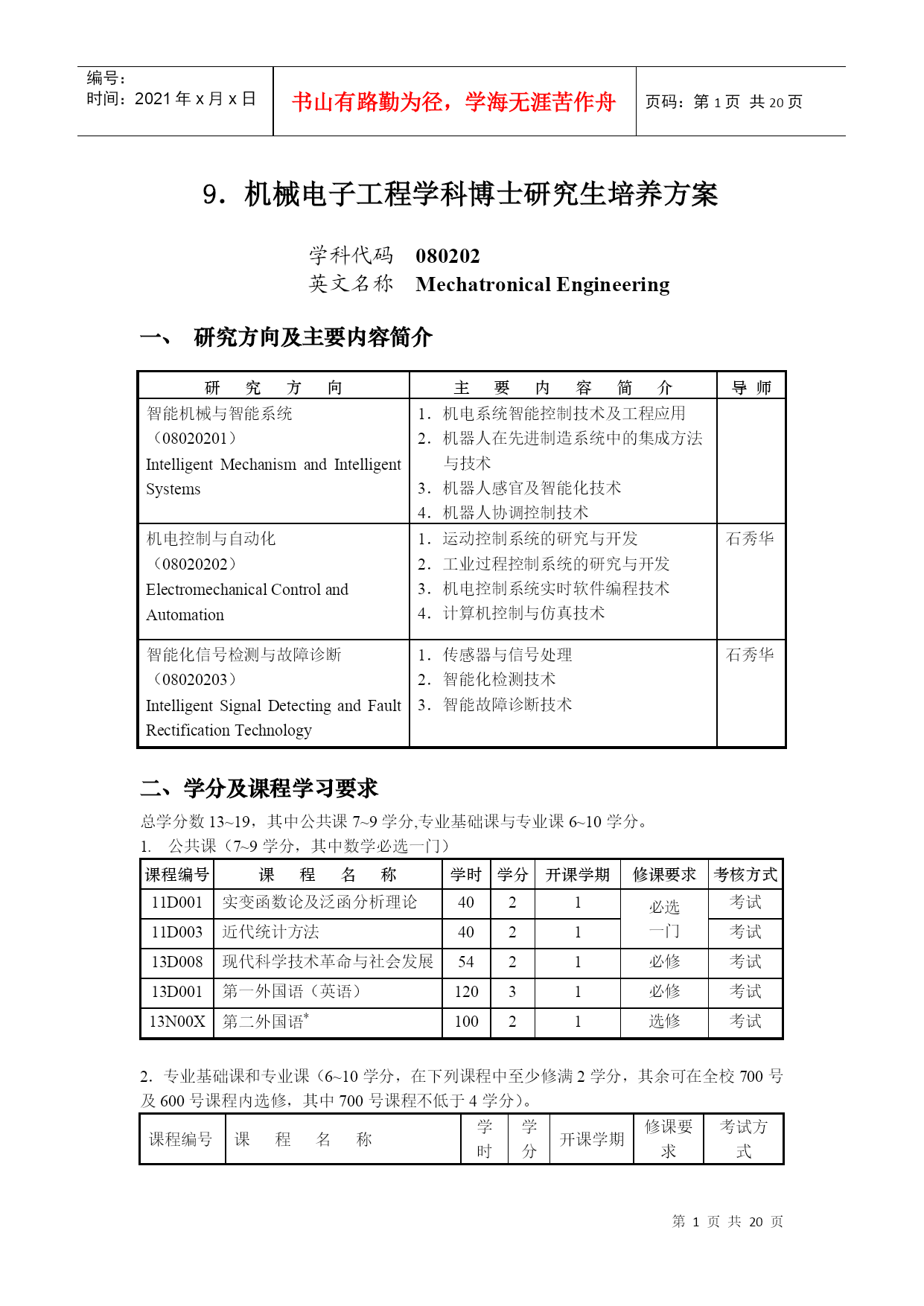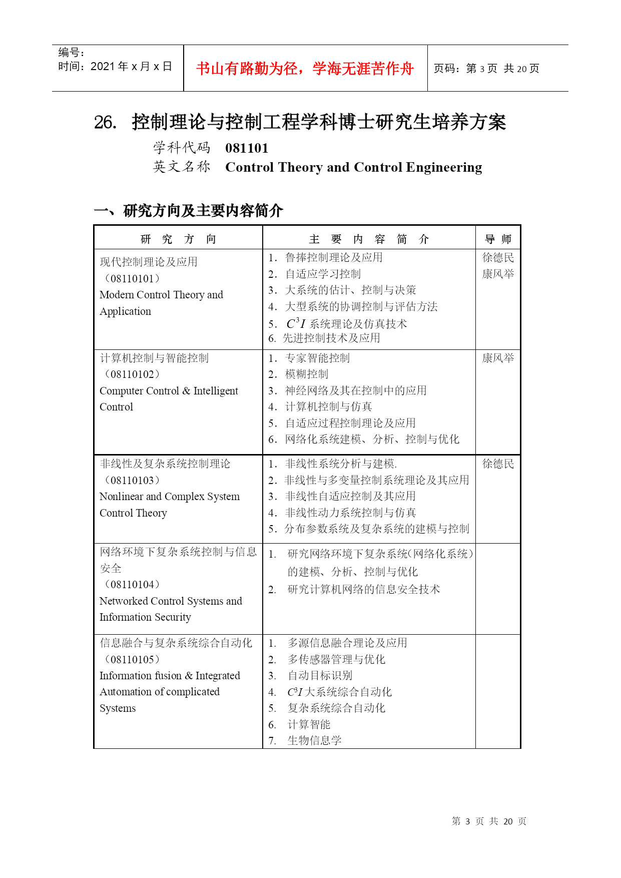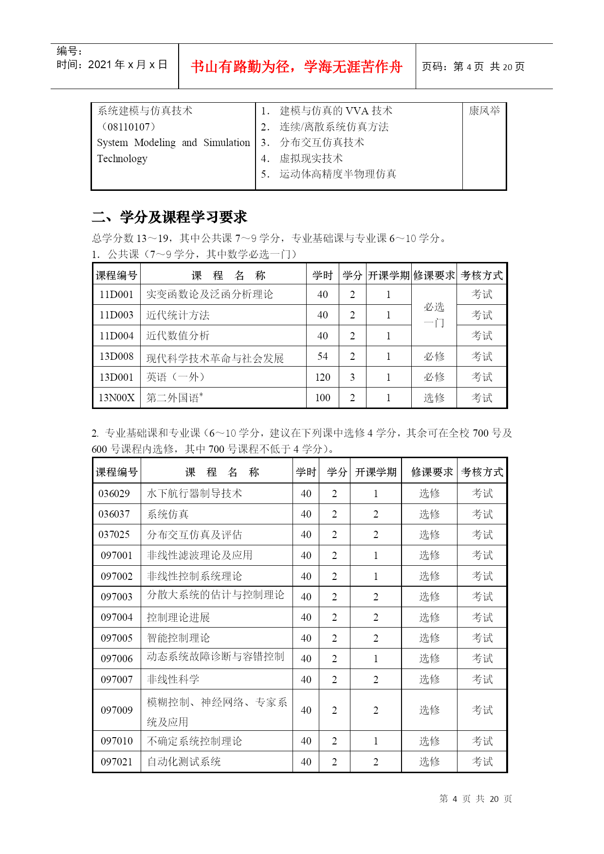 编号:时间:2021年x月x日书山有路勤为径,学海无涯苦作舟页码:第PAGE20页共NUMPAGES20页第PAGE\*MERGEFORMAT20页共NUMPAGES\*MERGEFORMAT20页9.机械电子工程学科博士研究生培养方案学科代码080202英文名称MechatronicalEngineering一、研究方向及主要内容简介研究方向主要内容简介导师智能机械与智能系统(08020201)IntelligentMechanismandIntelligentSystems1.机电系统智能控制技术及工程应用2.机器人在先进制造系统中的集成方法与技术3.机器人感官及智能化技术4.机器人协调控制技术机电控制与自动化(08020202)ElectromechanicalControlandAutomation1.运动控制系统的研究与开发2.工业过程控制系统的研究与开发3.机电控制系统实时软件编程技术4.计算机控制与仿真技术石秀华智能化信号检测与故障诊断(08020203)IntelligentSignalDetectingandFaultRectificationTechnology1.传感器与信号处理2.智能化检测技术3.智能故障诊断技术石秀华二、学分及课程学习要求总学分数13~19,其中公共课7~9学分,专业基础课与专业课6~10学分。公共课(7~9学分,其中数学必选一门)课程编号课程名称学时学分开课学期修课要求考核方式11D001实变函数论及泛函分析理论4021必选一门考试11D003近代统计方法4021考试13D008现代科学技术革命与社会发展5421必修考试13D001第一外国语(英语)12031必修考试13N00X第二外国语*10021选修考试2.专业基础课和专业课(6~10学分,在下列课程中至少修满2学分,其余可在全校700号及600号课程内选修,其中700号课程不低于4学分)。课程编号课程名称学时学分开课学期修课要求考试方式037008控制系统故障检测与诊断及容错控制4021选修考查037025分布交互仿真及评估4022选修考试037027振动噪声测试与分析技术4021选修考试037039模糊优化设计原理及应用4022选修考试*第二外国语为选修课用13N00X表示,其中X分别代表(1、2、3、4、5)在制定培养计划时选定语种,并填入相应的课程编号。26.控制理论与控制工程学科博士研究生培养方案学科代码081101英文名称ControlTheoryandControlEngineering一、研究方向及主要内容简介研究方向主要内容简介导师现代控制理论及应用(08110101)ModernControlTheoryandApplication1.鲁捧控制理论及应用2.自适应学习控制3.大系统的估计、控制与决策4.大型系统的协调控制与评估方法5.系统理论及仿真技术6.先进控制技术及应用徐德民康风举计算机控制与智能控制(08110102)ComputerControl&IntelligentControl1.专家智能控制2.模糊控制3.神经网络及其在控制中的应用4.计算机控制与仿真5.自适应过程控制理论及应用6.网络化系统建模、分析、控制与优化康风举非线性及复杂系统控制理论(08110103)NonlinearandComplexSystemControlTheory1.非线性系统分析与建模.2.非线性与多变量控制系统理论及其应用3.非线性自适应控制及其应用4.非线性动力系统控制与仿真5.分布参数系统及复杂系统的建模与控制徐德民网络环境下复杂系统控制与信息安全(08110104)NetworkedControlSystemsandInformationSecurity研究网络环境下复杂系统(网络化系统)的建模、分析、控制与优化研究计算机网络的信息安全技术信息融合与复杂系统综合自动化(08110105)Informationfusion&IntegratedAutomationofcomplicatedSystems多源信息融合理论及应用多传感器管理与优化自动目标识别C3I大系统综合自动化复杂系统综合自动化计算智能生物信息学系统建模与仿真技术(08110107)SystemModelingandSimulationTechnology建模与仿真的VVA技术连续/离散系统仿真方法分布交互仿真技术虚拟现实技术运动体高精度半物理仿真康凤举二、学分及课程学习要求总学分数13~19,其中公共课7~9学分,专业基础课与专业课6~1