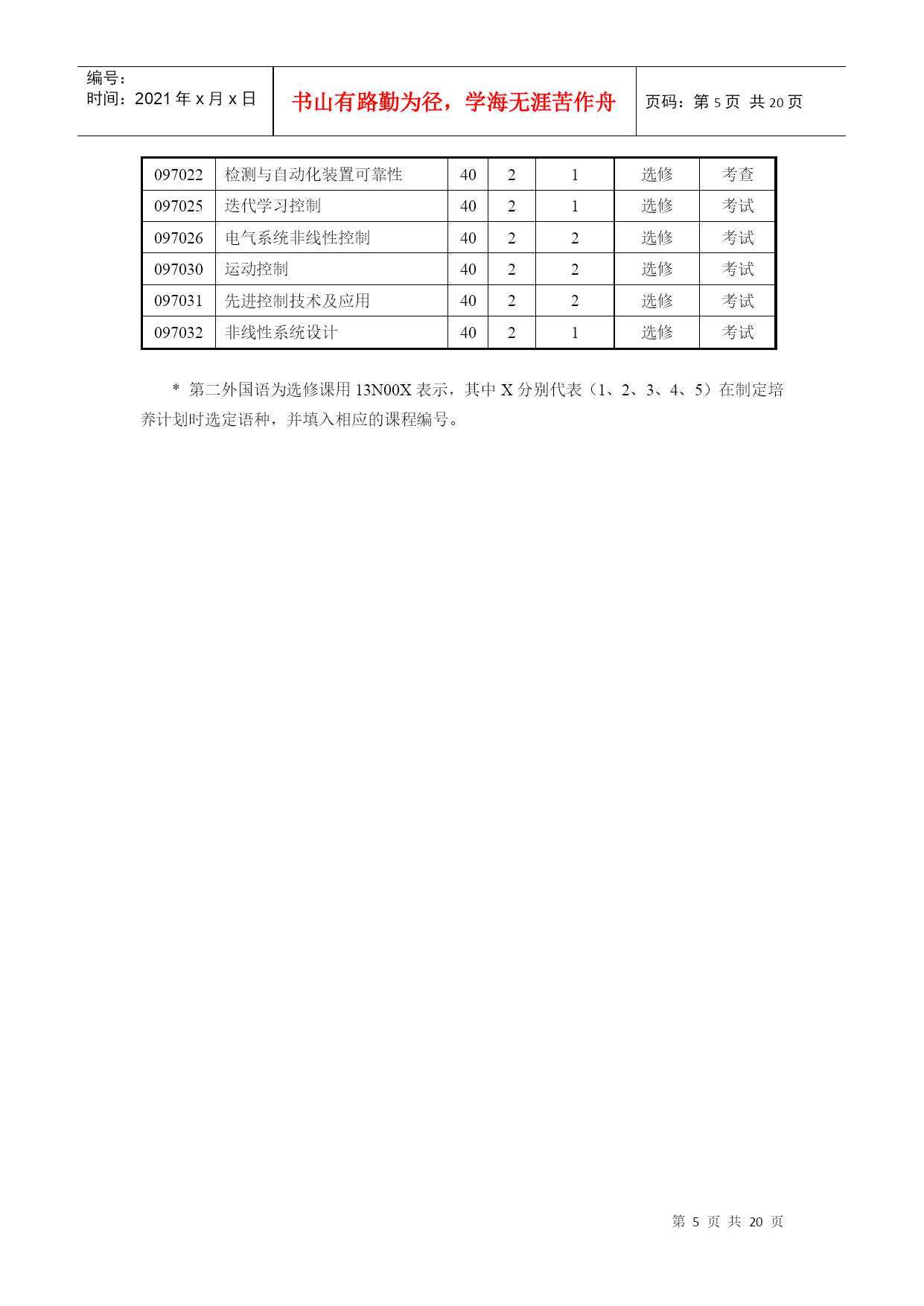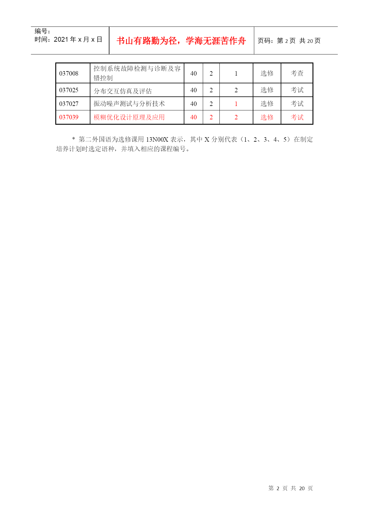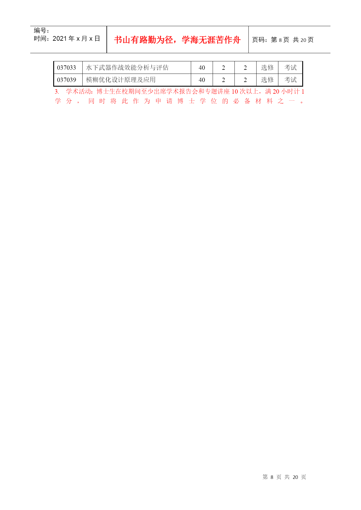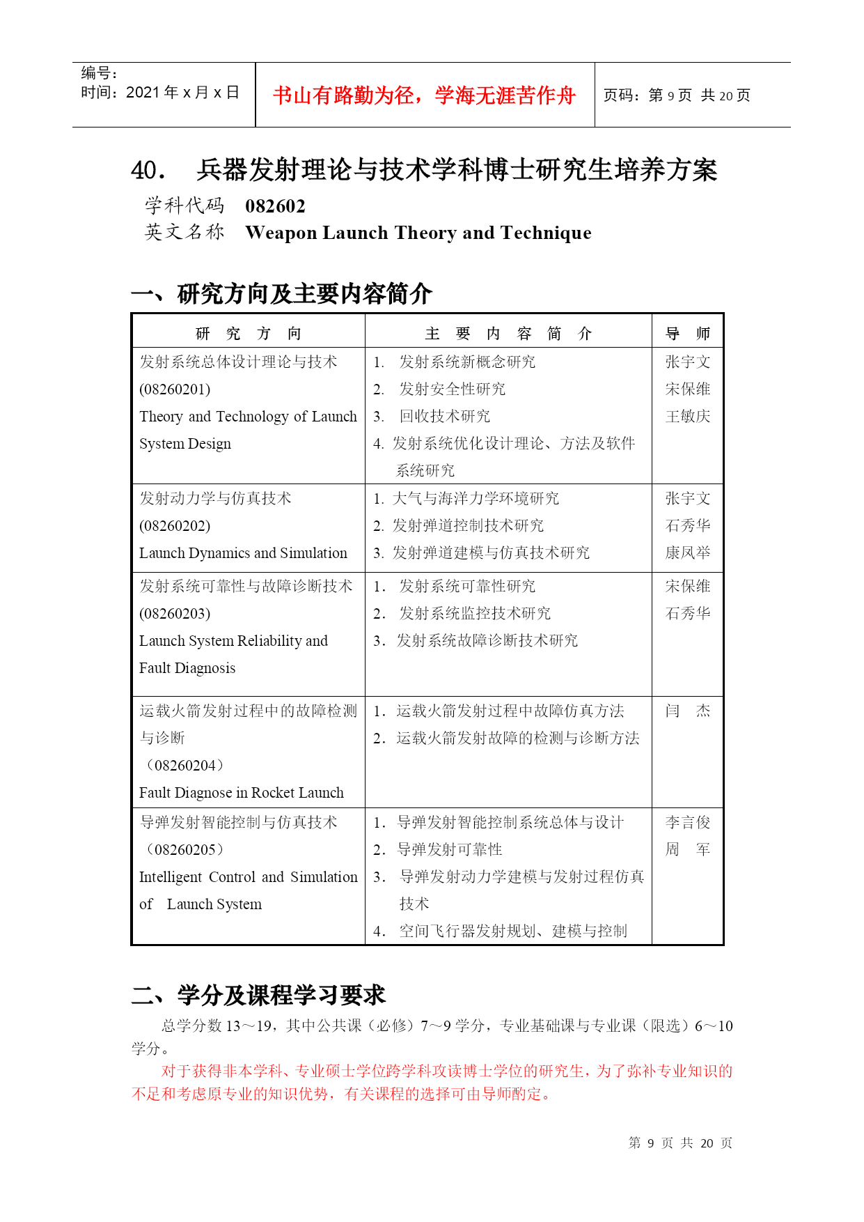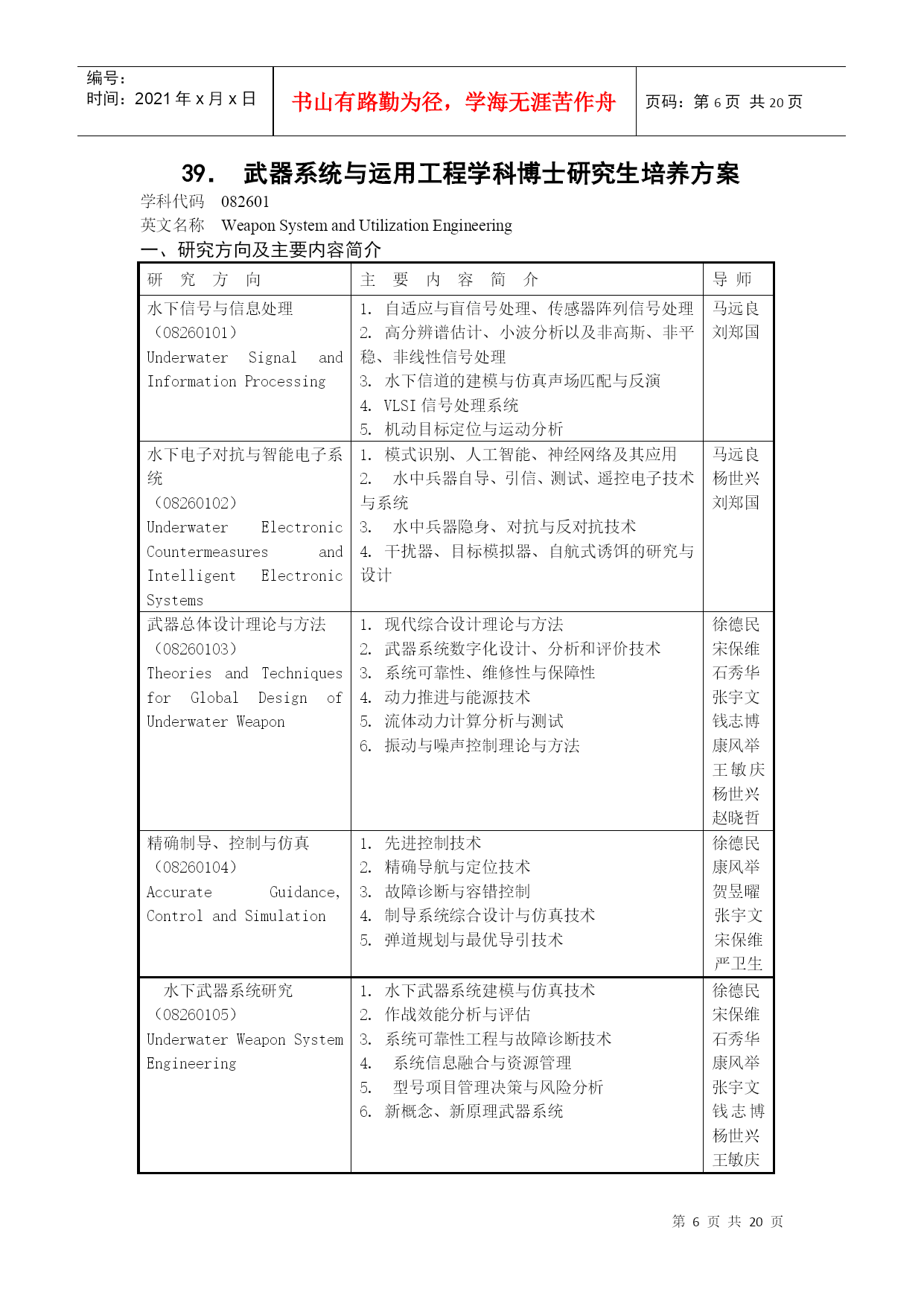 编号:时间:2021年x月x日书山有路勤为径,学海无涯苦作舟页码:第PAGE20页共NUMPAGES20页第PAGE\*MERGEFORMAT20页共NUMPAGES\*MERGEFORMAT20页9.机械电子工程学科博士研究生培养方案学科代码080202英文名称MechatronicalEngineering一、研究方向及主要内容简介研究方向主要内容简介导师智能机械与智能系统(08020201)IntelligentMechanismandIntelligentSystems1.机电系统智能控制技术及工程应用2.机器人在先进制造系统中的集成方法与技术3.机器人感官及智能化技术4.机器人协调控制技术机电控制与自动化(08020202)ElectromechanicalControlandAutomation1.运动控制系统的研究与开发2.工业过程控制系统的研究与开发3.机电控制系统实时软件编程技术4.计算机控制与仿真技术石秀华智能化信号检测与故障诊断(08020203)IntelligentSignalDetectingandFaultRectificationTechnology1.传感器与信号处理2.智能化检测技术3.智能故障诊断技术石秀华二、学分及课程学习要求总学分数13~19,其中公共课7~9学分,专业基础课与专业课6~10学分。公共课(7~9学分,其中数学必选一门)课程编号课程名称学时学分开课学期修课要求考核方式11D001实变函数论及泛函分析理论4021必选一门考试11D003近代统计方法4021考试13D008现代科学技术革命与社会发展5421必修考试13D001第一外国语(英语)12031必修考试13N00X第二外国语*10021选修考试2.专业基础课和专业课(6~10学分,在下列课程中至少修满2学分,其余可在全校700号及600号课程内选修,其中700号课程不低于4学分)。课程编号课程名称学时学分开课学期修课要求考试方式037008控制系统故障检测与诊断及容错控制4021选修考查037025分布交互仿真及评估4022选修考试037027振动噪声测试与分析技术4021选修考试037039模糊优化设计原理及应用4022选修考试*第二外国语为选修课用13N00X表示,其中X分别代表(1、2、3、4、5)在制定培养计划时选定语种,并填入相应的课程编号。26.控制理论与控制工程学科博士研究生培养方案学科代码081101英文名称ControlTheoryandControlEngineering一、研究方向及主要内容简介研究方向主要内容简介导师现代控制理论及应用(08110101)ModernControlTheoryandApplication1.鲁捧控制理论及应用2.自适应学习控制3.大系统的估计、控制与决策4.大型系统的协调控制与评估方法5.系统理论及仿真技术6.先进控制技术及应用徐德民康风举计算机控制与智能控制(08110102)ComputerControl&IntelligentControl1.专家智能控制2.模糊控制3.神经网络及其在控制中的应用4.计算机控制与仿真5.自适应过程控制理论及应用6.网络化系统建模、分析、控制与优化康风举非线性及复杂系统控制理论(08110103)NonlinearandComplexSystemControlTheory1.非线性系统分析与建模.2.非线性与多变量控制系统理论及其应用3.非线性自适应控制及其应用4.非线性动力系统控制与仿真5.分布参数系统及复杂系统的建模与控制徐德民网络环境下复杂系统控制与信息安全(08110104)NetworkedControlSystemsandInformationSecurity研究网络环境下复杂系统(网络化系统)的建模、分析、控制与优化研究计算机网络的信息安全技术信息融合与复杂系统综合自动化(08110105)Informationfusion&IntegratedAutomationofcomplicatedSystems多源信息融合理论及应用多传感器管理与优化自动目标识别C3I大系统综合自动化复杂系统综合自动化计算智能生物信息学系统建模与仿真技术(08110107)SystemModelingandSimulationTechnology建模与仿真的VVA技术连续/离散系统仿真方法分布交互仿真技术虚拟现实技术运动体高精度半物理仿真康凤举二、学分及课程学习要求总学分数13~19,其中公共课7~9学分,专业基础课与专业课6~1