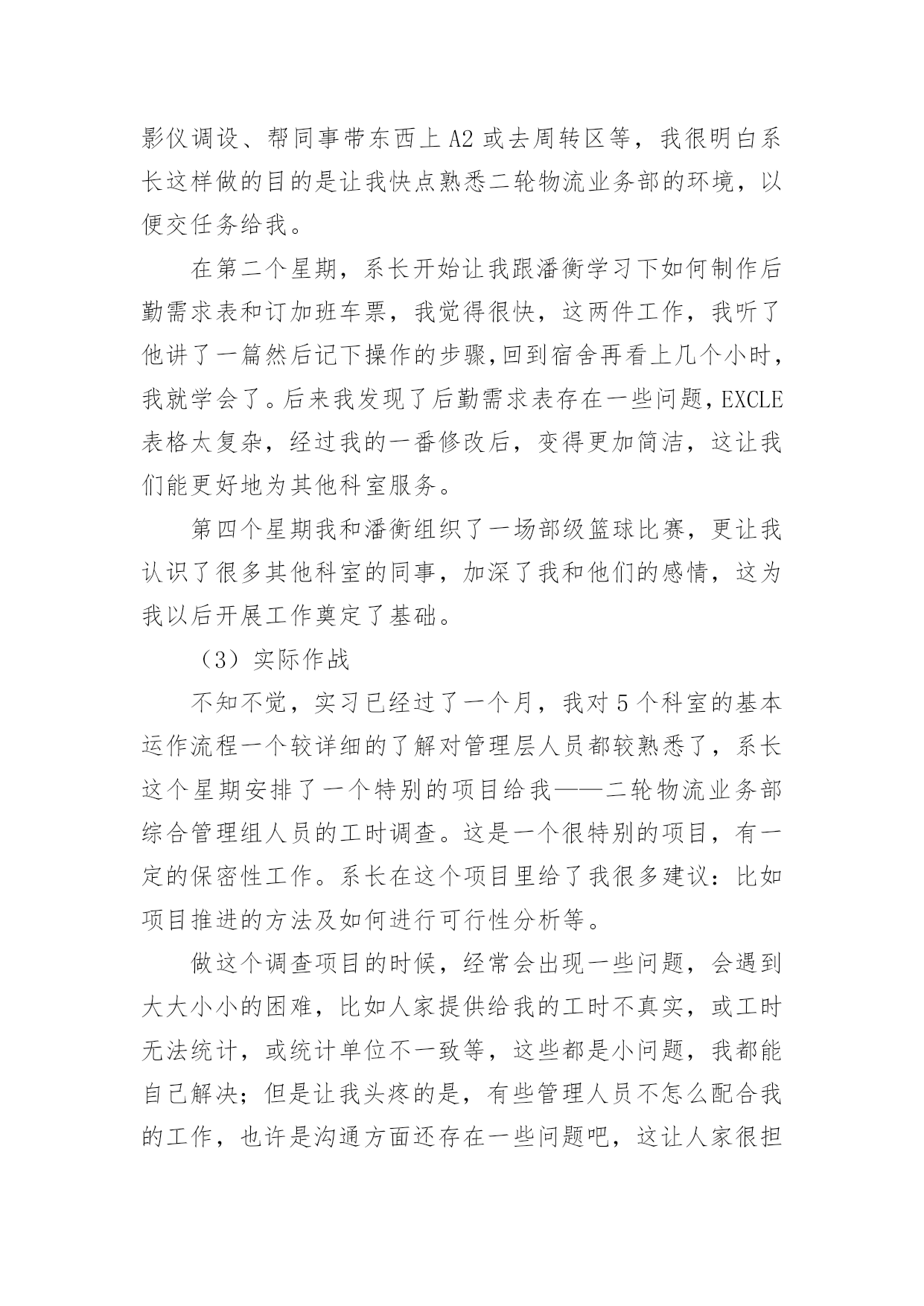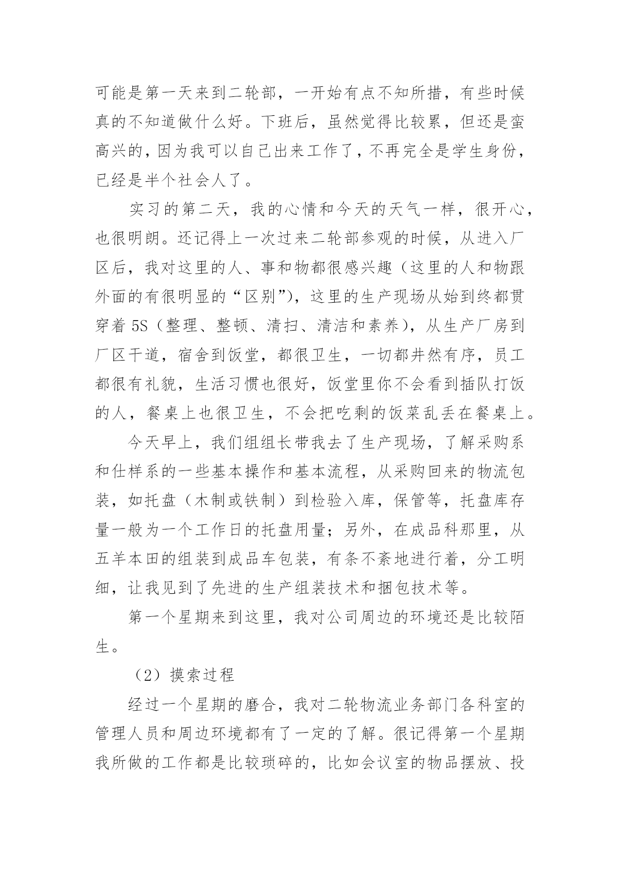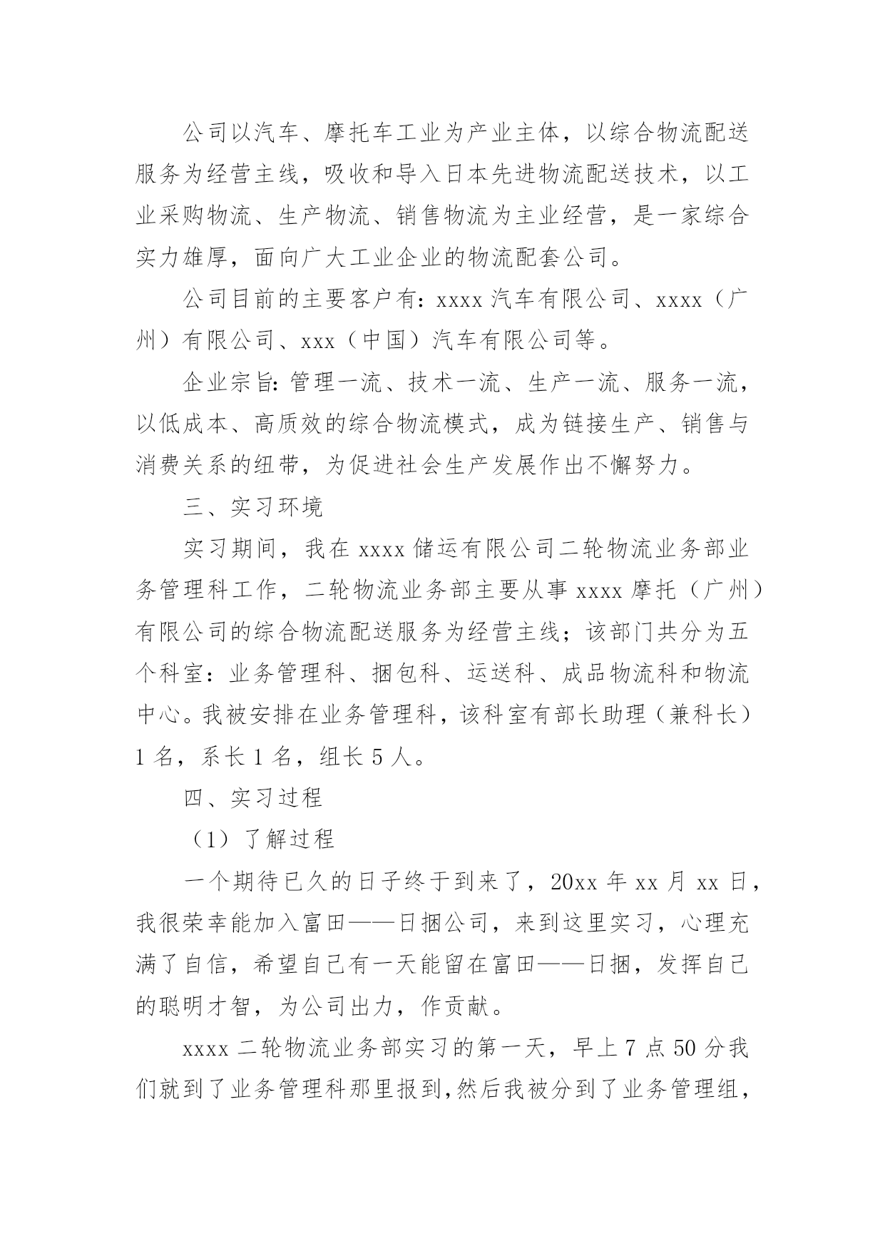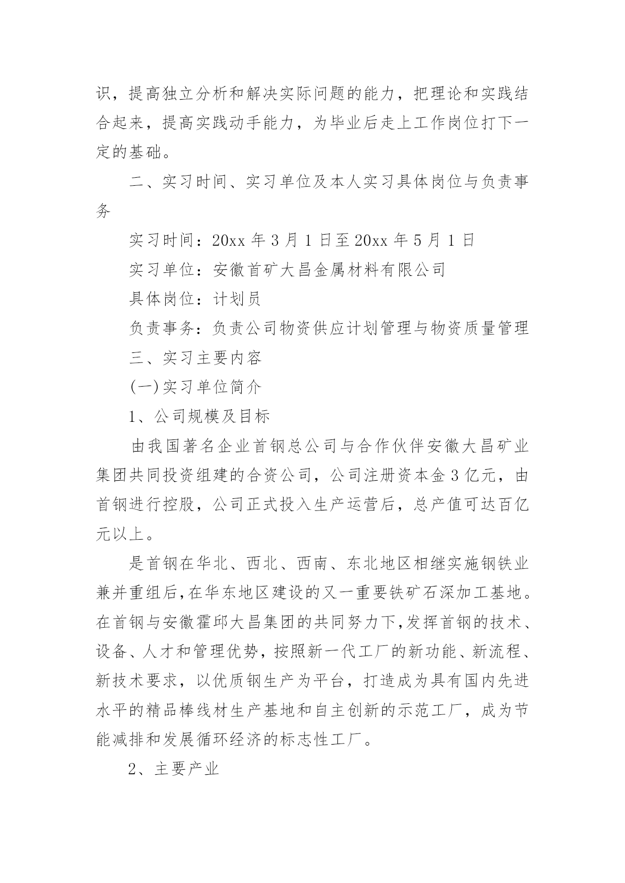 物流实习报告物流实习报告(15篇)在现实生活中,报告使用的次数愈发增长,报告具有成文事后性的特点。那么一般报告是怎么写的呢?以下是小编收集整理的物流实习报告,希望能够帮助到大家。物流实习报告1学生姓名:饶兴咏学号:年级、专业、班级:20xx级物流管理(1)班实习时间:20xx年3月1日~20xx年5月1日实习单位:安徽首矿大昌金属材料有限公司实习指导教师(学校及实习所在单位):殷治平陈同盛实习成绩:实习指导教师实习及成绩评定毕业实习报告一、实习目的毕业实习是大学教育阶段最后一个极为重要的实践性教学环节。通过实习,一方面,使自己接触实际,了解社会,增强劳动观点和事业心、责任感;第二方面,使自己在社会实践中接触与物流专业相关的实际工作,增强感性认识,培养和锻炼自己综合运用所学的基础理论、基本技能和专业知识,提高独立分析和解决实际问题的能力,把理论和实践结合起来,提高实践动手能力,为毕业后走上工作岗位打下一定的基础。二、实习时间、实习单位及本人实习具体岗位与负责事务实习时间:20xx年3月1日至20xx年5月1日实习单位:安徽首矿大昌金属材料有限公司具体岗位:计划员负责事务:负责公司物资供应计划管理与物资质量管理三、实习主要内容(一)实习单位简介1、公司规模及目标由我国著名企业首钢总公司与合作伙伴安徽大昌矿业集团共同投资组建的合资公司,公司注册资本金3亿元,由首钢进行控股,公司正式投入生产运营后,总产值可达百亿元以上。是首钢在华北、西北、西南、东北地区相继实施钢铁业兼并重组后,在华东地区建设的又一重要铁矿石深加工基地。在首钢与安徽霍邱大昌集团的共同努力下,发挥首钢的技术、设备、人才和管理优势,按照新一代工厂的新功能、新流程、新技术要求,以优质钢生产为平台,打造成为具有国内先进水平的精品棒线材生产基地和自主创新的示范工厂,成为节能减排和发展循环经济的标志性工厂。2、主要产业安徽首矿大昌金属材料有限公司位于安徽省六安市霍邱经济开发区,占地面积近8000亩,总生产规模600万t/a的项目,采用统一规划,分三期实施建设。预计三期工程完成后,最终规模为每年产615万t钢材,约占安徽省全年钢产量的19%,其中线材190万t,棒材180万t,热轧板245万t,年产值可达100亿元以上。(二)实习具体过程(1)业前培训在正式上岗前,被公司安排在一所高中参加为期12天的入职培训,培训的项目主要是军训和公司概况。当接到这一指令后,41名首批管理员工都感到很愕然,不可思议,都快毕业了还搞什么军训,很多人都惧怕军训的辛苦,想想大一时军训的残酷有些畏惧,我个人觉得这纯粹是浪费时间,12天时间浪费在军训上还不如提前上岗,早点熟悉公司环境和自己的岗位,但后来发现自己错得很离谱。接下来的时光是魔鬼般的训练,每天早上07:30准时的出现在操场上,跑完了3000米就稍息、立正、后列……休息时就在报告厅里听人事部领导介绍公司公司的历史、现状、发展目标及相关的制度,组织安全知识与劳动纪律培训,与我们谈心,解除身处异地的不适。终于培训结束了,李董事长亲自检阅我们的军训效果,想不到领导如此的关心我们。座谈会上董事长一一与我们交谈,聆听我们的军训体会,当我向董事长陈述的时候,我才发现自己在军训期间学到了很多课外知识。十几天的训练,逐渐养成了早起早睡的习惯,褪去了大学期间晚睡晚起的坏毛病,体育锻炼也强健了自己的体魄。更重要的是,来自天南地北不同省市的同学(同事)在一起交流、成长,由陌生到熟悉,增加了彼此间的感情,形成了一个团结互助、和谐友爱,有强大凝聚力的团队,我相信这支队伍会托起钢铁企业明日辉煌。这一切都为进入公司工作,各部门间的协调并进打下了坚实基础,真的很感谢公司提供了这个机会,他们的决策太明智了,同时也觉得自己很幸运。(2)业务熟悉第一天走进宽敞明亮的办公大楼,心情很激动,期待自己成为其中的一员。当走进办公室的一刹那,就遇见了我们物资部的部长,他带着个我们几个人认识了一下我们部门的业务人员,他们很热情的介绍了自己的职务和姓名,使我感到非常温馨。当天休息,第二天部长召开部门会议,会议主要是向我们新人介绍物资部的业务流程,及各自的工作岗位、工作内容。我的职位是计划员,主要职责:1、负责审查接收指挥部工艺技术组上报的设备采购计划和技术规格书、图纸等,建立工程项目设备统计台帐、移动报告和动态报表。2、负责审查接收指挥部工程组审核的材料采购计划,按物资分类进行汇总,安排采购组采购,按期到货。按照仓储组的稽核结果,建立工程材料统计台帐和报表,满足资金审核和结算要求。3、负责设备和材料的质量管理工作,组织采购组、仓储组、监理落实质量控制措施,协调解决质量问题。4、负责协调办理材料代用、退库、回收等工作。5、负责根据计划需求和工程进度,安排材料、设备直送工作,组织质量检验。6、负责参