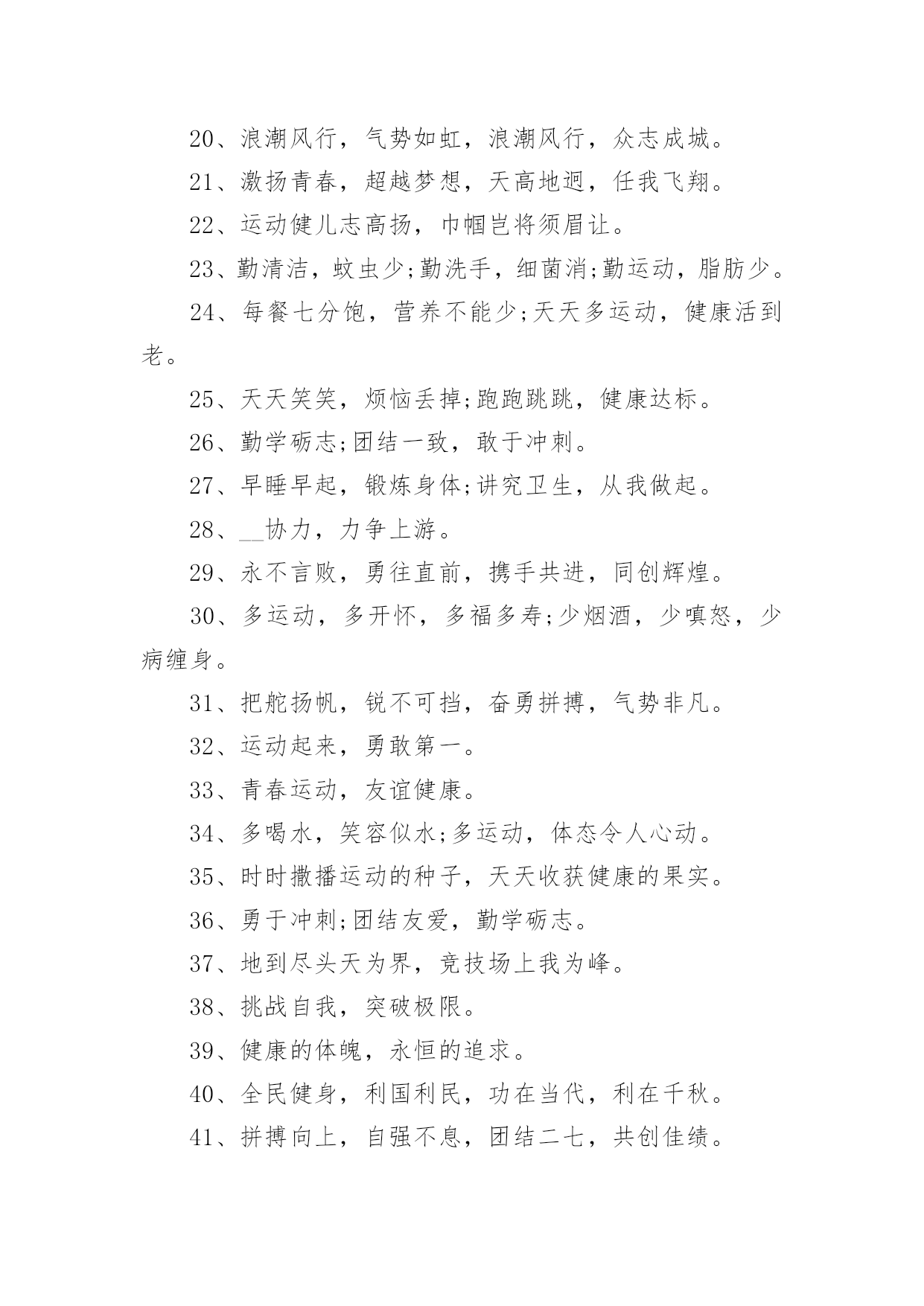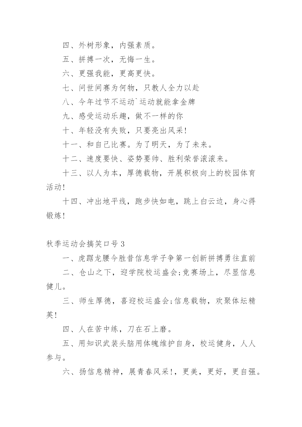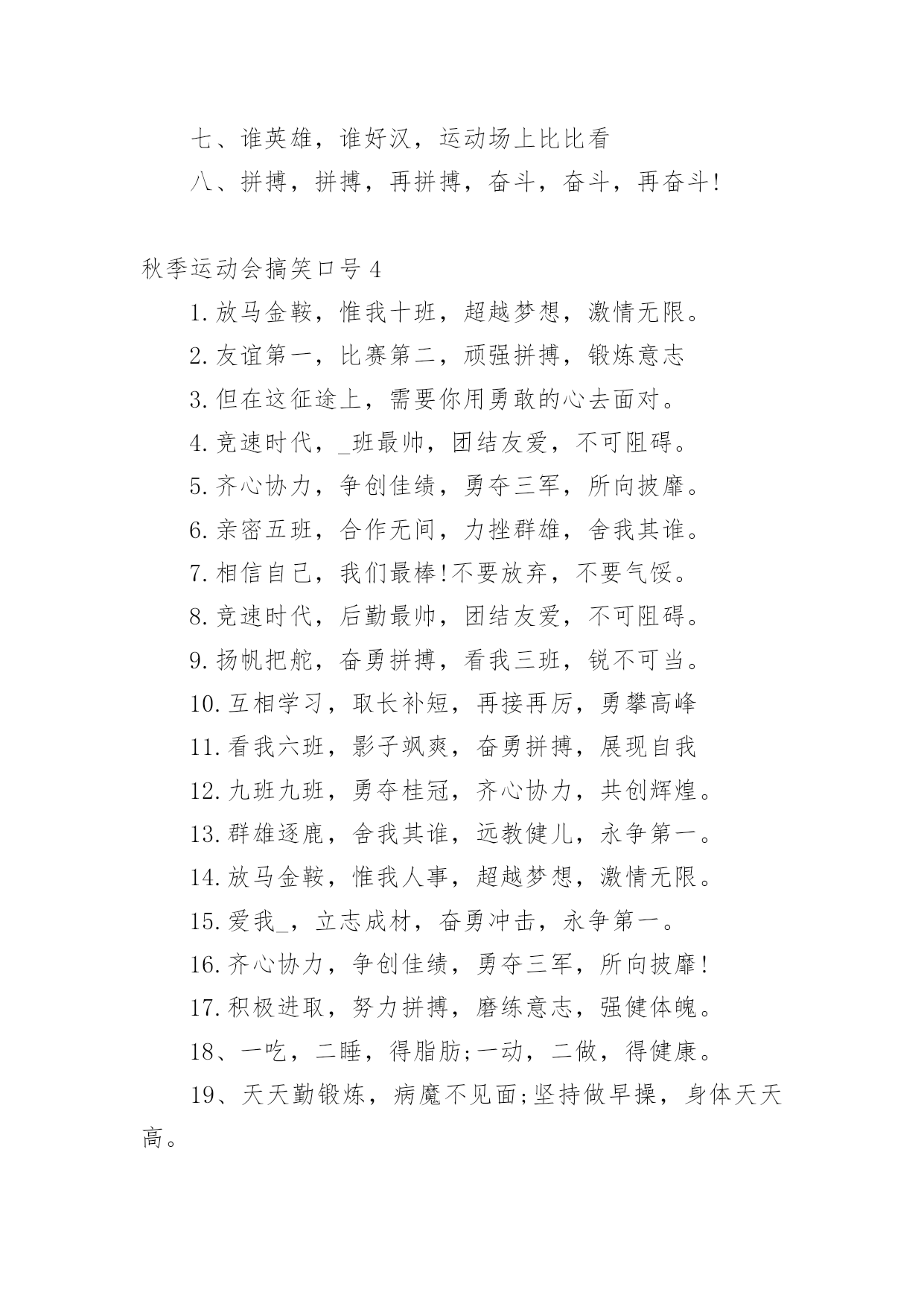 秋季运动会搞笑口号在学习、工作乃至生活中,大家最不陌生的就是口号了吧,口号的作用是便于“造势”,形成一种氛围。那么什么样的口号才更具感染力呢?下面是小编精心整理的.秋季运动会搞笑口号,欢迎阅读,希望大家能够喜欢。秋季运动会搞笑口号1七班脸皮厚,子弹穿不透。心狠手又辣,别人都害怕!东风吹,战鼓擂,初三七,我怕谁,我们班有大地雷。人类需要体育,世界向往和平!赛出风格、赛出水平年轻健儿显身手,时代骄子竞风流!比拼激扬梦想,搏击磨砺锋芒!青春拥抱梦想,拼搏成就辉煌!丰富学校体育内涵,共建时代校园文化!体育如花绽放快乐校园,青春似火燃烧亮丽人生!育使城市充满活力,城市因体育勃发生机!全民健身,利国利民,功在当代,利在千秋!秋季运动会搞笑口号2一、爱我信息,赛出水平。二、把握机遇,更创辉煌。三、比出风采,超越自我。四、外树形象,内强素质。五、拼搏一次,无悔一生。六、更强我能,更高更快。七、问世间赛为何物,只教人全力以赴八、今年过节不运动`运动就能拿金牌九、感受运动乐趣,做不一样的你十、年轻没有失败,只要亮出风采!十一、和自己比赛。为了明天,为了未来。十二、速度要快、姿势要帅、胜利荣誉滚滚来。十三、以人为本,厚德载物,开展积极向上的校园体育活动!十四、冲出地平线,跑步快如电,跳上白云边,身心得锻炼!秋季运动会搞笑口号3一、虎踞龙腰今胜昔信息学子争第一创新拼搏勇往直前二、仓山之下,迎学院校运盛会;竞赛场上,尽显信息健儿。三、师生厚德,喜迎校运盛会;信息载物,欢聚体坛精英!四、人在苦中练,刀在石上磨。五、用知识武装头脑用体魄维护自身,校运健身,人人参与。六、扬信息精神,展青春风采!,更美,更好,更自强。七、谁英雄,谁好汉,运动场上比比看八、拼搏,拼搏,再拼搏,奋斗,奋斗,再奋斗!秋季运动会搞笑口号41.放马金鞍,惟我十班,超越梦想,激情无限。2.友谊第一,比赛第二,顽强拼搏,锻炼意志3.但在这征途上,需要你用勇敢的心去面对。4.竞速时代,_班最帅,团结友爱,不可阻碍。5.齐心协力,争创佳绩,勇夺三军,所向披靡。6.亲密五班,合作无间,力挫群雄,舍我其谁。7.相信自己,我们最棒!不要放弃,不要气馁。8.竞速时代,后勤最帅,团结友爱,不可阻碍。9.扬帆把舵,奋勇拼搏,看我三班,锐不可当。10.互相学习,取长补短,再接再厉,勇攀高峰11.看我六班,影子飒爽,奋勇拼搏,展现自我12.九班九班,勇夺桂冠,齐心协力,共创辉煌。13.群雄逐鹿,舍我其谁,远教健儿,永争第一。14.放马金鞍,惟我人事,超越梦想,激情无限。15.爱我_,立志成材,奋勇冲击,永争第一。16.齐心协力,争创佳绩,勇夺三军,所向披靡!17.积极进取,努力拼搏,磨练意志,强健体魄。18、一吃,二睡,得脂肪;一动,二做,得健康。19、天天勤锻炼,病魔不见面;坚持做早操,身体天天高。20、浪潮风行,气势如虹,浪潮风行,众志成城。21、激扬青春,超越梦想,天高地迥,任我飞翔。22、运动健儿志高扬,巾帼岂将须眉让。23、勤清洁,蚊虫少;勤洗手,细菌消;勤运动,脂肪少。24、每餐七分饱,营养不能少;天天多运动,健康活到老。25、天天笑笑,烦恼丢掉;跑跑跳跳,健康达标。26、勤学砺志;团结一致,敢于冲刺。27、早睡早起,锻炼身体;讲究卫生,从我做起。28、__协力,力争上游。29、永不言败,勇往直前,携手共进,同创辉煌。30、多运动,多开怀,多福多寿;少烟酒,少嗔怒,少病缠身。31、把舵扬帆,锐不可挡,奋勇拼搏,气势非凡。32、运动起来,勇敢第一。33、青春运动,友谊健康。34、多喝水,笑容似水;多运动,体态令人心动。35、时时撒播运动的种子,天天收获健康的果实。36、勇于冲刺;团结友爱,勤学砺志。37、地到尽头天为界,竞技场上我为峰。38、挑战自我,突破极限。39、健康的体魄,永恒的追求。40、全民健身,利国利民,功在当代,利在千秋。41、拼搏向上,自强不息,团结二七,共创佳绩。42、顽强拼搏,所向无敌。43、天天找借口,健康不再有;锻炼好身体,就从今天起。44、意气奋发,斗志昂扬。45、凌云腾飞,尽展光辉,万千学子,舍我其谁。