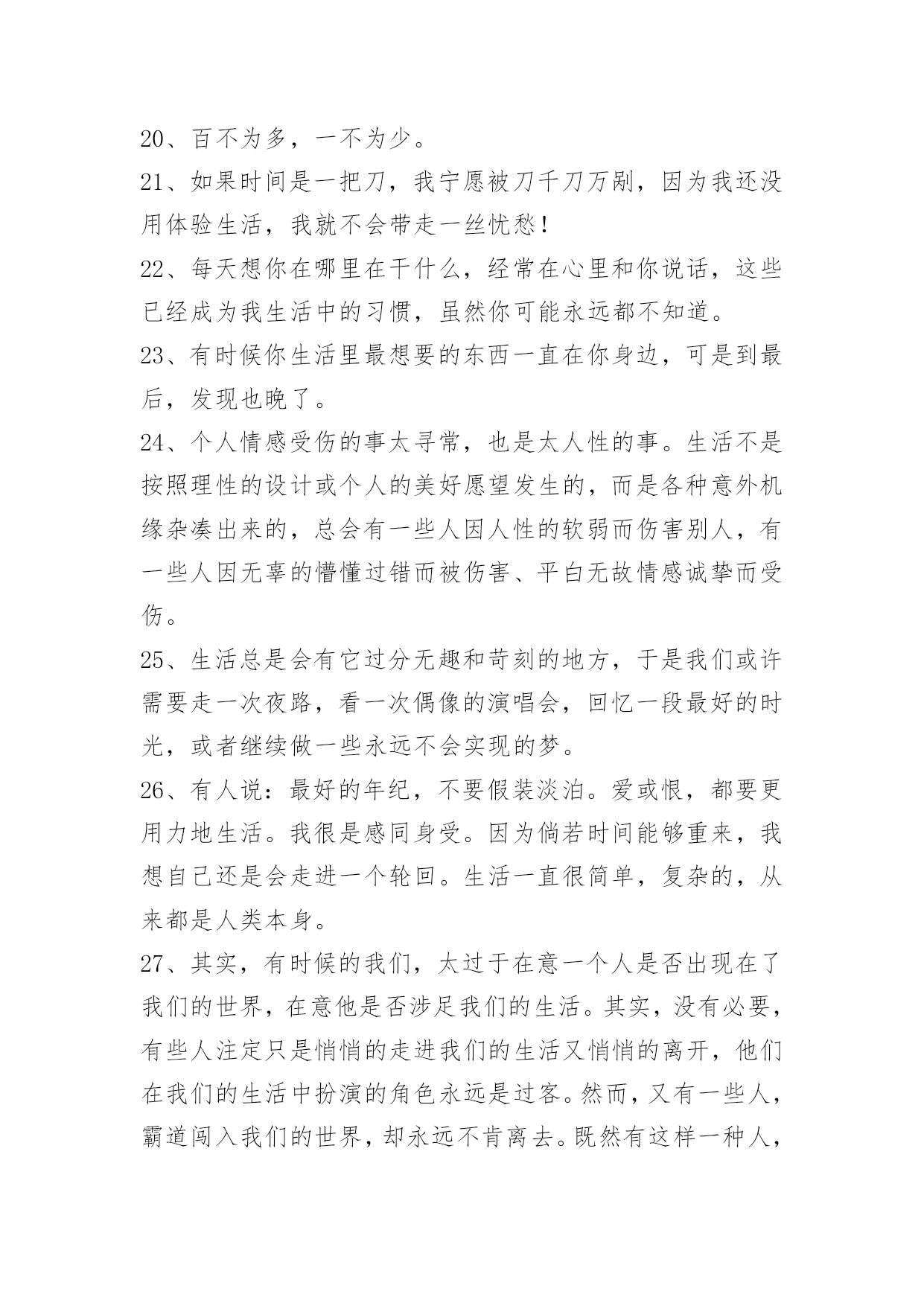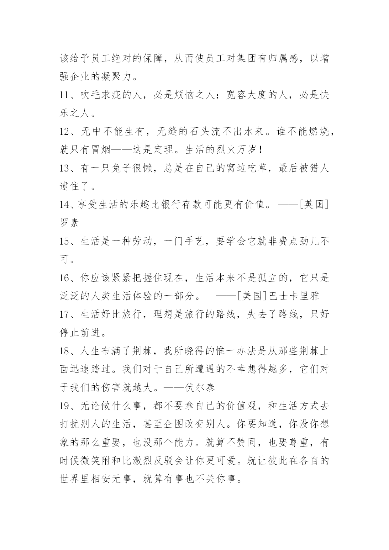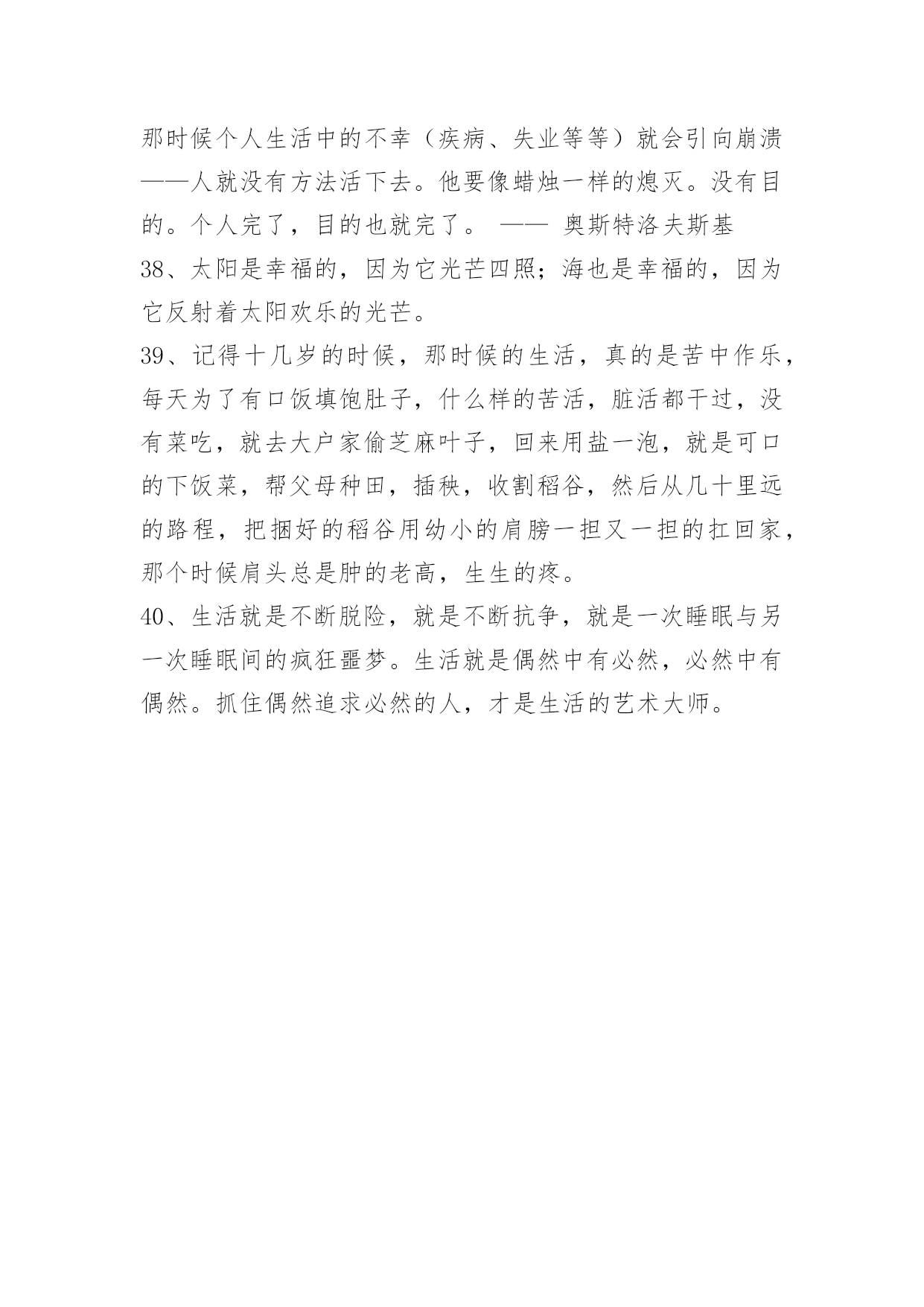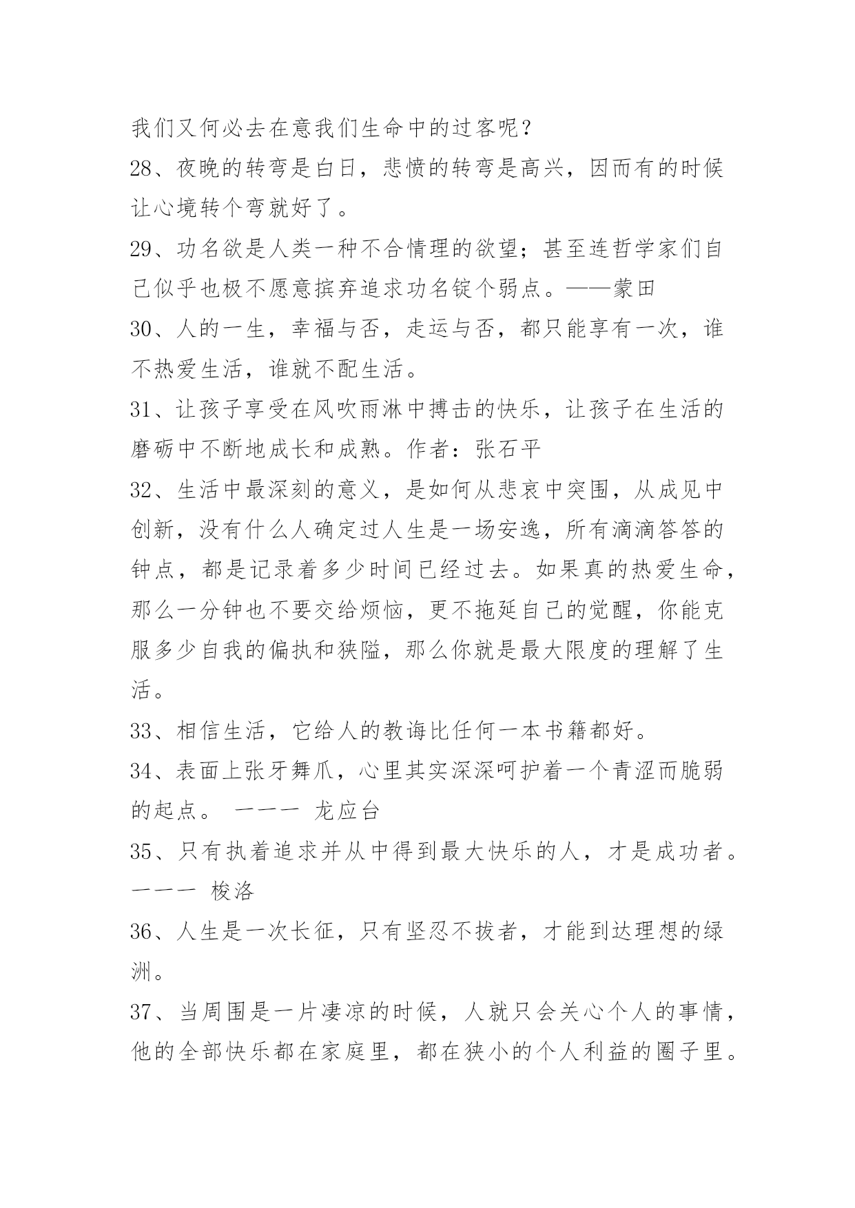 生活感悟格言精选生活感悟格言锦集40句生活,憔悴了你,憔悴了我。下面是小编收集整理的生活感悟格言40句,希望能够帮助到大家。1、正确的人生目标,对每个人何等重要。2、生活的价值在于创造。3、孤独的人分是会存心的记住他生命外呈现过的每一小我,于是我分是意犹未尽地想起你正在每个星光陨落的晚上一遍一遍数我的孤独。4、人生的价值不在于你度过了多少时间,而是你生活的深度。5、快乐无时不在,无处不在。只要你细心体验与品味,快乐就在你我的身边。让我们一道去享受生活,享受快乐。6、珍惜身边的幸福,不要让幸福溜走。7、一个人的理想越崇高,生活就越纯洁。——伏契克8、我们的生活所需的思想,也许在三千年前就思维殆尽。我们只需要在老柴上加新火就行了。——芥川龙之介9、成就的大小高低,是不在我们掌握之内的,一半靠人力,一半靠天赋,但只要坚强,就不怕失败,不怕挫折,不怕打击——不管是人事上的,生活上的,技术上的,学术上的——打击。——傅雷10、要了解下属的希望。除了生活,应给予员工好的前途;并且,一切以员工的利益为重,特别是年老的时候,公司应该给予员工绝对的保障,从而使员工对集团有归属感,以增强企业的凝聚力。11、吹毛求疵的人,必是烦恼之人;宽容大度的人,必是快乐之人。12、无中不能生有,无缝的石头流不出水来。谁不能燃烧,就只有冒烟——这是定理。生活的烈火万岁!13、有一只兔子很懒,总是在自己的窝边吃草,最后被猎人逮住了。14、享受生活的乐趣比银行存款可能更有价值。——[英国]罗素15、生活是一种劳动,一门手艺,要学会它就非费点劲儿不可。16、你应该紧紧把握住现在,生活本来不是孤立的,它只是泛泛的人类生活体验的一部分。——[美国]巴士卡里雅17、生活好比旅行,理想是旅行的路线,失去了路线,只好停止前进。18、人生布满了荆棘,我所晓得的惟一办法是从那些荆棘上面迅速踏过。我们对于自己所遭遇的不幸想得越多,它们对于我们的伤害就越大。——伏尔泰19、无论做什么事,都不要拿自己的价值观,和生活方式去打扰别人的生活,甚至企图改变别人。你要知道,你没你想象的那么重要,也没那个能力。就算不赞同,也要尊重,有时候微笑附和比激烈反驳会让你更可爱。就让彼此在各自的世界里相安无事,就算有事也不关你事。20、百不为多,一不为少。21、如果时间是一把刀,我宁愿被刀千刀万剐,因为我还没用体验生活,我就不会带走一丝忧愁!22、每天想你在哪里在干什么,经常在心里和你说话,这些已经成为我生活中的习惯,虽然你可能永远都不知道。23、有时候你生活里最想要的东西一直在你身边,可是到最后,发现也晚了。24、个人情感受伤的事太寻常,也是太人性的事。生活不是按照理性的设计或个人的美好愿望发生的,而是各种意外机缘杂凑出来的,总会有一些人因人性的软弱而伤害别人,有一些人因无辜的懵懂过错而被伤害、平白无故情感诚挚而受伤。25、生活总是会有它过分无趣和苛刻的地方,于是我们或许需要走一次夜路,看一次偶像的演唱会,回忆一段最好的时光,或者继续做一些永远不会实现的梦。26、有人说:最好的年纪,不要假装淡泊。爱或恨,都要更用力地生活。我很是感同身受。因为倘若时间能够重来,我想自己还是会走进一个轮回。生活一直很简单,复杂的,从来都是人类本身。27、其实,有时候的我们,太过于在意一个人是否出现在了我们的世界,在意他是否涉足我们的生活。其实,没有必要,有些人注定只是悄悄的走进我们的生活又悄悄的离开,他们在我们的生活中扮演的角色永远是过客。然而,又有一些人,霸道闯入我们的世界,却永远不肯离去。既然有这样一种人,我们又何必去在意我们生命中的过客呢?28、夜晚的转弯是白日,悲愤的转弯是高兴,因而有的时候让心境转个弯就好了。29、功名欲是人类一种不合情理的欲望;甚至连哲学家们自己似乎也极不愿意摈弃追求功名锭个弱点。——蒙田30、人的一生,幸福与否,走运与否,都只能享有一次,谁不热爱生活,谁就不配生活。31、让孩子享受在风吹雨淋中搏击的快乐,让孩子在生活的磨砺中不断地成长和成熟。作者:张石平32、生活中最深刻的意义,是如何从悲哀中突围,从成见中创新,没有什么人确定过人生是一场安逸,所有滴滴答答的钟点,都是记录着多少时间已经过去。如果真的热爱生命,那么一分钟也不要交给烦恼,更不拖延自己的觉醒,你能克服多少自我的偏执和狭隘,那么你就是最大限度的理解了生活。33、相信生活,它给人的教诲比任何一本书籍都好。34、表面上张牙舞爪,心里其实深深呵护着一个青涩而脆弱的起点。一一一龙应台35、只有执着追求并从中得到最大快乐的人,才是成功者。一一一梭洛36、人生是一次长征,只有坚忍不拔者,才能到达理想的绿洲。37、当周围是一片凄凉的时候,人就只会关心个人的事情,他的全部快乐都在家庭里,都在狭小的个人利益的圈子里。那时候个人生活中的不幸(疾病、失业