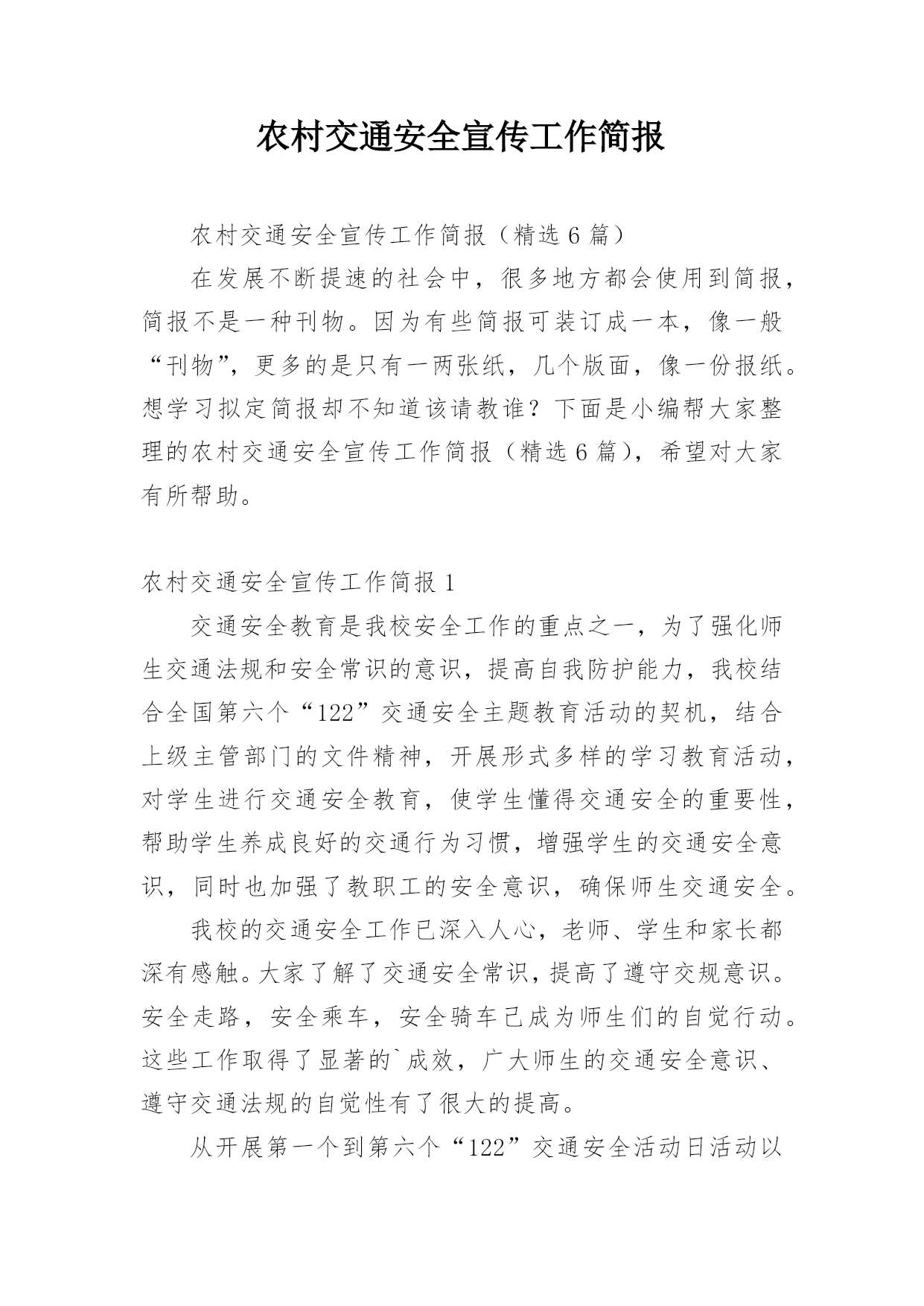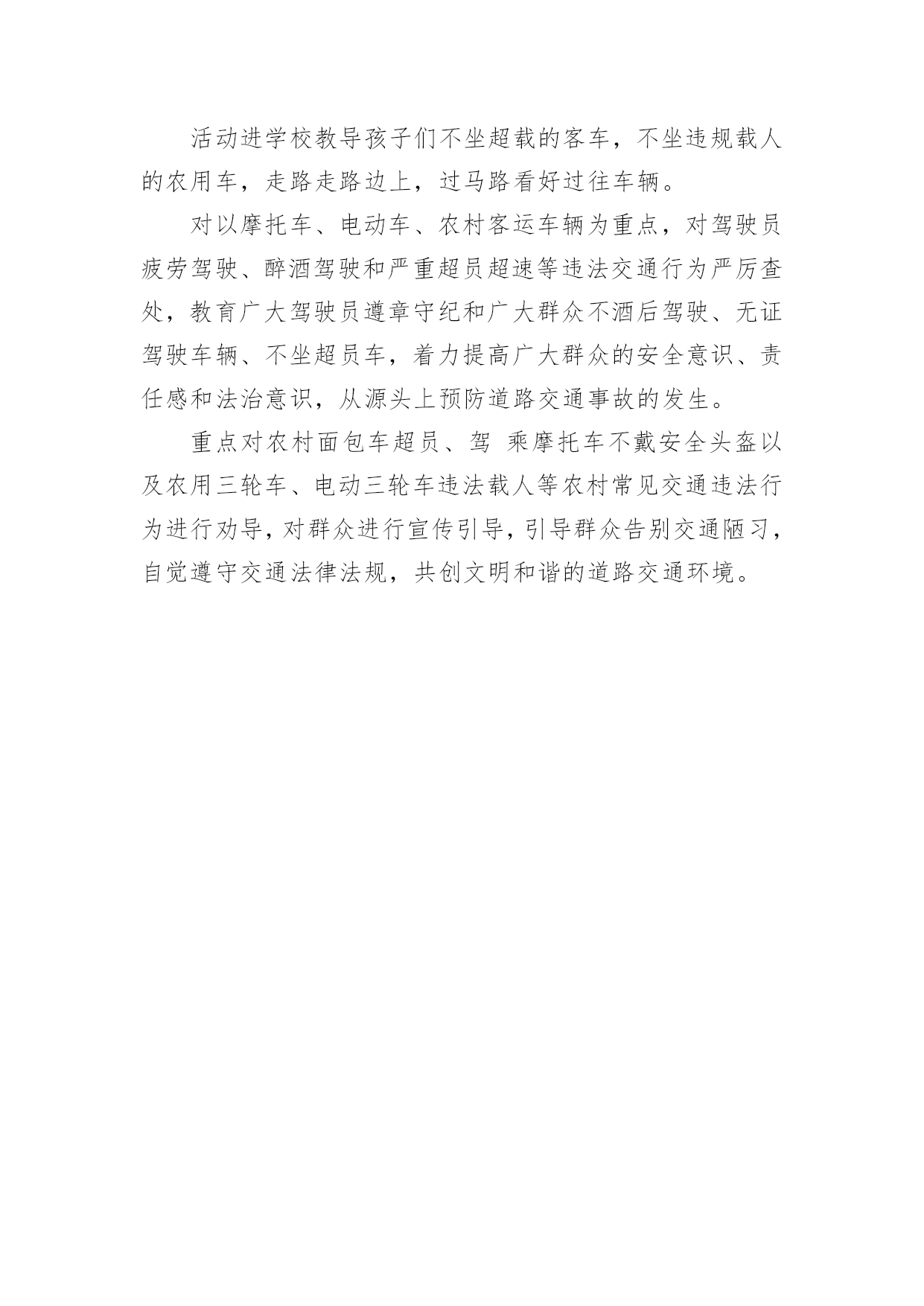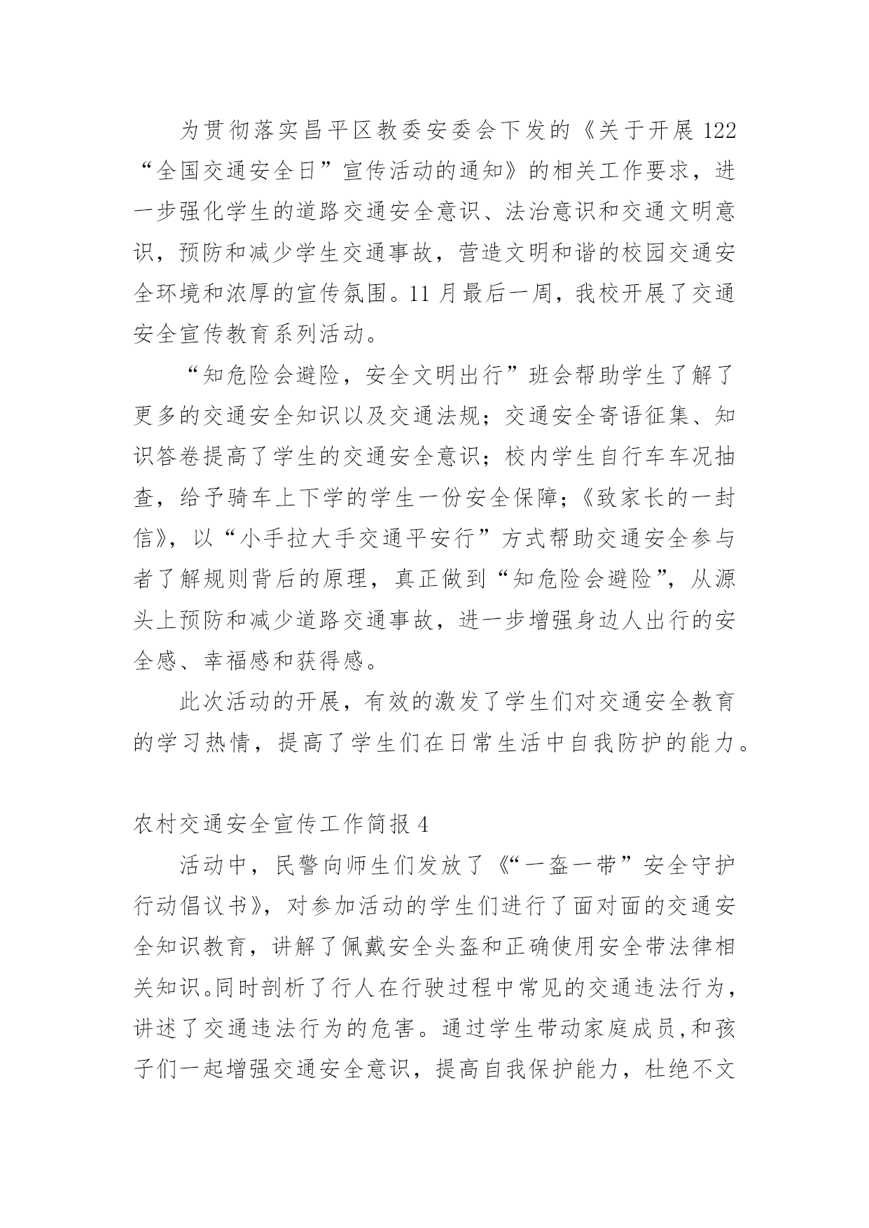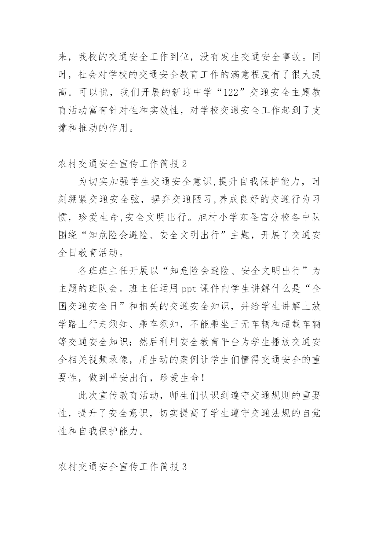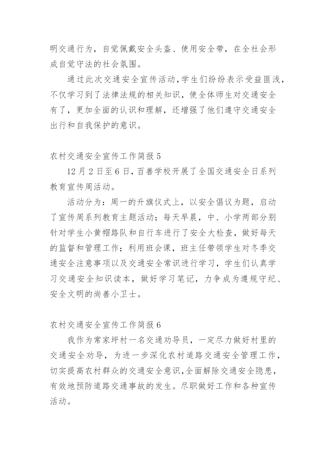 农村交通安全宣传工作简报农村交通安全宣传工作简报(精选6篇)在发展不断提速的社会中,很多地方都会使用到简报,简报不是一种刊物。因为有些简报可装订成一本,像一般“刊物”,更多的是只有一两张纸,几个版面,像一份报纸。想学习拟定简报却不知道该请教谁?下面是小编帮大家整理的农村交通安全宣传工作简报(精选6篇),希望对大家有所帮助。农村交通安全宣传工作简报1交通安全教育是我校安全工作的重点之一,为了强化师生交通法规和安全常识的意识,提高自我防护能力,我校结合全国第六个“122”交通安全主题教育活动的契机,结合上级主管部门的文件精神,开展形式多样的学习教育活动,对学生进行交通安全教育,使学生懂得交通安全的重要性,帮助学生养成良好的交通行为习惯,增强学生的交通安全意识,同时也加强了教职工的安全意识,确保师生交通安全。我校的交通安全工作已深入人心,老师、学生和家长都深有感触。大家了解了交通安全常识,提高了遵守交规意识。安全走路,安全乘车,安全骑车己成为师生们的自觉行动。这些工作取得了显著的`成效,广大师生的交通安全意识、遵守交通法规的自觉性有了很大的提高。从开展第一个到第六个“122”交通安全活动日活动以来,我校的交通安全工作到位,没有发生交通安全事故。同时,社会对学校的交通安全教育工作的满意程度有了很大提高。可以说,我们开展的新迎中学“122”交通安全主题教育活动富有针对性和实效性,对学校交通安全工作起到了支撑和推动的作用。农村交通安全宣传工作简报2为切实加强学生交通安全意识,提升自我保护能力,时刻绷紧交通安全弦,摒弃交通陋习,养成良好的交通行为习惯,珍爱生命,安全文明出行。旭村小学东圣宫分校各中队围绕“知危险会避险、安全文明出行”主题,开展了交通安全日教育活动。各班班主任开展以“知危险会避险、安全文明出行”为主题的班队会。班主任运用ppt课件向学生讲解什么是“全国交通安全日”和相关的交通安全知识,并给学生讲解上放学路上行走须知、乘车须知,不能乘坐三无车辆和超载车辆等交通安全知识;然后利用安全教育平台为学生播放交通安全相关视频录像,用生动的案例让学生们懂得交通安全的重要性,做到平安出行,珍爱生命!此次宣传教育活动,师生们认识到遵守交通规则的重要性,提升了安全意识,切实提高了学生遵守交通法规的自觉性和自我保护能力。农村交通安全宣传工作简报3为贯彻落实昌平区教委安委会下发的《关于开展122“全国交通安全日”宣传活动的通知》的相关工作要求,进一步强化学生的道路交通安全意识、法治意识和交通文明意识,预防和减少学生交通事故,营造文明和谐的校园交通安全环境和浓厚的宣传氛围。11月最后一周,我校开展了交通安全宣传教育系列活动。“知危险会避险,安全文明出行”班会帮助学生了解了更多的交通安全知识以及交通法规;交通安全寄语征集、知识答卷提高了学生的交通安全意识;校内学生自行车车况抽查,给予骑车上下学的学生一份安全保障;《致家长的一封信》,以“小手拉大手交通平安行”方式帮助交通安全参与者了解规则背后的原理,真正做到“知危险会避险”,从源头上预防和减少道路交通事故,进一步增强身边人出行的安全感、幸福感和获得感。此次活动的开展,有效的激发了学生们对交通安全教育的学习热情,提高了学生们在日常生活中自我防护的能力。农村交通安全宣传工作简报4活动中,民警向师生们发放了《“一盔一带”安全守护行动倡议书》,对参加活动的学生们进行了面对面的交通安全知识教育,讲解了佩戴安全头盔和正确使用安全带法律相关知识。同时剖析了行人在行驶过程中常见的交通违法行为,讲述了交通违法行为的危害。通过学生带动家庭成员,和孩子们一起增强交通安全意识,提高自我保护能力,杜绝不文明交通行为,自觉佩戴安全头盔、使用安全带,在全社会形成自觉守法的社会氛围。通过此次交通安全宣传活动,学生们纷纷表示受益匪浅,不仅学习到了法律法规的相关知识,使全体师生对交通安全有了,更加全面的认识和理解,还增强了他们遵守交通安全出行和自我保护的意识。农村交通安全宣传工作简报512月2日至6日,百善学校开展了全国交通安全日系列教育宣传周活动。活动分为:周一的升旗仪式上,以安全倡议为题,启动了宣传周系列教育主题活动;每天早晨,中、小学两部分别针对学生小黄帽路队和自行车进行了安全大检查,做好每天的监督和管理工作;利用班会课,班主任带领学生对冬季交通安全注意事项以及交通安全常识进行学习,学生们认真学习交通安全知识读本,做好学习笔记,力争成为遵规守纪、安全文明的尚善小卫士。农村交通安全宣传工作简报6我作为常家坪村一名交通劝导员,一定尽力做好村里的交通安全劝导,为进一步深化农村道路交通安全管理工作,切实提高农村群众的交通安全意识,全面解除交通安全隐患,有效地预防道路交通事故的发生。尽职做好工作和各种宣传活动。活动进学校教导孩子们不坐超载的