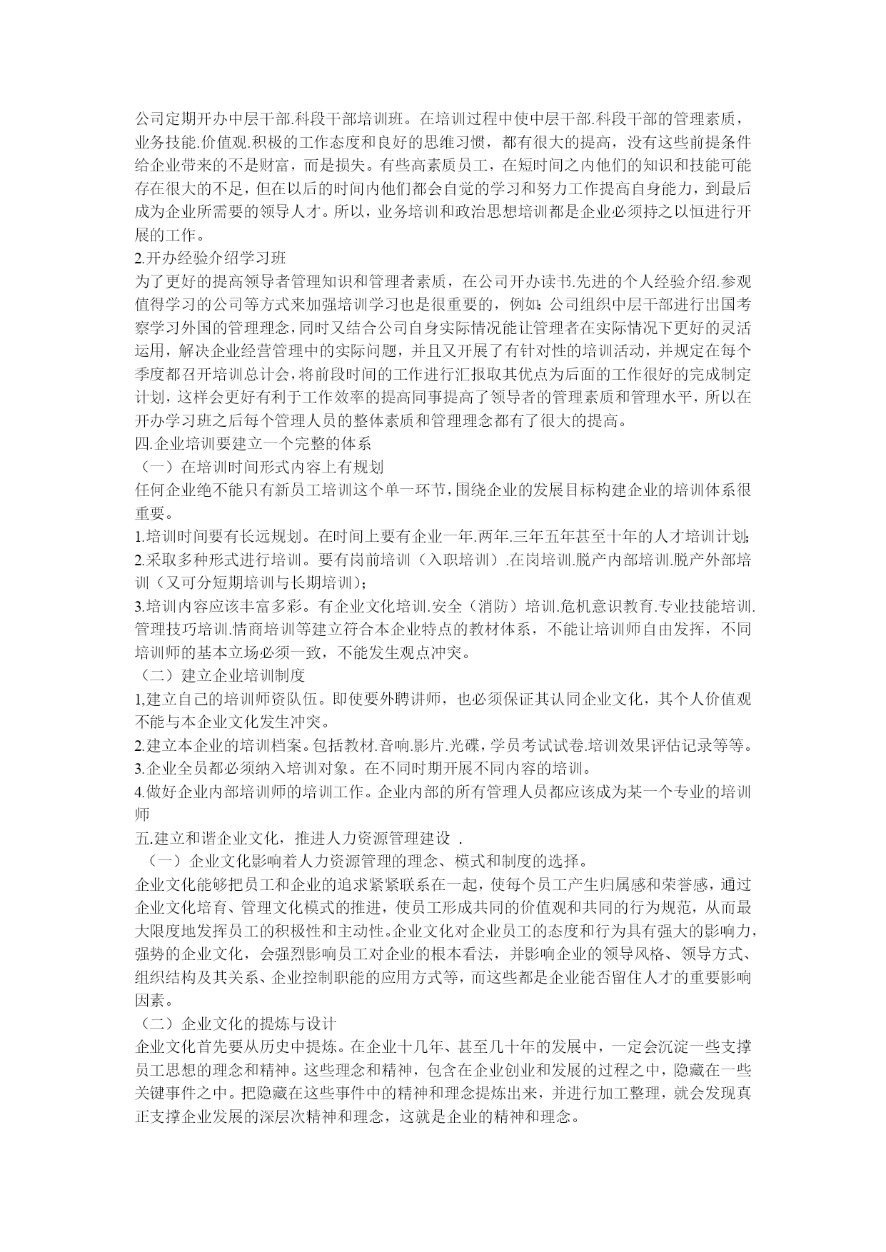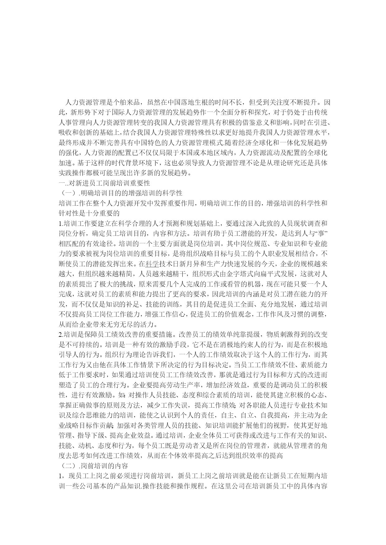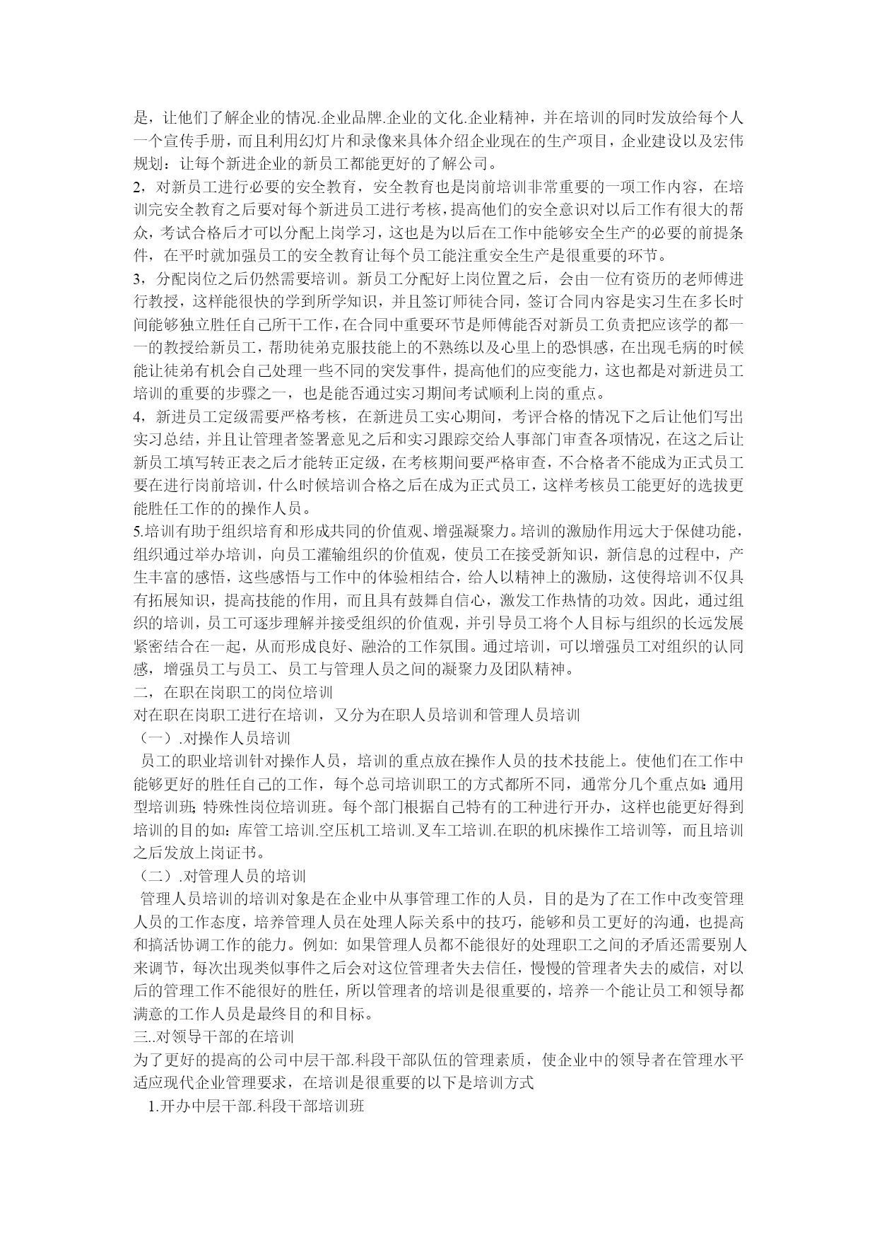 浅谈企业人力资源培训与管理目录.对新进员工岗前培训重要性(一).明确培训目的的增强培训的科学性(二).岗前培训的内容二,在职在岗职工的岗位培训(一).对操作人员培训(二).对管理人员的培训三..对领导干部的在培训1.开办中层干部.科段干部培训班开办经验介绍学习班四.企业培训要建立一个完整的体系(一)在培训时间形式内容上有规划(二)建立企业培训制度五.建立和谐企业文化,推进人力资源管理建设.(一)企业文化影响着人力资源管理的理念、模式和制度的选择。(二)企业文化的提炼与设计六.现代人力资源管理中的问题1人力资源管理制度的制定和实施具有强制性漠视人力资本的投入忽视各级管理者素质的提高绩效考核体系不科学人力资源体系不完善七.人力资源管理的信息化八.企业培训需要不断的完善(一)培训内容要有针对性(二)提高培训者的培训素质九人力管理体系的创新。1.宏观创新2.微观创新结语人力资源管理是个舶来品,虽然在中国落地生根的时间不长,但受到关注度不断提升。因此,新形势下对于国际人力资源管理的发展趋势作一个全面分析和探究,对于仍处于由传统人事管理向人力资源管理转变的我国人力资源管理具有积极的借鉴意义和影响,同时在引进、吸收和创新的基础上,结合我国人力资源管理特殊性以求更好地提升我国人力资源管理水平,最终形成并不断完善具有中国特色的人力资源管理模式.随着经济全球化和一体化发展趋势的强化,人力资源的配置已不仅仅局限于本国或本地区域内,人力资源流动及配置的全球化加速。基于这样的时代背景环境下,这也必须导致人力资源管理不论是从理论研究还是具体实践操作都极可能呈现出许多新的发展趋势。一..对新进员工岗前培训重要性(一).明确培训目的的增强培训的科学性培训工作在整个人力资源开发中发挥重要作用,明确培训工作的目的,增强培训的科学性和针对性是十分重要的培训工作要建立在科学合理的人才预测和规划基础上,要通过深入此致的人员现状调查和岗位分析,确定员工培训目的,内容和方法。培训有助于员工潜能的开发,是达到人与“事”相匹配的有效途径。培训的一个主要方面就是岗位培训,其中岗位规范、专业知识和专业能力的要求被视为岗位培训的重要目标,是将组织战略目标与员工的个人职业发展相结合,不断使员工的潜能发挥出来。在HYPERLINK"http://www.studa.net/gongxue/"科学技术日新月异和生产力快速发展的今天,企业的规模越来越大,但组织越来越精简,人员越来越精干,组织形式由金字塔式向扁平式发展,这就对人的素质提出了极大的挑战,原来需要几个人完成的工作或看管的机器,现在可能只要一个人完成,这就对员工的素质和能力提出了更高的要求,因此培训的内涵是对员工潜在能力的开发,而不仅仅是知识的补足、技能的训练,其目的是促进员工全面、充分地发展,通过培训不仅提高员工岗位工作能力,增强工作信心,促进员工的价值观念,工作作风及习惯的调整,从而给企业带来无穷无尽的活力。培训是保障员工绩效改善的重要措施。改善员工的绩效单纯靠提级,物质刺激得到的改变是不可持续的。培训是一种有效的激励手段,它不是在消极地约束人的行为,而是在积极地引导人的行为。组织行为理论告诉我们,一个人的工作绩效取决于这个人的工作行为,而其工作行为又由他在具体工作情景下所决定的行为目标决定。当员工工作绩效不佳、素质能力低于工作要求时,如果通过培训使员工工作绩效改善,那就是通过行为目标和方式的改进而塑造了员工的合理行为。企业要提高劳动生产率,增加经济效益,重要的是调动员工的积极性,进行有效激励。如:对操作人员技能、态度和综合素质的培训,能使其建立积极的心态、掌握正确做事的原则及方法,减少工作失误,提高工作绩效;对各职能人员进行专业技术知识及综合思维能力的培训,能使之认识到个人的责任,自主、自立、自我提高,并主动为企业战略目标作贡献;加强对各类管理人员的技能、知识培训能扩展他们的视野,使其更好地管理、指导下级、提高企业效益。通过培训,企业全体员工可获得或改进与工作有关的知识、技能、动机、态度和行为,每个员工既是劳动者又是所在岗位的管理者,就能从管理者的角度去思考如何改进工作绩效,从而在个体效率提高之后达到组织效率的提高(二).岗前培训的内容1,现员工上岗之前必须进行岗前培训,新员工上岗之前培训就是能在让新员工在短期内培训一些公司基本的产品知识.操作技能和操作规程。在这里公司在培训新员工中的具体内容是,让他们了解企业的情况.企业品牌.企业的文化.企业精神,并在培训的同时发放给每个人一个宣传手册,而且利用幻灯片和录像来具体介绍企业现在的生产项目,企业建设以及宏伟规划:让每个新进企业的新员工都能更好的了解公司。2,
