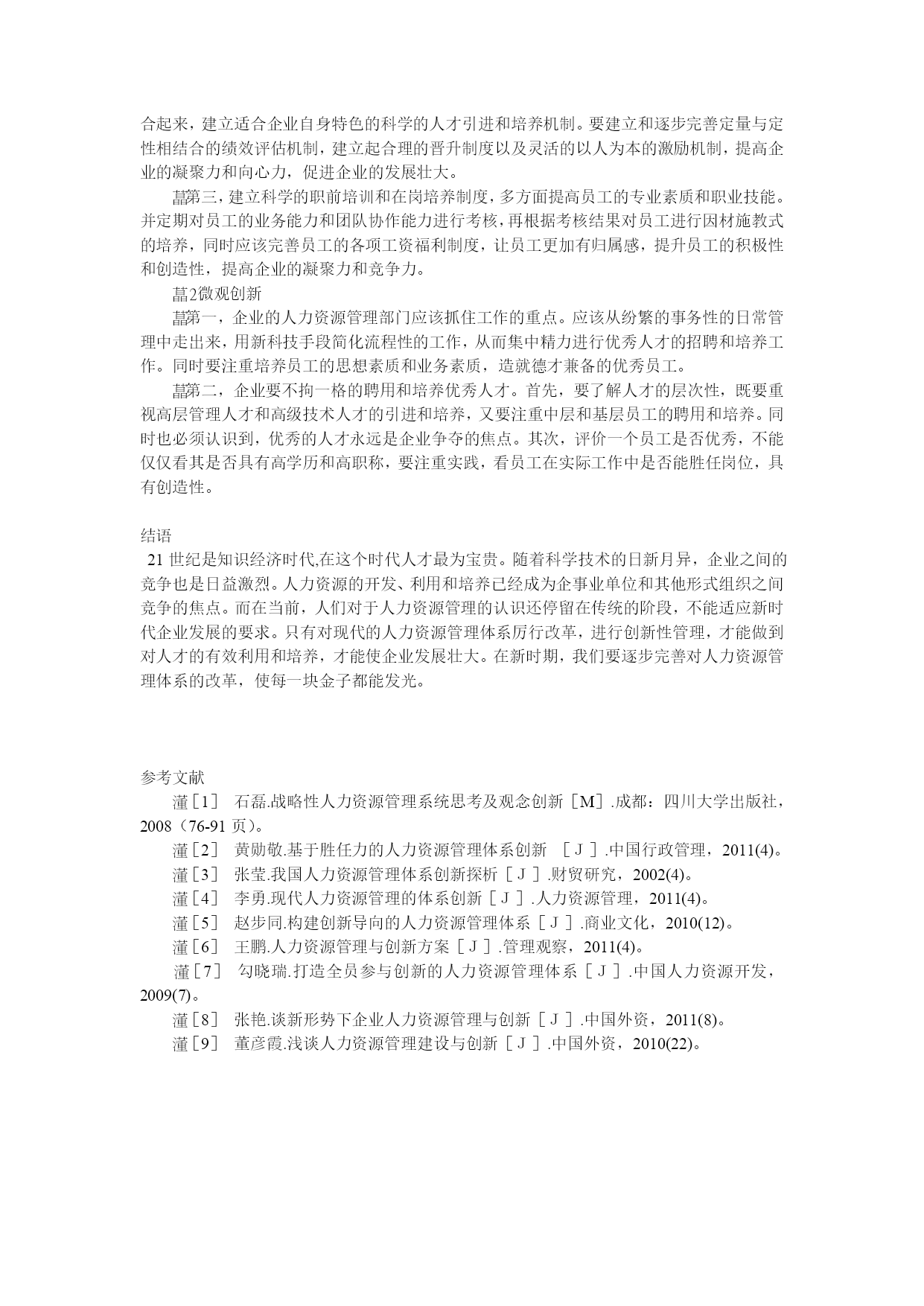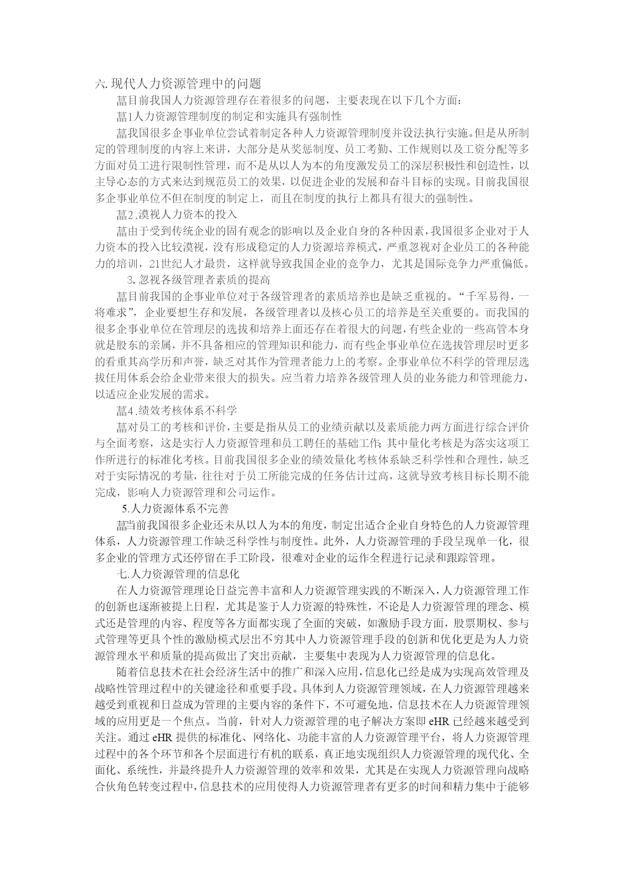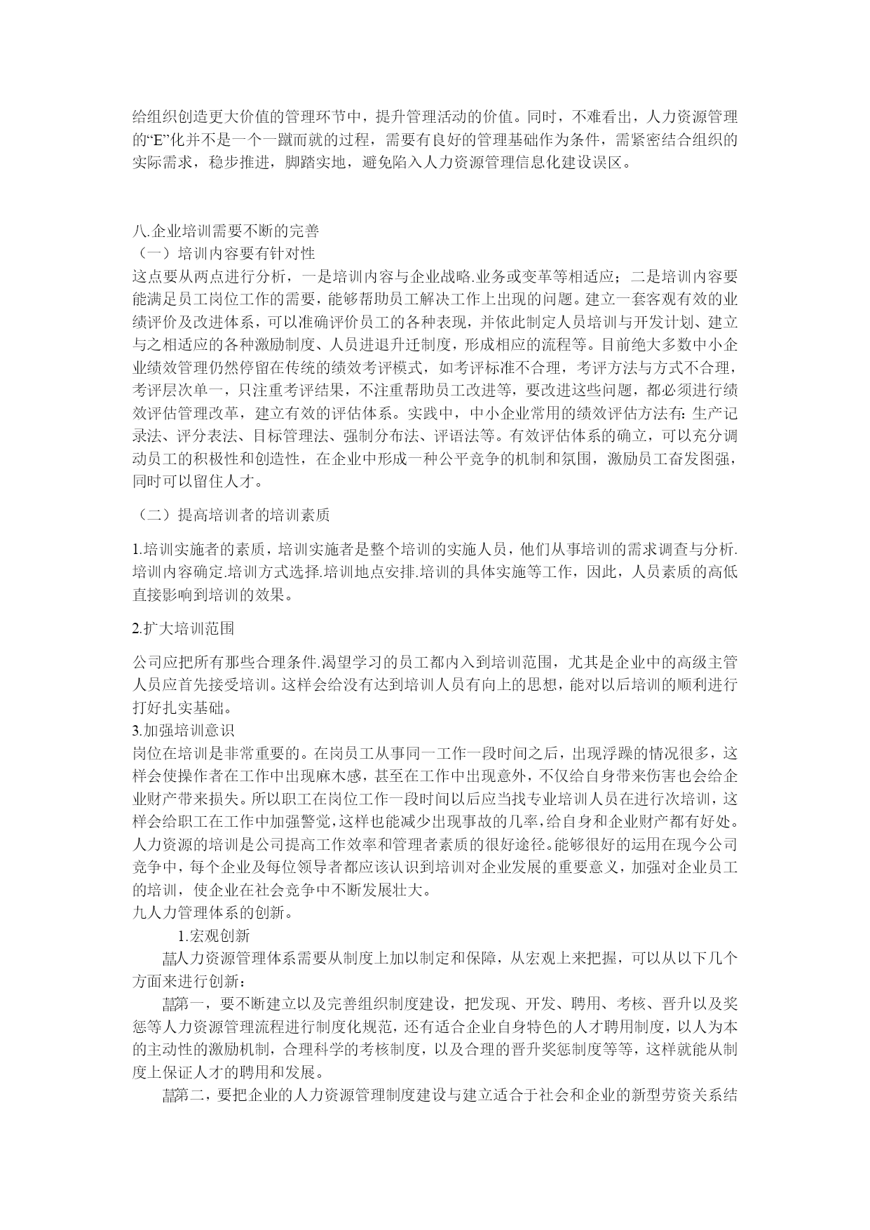 浅谈企业人力资源培训与管理目录.对新进员工岗前培训重要性(一).明确培训目的的增强培训的科学性(二).岗前培训的内容二,在职在岗职工的岗位培训(一).对操作人员培训(二).对管理人员的培训三..对领导干部的在培训1.开办中层干部.科段干部培训班开办经验介绍学习班四.企业培训要建立一个完整的体系(一)在培训时间形式内容上有规划(二)建立企业培训制度五.建立和谐企业文化,推进人力资源管理建设.(一)企业文化影响着人力资源管理的理念、模式和制度的选择。(二)企业文化的提炼与设计六.现代人力资源管理中的问题1人力资源管理制度的制定和实施具有强制性漠视人力资本的投入忽视各级管理者素质的提高绩效考核体系不科学人力资源体系不完善七.人力资源管理的信息化八.企业培训需要不断的完善(一)培训内容要有针对性(二)提高培训者的培训素质九人力管理体系的创新。1.宏观创新2.微观创新结语人力资源管理是个舶来品,虽然在中国落地生根的时间不长,但受到关注度不断提升。因此,新形势下对于国际人力资源管理的发展趋势作一个全面分析和探究,对于仍处于由传统人事管理向人力资源管理转变的我国人力资源管理具有积极的借鉴意义和影响,同时在引进、吸收和创新的基础上,结合我国人力资源管理特殊性以求更好地提升我国人力资源管理水平,最终形成并不断完善具有中国特色的人力资源管理模式.随着经济全球化和一体化发展趋势的强化,人力资源的配置已不仅仅局限于本国或本地区域内,人力资源流动及配置的全球化加速。基于这样的时代背景环境下,这也必须导致人力资源管理不论是从理论研究还是具体实践操作都极可能呈现出许多新的发展趋势。一..对新进员工岗前培训重要性(一).明确培训目的的增强培训的科学性培训工作在整个人力资源开发中发挥重要作用,明确培训工作的目的,增强培训的科学性和针对性是十分重要的培训工作要建立在科学合理的人才预测和规划基础上,要通过深入此致的人员现状调查和岗位分析,确定员工培训目的,内容和方法。培训有助于员工潜能的开发,是达到人与“事”相匹配的有效途径。培训的一个主要方面就是岗位培训,其中岗位规范、专业知识和专业能力的要求被视为岗位培训的重要目标,是将组织战略目标与员工的个人职业发展相结合,不断使员工的潜能发挥出来。在HYPERLINK"http://www.studa.net/gongxue/"科学技术日新月异和生产力快速发展的今天,企业的规模越来越大,但组织越来越精简,人员越来越精干,组织形式由金字塔式向扁平式发展,这就对人的素质提出了极大的挑战,原来需要几个人完成的工作或看管的机器,现在可能只要一个人完成,这就对员工的素质和能力提出了更高的要求,因此培训的内涵是对员工潜在能力的开发,而不仅仅是知识的补足、技能的训练,其目的是促进员工全面、充分地发展,通过培训不仅提高员工岗位工作能力,增强工作信心,促进员工的价值观念,工作作风及习惯的调整,从而给企业带来无穷无尽的活力。培训是保障员工绩效改善的重要措施。改善员工的绩效单纯靠提级,物质刺激得到的改变是不可持续的。培训是一种有效的激励手段,它不是在消极地约束人的行为,而是在积极地引导人的行为。组织行为理论告诉我们,一个人的工作绩效取决于这个人的工作行为,而其工作行为又由他在具体工作情景下所决定的行为目标决定。当员工工作绩效不佳、素质能力低于工作要求时,如果通过培训使员工工作绩效改善,那就是通过行为目标和方式的改进而塑造了员工的合理行为。企业要提高劳动生产率,增加经济效益,重要的是调动员工的积极性,进行有效激励。如:对操作人员技能、态度和综合素质的培训,能使其建立积极的心态、掌握正确做事的原则及方法,减少工作失误,提高工作绩效;对各职能人员进行专业技术知识及综合思维能力的培训,能使之认识到个人的责任,自主、自立、自我提高,并主动为企业战略目标作贡献;加强对各类管理人员的技能、知识培训能扩展他们的视野,使其更好地管理、指导下级、提高企业效益。通过培训,企业全体员工可获得或改进与工作有关的知识、技能、动机、态度和行为,每个员工既是劳动者又是所在岗位的管理者,就能从管理者的角度去思考如何改进工作绩效,从而在个体效率提高之后达到组织效率的提高(二).岗前培训的内容1,现员工上岗之前必须进行岗前培训,新员工上岗之前培训就是能在让新员工在短期内培训一些公司基本的产品知识.操作技能和操作规程。在这里公司在培训新员工中的具体内容是,让他们了解企业的情况.企业品牌.企业的文化.企业精神,并在培训的同时发放给每个人一个宣传手册,而且利用幻灯片和录像来具体介绍企业现在的生产项目,企业建设以及宏伟规划:让每个新进企业的新员工都能更好的了解公司。2,