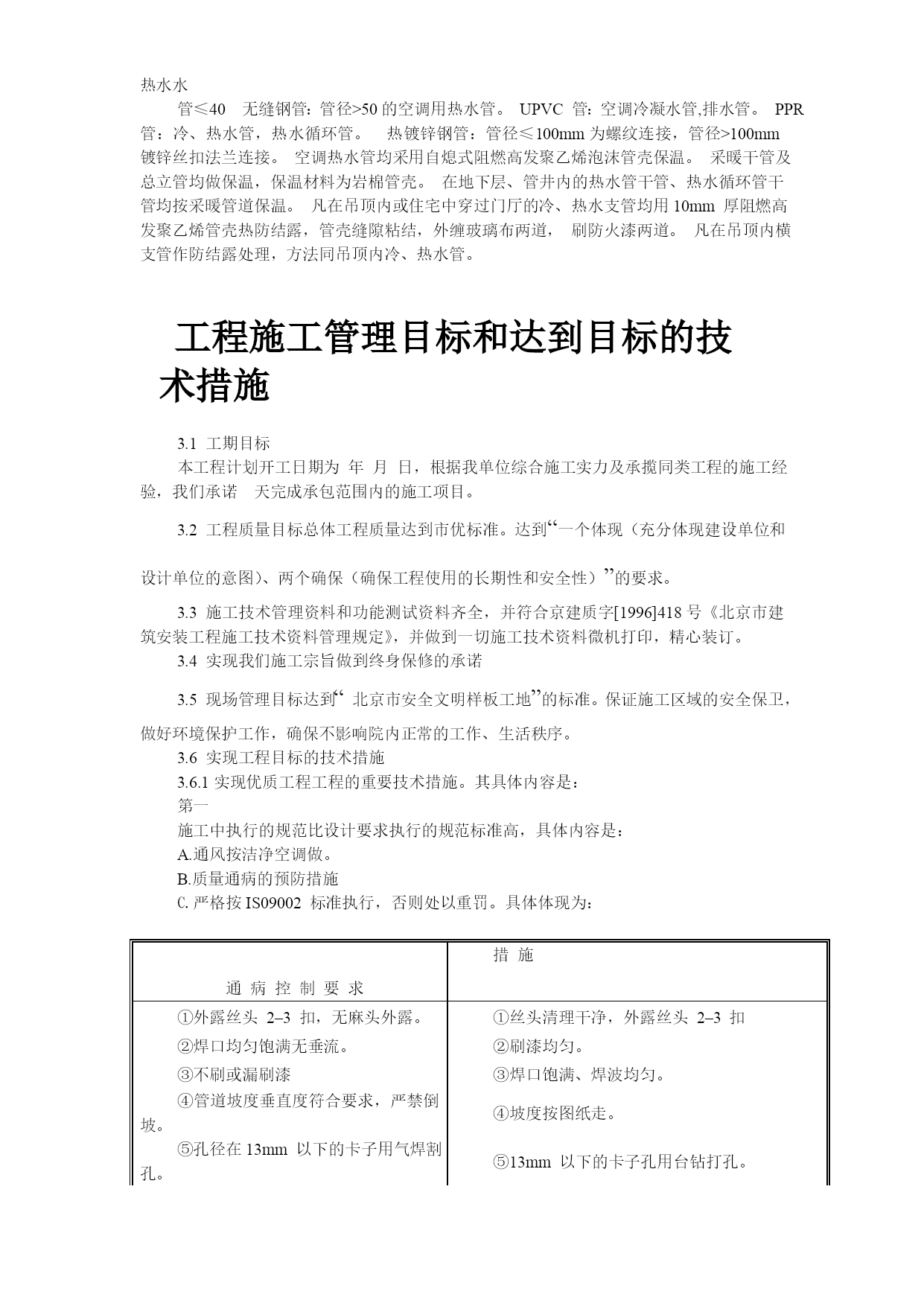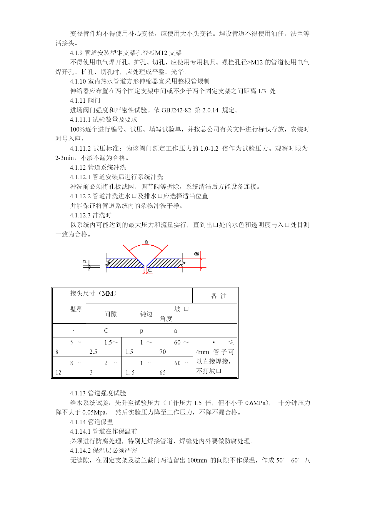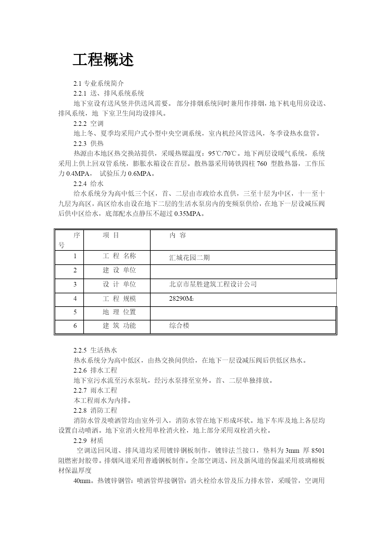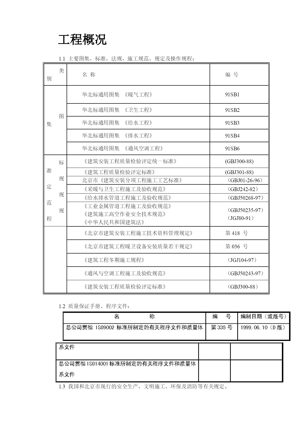 目录TOC\o"1-4"第1卷工程概况PAGEREF_Toc206998550\h2第2卷工程概述PAGEREF_Toc206998551\h4第3卷工程施工管理目标和达到目标的技术措施PAGEREF_Toc206998552\h6第4卷施工技术措施PAGEREF_Toc206998553\h10第5卷成品保护PAGEREF_Toc206998554\h30第6卷流水段划分(详见土建施组)PAGEREF_Toc206998555\h31第7卷工期安排PAGEREF_Toc206998556\h31第8卷资源计划PAGEREF_Toc206998557\h31第9卷施工协调管理措施PAGEREF_Toc206998558\h31第10卷防止扰民措施PAGEREF_Toc206998559\h35第11卷降低成本措施PAGEREF_Toc206998560\h36第12卷施工现场文明施工措施(详见土建施工组织设计)PAGEREF_Toc206998561\h37第13卷施工现场降尘、降噪、环境保护措施(详见土建施工组织设计)PAGEREF_Toc206998562\h37第14卷施工现场用水(计算见附页2)PAGEREF_Toc206998563\h37第15卷附页1PAGEREF_Toc206998564\h37第1章管理人员职责PAGEREF_Toc206998565\h37第2章附页2本工程施工用水由甲方提供DN100管道作为本工程的水源,根据现场实际情况进行管道布置。PAGEREF_Toc206998566\h41第3章工地供水组织PAGEREF_Toc206998567\h41工程概况1.1主要图集、标准、法规、施工规范、规定及操作规程:类别名称编号图集华北标通用图集《暖气工程》91SB1华北标通用图集《卫生工程》91SB2华北标通用图集《给水工程》91SB3华北标通用图集《排水工程》91SB4华北标通用图集《通风空调工程》91SB6标准规定规范规程《建筑安装工程质量检验评定统一标准》(GBJ300-88)《建筑工程质量检验评定标准》(GBJ301-88)北京市《建筑安装分项工程施工工艺标准》(GBJ01-26-96)《采暖与卫生工程施工及验收规范》(GBJ242-82)《给水排水管道工程施工及验收规范》(GBJ50268-97)《工业金属管道工程施工及验收规范》《建筑施工高空作业安全技术规范》《中华人民共和国建筑法》(GBJ50235-97)(JGJ80-91)《北京市建筑安装工程施工技术资料管理规定》第418号《北京市建筑工程暖卫设备安装质量若干规定》第036号《建筑工程冬期施工规程》(JGJ104-97)《通风与空调工程施工及验收规范》(GBJ50243-97)《建筑安装工程质量检验评定标准》(GBJ300-88)1.2质量保证手册、程序文件:1.3我国和北京市现行的安全生产、文明施工、环保及消防等有关规定。工程概述2.1专业系统简介2.2.1送、排风系统系统地下室设有送风竖井供送风需要。部分排烟系统同时兼用作排烟,地下机电用房设送、排风系统,地下室卫生间均设排风。2.2.2空调地上冬、夏季均采用户式小型中央空调系统,室内机经风管送风,冬季设热水盘管。2.2.3供热热源由本地区热交换站提供,采暖热媒温度:95℃/70℃。地下两层设暖气系统,系统采用上供上回双管系统,膨胀水箱设在首层。散热器采用铸铁四柱760型散热器,工作压力0.4MPA,试验压力0.6MPA。2.2.4给水给水系统分为高中低三个区,首、二层由市政给水直供,三至十层为中区,十一至十九层为高区,高区给水由设在地下二层的生活水泵房内的变频泵供给,在地下一层设减压阀后供中区给水,底部配水点静压不超过0.35MPA。序号项目内容1工程名称汇城花园二期2建设单位3设计单位北京市星胜建筑工程设计公司4工程规模28290M25地理位置6建筑功能综合楼2.2.5生活热水热水系统分为高中低区,由热交换间供给,在地下一层设减压阀后供低区热水。2.2.6排水工程地下室污水流至污水泵坑,经污水泵排至室外。首、二层单独排放。2.2.7雨水工程本工程雨水为内排。2.2.8消防工程消防水管及喷洒管均由室外引入,消防水管在地下形成环状。地下车库及地上各层均设置自动喷洒。地下室消火栓用单栓消火栓,地上部分采用双栓消火栓。2.2.9材质空调送回风道、排风道均采用镀锌钢板制作,镀锌法兰接口,垫料为