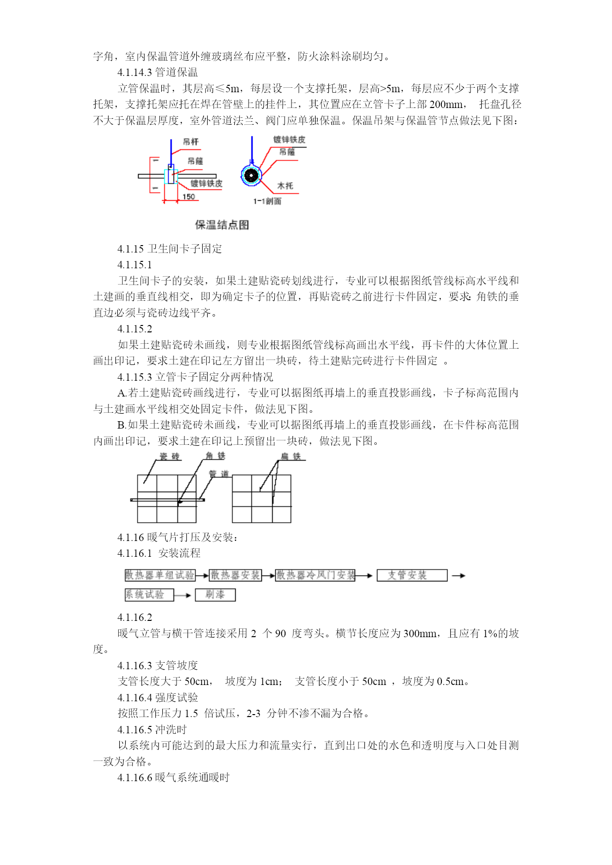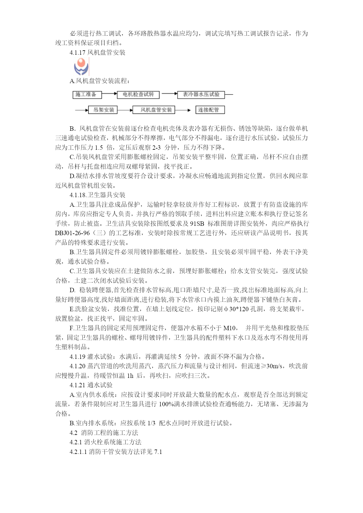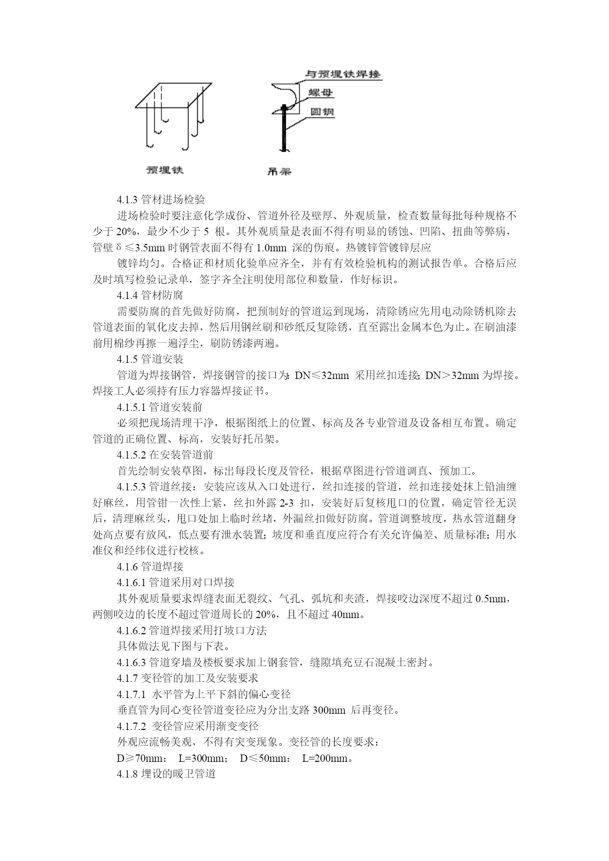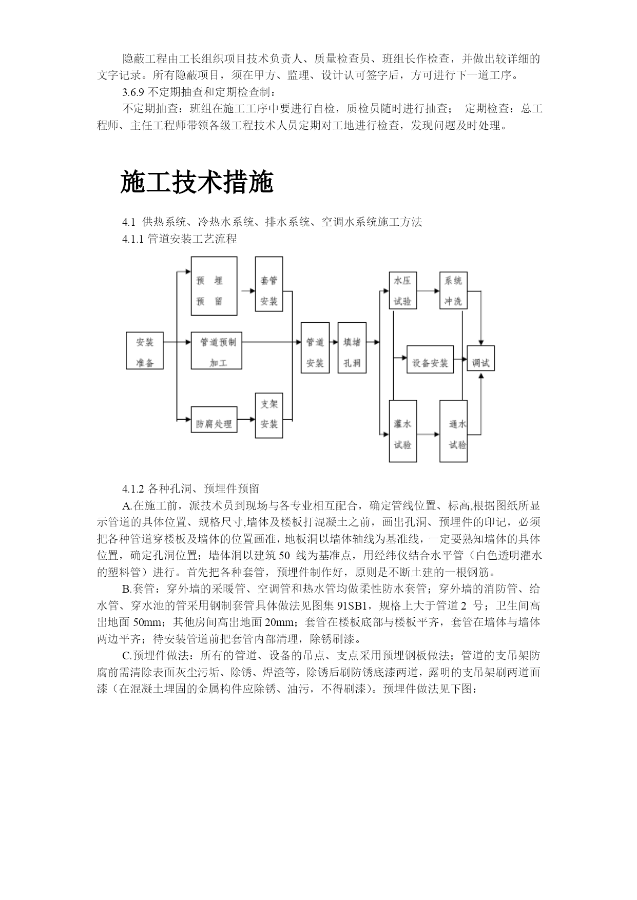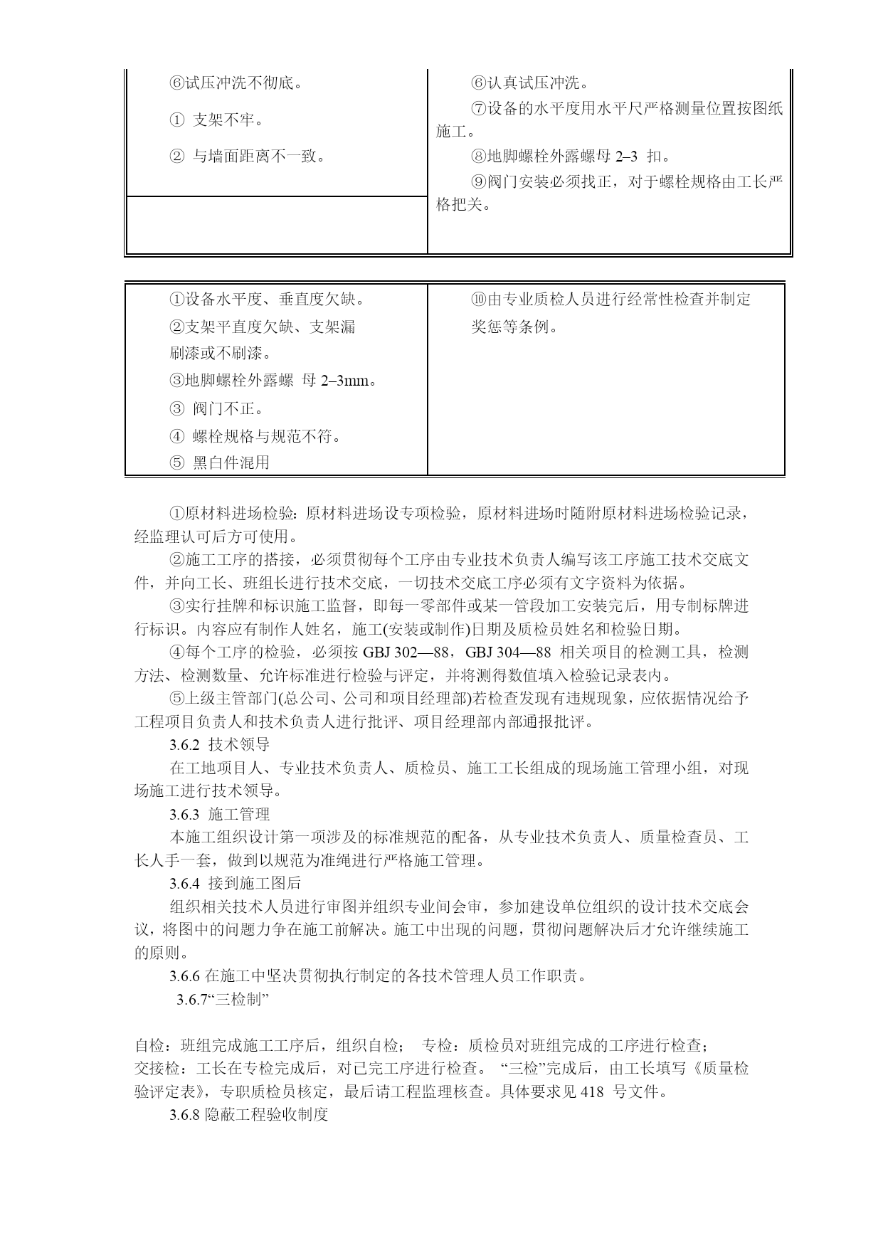 目录TOC\o"1-4"第1卷工程概况PAGEREF_Toc206998550\h2第2卷工程概述PAGEREF_Toc206998551\h4第3卷工程施工管理目标和达到目标的技术措施PAGEREF_Toc206998552\h6第4卷施工技术措施PAGEREF_Toc206998553\h10第5卷成品保护PAGEREF_Toc206998554\h30第6卷流水段划分(详见土建施组)PAGEREF_Toc206998555\h31第7卷工期安排PAGEREF_Toc206998556\h31第8卷资源计划PAGEREF_Toc206998557\h31第9卷施工协调管理措施PAGEREF_Toc206998558\h31第10卷防止扰民措施PAGEREF_Toc206998559\h35第11卷降低成本措施PAGEREF_Toc206998560\h36第12卷施工现场文明施工措施(详见土建施工组织设计)PAGEREF_Toc206998561\h37第13卷施工现场降尘、降噪、环境保护措施(详见土建施工组织设计)PAGEREF_Toc206998562\h37第14卷施工现场用水(计算见附页2)PAGEREF_Toc206998563\h37第15卷附页1PAGEREF_Toc206998564\h37第1章管理人员职责PAGEREF_Toc206998565\h37第2章附页2本工程施工用水由甲方提供DN100管道作为本工程的水源,根据现场实际情况进行管道布置。PAGEREF_Toc206998566\h41第3章工地供水组织PAGEREF_Toc206998567\h41工程概况1.1主要图集、标准、法规、施工规范、规定及操作规程:类别名称编号图集华北标通用图集《暖气工程》91SB1华北标通用图集《卫生工程》91SB2华北标通用图集《给水工程》91SB3华北标通用图集《排水工程》91SB4华北标通用图集《通风空调工程》91SB6标准规定规范规程《建筑安装工程质量检验评定统一标准》(GBJ300-88)《建筑工程质量检验评定标准》(GBJ301-88)北京市《建筑安装分项工程施工工艺标准》(GBJ01-26-96)《采暖与卫生工程施工及验收规范》(GBJ242-82)《给水排水管道工程施工及验收规范》(GBJ50268-97)《工业金属管道工程施工及验收规范》《建筑施工高空作业安全技术规范》《中华人民共和国建筑法》(GBJ50235-97)(JGJ80-91)《北京市建筑安装工程施工技术资料管理规定》第418号《北京市建筑工程暖卫设备安装质量若干规定》第036号《建筑工程冬期施工规程》(JGJ104-97)《通风与空调工程施工及验收规范》(GBJ50243-97)《建筑安装工程质量检验评定标准》(GBJ300-88)1.2质量保证手册、程序文件:1.3我国和北京市现行的安全生产、文明施工、环保及消防等有关规定。工程概述2.1专业系统简介2.2.1送、排风系统系统地下室设有送风竖井供送风需要。部分排烟系统同时兼用作排烟,地下机电用房设送、排风系统,地下室卫生间均设排风。2.2.2空调地上冬、夏季均采用户式小型中央空调系统,室内机经风管送风,冬季设热水盘管。2.2.3供热热源由本地区热交换站提供,采暖热媒温度:95℃/70℃。地下两层设暖气系统,系统采用上供上回双管系统,膨胀水箱设在首层。散热器采用铸铁四柱760型散热器,工作压力0.4MPA,试验压力0.6MPA。2.2.4给水给水系统分为高中低三个区,首、二层由市政给水直供,三至十层为中区,十一至十九层为高区,高区给水由设在地下二层的生活水泵房内的变频泵供给,在地下一层设减压阀后供中区给水,底部配水点静压不超过0.35MPA。序号项目内容1工程名称汇城花园二期2建设单位3设计单位北京市星胜建筑工程设计公司4工程规模28290M25地理位置6建筑功能综合楼2.2.5生活热水热水系统分为高中低区,由热交换间供给,在地下一层设减压阀后供低区热水。2.2.6排水工程地下室污水流至污水泵坑,经污水泵排至室外。首、二层单独排放。2.2.7雨水工程本工程雨水为内排。2.2.8消防工程消防水管及喷洒管均由室外引入,消防水管在地下形成环状。地下车库及地上各层均设置自动喷洒。地下室消火栓用单栓消火栓,地上部分采用双栓消火栓。2.2.9材质空调送回风道、排风道均采用镀锌钢板制作,镀锌法兰接口,垫料为