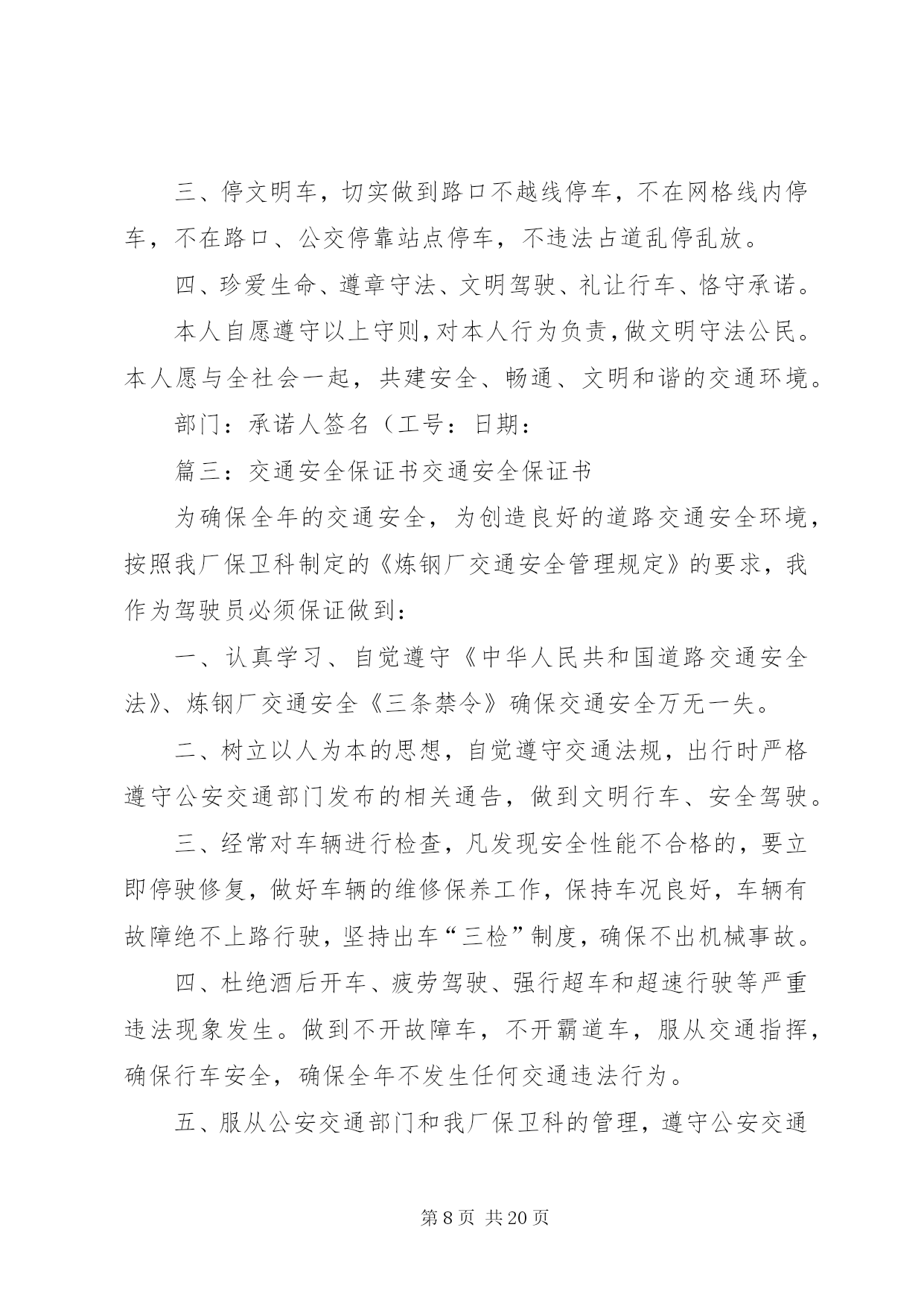 第PAGE\*Arabic\*MERGEFORMAT20页共NUMPAGES\*MERGEFORMAT20页交通安全承诺书为让交通事故远离我们,为使一拖公司成为道路交通安全的“平安企业”,我愿意为集团公司的道路交通安全贡献出一份自己的力量。带头遵守各项法律法规和规章制度,切实增强责任意识,认真履行岗位职责,争当文明守法职工,确保圆满完成各项工作任务。现公开承诺如下:1.我对安全行车负有直接责任,因此必须要牢固树立安全第一的思想观念,确保职工群众生命财产的安全。2.认真学习并严格遵守《中华人民共和国道路交通安全法》和集团公司各项安全行车制度及安全操作规程。3.服从调度,听从指挥,出车时证件携带齐全,按派车单执行任务。4.认真执行出车前、行车中、收车后安全检查制度。完成任务后及时维护保养车辆,保持车辆技术状况良好。5.做到文明礼貌,按路线行驶,不抢道,不超速,不开冒险车。6.通过交叉路口、漫水路段、公司门口、弯道、铁路道口及危险路面要减速靠右行,注意观察车辆,行人动态,做到礼让“三先”。情况不明,不盲目强行通过。7.严格遵守劳动纪律,注意劳逸结合,保证驾车时精力充沛,不疲劳驾车,不酒后驾车,不将车交给无证人员驾驶,未经单位领导同意,不将车交其他驾驶员驾驶,离开车辆时,要将电路开关钥匙取下,拉好手闸,锁好车门。8.在公司内按照指定地点统一停放车辆,不在管制区域、绿化草地等禁止车辆通行、停放的地方行车、停车。9.加强安全学习,努力提高驾驶水平,积极参加单位(班组)交通安全学习活动。10.保证做到安全行车,圆满完成生产任务。承诺人:单位:第二篇:交通安全承诺书交通安全承诺书为积极落实薛强书记《致全县广大机关干部职工和公职人员的一封信》的指示精神,进一步增强交通安全意识,我郑重承诺:1、以身作则,自觉遵守《道路交通安全法》等法律法规。2、做好全体干部职工特别是司机的宣传教育工作,提高干部职工的交通安全意识,制定切实可行的措施和奖罚制度规范交通安全行为。3、教育引导身边的亲属、朋友,自觉遵守机动车礼让斑马线、机动车按序排队通行、机动车有序停放、文明使用车灯、行人/非机动车各行其道、行人/非机动车过街遵守信号等文明交通行为等“六大文明交通行为”。4、自觉摒弃机动车随意变更车道、占用应急车道、开车打手机、不系安全带、驾乘摩托车不戴头盔、行人过街跨越隔离设施等“六大交通陋习”。5、自觉抵制酒后驾驶、超速行驶、疲劳驾驶、闯红灯、强行超车、超员/超载等“六大危险驾驶行为”,维护正常的交通秩序和良好的城市形象。6、对他人不文明的交通陋习和交通违法行为要敢于当面批评教育,及时纠正制止。承诺人:二〇一一年十月二十日第三篇:交通安全承诺书交通安全承诺书我们生活在一个喧嚣繁华的城镇里,我们每天都要在行人、车辆拥挤的街道上行走,公司门口正在分半扩建维修,拥挤的车辆在我们眼前来来往往。因为上班赶时间不遵守交通法规或存有麻痹和侥幸心理,我们看到了血的事实,经受了血的教训。多少惨痛的教训和血的代价让我们深深地体悟到维护交通安全的重要性,遵守交通法规是我们应尽的责任和义务,只有遵守交通法规,平安才会伴我们一生,只有文明交通,事故才会与我们无缘。为了珍惜和关爱自己和他人的生命,做一名自觉遵守交通法规的模范,我们承诺如下:一、认真学习交通法规知识,自觉遵守交通法规规定,文明交通,各行其道,养成良好的交通习惯。二、行路走人行道,没有人行道的,须靠右边行走;过马路走斑马线,不准穿越、倚坐人行道、车行道和铁路道口的护栏。三、乘车时不准携带易燃、易爆等危险物品,不准乘坐货车、农用车、无牌无证以及非客运车辆。乘坐公交车时需在站台等候,不得追车或强行拦车。四、骑自行车、电瓶车和摩托车等非机动车时要走非机动车道,骑车时不戴耳塞听歌,不双手离车,不攀扶其他车辆或手中持物行驶;不牵引车辆或被其他车辆牵引,不扶身并行,互相追逐曲折竞驶;进出公司大门时要减速慢行或下车推行,未戴头盔或无驾驶证不驾驶摩托车,不违规带人,不驾驶“三无”车辆。五、驾驶机动车辆时,不酒后或服用药物后驾驶,做到开车不喝酒,酒后不开车;不无证驾车、不闯红灯不飚车,自觉遵守交通规定。生命只有一次,遵守交通法规,就是珍爱生命,我们要从自身做起,增强交通安全意识,积极维护交通秩序,行安全路,做文明人,以上承诺我坚决遵守,若有违反后果自负。承诺人:年月日第四篇:交通安全承诺书).篇一:交通安全承诺书交通安全承诺书安全无小事,交通安全从我做起。众多的事故告诉我们,交通事故的发生往往只是行人、车辆一念之间的疏忽、大意。为了进一步增强同学们的交通安全意识和遵守交通法规的自觉性,保障每一位同学的生命安全,保障学生上学、放学路上的交通安全,我校开展自觉遵守交通规则、文明出行的承诺活动。要求每一位学生及家长自觉做到以下