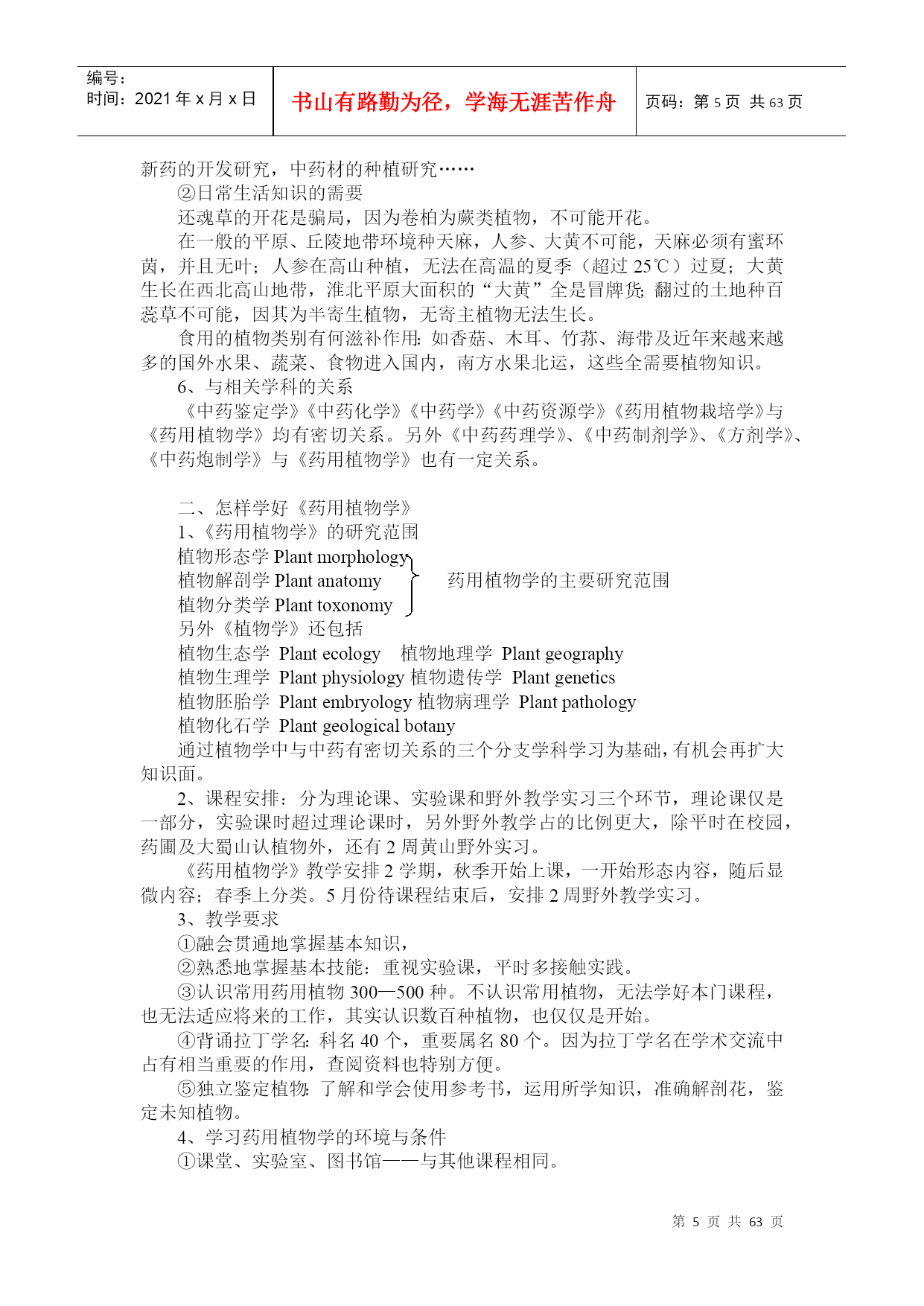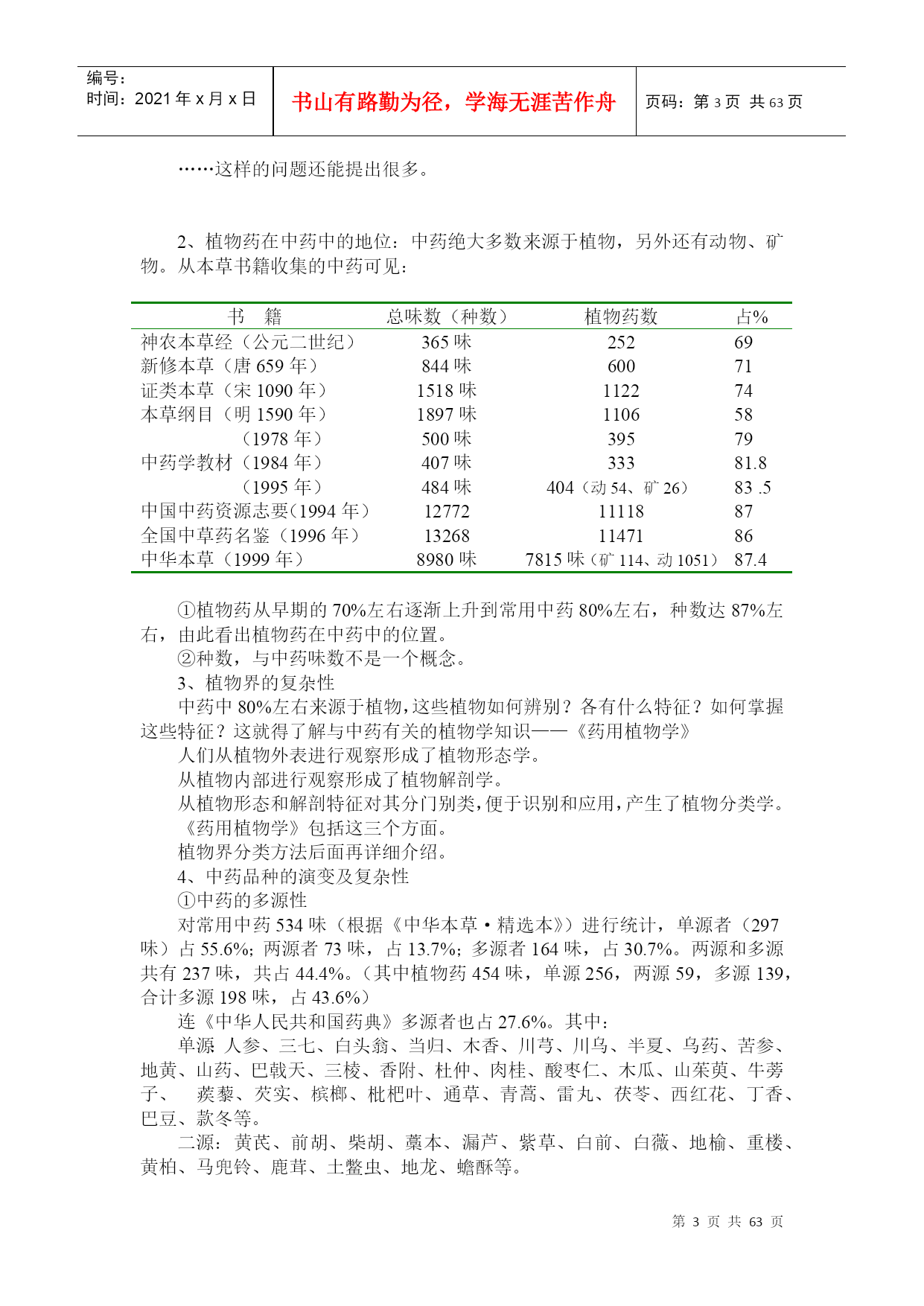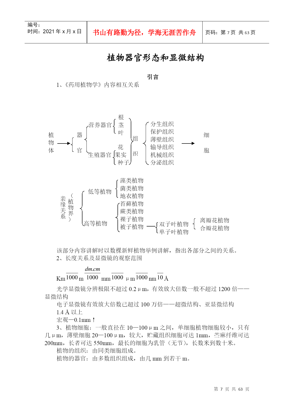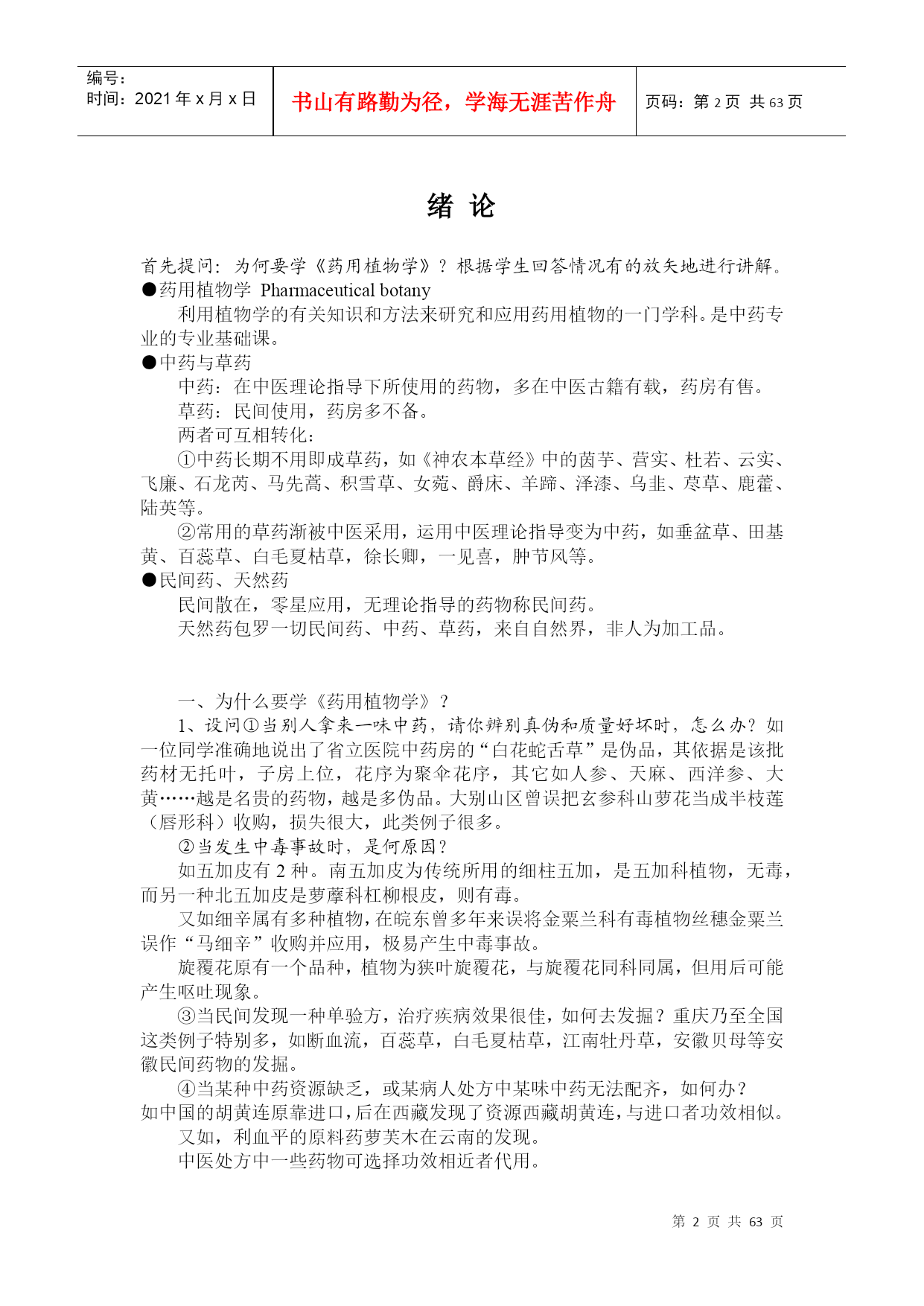 编号:时间:2021年x月x日书山有路勤为径,学海无涯苦作舟页码:第PAGE63页共NUMPAGES63页第PAGE\*MERGEFORMAT63页共NUMPAGES\*MERGEFORMAT63页《药用植物学》讲义生物信息学院刘毅绪论首先提问:为何要学《药用植物学》?根据学生回答情况有的放矢地进行讲解。●药用植物学Pharmaceuticalbotany利用植物学的有关知识和方法来研究和应用药用植物的一门学科。是中药专业的专业基础课。●中药与草药中药:在中医理论指导下所使用的药物,多在中医古籍有载,药房有售。草药:民间使用,药房多不备。两者可互相转化:①中药长期不用即成草药,如《神农本草经》中的茵芋、营实、杜若、云实、飞廉、石龙芮、马先蒿、积雪草、女菀、爵床、羊蹄、泽漆、乌韭、荩草、鹿藿、陆英等。②常用的草药渐被中医采用,运用中医理论指导变为中药,如垂盆草、田基黄、百蕊草、白毛夏枯草,徐长卿,一见喜,肿节风等。●民间药、天然药民间散在,零星应用,无理论指导的药物称民间药。天然药包罗一切民间药、中药、草药,来自自然界,非人为加工品。为什么要学《药用植物学》?1、设问①当别人拿来一味中药,请你辨别真伪和质量好坏时,怎么办?如一位同学准确地说出了省立医院中药房的“白花蛇舌草”是伪品,其依据是该批药材无托叶,子房上位,花序为聚伞花序,其它如人参、天麻、西洋参、大黄……越是名贵的药物,越是多伪品。大别山区曾误把玄参科山萝花当成半枝莲(唇形科)收购,损失很大,此类例子很多。②当发生中毒事故时,是何原因?如五加皮有2种。南五加皮为传统所用的细柱五加,是五加科植物,无毒,而另一种北五加皮是萝藦科杠柳根皮,则有毒。又如细辛属有多种植物,在皖东曾多年来误将金粟兰科有毒植物丝穗金粟兰误作“马细辛”收购并应用,极易产生中毒事故。旋覆花原有一个品种,植物为狭叶旋覆花,与旋覆花同科同属,但用后可能产生呕吐现象。③当民间发现一种单验方,治疗疾病效果很佳,如何去发掘?重庆乃至全国这类例子特别多,如断血流,百蕊草,白毛夏枯草,江南牡丹草,安徽贝母等安徽民间药物的发掘。④当某种中药资源缺乏,或某病人处方中某味中药无法配齐,如何办?如中国的胡黄连原靠进口,后在西藏发现了资源西藏胡黄连,与进口者功效相似。又如,利血平的原料药萝芙木在云南的发现。中医处方中一些药物可选择功效相近者代用。……这样的问题还能提出很多。2、植物药在中药中的地位:中药绝大多数来源于植物,另外还有动物、矿物。从本草书籍收集的中药可见:书籍总味数(种数)植物药数占%神农本草经(公元二世纪)365味25269新修本草(唐659年)844味60071证类本草(宋1090年)1518味112274本草纲目(明1590年)1897味110658(1978年)中药学教材(1984年)(1995年)500味407味484味395333404(动54、矿26)7981.883.5中国中药资源志要(1994年)127721111887全国中草药名鉴(1996年)132681147186中华本草(1999年)8980味7815味(矿114、动1051)87.4①植物药从早期的70%左右逐渐上升到常用中药80%左右,种数达87%左右,由此看出植物药在中药中的位置。②种数,与中药味数不是一个概念。3、植物界的复杂性中药中80%左右来源于植物,这些植物如何辨别?各有什么特征?如何掌握这些特征?这就得了解与中药有关的植物学知识——《药用植物学》人们从植物外表进行观察形成了植物形态学。从植物内部进行观察形成了植物解剖学。从植物形态和解剖特征对其分门别类,便于识别和应用,产生了植物分类学。《药用植物学》包括这三个方面。植物界分类方法后面再详细介绍。4、中药品种的演变及复杂性①中药的多源性对常用中药534味(根据《中华本草·精选本》)进行统计,单源者(297味)占55.6%;两源者73味,占13.7%;多源者164味,占30.7%。两源和多源共有237味,共占44.4%。(其中植物药454味,单源256,两源59,多源139,合计多源198味,占43.6%)连《中华人民共和国药典》多源者也占27.6%。其中:单源:人参、三七、白头翁、当归、木香、川芎、川乌、半夏、乌药、苦参、地黄、山药、巴戟天、三棱、香附、杜仲、肉桂、酸枣仁、木瓜、山茱萸、牛蒡子、蒺藜、芡实、槟榔、枇杷叶、通草、青蒿、雷丸、茯苓、西红花、丁香、巴豆、款冬等。二源:黄芪、前胡、柴胡、藁本、漏芦、紫草、白前、白薇、地榆、重楼、黄柏、马兜铃、鹿茸、土鳖虫、地龙、蟾酥等。三原:麻黄