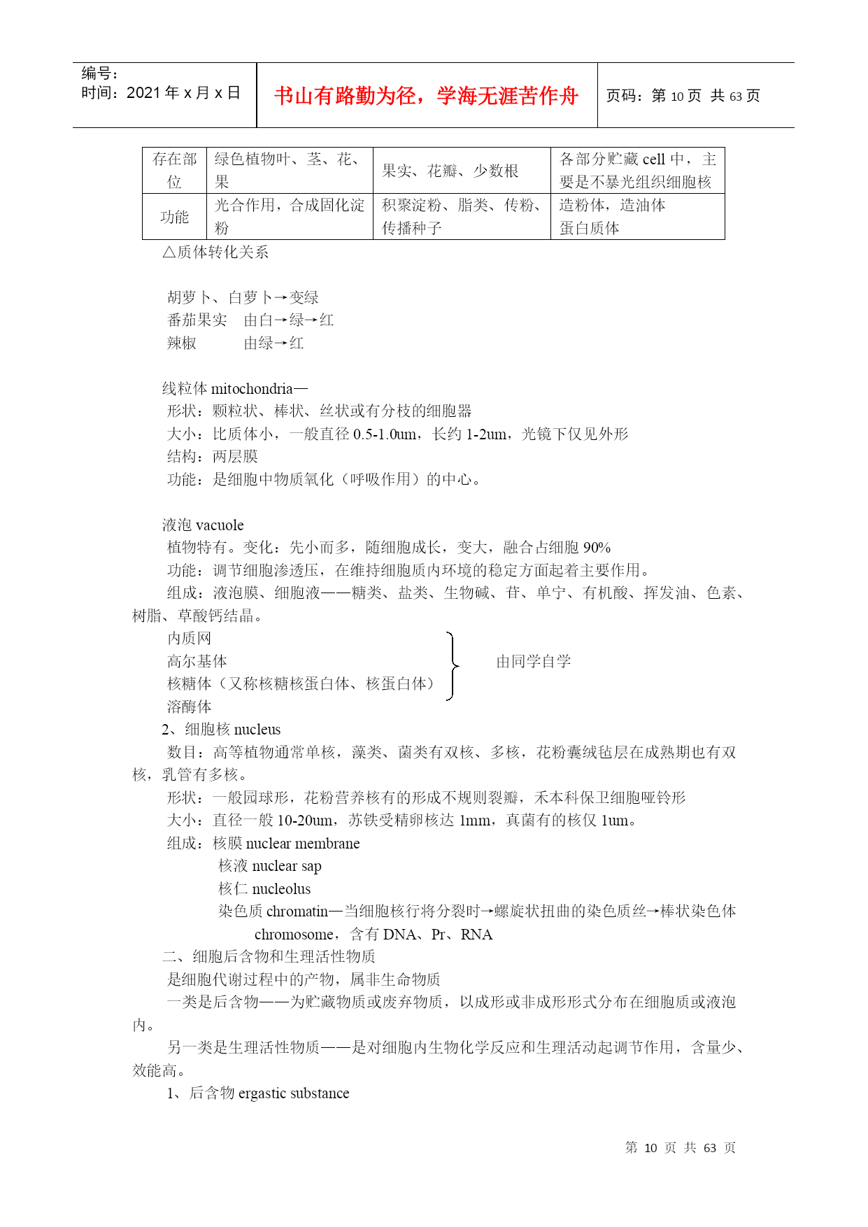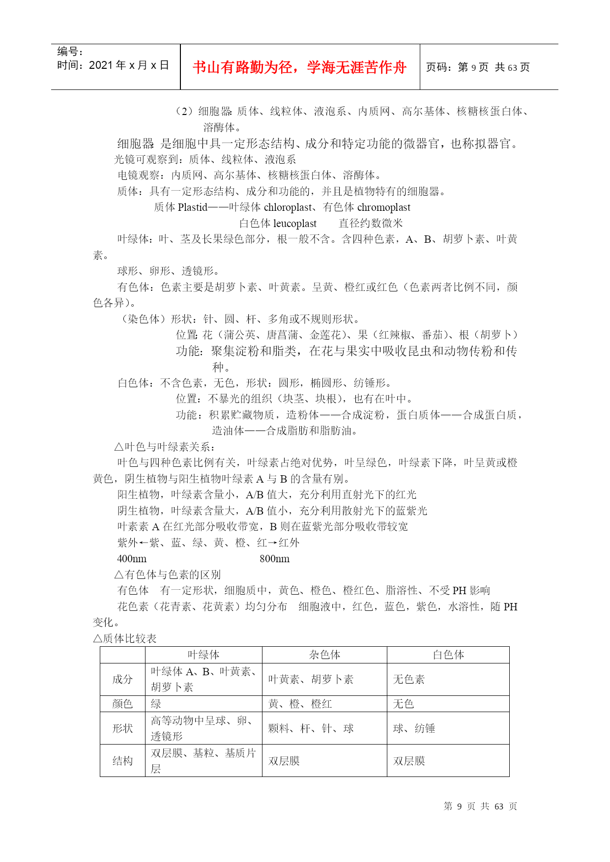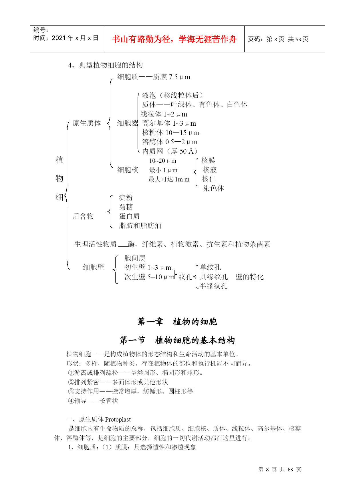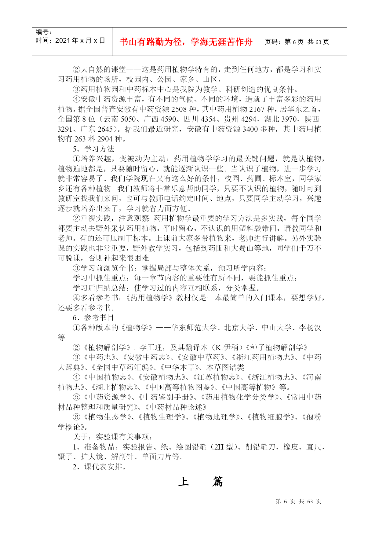 编号:时间:2021年x月x日书山有路勤为径,学海无涯苦作舟页码:第PAGE63页共NUMPAGES63页第PAGE\*MERGEFORMAT63页共NUMPAGES\*MERGEFORMAT63页《药用植物学》讲义生物信息学院刘毅绪论首先提问:为何要学《药用植物学》?根据学生回答情况有的放矢地进行讲解。●药用植物学Pharmaceuticalbotany利用植物学的有关知识和方法来研究和应用药用植物的一门学科。是中药专业的专业基础课。●中药与草药中药:在中医理论指导下所使用的药物,多在中医古籍有载,药房有售。草药:民间使用,药房多不备。两者可互相转化:①中药长期不用即成草药,如《神农本草经》中的茵芋、营实、杜若、云实、飞廉、石龙芮、马先蒿、积雪草、女菀、爵床、羊蹄、泽漆、乌韭、荩草、鹿藿、陆英等。②常用的草药渐被中医采用,运用中医理论指导变为中药,如垂盆草、田基黄、百蕊草、白毛夏枯草,徐长卿,一见喜,肿节风等。●民间药、天然药民间散在,零星应用,无理论指导的药物称民间药。天然药包罗一切民间药、中药、草药,来自自然界,非人为加工品。为什么要学《药用植物学》?1、设问①当别人拿来一味中药,请你辨别真伪和质量好坏时,怎么办?如一位同学准确地说出了省立医院中药房的“白花蛇舌草”是伪品,其依据是该批药材无托叶,子房上位,花序为聚伞花序,其它如人参、天麻、西洋参、大黄……越是名贵的药物,越是多伪品。大别山区曾误把玄参科山萝花当成半枝莲(唇形科)收购,损失很大,此类例子很多。②当发生中毒事故时,是何原因?如五加皮有2种。南五加皮为传统所用的细柱五加,是五加科植物,无毒,而另一种北五加皮是萝藦科杠柳根皮,则有毒。又如细辛属有多种植物,在皖东曾多年来误将金粟兰科有毒植物丝穗金粟兰误作“马细辛”收购并应用,极易产生中毒事故。旋覆花原有一个品种,植物为狭叶旋覆花,与旋覆花同科同属,但用后可能产生呕吐现象。③当民间发现一种单验方,治疗疾病效果很佳,如何去发掘?重庆乃至全国这类例子特别多,如断血流,百蕊草,白毛夏枯草,江南牡丹草,安徽贝母等安徽民间药物的发掘。④当某种中药资源缺乏,或某病人处方中某味中药无法配齐,如何办?如中国的胡黄连原靠进口,后在西藏发现了资源西藏胡黄连,与进口者功效相似。又如,利血平的原料药萝芙木在云南的发现。中医处方中一些药物可选择功效相近者代用。……这样的问题还能提出很多。2、植物药在中药中的地位:中药绝大多数来源于植物,另外还有动物、矿物。从本草书籍收集的中药可见:书籍总味数(种数)植物药数占%神农本草经(公元二世纪)365味25269新修本草(唐659年)844味60071证类本草(宋1090年)1518味112274本草纲目(明1590年)1897味110658(1978年)中药学教材(1984年)(1995年)500味407味484味395333404(动54、矿26)7981.883.5中国中药资源志要(1994年)127721111887全国中草药名鉴(1996年)132681147186中华本草(1999年)8980味7815味(矿114、动1051)87.4①植物药从早期的70%左右逐渐上升到常用中药80%左右,种数达87%左右,由此看出植物药在中药中的位置。②种数,与中药味数不是一个概念。3、植物界的复杂性中药中80%左右来源于植物,这些植物如何辨别?各有什么特征?如何掌握这些特征?这就得了解与中药有关的植物学知识——《药用植物学》人们从植物外表进行观察形成了植物形态学。从植物内部进行观察形成了植物解剖学。从植物形态和解剖特征对其分门别类,便于识别和应用,产生了植物分类学。《药用植物学》包括这三个方面。植物界分类方法后面再详细介绍。4、中药品种的演变及复杂性①中药的多源性对常用中药534味(根据《中华本草·精选本》)进行统计,单源者(297味)占55.6%;两源者73味,占13.7%;多源者164味,占30.7%。两源和多源共有237味,共占44.4%。(其中植物药454味,单源256,两源59,多源139,合计多源198味,占43.6%)连《中华人民共和国药典》多源者也占27.6%。其中:单源:人参、三七、白头翁、当归、木香、川芎、川乌、半夏、乌药、苦参、地黄、山药、巴戟天、三棱、香附、杜仲、肉桂、酸枣仁、木瓜、山茱萸、牛蒡子、蒺藜、芡实、槟榔、枇杷叶、通草、青蒿、雷丸、茯苓、西红花、丁香、巴豆、款冬等。二源:黄芪、前胡、柴胡、藁本、漏芦、紫草、白前、白薇、地榆、重楼、黄柏、马兜铃、鹿茸、土鳖虫、地龙、蟾酥等。三原:麻黄