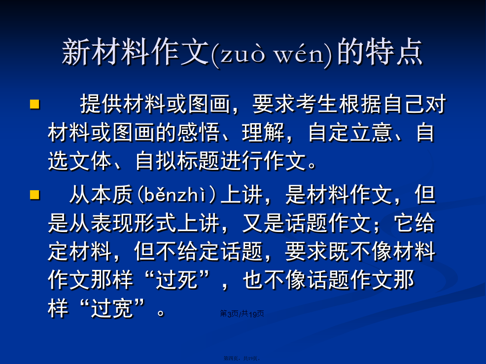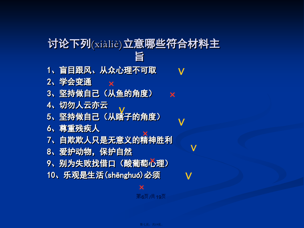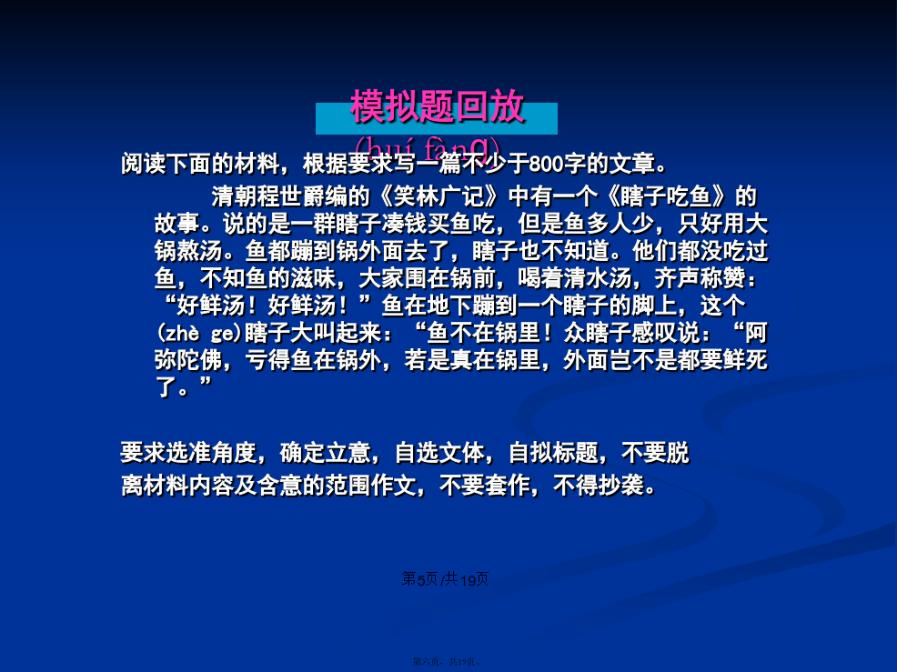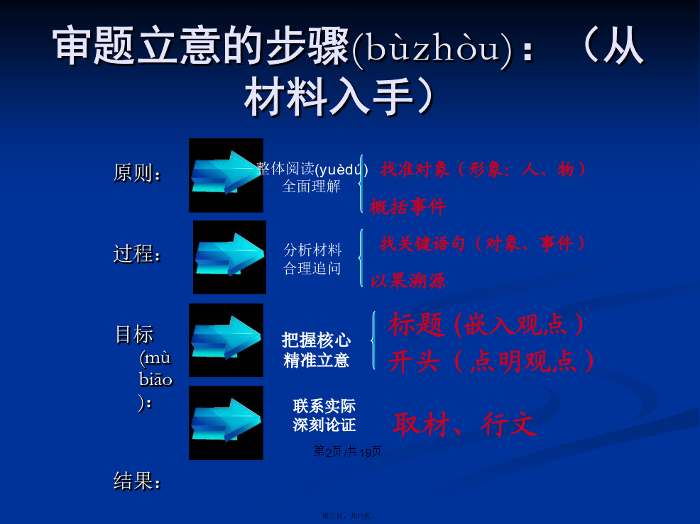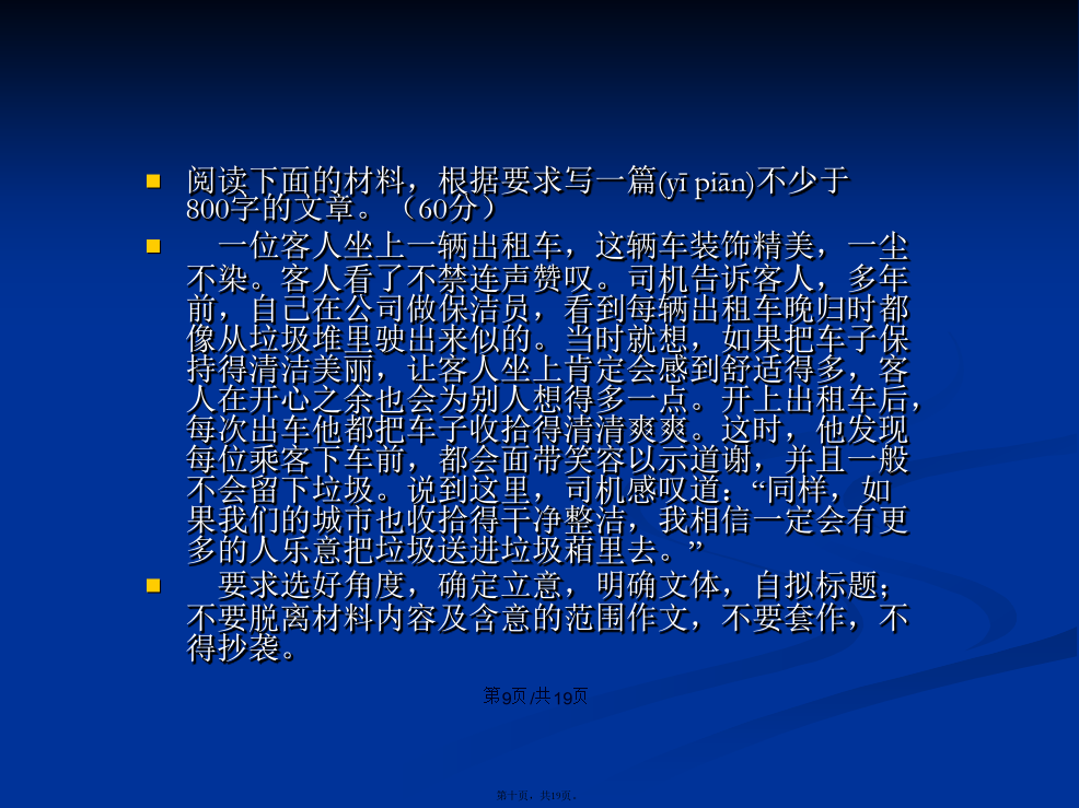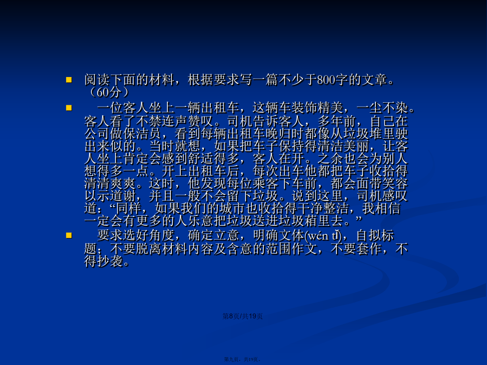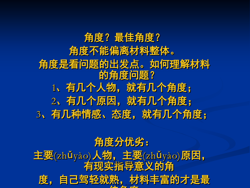 会计学新材料作文审题立意的切入点1、从分析原因入手。2、从材料的关键词句入手。3、从辨明(biànmíng)关系入手。4、从材料的情感倾向入手。5、从材料的分歧点入手。6、从材料的互补关系入手。审题立意的步骤(bùzhòu):(从材料入手)新材料作文(zuòwén)的特点角度?最佳角度?角度不能偏离材料整体。角度是看问题的出发点。如何理解材料的角度问题?1、有几个人物,就有几个角度;2、有几个原因,就有几个角度;3、有几种情感、态度,就有几个角度;角度分优劣:主要(zhǔyào)人物,主要(zhǔyào)原因,有现实指导意义的角度,自己驾轻就熟,材料丰富的才是最佳角度。模拟题回放(huífànɡ)讨论下列(xiàliè)立意哪些符合材料主旨阅读下面的材料,根据要求写一篇不少于800字的文章。(60分)一位客人坐上一辆出租车,这辆车装饰精美,一尘不染。客人看了不禁连声赞叹。司机告诉客人,多年前,自己在公司做保洁员,看到每辆出租车晚归时都像从垃圾堆里驶出来似的。当时就想,如果把车子保持得清洁美丽,让客人坐上肯定会感到舒适得多,客人在开。之余也会为别人想得多一点。开上出租车后,每次出车他都把车子收拾得清清爽爽。这时,他发现每位乘客下车前,都会面带笑容以示道谢,并且一般不会留下垃圾。说到这里,司机感叹道:“同样,如果我们的城市也收拾得干净整洁,我相信一定会有更多的人乐意把垃圾送进垃圾葙里去。”要求选好角度,确定立意,明确文体(wéntǐ),自拟标题;不要脱离材料内容及含意的范围作文,不要套作,不得抄袭。阅读下面的材料,根据要求写一篇(yīpiān)不少于800字的文章。(60分)一位客人坐上一辆出租车,这辆车装饰精美,一尘不染。客人看了不禁连声赞叹。司机告诉客人,多年前,自己在公司做保洁员,看到每辆出租车晚归时都像从垃圾堆里驶出来似的。当时就想,如果把车子保持得清洁美丽,让客人坐上肯定会感到舒适得多,客人在开心之余也会为别人想得多一点。开上出租车后,每次出车他都把车子收拾得清清爽爽。这时,他发现每位乘客下车前,都会面带笑容以示道谢,并且一般不会留下垃圾。说到这里,司机感叹道:“同样,如果我们的城市也收拾得干净整洁,我相信一定会有更多的人乐意把垃圾送进垃圾葙里去。”要求选好角度,确定立意,明确文体,自拟标题;不要脱离材料内容及含意的范围作文,不要套作,不得抄袭。(一)切合题意(47—60分)1.改变从自己开始,真心为他人着想。2.行善是有感染力的,哪怕是再小的善,也能感染他人,也能营造一个(yīɡè)大美的世界。3.榜样的力量(影响)。4.尊重自己必能得到别人的尊重。(二)符合题意(42—46分)1.付出;奉献;爱他人。(单独谈“为他人着想”)2.改变自己就是改变世界。(单独谈“改变自己”)3.环境造人;人与环境的关系;人与人的和谐。(三)基本符合题意(36—41分)1.从小事做起。2.不忘本。3.谈“微笑”。4.传递文明。5.谈责任、谈角色6.让世界充满爱。(四)偏离题意(35分及35分以下)成功重在第一步。阅读下面的材料,根据要求写一篇不少于800字的文章。(60分)材料一:古之立大事者,不惟有超世之才,亦必有坚忍不拔之志。——苏轼材料二:只要我还能划水,我就不肯被淹死,只要我还能站立,我就不肯倒下。——英国·笛福要求选好角度,确定立意,明确文体,自拟标题;不要脱离材料内容及含意的范围作文,不要套作(tàozuò),不得抄袭。阅读下面的材料,根据要求写一篇不少于800字的文章。(60分)材料一:古之立大事者,不惟有超世之才(chāoshìzhīcái),亦必有坚忍不拔之志。——苏轼材料二:只要我还能划水,我就不肯被淹死,只要我还能站立,我就不肯倒下。——英国·笛福要求选好角度,确定立意,明确文体,自拟标题;不要脱离材料内容及含意的范围作文,不要套作,不得抄袭。1、面对困难要坚忍不拔2、哪怕是一线希望也要争取,决不放弃3、面对困难,积极乐观去战胜它阅读下面的材料,根据要求写一篇不少于800字的文章。(60分)一个人只有一个心脏,却又两个心房:一个住着快乐;一个住着悲伤。不要笑得太大声,不然会吵醒旁边的悲伤。要求选好角度,确定立意,明确文体,自拟标题;不要脱离(tuōlí)材料内容及含意的范围作文,不要套作,不得抄袭。1、乐极生悲2、得意莫忘形3、学会克制有人曾说世界上只有两种动物能到达金字塔顶,一种是老鹰,一种是蜗牛。请以这句话所蕴涵的哲理为话题写一篇文章。立意自定,文体自选,题目自拟,不少于800字。审题提示:“到达金字塔顶”即意味着取得成功或目标实现;老鹰到达顶端,归功于它有一双矫健、敏捷的翅膀(实力);蜗牛能到达顶端,则归功于