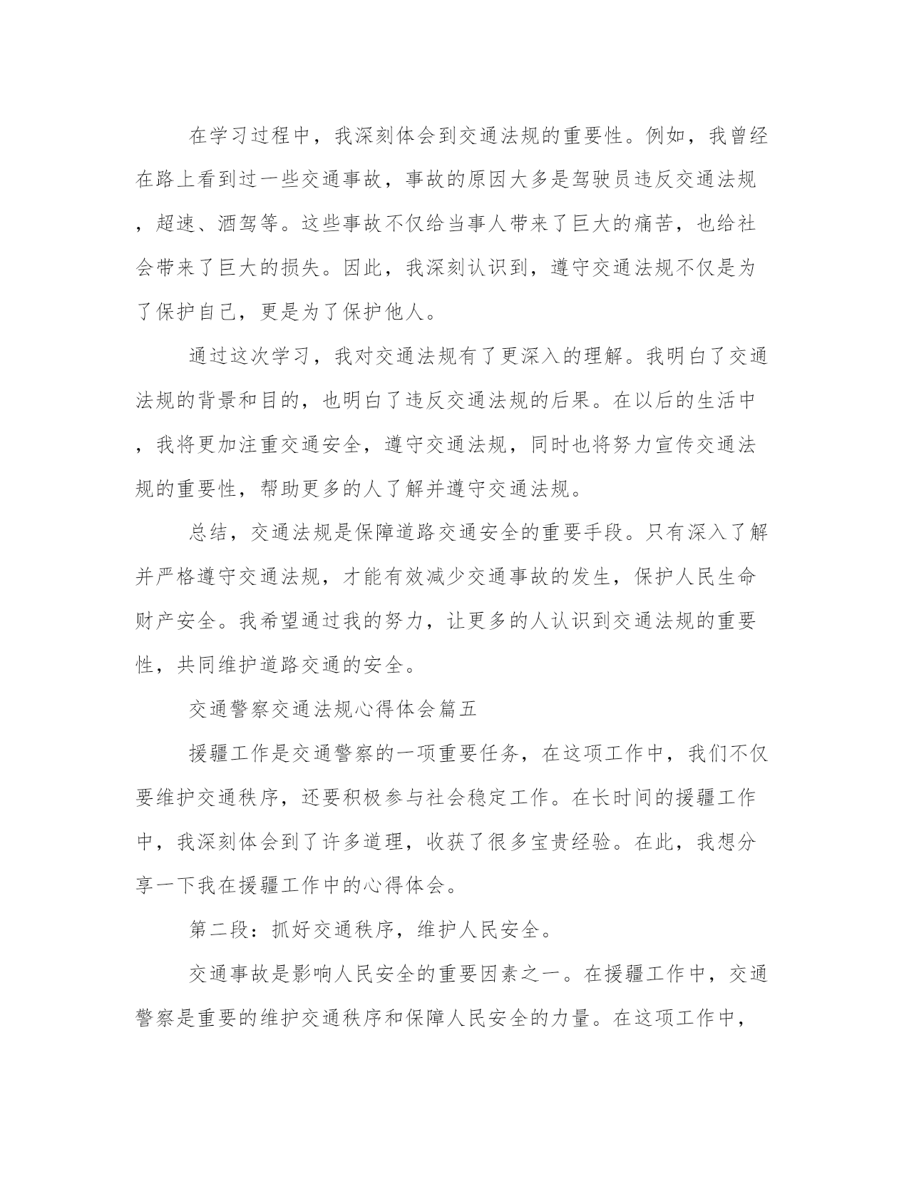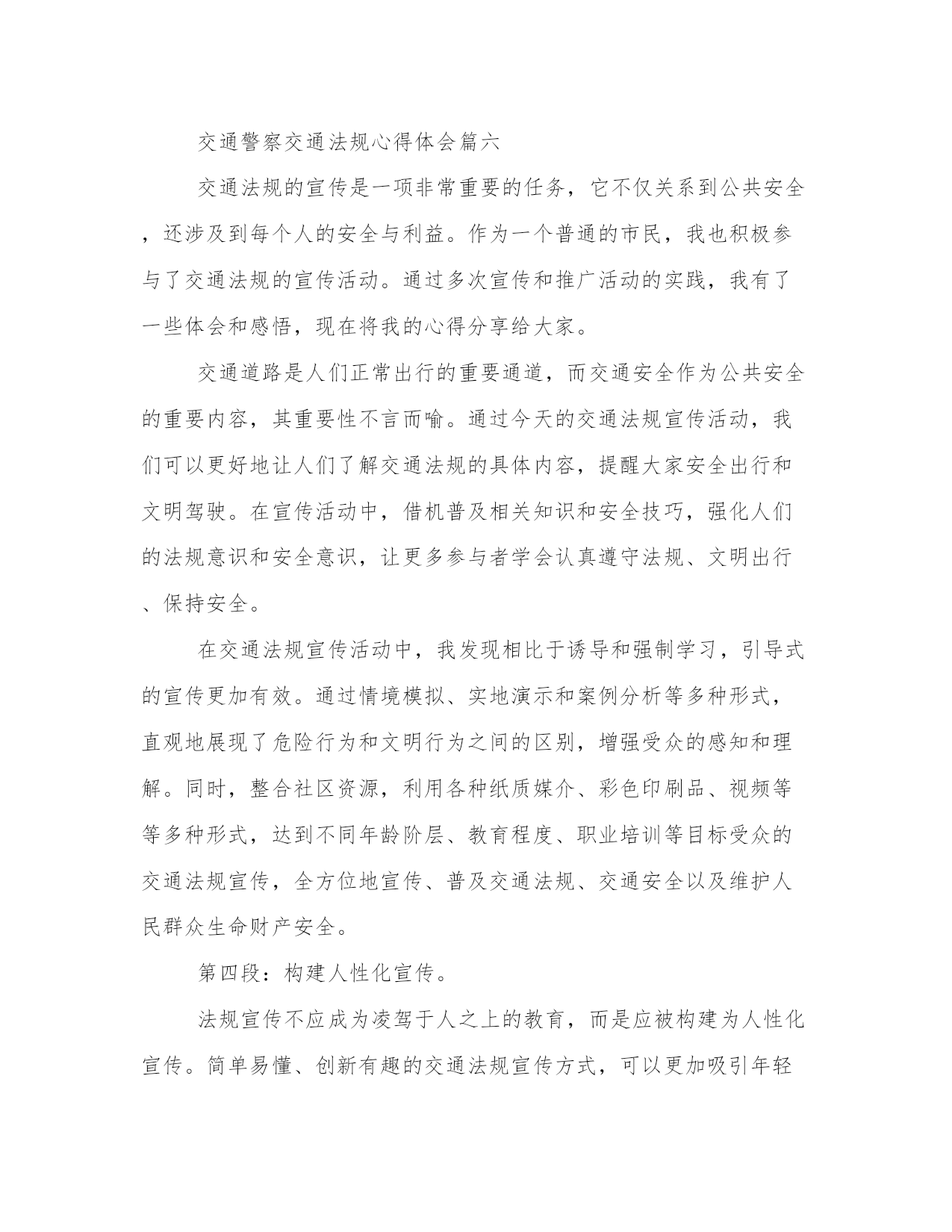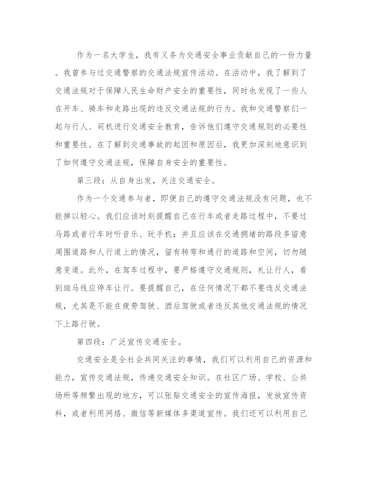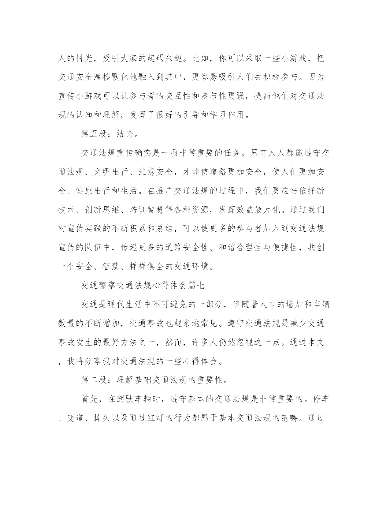 交通警察交通法规心得体会(热门17篇)写心得体会是我们对过去的回顾,也是对未来的思考和规划。在写心得体会之前,可以先做一个详细的思维导图或提纲,以确保文章的条理性和完整性。想要写一篇出色的心得体会,不妨阅读以下样例,或许能给你提供一些灵感和借鉴。交通警察交通法规心得体会篇一交通警察是我们城市中一支重要的力量,在各个关键路段和时刻,他们都保持着警惕和耐心。他们的工作是保障交通秩序和城市运转的重要一环。然而,这些交通警察的工作并不仅仅局限在城市中,他们也会积极参加各种社会活动,拓展他们的职业和人生经验。其中一项活动是公安局组织的“援疆行动”,让他们去新疆支援当地的交通工作。本文将分享一些交通警察在“援疆行动”中的心得体会。第二段:接受新疆交通环境的挑战。到达新疆后,交通警察首先遇到的是全新的交通环境,包括不同的道路标记、交通规则和行车文化。对于许多来自城市的交通警察来说,他们需要重新适应这个环境。同时,新疆的高寒气候和极端天气,也对出身温暖地域的警察构成了额外的挑战。然而,他们都迎刃而解,并尽快适应了这个环境。这挑战让他们变得更强壮和更坚定,同时也感受到了自己的职责与使命。第三段:与民之间的深情交流。在当地交通工作期间,交通警察与当地居民建立了深情的关系。他们不仅仅是在路口指挥交通,还与居民们交流当地的文化和生活情况。这点很重要,因为交通警察不仅是在管道路,也要带着城市文明风貌去‘走出去’。警察们还会到学校讲交通安全知识,和小朋友们玩游戏、参观当地文化等活动,让惯于城市生活的他们更深入地理解新疆人民的生活与情感。第四段:团队协作的默契配合。在挑战和交流的基础上,交通警察在新疆增强了团队协作的默契配合能力。警察们在处理事故和疏导交通时不断联系、互相帮助,以迅速、准确地完成工作。在这里,他们没有领导、下属之分,各个警员都积极发言,发挥自己的专长。这种默契配合不仅提高了执勤效率,还让他们之间的战斗友谊更加深厚。第五段:对职业的回顾与总结。“援疆行动”结束后,交通警察们回到了自己的工作岗位,回首这段经历,他们在工作中得到了许多正能量的启示。他们意识到警察职业的奉献精神和职业道德规范的重要性。他们不仅要继续保持热情和耐心的态度,在各个方面都应该自我要求更高,不断精进自己的技能和素质,更好地为社会和人民服务。在跨越千里的“援疆行动”中,交通警察们锤炼了自己的意志和素质。他们在这个过程中获得了深刻的人生感悟,并为职业的使命感和责任感不断注入动力。这种精神将在今后的工作中得到更好的施展。与此同时,他们还遇到了各种挑战,包括自然环境和工作质量等方面。这些阻挡,反而更加激发了他们的干劲和创造力。交通警察交通法规心得体会篇二随着社会和科技的不断发展,交通工具越来越便捷,交通流量不断增加,交通安全逐渐成为越来越重要的问题。了解和遵守交通法规是保障道路行驶安全的基础,也是每位司机和行人应当具备的基本素质。在过去的驾驶和步行过程中,我也有一些触目惊心的体会和感悟。第二段:从规章制度的角度谈体会。交通法规是指国家和地方政府对道路交通管理的规章制度。其中包括严格的交通信号规定、行车路线的限制和停车要求等等。我认为交通法规对保障道路出行安全、维护交通秩序起到至关重要的作用。我们应该及时了解和遵守交通法规,不开无证车,不违反夜间停车,不无证驾驶,不醉驾等等。遵守交通法规不仅是一种行为规范,也是每个人的社会责任,对自身和他人都是一种保护。第三段:从人性的角度谈体会。在遵守交通规则的同时,我还意识到了一些人性的问题。比如,有些人出于经济利益的考虑,或因私人原因,采取“闯红灯、超速、违停”等行为,并不顾及自己和他人的交通安全。这种行为不仅危害了身边的广大市民出行,也浪费了国家对路面设施的巨大投入。第四段:从安全意识的角度谈体会。在现代社会中,交通安全已经成为每个人不容忽视的重要问题。教育和普及交通安全知识对于公民素质的提高和道路安全的保障,非常必要。行进在马路上不仅要遵守交通规则,还要时刻保持警惕,提高自身的安全意识,多加留意所行驶的路况、天气等因素,比如遇到大雾天气及夜间行车时需要关闭大灯、使用雾灯等等。此外,我们也应该关注、尊重和呵护每一位行人和司机,实现道路安全和谐。第五段:结尾。总之,了解和遵守交通规则是保障交通安全的重要前提。我们应该加强对交通法规的了解和宣传,促进道路交通管理的规范化、科学化和人性化,使其发挥更大的社会效益。人们应该教育和启发年轻人,养成良好的行车和步行习惯,用实际行动践行“以人为本、安全为先”的道路交通管理理念,消除交通事故隐患,为创建和谐文明社会做出积极贡献。交通警察交通法规心得体会篇三交通安全是社会安全的重要组成部分,对于减少交通事故的发生,保障人民生命财产安全具有极其重要的意义。作为一名