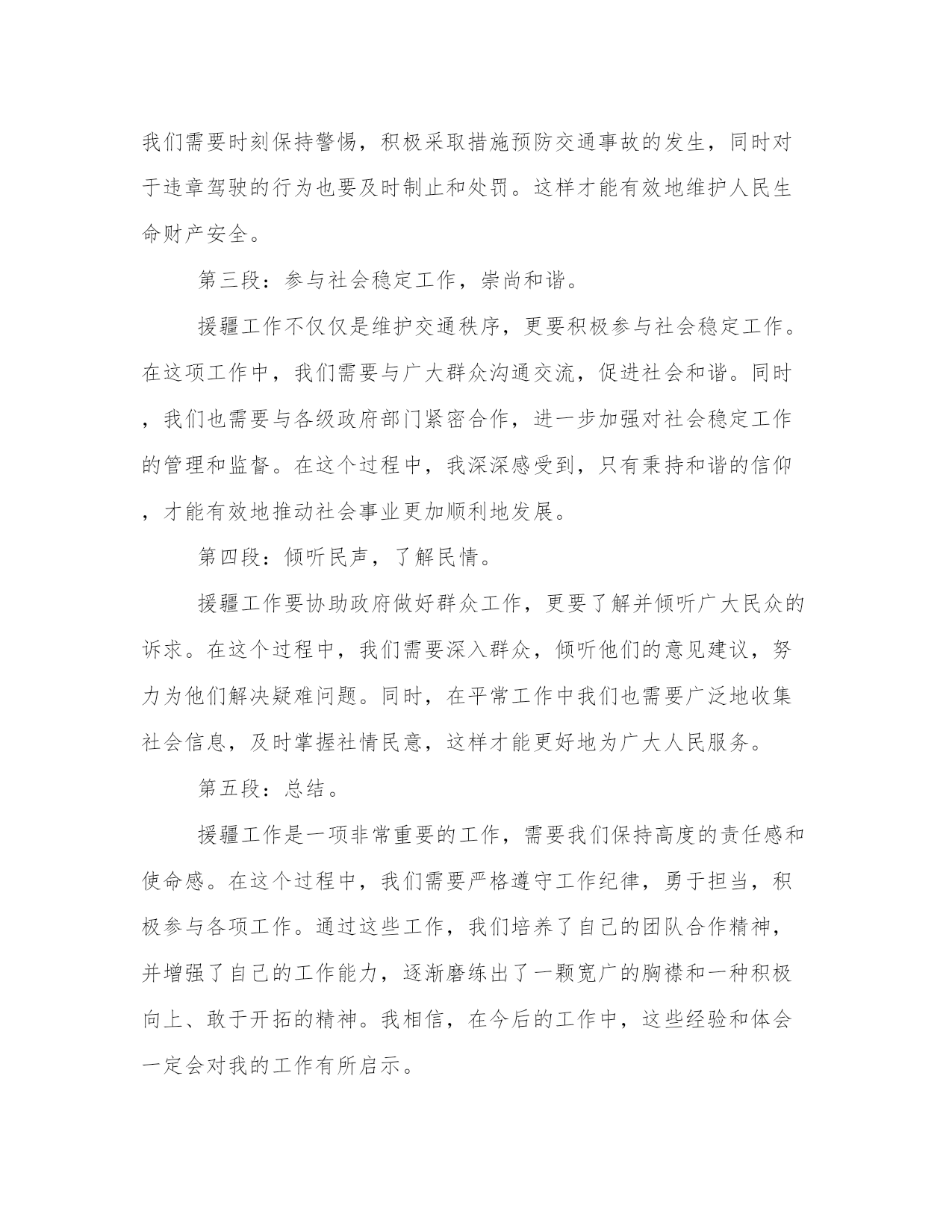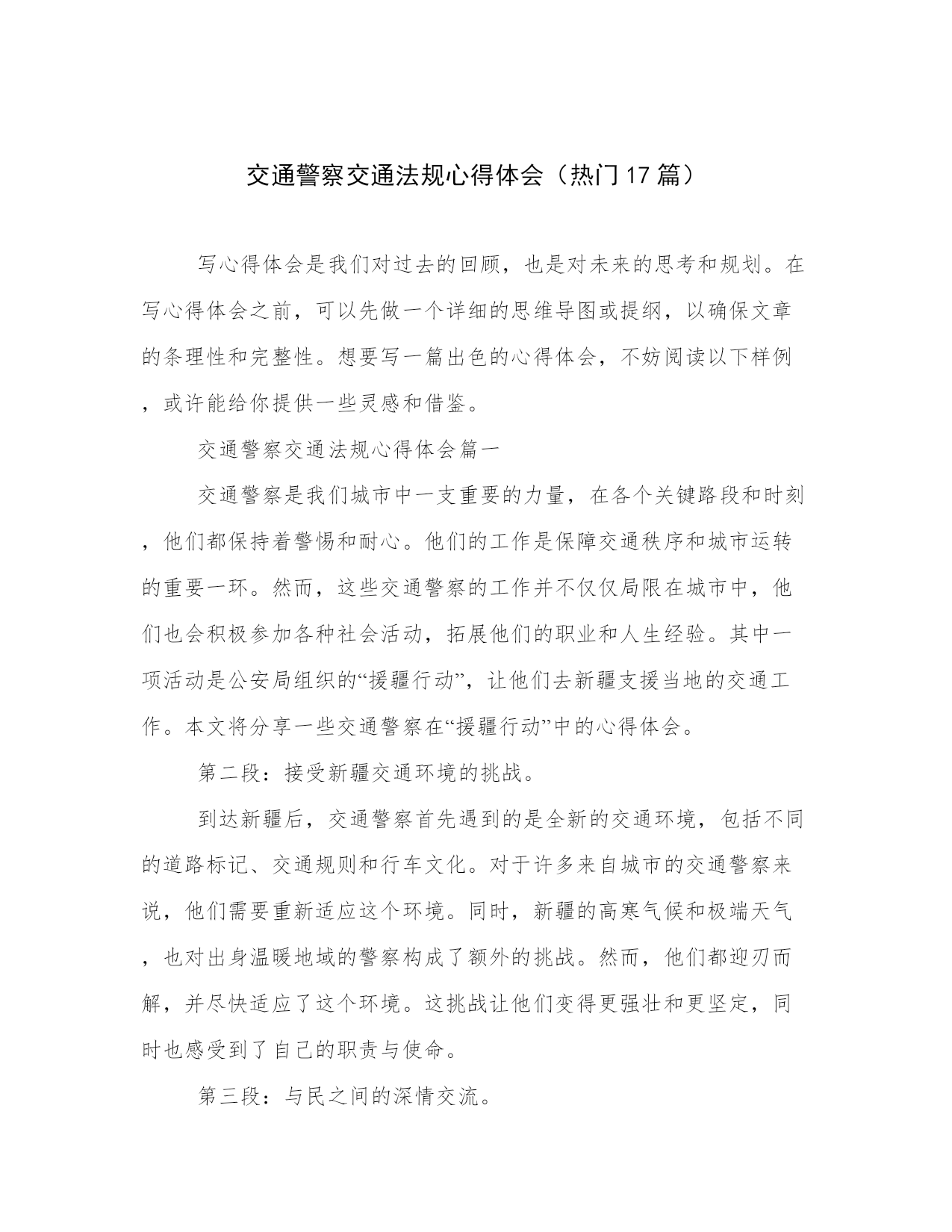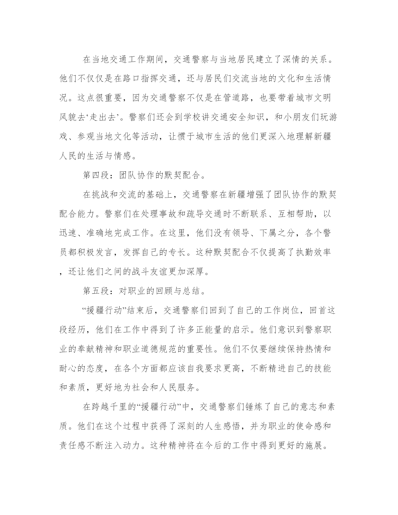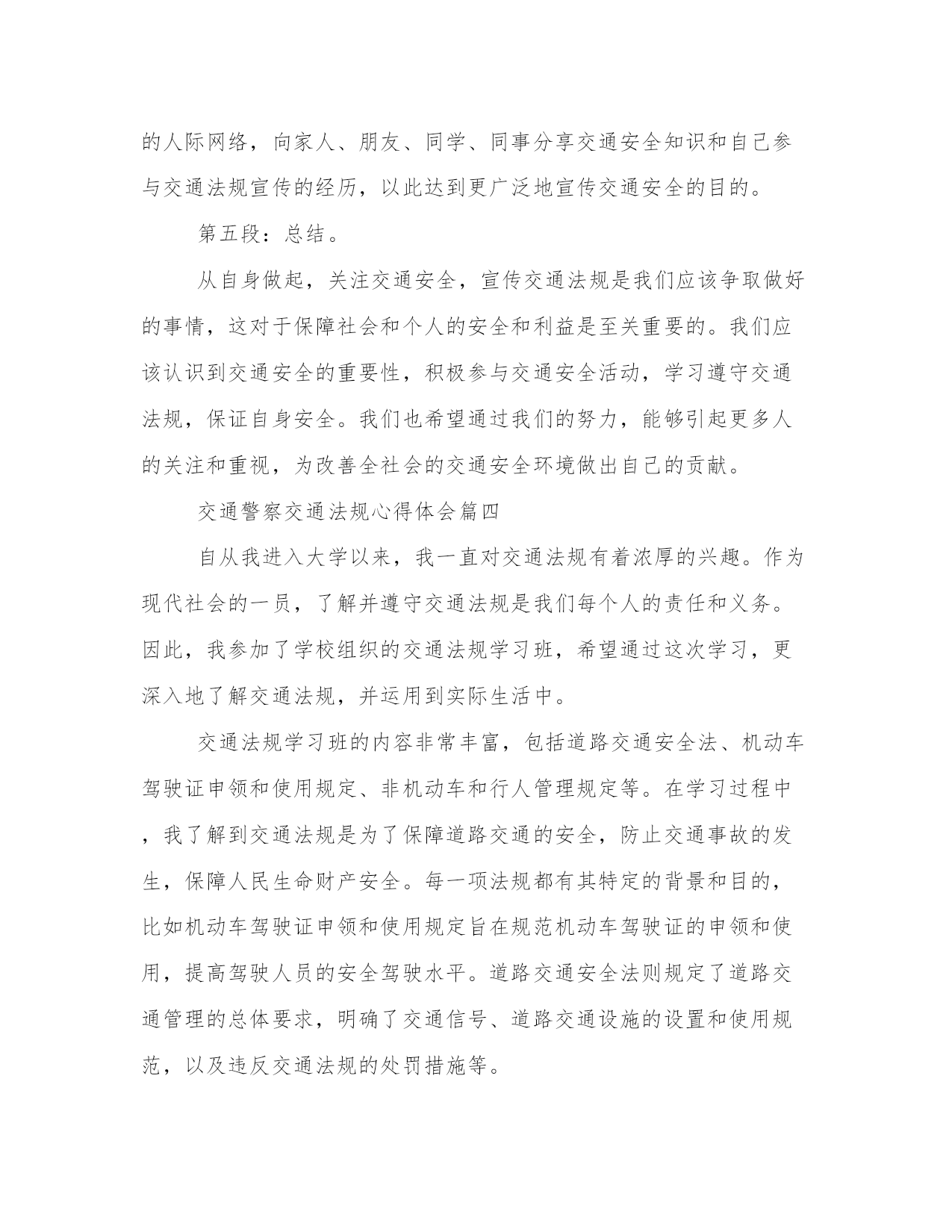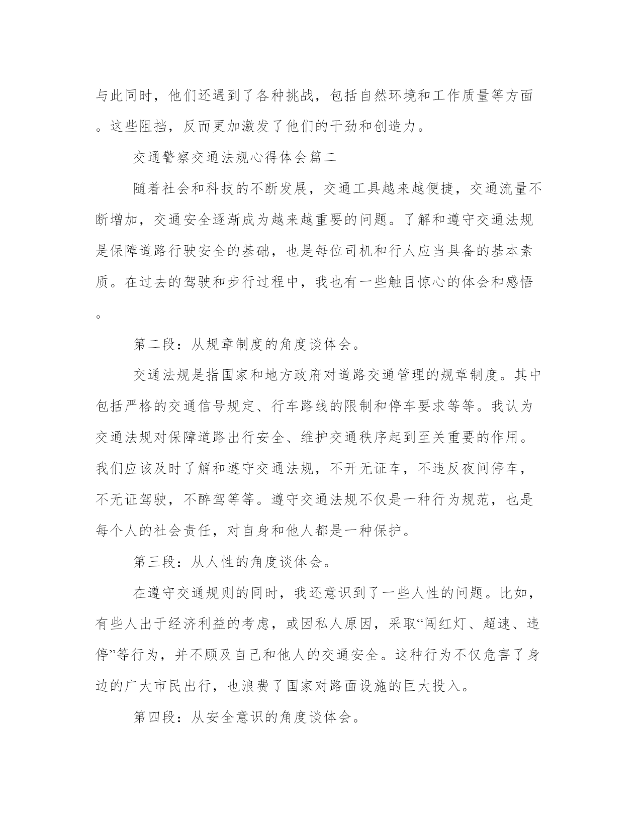 交通警察交通法规心得体会(热门17篇)写心得体会是我们对过去的回顾,也是对未来的思考和规划。在写心得体会之前,可以先做一个详细的思维导图或提纲,以确保文章的条理性和完整性。想要写一篇出色的心得体会,不妨阅读以下样例,或许能给你提供一些灵感和借鉴。交通警察交通法规心得体会篇一交通警察是我们城市中一支重要的力量,在各个关键路段和时刻,他们都保持着警惕和耐心。他们的工作是保障交通秩序和城市运转的重要一环。然而,这些交通警察的工作并不仅仅局限在城市中,他们也会积极参加各种社会活动,拓展他们的职业和人生经验。其中一项活动是公安局组织的“援疆行动”,让他们去新疆支援当地的交通工作。本文将分享一些交通警察在“援疆行动”中的心得体会。第二段:接受新疆交通环境的挑战。到达新疆后,交通警察首先遇到的是全新的交通环境,包括不同的道路标记、交通规则和行车文化。对于许多来自城市的交通警察来说,他们需要重新适应这个环境。同时,新疆的高寒气候和极端天气,也对出身温暖地域的警察构成了额外的挑战。然而,他们都迎刃而解,并尽快适应了这个环境。这挑战让他们变得更强壮和更坚定,同时也感受到了自己的职责与使命。第三段:与民之间的深情交流。在当地交通工作期间,交通警察与当地居民建立了深情的关系。他们不仅仅是在路口指挥交通,还与居民们交流当地的文化和生活情况。这点很重要,因为交通警察不仅是在管道路,也要带着城市文明风貌去‘走出去’。警察们还会到学校讲交通安全知识,和小朋友们玩游戏、参观当地文化等活动,让惯于城市生活的他们更深入地理解新疆人民的生活与情感。第四段:团队协作的默契配合。在挑战和交流的基础上,交通警察在新疆增强了团队协作的默契配合能力。警察们在处理事故和疏导交通时不断联系、互相帮助,以迅速、准确地完成工作。在这里,他们没有领导、下属之分,各个警员都积极发言,发挥自己的专长。这种默契配合不仅提高了执勤效率,还让他们之间的战斗友谊更加深厚。第五段:对职业的回顾与总结。“援疆行动”结束后,交通警察们回到了自己的工作岗位,回首这段经历,他们在工作中得到了许多正能量的启示。他们意识到警察职业的奉献精神和职业道德规范的重要性。他们不仅要继续保持热情和耐心的态度,在各个方面都应该自我要求更高,不断精进自己的技能和素质,更好地为社会和人民服务。在跨越千里的“援疆行动”中,交通警察们锤炼了自己的意志和素质。他们在这个过程中获得了深刻的人生感悟,并为职业的使命感和责任感不断注入动力。这种精神将在今后的工作中得到更好的施展。与此同时,他们还遇到了各种挑战,包括自然环境和工作质量等方面。这些阻挡,反而更加激发了他们的干劲和创造力。交通警察交通法规心得体会篇二随着社会和科技的不断发展,交通工具越来越便捷,交通流量不断增加,交通安全逐渐成为越来越重要的问题。了解和遵守交通法规是保障道路行驶安全的基础,也是每位司机和行人应当具备的基本素质。在过去的驾驶和步行过程中,我也有一些触目惊心的体会和感悟。第二段:从规章制度的角度谈体会。交通法规是指国家和地方政府对道路交通管理的规章制度。其中包括严格的交通信号规定、行车路线的限制和停车要求等等。我认为交通法规对保障道路出行安全、维护交通秩序起到至关重要的作用。我们应该及时了解和遵守交通法规,不开无证车,不违反夜间停车,不无证驾驶,不醉驾等等。遵守交通法规不仅是一种行为规范,也是每个人的社会责任,对自身和他人都是一种保护。第三段:从人性的角度谈体会。在遵守交通规则的同时,我还意识到了一些人性的问题。比如,有些人出于经济利益的考虑,或因私人原因,采取“闯红灯、超速、违停”等行为,并不顾及自己和他人的交通安全。这种行为不仅危害了身边的广大市民出行,也浪费了国家对路面设施的巨大投入。第四段:从安全意识的角度谈体会。在现代社会中,交通安全已经成为每个人不容忽视的重要问题。教育和普及交通安全知识对于公民素质的提高和道路安全的保障,非常必要。行进在马路上不仅要遵守交通规则,还要时刻保持警惕,提高自身的安全意识,多加留意所行驶的路况、天气等因素,比如遇到大雾天气及夜间行车时需要关闭大灯、使用雾灯等等。此外,我们也应该关注、尊重和呵护每一位行人和司机,实现道路安全和谐。第五段:结尾。总之,了解和遵守交通规则是保障交通安全的重要前提。我们应该加强对交通法规的了解和宣传,促进道路交通管理的规范化、科学化和人性化,使其发挥更大的社会效益。人们应该教育和启发年轻人,养成良好的行车和步行习惯,用实际行动践行“以人为本、安全为先”的道路交通管理理念,消除交通事故隐患,为创建和谐文明社会做出积极贡献。交通警察交通法规心得体会篇三交通安全是社会安全的重要组成部分,对于减少交通事故的发生,保障人民生命财产安全具有极其重要的意义。作为一名