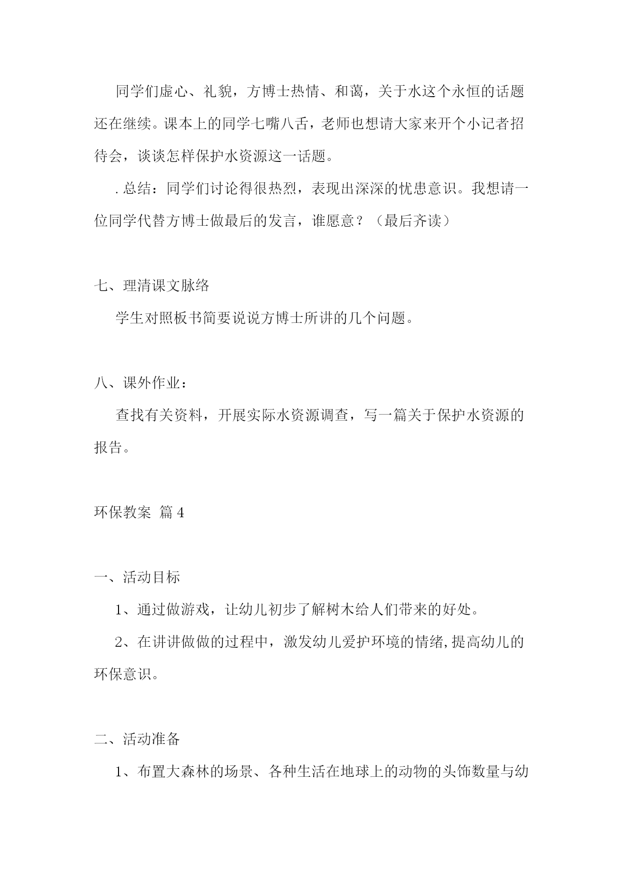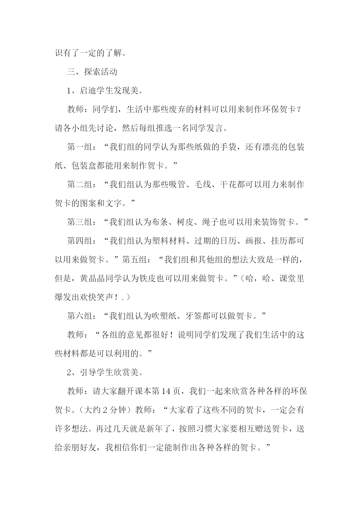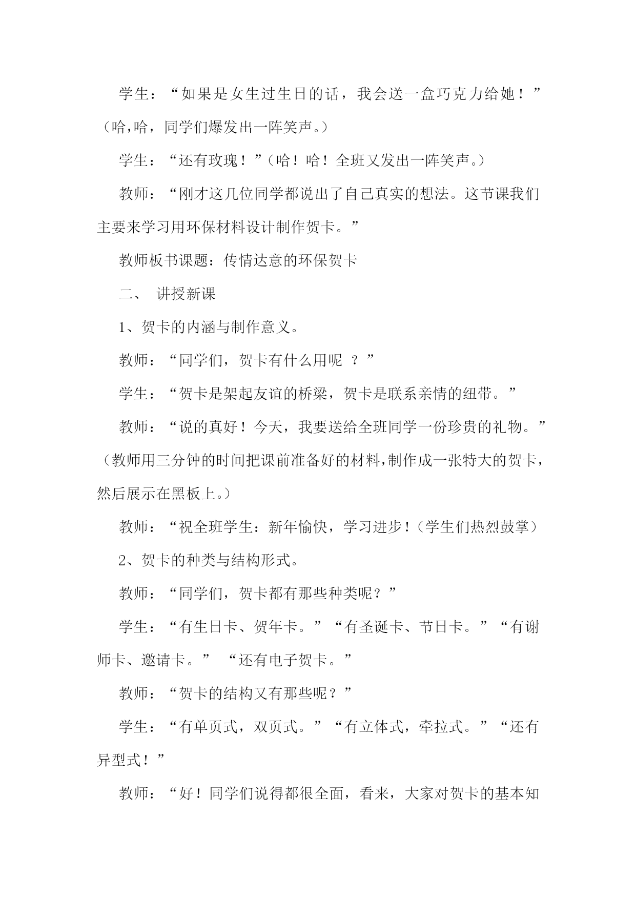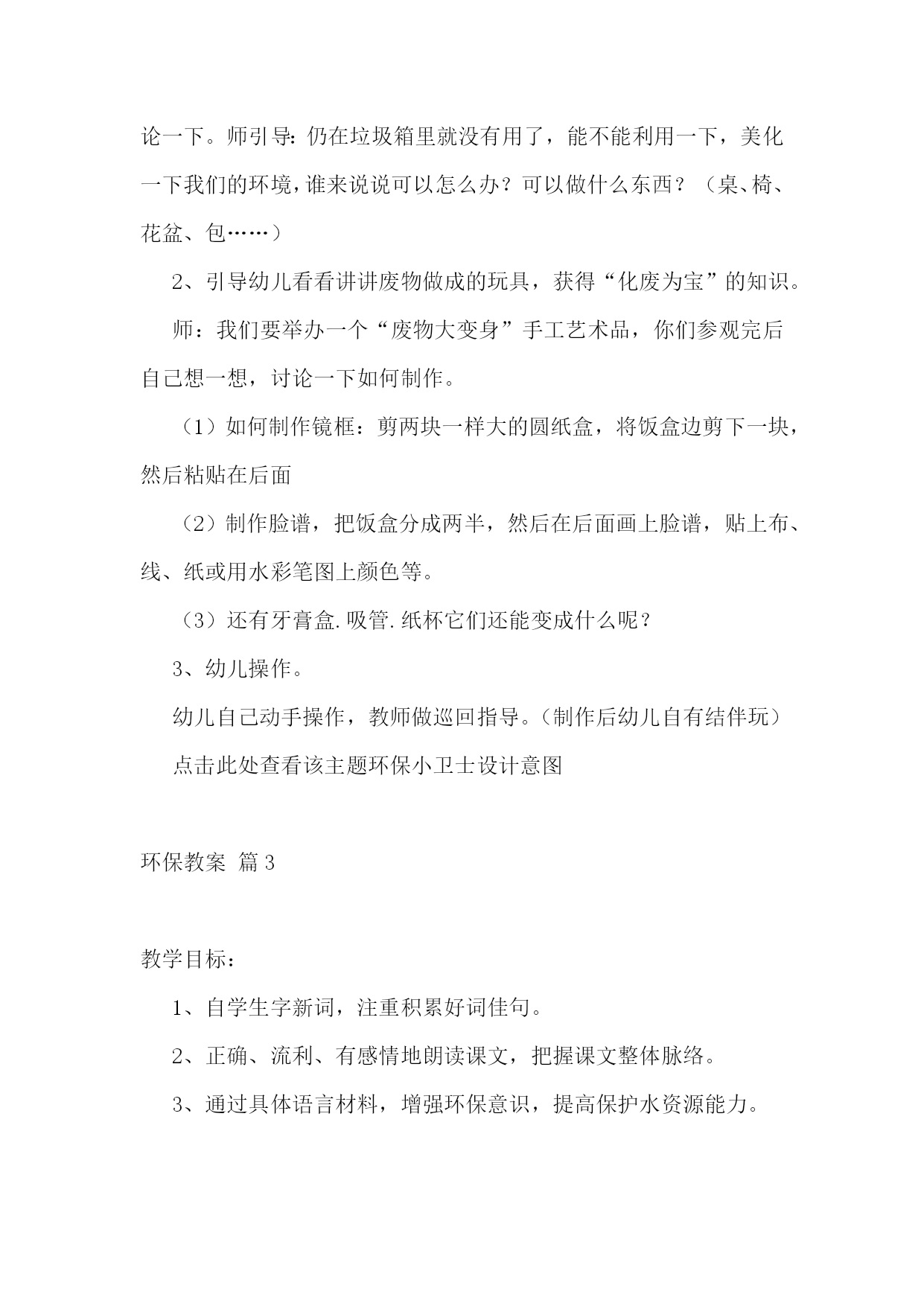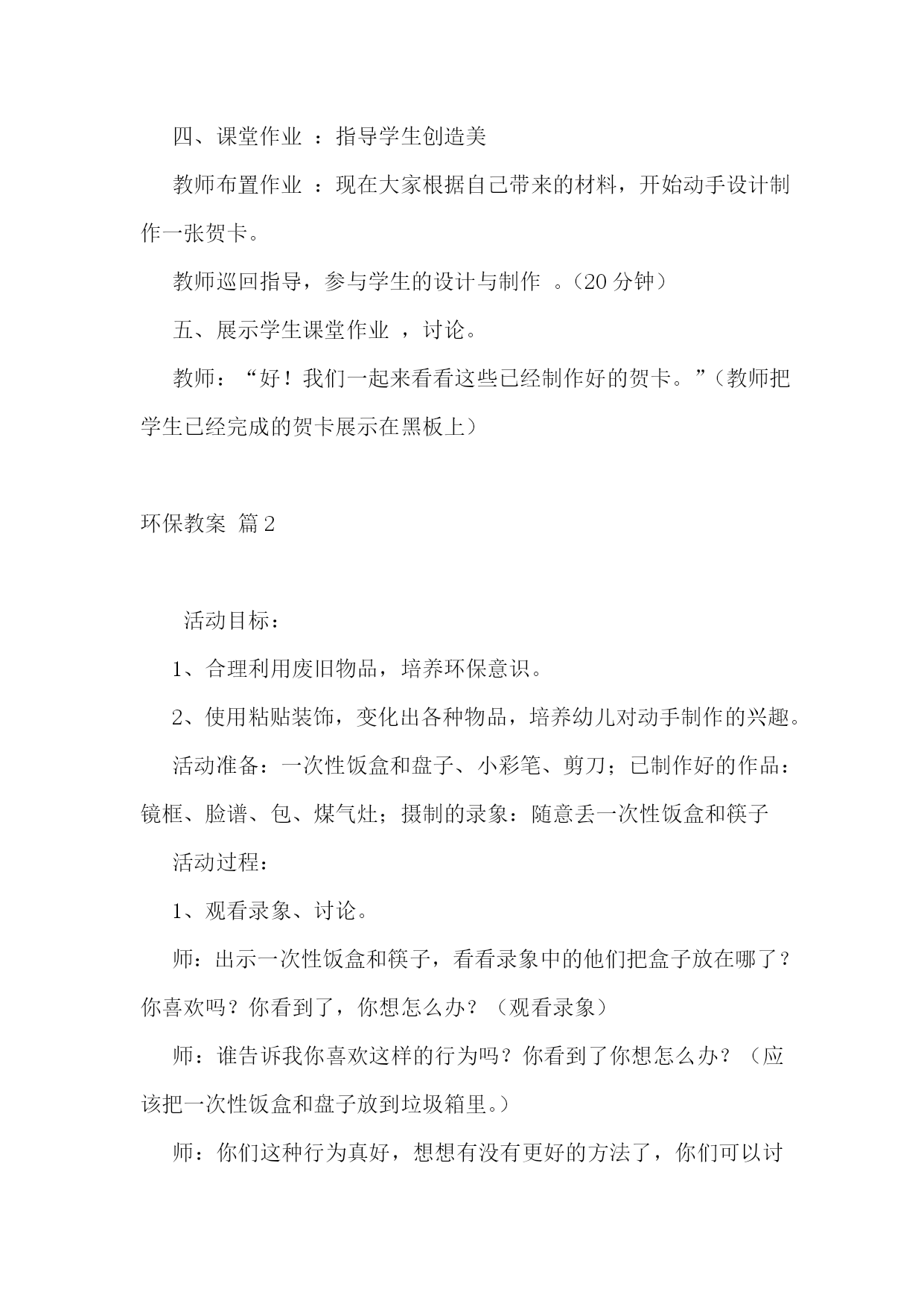 的环保教案范文集合五篇环保教案篇1教学设计:1、教学目的:利用生活中的废弃材料,以多种手法进行设计制作,激发学生的创造灵感,锻炼他们的动手能力。2、教学目标:以亲情、友情、师生情为主题,用环保材料设计制作一张。3、课时安排:1课时。教学准备:学生:要求学生课前积极收集废弃环保材料,准备铅笔、剪刀、颜料、彩色笔等。教师:教师课前准备几张贺卡实物。教学重点:创设课堂人际交往的活动环境,启发学生的创造力和环保意识。教师:“我认为这些贺卡都很有特色。从结构来看:有单页式,双页式,牵拉式,还有立体式和异型式;从材料上来看:有吸管做的,有的用毛线制作的,还有的用包装盒制作的。你们也来评一评,最好能发表不同的看法。”学生:“我觉得这些同学做的贺卡都比我做的好,特别是这张立体圣诞卡,很漂亮,圣诞老人很可爱!我很喜欢!”学生:“我比较喜欢觉这张贺卡,它很有中国特色:新年快乐这四个字很符合我们青少年的特点,活泼可爱,画面上的学生手拿着气球,表现出了节日的气氛。”学生:“我认为这张新年贺卡很有中国特色,调皮的猴子十分可爱!”教学难点:贺卡的结构形式。教学评价1、学生能用身边找到的各种材料,制作设计,装饰贺卡。2、能否在设计应用中表现出创意。3、学生是否用口头语言对自己和对同学的作业进行评价。教学过程:一、课题导入1、教师书写“人”字,再添加几笔变成“美”字。教师提问:“同学们,你们平时主要用哪些美好的方式进行人与人之间的交往呢?”学生:“当朋友过生日时,我会买一个精美的礼物送给他!”学生:“我除了买一份礼物外,还会送给他一张贺卡!”学生:“如果是女生过生日的话,我会送一盒巧克力给她!”(哈,哈,同学们爆发出一阵笑声。)学生:“还有玫瑰!”(哈!哈!全班又发出一阵笑声。)教师:“刚才这几位同学都说出了自己真实的想法。这节课我们主要来学习用环保材料设计制作贺卡。”教师板书课题:传情达意的环保贺卡二、讲授新课1、贺卡的内涵与制作意义。教师:“同学们,贺卡有什么用呢?”学生:“贺卡是架起友谊的桥梁,贺卡是联系亲情的纽带。”教师:“说的真好!今天,我要送给全班同学一份珍贵的礼物。”(教师用三分钟的时间把课前准备好的材料,制作成一张特大的贺卡,然后展示在黑板上。)教师:“祝全班学生:新年愉快,学习进步!(学生们热烈鼓掌)2、贺卡的种类与结构形式。教师:“同学们,贺卡都有那些种类呢?”学生:“有生日卡、贺年卡。”“有圣诞卡、节日卡。”“有谢师卡、邀请卡。”“还有电子贺卡。”教师:“贺卡的结构又有那些呢?”学生:“有单页式,双页式。”“有立体式,牵拉式。”“还有异型式!”教师:“好!同学们说得都很全面,看来,大家对贺卡的基本知识有了一定的了解。三、探索活动1、启迪学生发现美。教师:同学们,生活中那些废弃的材料可以用来制作环保贺卡?请各小组先讨论,然后每组推选一名同学发言。第一组:“我们组的同学认为那些纸做的手袋,还有漂亮的包装纸、包装盒都能用来制作贺卡。”第二组:“我们组认为那些吸管、毛线、干花都可以用力来制作贺卡的图案和文字。”第三组:“我们组认为布条、树皮、绳子也可以用来装饰贺卡。”第四组:“我们组认为塑料材料、过期的日历、画报、挂历都可以用来做贺卡。”第五组:“我们组和其他组的想法大致是一样的,但是,黄晶晶同学认为铁皮也可以用来做贺卡。”(哈,哈、课堂里爆发出欢快笑声!.)第六组:“我们组认为吹塑纸、牙签都可以做贺卡。”教师:“各组的意见都很好!说明同学们发现了我们生活中的这些材料都是可以利用的。”2、引导学生欣赏美。教师:请大家翻开课本,我们一起来欣赏各种各样的环保贺卡。(大约2分钟)教师:“大家看了这些不同的贺卡,一定会有许多想法。再过几天就是新年了,按照习惯大家要相互赠送贺卡,送给亲朋好友,我相信你们一定能制作出各种各样的贺卡。”四、课堂作业:指导学生创造美教师布置作业:现在大家根据自己带来的材料,开始动手设计制作一张贺卡。教师巡回指导,参与学生的设计与制作。(20分钟)五、展示学生课堂作业,讨论。教师:“好!我们一起来看看这些已经制作好的贺卡。”(教师把学生已经完成的贺卡展示在黑板上)环保教案篇2活动目标:1、合理利用废旧物品,培养环保意识。2、使用粘贴装饰,变化出各种物品,培养幼儿对动手制作的兴趣。活动准备:一次性饭盒和盘子、小彩笔、剪刀;已制作好的作品:镜框、脸谱、包、煤气灶;摄制的录象:随意丢一次性饭盒和筷子活动过程:1、观看录象、讨论。师:出示一次性饭盒和筷子,看看录象中的他们把盒子放在哪了?你喜欢吗?你看到了,你想怎么办?(观看录象)师:谁告诉我你喜欢这样的行为吗?你看到了你想怎么办?(应该把