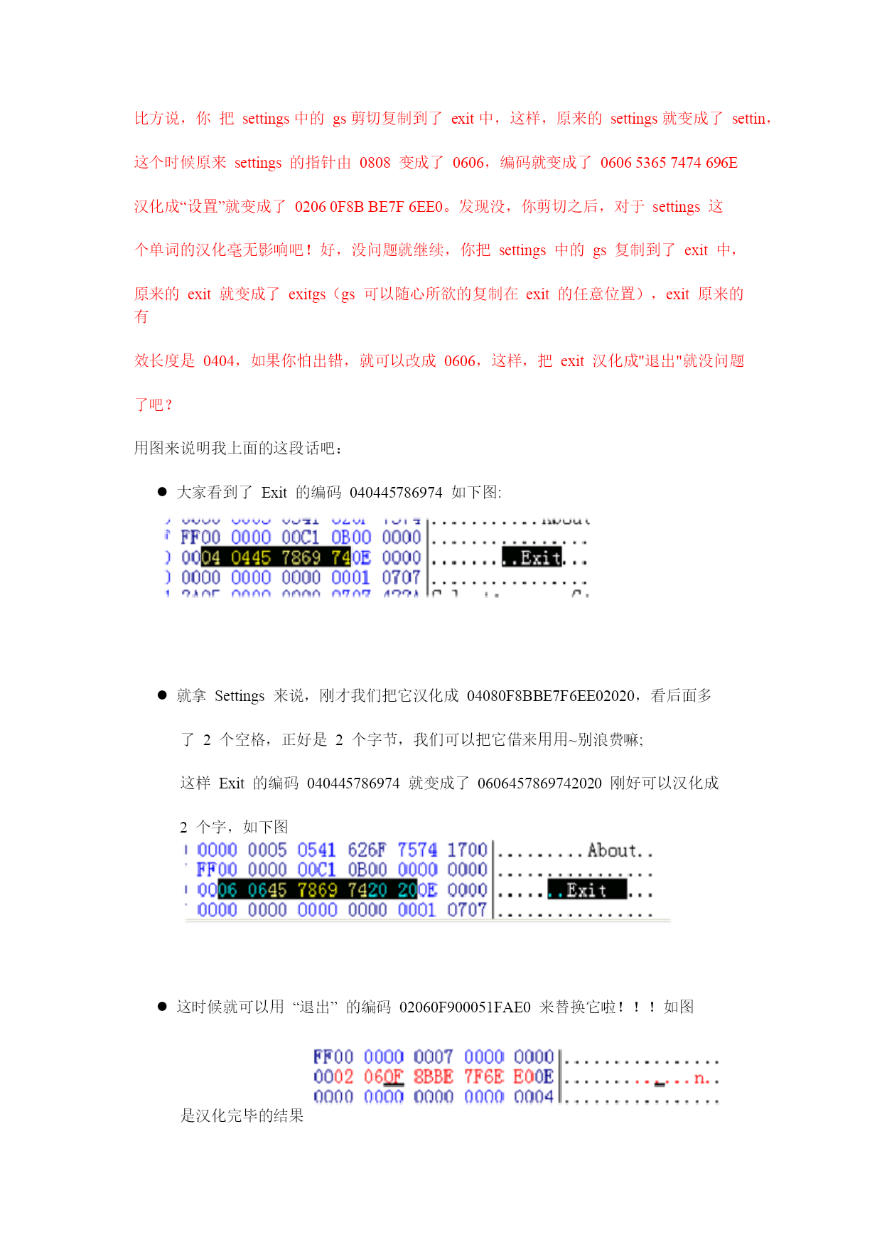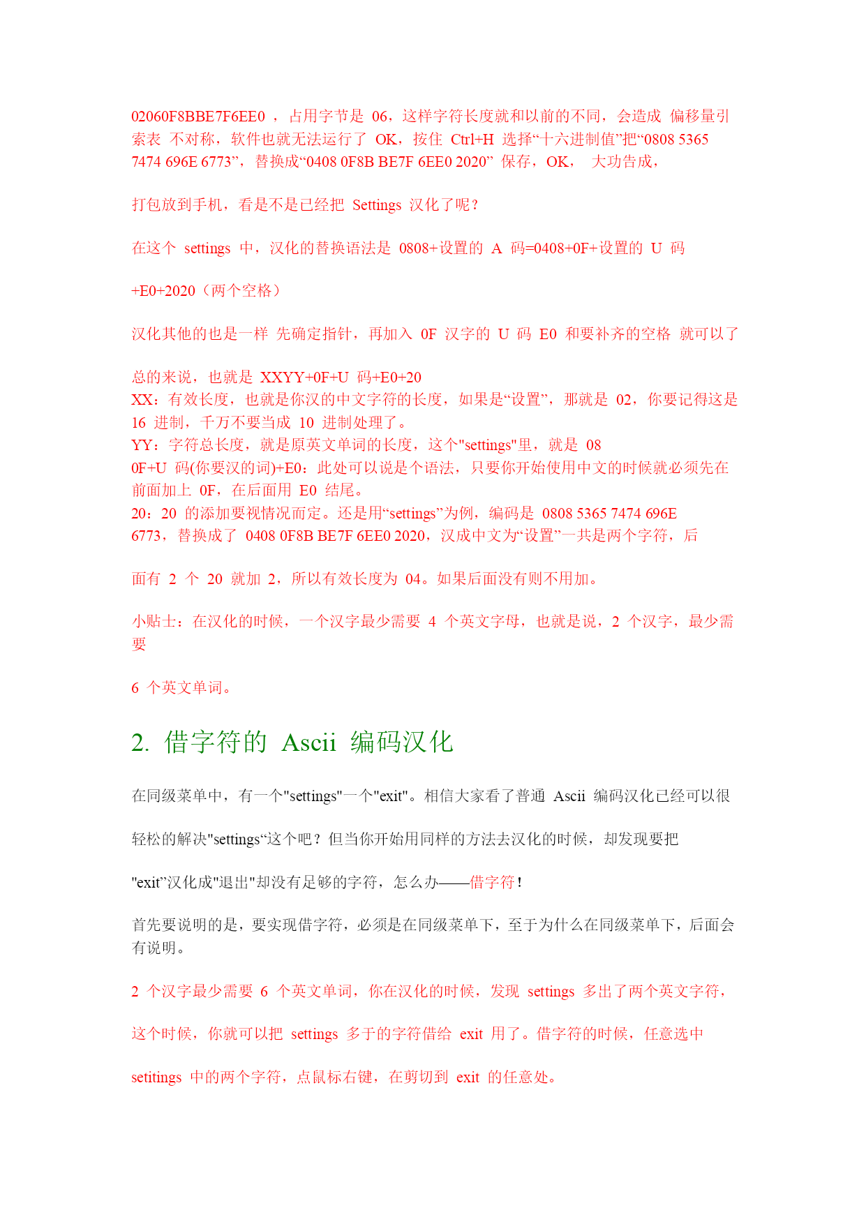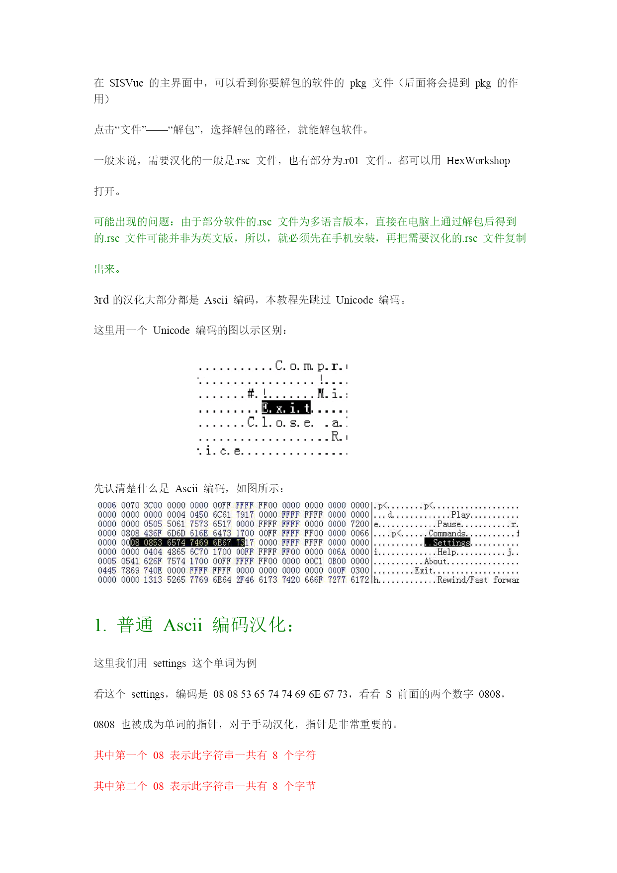 Symbian3rd汉化教程Cnpda汉化组Flox出品www.cnpda.com.cn写在前面的:其实汉化不是一个技术活,只要你有点耐心,只要你对英文掌握还可以,其实就能够汉化一个很不错的作品。请你不要认为汉化只是简单的查找替换,只要你用心,汉化作品同样可以很有艺术性。教程一共分为两个部分,第一个部分为手动汉化部分,第二个部分为工具汉化部分。如果你只想尽快的看到自己的汉化作品,请跳过第一部分,但是,你将体会不到手动汉化的乐趣。只要你掌握了手动汉化的方法,任何软件都难不倒你阅读本教程你必须了解的一些东西:1.第三版和第二版不同,所以解包和打包工具不同。不可以用第二版的解包工具去解包第三版的软件。2.第三版汉化基本上只是Ascii编码的汉化,所以本文着重介绍A码汉化3.第三版部分资源存在于exe中,无法直接汉化,必须脱壳汉化再加壳,后面会具体说明,并提供脱壳工具下载。汉化工具:1.Hexworkshop——手动汉化手机软件的工具2.中英文字符编码——用来查询中文字符的Ascii代码3.ExeUnCompres——Ganthur写的exe脱壳工具Part1:手动汉化教程对于汉化,你必须有一个感性的认识,那就是解包——汉化——再打包的过程。所以,你想要汉化软件,第一个步骤就是解包软件。现在解包一般是使用专门的解包工具,如:SISware,SISVue等由于SISware在部分电脑上无法运行,这里用SISVue这款小巧的解包工具做例子。SISVue主界面如图所示:打开一个3rd的软件后,如图所示:在SISVue的主界面中,可以看到你要解包的软件的pkg文件(后面将会提到pkg的作用)点击“文件”——“解包”,选择解包的路径,就能解包软件。一般来说,需要汉化的一般是.rsc文件,也有部分为.r01文件。都可以用HexWorkshop打开。可能出现的问题:由于部分软件的.rsc文件为多语言版本,直接在电脑上通过解包后得到的.rsc文件可能并非为英文版,所以,就必须先在手机安装,再把需要汉化的.rsc文件复制出来。3rd的汉化大部分都是Ascii编码,本教程先跳过Unicode编码。这里用一个Unicode编码的图以示区别:先认清楚什么是Ascii编码,如图所示:1.普通Ascii编码汉化:这里我们用settings这个单词为例看这个settings,编码是080853657474696E6773,看看S前面的两个数字0808,0808也被成为单词的指针,对于手动汉化,指针是非常重要的。其中第一个08表示此字符串一共有8个字符其中第二个08表示此字符串一共有8个字节其中第三个53在ASCII码中表示英文字母“s”其中第三个65在ASCII码中表示英文字母“e”其中第三个74在ASCII码中表示英文字母“t”0808就是是这个单词的指针,第一个08是有效长度,第2个08是字符的总长度,A码中一个字母代表占用一个字符长度,同时占用一个字节,这个单词一共有八个字母,所以有效长度,也就是字符长度为08,同时每个字母占一个字节,所以字符总长度也就是占用的字节数为08现在用Hexworkshop打开需要汉化的.rsc文件,(你要明白汉化的过程就是查找和替换,虽然有点繁琐)。按快捷键Ctrl+H,切换出替换的界面。替换类型选择“十六进制值”如图所示:现在打开中英文字符编码查询设置为Unicode码,以及十六进制,在字符框中输入“设置”,得到的编码为8BBE7F6E,这个就是设置的U码字符了,我们就是要利用这个编码把“Settings”汉化成“设置”那么我们来看看,汉化的构成,前面说过了,A码字符占用一个字节,但是U码占用两个字节,所以指针就大不相同了,“04080F8BBE7F6EE02020”这个就是用来替换Settings编码的新编码了,我们来解读一下,“04”,是有效长度,“08”是字符总长度(这里讲一下为什么是0408,04代表这个编码的有效长度,也就是要体现出来的字符,在这个例子中,只有“8BBE7F6E”设置的U码以及“2个20”需要体现出来,而0F和E0仅是语法用语,是不做体现的,设置占2个,20占一个,2020就占2个了,所以有效长度为04,08代表的是字符总长度,也就是占用的字节数,我们已经知道,U码是占用2个字节,所以“8BBE7F6E”设置的U码占用4个字节,一个字2个字节,0F和E0各占用一个字节,20占用一个字节,2020就占用2个字节,所以一共是4+1+1+2=8表示为08)“0F”代表以后的字符为“U码”,“8BBE7F6E”这个就是“设置”的U码字符了,“E0”代表U码结束或以前的为U码,最后的2020代表的是2个空格,为