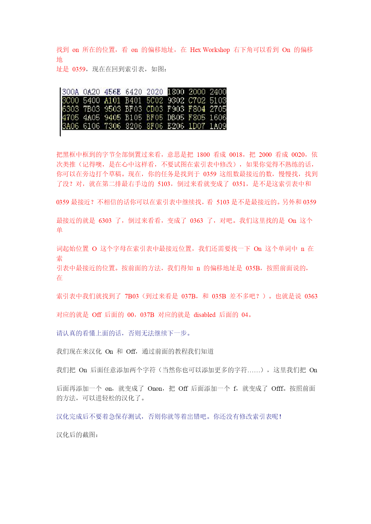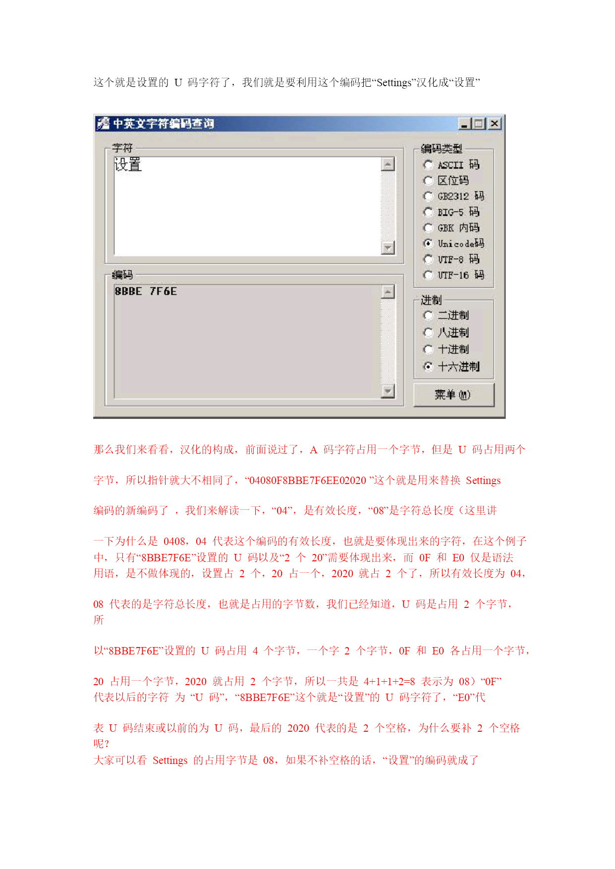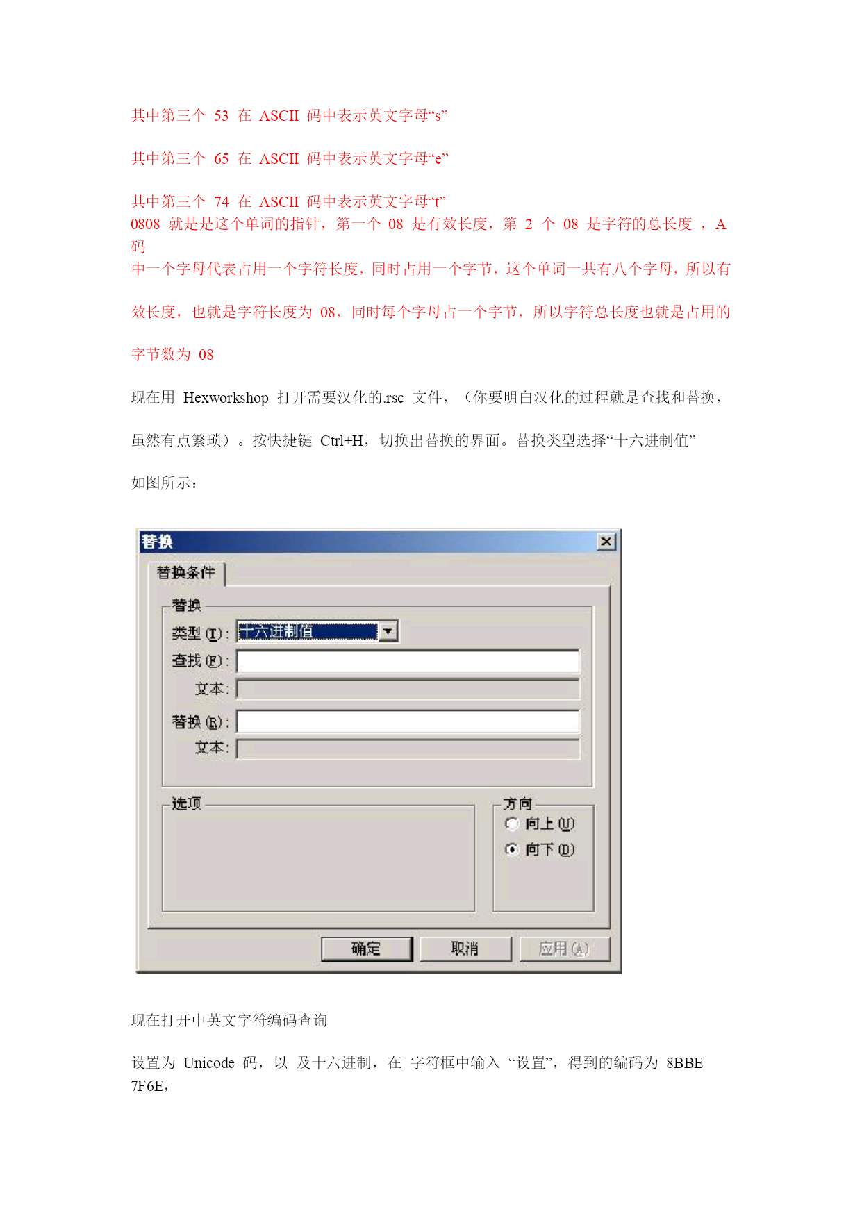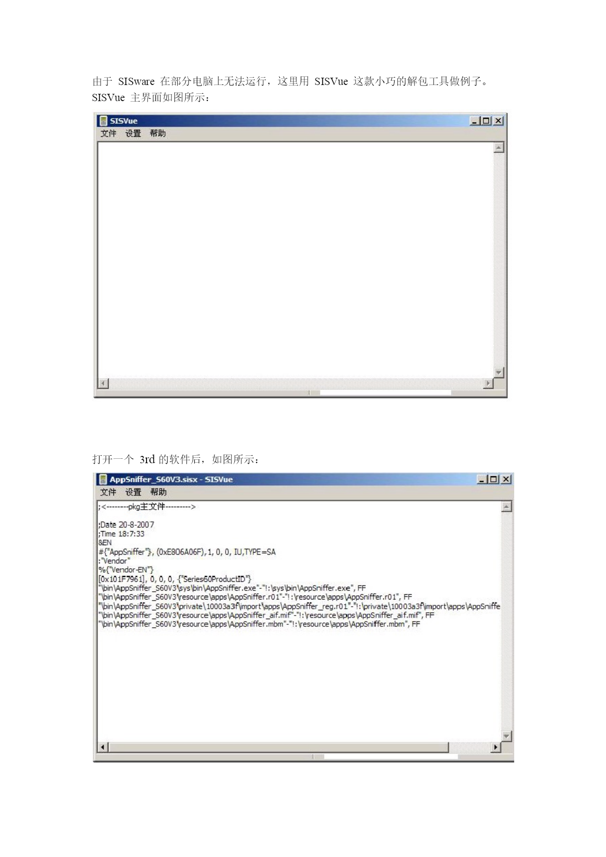 Symbian3rd汉化教程Cnpda汉化组Flox出品www.cnpda.com.cn写在前面的:其实汉化不是一个技术活,只要你有点耐心,只要你对英文掌握还可以,其实就能够汉化一个很不错的作品。请你不要认为汉化只是简单的查找替换,只要你用心,汉化作品同样可以很有艺术性。教程一共分为两个部分,第一个部分为手动汉化部分,第二个部分为工具汉化部分。如果你只想尽快的看到自己的汉化作品,请跳过第一部分,但是,你将体会不到手动汉化的乐趣。只要你掌握了手动汉化的方法,任何软件都难不倒你阅读本教程你必须了解的一些东西:1.第三版和第二版不同,所以解包和打包工具不同。不可以用第二版的解包工具去解包第三版的软件。2.第三版汉化基本上只是Ascii编码的汉化,所以本文着重介绍A码汉化3.第三版部分资源存在于exe中,无法直接汉化,必须脱壳汉化再加壳,后面会具体说明,并提供脱壳工具下载。汉化工具:1.Hexworkshop——手动汉化手机软件的工具2.中英文字符编码——用来查询中文字符的Ascii代码3.ExeUnCompres——Ganthur写的exe脱壳工具Part1:手动汉化教程对于汉化,你必须有一个感性的认识,那就是解包——汉化——再打包的过程。所以,你想要汉化软件,第一个步骤就是解包软件。现在解包一般是使用专门的解包工具,如:SISware,SISVue等由于SISware在部分电脑上无法运行,这里用SISVue这款小巧的解包工具做例子。SISVue主界面如图所示:打开一个3rd的软件后,如图所示:在SISVue的主界面中,可以看到你要解包的软件的pkg文件(后面将会提到pkg的作用)点击“文件”——“解包”,选择解包的路径,就能解包软件。一般来说,需要汉化的一般是.rsc文件,也有部分为.r01文件。都可以用HexWorkshop打开。可能出现的问题:由于部分软件的.rsc文件为多语言版本,直接在电脑上通过解包后得到的.rsc文件可能并非为英文版,所以,就必须先在手机安装,再把需要汉化的.rsc文件复制出来。3rd的汉化大部分都是Ascii编码,本教程先跳过Unicode编码。这里用一个Unicode编码的图以示区别:先认清楚什么是Ascii编码,如图所示:1.普通Ascii编码汉化:这里我们用settings这个单词为例看这个settings,编码是080853657474696E6773,看看S前面的两个数字0808,0808也被成为单词的指针,对于手动汉化,指针是非常重要的。其中第一个08表示此字符串一共有8个字符其中第二个08表示此字符串一共有8个字节其中第三个53在ASCII码中表示英文字母“s”其中第三个65在ASCII码中表示英文字母“e”其中第三个74在ASCII码中表示英文字母“t”0808就是是这个单词的指针,第一个08是有效长度,第2个08是字符的总长度,A码中一个字母代表占用一个字符长度,同时占用一个字节,这个单词一共有八个字母,所以有效长度,也就是字符长度为08,同时每个字母占一个字节,所以字符总长度也就是占用的字节数为08现在用Hexworkshop打开需要汉化的.rsc文件,(你要明白汉化的过程就是查找和替换,虽然有点繁琐)。按快捷键Ctrl+H,切换出替换的界面。替换类型选择“十六进制值”如图所示:现在打开中英文字符编码查询设置为Unicode码,以及十六进制,在字符框中输入“设置”,得到的编码为8BBE7F6E,这个就是设置的U码字符了,我们就是要利用这个编码把“Settings”汉化成“设置”那么我们来看看,汉化的构成,前面说过了,A码字符占用一个字节,但是U码占用两个字节,所以指针就大不相同了,“04080F8BBE7F6EE02020”这个就是用来替换Settings编码的新编码了,我们来解读一下,“04”,是有效长度,“08”是字符总长度(这里讲一下为什么是0408,04代表这个编码的有效长度,也就是要体现出来的字符,在这个例子中,只有“8BBE7F6E”设置的U码以及“2个20”需要体现出来,而0F和E0仅是语法用语,是不做体现的,设置占2个,20占一个,2020就占2个了,所以有效长度为04,08代表的是字符总长度,也就是占用的字节数,我们已经知道,U码是占用2个字节,所以“8BBE7F6E”设置的U码占用4个字节,一个字2个字节,0F和E0各占用一个字节,20占用一个字节,2020就占用2个字节,所以一共是4+1+1+2=8表示为08)“0F”代表以后的字符为“U码”,“8BBE7F6E”这个就是“设置”的U码字符了,“E0”代表U码结束或以前的为U码,最后的2020代表的是2个空格,为