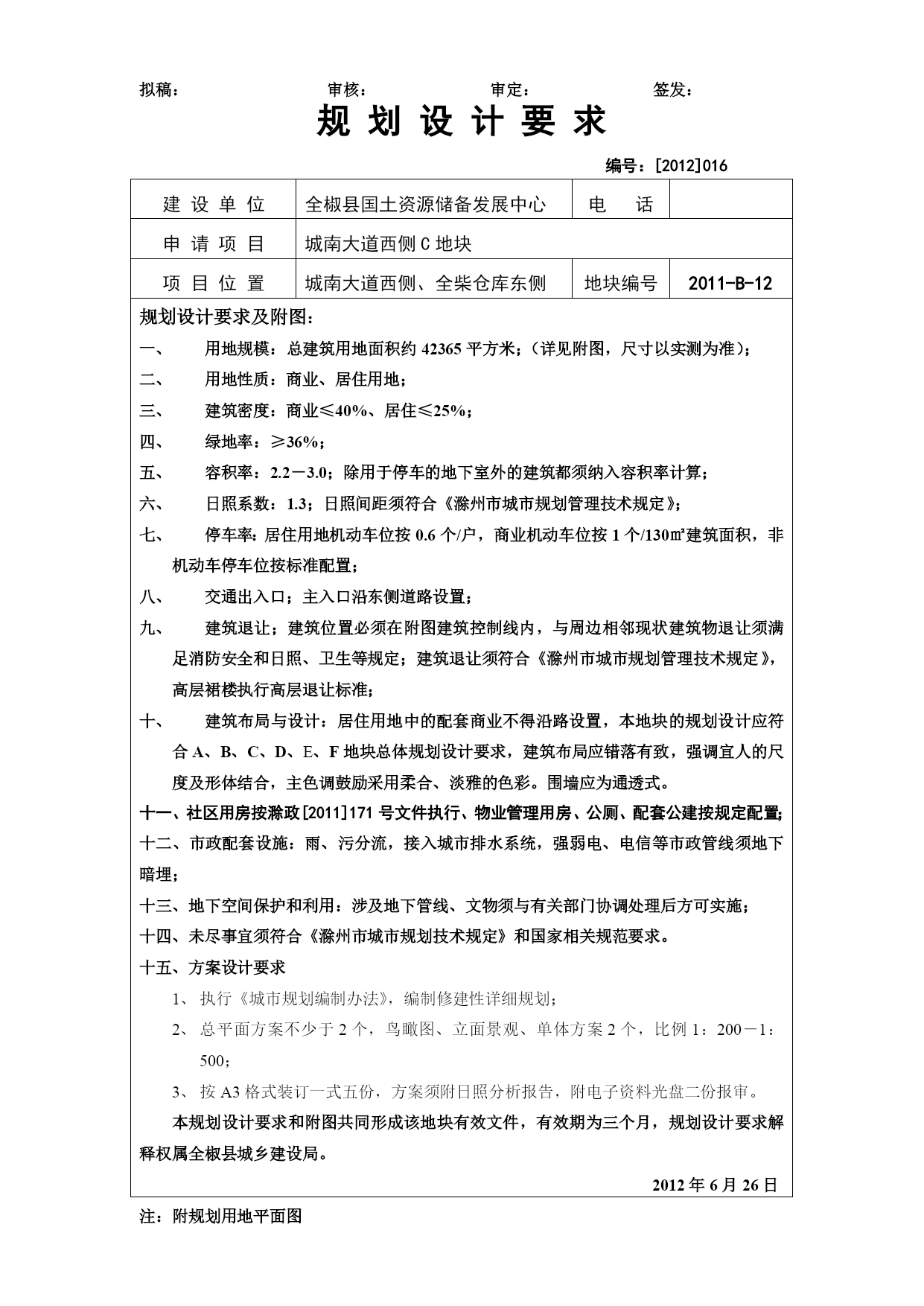 规划设计要求编号:[2012]014建设单位全椒县国土资源储备发展中心电话申请项目城南大道西侧A地块项目位置城南大道西侧、全柴仓库东侧地块编号2012-B-10规划设计要求及附图:一、用地规模:总建筑用地面积约36836平方米;(详见附图,尺寸以实测为准);二、用地性质:商业、居住用地;三、建筑密度:商业≤40%、居住≤25%;四、绿地率:≥36%;五、容积率:2.2-3.0;除用于停车的地下室外的建筑都须纳入容积率计算;六、日照系数:1.3;日照间距须符合《滁州市城市规划管理技术规定》;七、停车率:居住用地机动车位按0.6个/户,商业机动车位按1个/130㎡建筑面积,非机动车停车位按标准配置;八、交通出入口;主入口沿北侧道路设置;九、建筑退让;建筑位置必须在附图建筑控制线内,与周边相邻现状建筑物退让须满足消防安全和日照、卫生等规定;建筑退让须符合《滁州市城市规划管理技术规定》,高层裙楼执行高层退让标准;十、建筑布局与设计:居住用地中的配套商业不得沿路设置,本地块的规划设计应符合A、B、C、D、E、F地块总体规划设计要求,建筑布局应错落有致,强调宜人的尺度及形体结合,主色调鼓励采用柔合、淡雅的色彩。围墙应为通透式。十一、社区用房按滁政[2011]171号文件执行、物业管理用房、公厕、配套公建按规定配置;十二、市政配套设施:雨、污分流,接入城市排水系统,强弱电、电信等市政管线须地下暗埋;十三、地下空间保护和利用:涉及地下管线、文物须与有关部门协调处理后方可实施;十四、未尽事宜须符合《滁州市城市规划技术规定》和国家相关规范要求。十五、方案设计要求执行《城市规划编制办法》,编制修建性详细规划;总平面方案不少于2个,鸟瞰图、立面景观、单体方案2个,比例1:200-1:500;按A3格式装订一式五份,方案须附日照分析报告,附电子资料光盘二份报审。本规划设计要求和附图共同形成该地块有效文件,有效期为三个月,规划设计要求解释权属全椒县城乡建设局。2012年6月26日注:附规划用地平面图拟稿:审核:审定:签发:规划设计要求编号:[2012]015建设单位全椒县国土资源储备发展中心电话申请项目城南大道西侧B地块项目位置城南大道西侧、全柴仓库东侧地块编号2012-B-11规划设计要求及附图:用地规模:总建筑用地面积约22047平方米;(详见附图,尺寸以实测为准);用地性质:商业、居住用地;建筑密度:商业≤40%、居住≤25%;绿地率:≥36%;容积率:2.2-3.0;除用于停车的地下室外的建筑都须纳入容积率计算;日照系数:1.3;日照间距须符合《滁州市城市规划管理技术规定》;停车率:居住用地机动车位按0.6个/户,商业机动车位按1个/130㎡建筑面积,非机动车停车位按标准配置;交通出入口;主入口沿东侧道路设置;建筑退让;建筑位置必须在附图建筑控制线内,与周边相邻现状建筑物退让须满足消防安全和日照、卫生等规定;建筑退让须符合《滁州市城市规划管理技术规定》,高层裙楼执行高层退让标准;建筑布局与设计:居住用地中的配套商业不得沿路设置,本地块的规划设计应符合A、B、C、D、E、F地块总体规划设计要求,建筑布局应错落有致,强调宜人的尺度及形体结合,主色调鼓励采用柔合、淡雅的色彩。围墙应为通透式。十一、社区用房按滁政[2011]171号文件执行、物业管理用房、公厕、配套公建按规定配置;十二、市政配套设施:雨、污分流,接入城市排水系统,强弱电、电信等市政管线须地下暗埋;十三、地下空间保护和利用:涉及地下管线、文物须与有关部门协调处理后方可实施;十四、未尽事宜须符合《滁州市城市规划技术规定》和国家相关规范要求。十五、方案设计要求执行《城市规划编制办法》,编制修建性详细规划;总平面方案不少于2个,鸟瞰图、立面景观、单体方案2个,比例1:200-1:500;按A3格式装订一式五份,方案须附日照分析报告,附电子资料光盘二份报审。本规划设计要求和附图共同形成该地块有效文件,有效期为三个月,规划设计要求解释权属全椒县城乡建设局。2012年6月26日注:附规划用地平面图拟稿:审核:审定:签发:规划设计要求编号:[2012]016建设单位全椒县国土资源储备发展中心电话申请项目城南大道西侧C地块项目位置城南大道西侧、全柴仓库东侧地块编号2011-B-12规划设计要求及附图:用地规模:总建筑用地面积约42365平方米;(详见附图,尺寸以实测为准);用地性质:商业、居住用地;建筑密度:商业≤40%、居住≤25%;绿地率:≥36%;容积率:2.2-3.0;除用于停车的地下室外的建筑都须纳入容积率计算;日照系数:1.3;日照间距须符合《滁州市城市规划管理技术规定》;停车