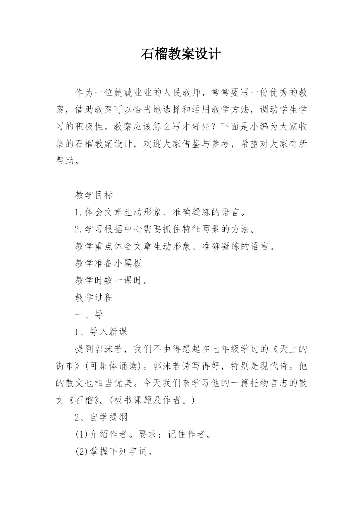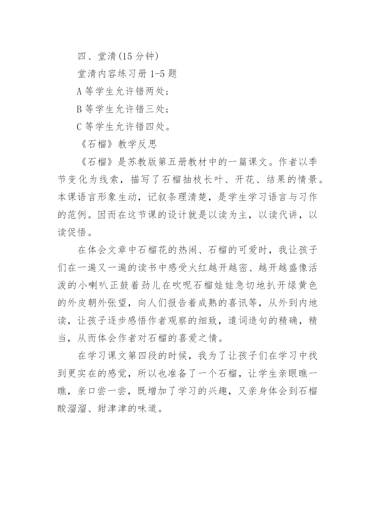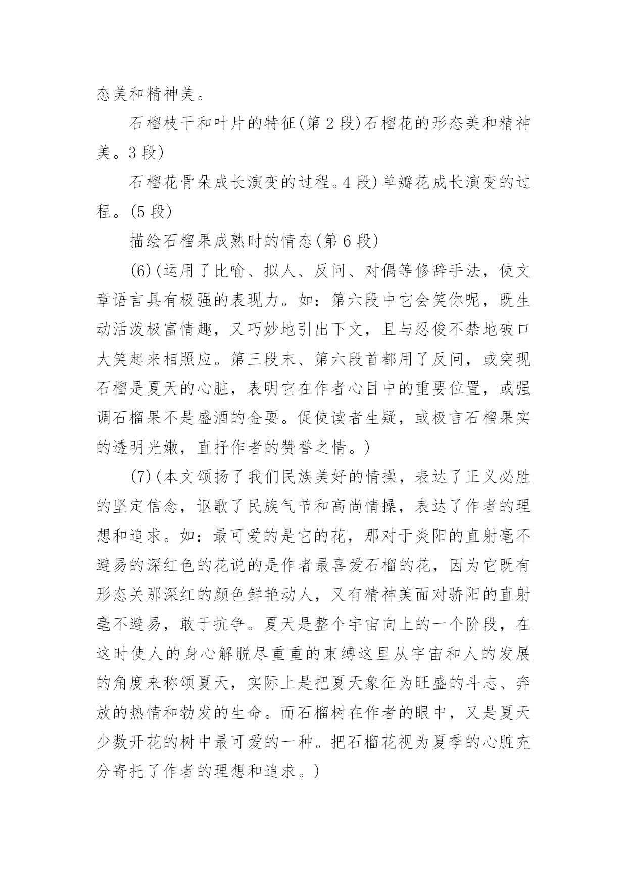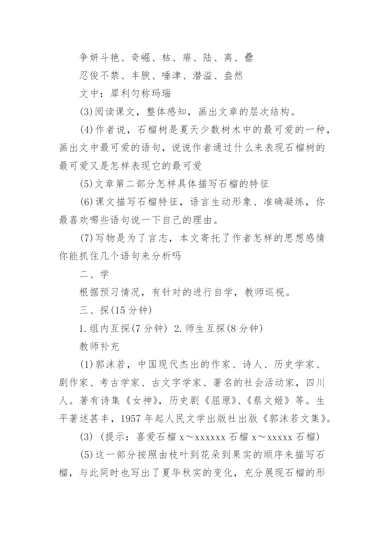 石榴教案设计作为一位兢兢业业的人民教师,常常要写一份优秀的教案,借助教案可以恰当地选择和运用教学方法,调动学生学习的积极性。教案应该怎么写才好呢?下面是小编为大家收集的石榴教案设计,欢迎大家借鉴与参考,希望对大家有所帮助。教学目标1.体会文章生动形象、准确凝练的语言。2.学习根据中心需要抓住特征写景的方法。教学重点体会文章生动形象、准确凝练的语言。教学准备小黑板教学时数一课时。教学过程一、导1、导入新课提到郭沫若,我们不由得想起在七年级学过的《天上的街市》(可集体诵读)。郭沫若诗写得好,特别是现代诗。他的散文也相当优美。今天我们来学习他的一篇托物言志的散文《石榴》。(板书课题及作者。)2、自学提纲(1)介绍作者。要求:记住作者。(2)掌握下列字词。争妍斗艳、奇崛、枯、瘠、陆、离、罍忍俊不禁、丰腴、唾津、潜溢、盎然文中:犀利匀称玛瑙(3)阅读课文,整体感知,画出文章的层次结构。(4)作者说,石榴树是夏天少数树木中的最可爱的一种,画出文中最可爱的语句,说说作者通过什么来表现石榴树的最可爱又是怎样表现它的最可爱(5)文章第二部分怎样具体描写石榴的特征(6)课文描写石榴特征,语言生动形象、准确凝练,你最喜欢哪些语句说一下自己的理由。(7)写物是为了言志,本文寄托了作者怎样的思想感情你能抓住几个语句来分析吗二、学根据预习情况,有针对的进行自学,教师巡视。三、探(15分钟)1.组内互探(7分钟)2.师生互探(8分钟)教师补充(1)郭沫若,中国现代杰出的作家、诗人、历史学家、剧作家、考古学家、古文字学家、著名的社会活动家,四川人。著有诗集《女神》,历史剧《屈原》、《蔡文姬》等。生平著述甚丰,1957年起人民文学出版社出版《郭沫若文集》。(3)(提示:喜爱石榴x~xxxxxx石榴x~xxxxx石榴)(5)这一部分按照由枝叶到花朵到果实的顺序来描写石榴,与此同时也写出了夏华秋实的变化,充分展现石榴的形态美和精神美。石榴枝干和叶片的特征(第2段)石榴花的形态美和精神美。3段)石榴花骨朵成长演变的过程。4段)单瓣花成长演变的过程。(5段)描绘石榴果成熟时的情态(第6段)(6)(运用了比喻、拟人、反问、对偶等修辞手法,使文章语言具有极强的表现力。如:第六段中它会笑你呢,既生动活泼极富情趣,又巧妙地引出下文,且与忍俊不禁地破口大笑起来相照应。第三段末、第六段首都用了反问,或突现石榴是夏天的心脏,表明它在作者心目中的重要位置,或强调石榴果不是盛酒的金耍。促使读者生疑,或极言石榴果实的透明光嫩,直抒作者的赞誉之情。)(7)(本文颂扬了我们民族美好的情操,表达了正义必胜的坚定信念,讴歌了民族气节和高尚情操,表达了作者的理想和追求。如:最可爱的是它的花,那对于炎阳的直射毫不避易的深红色的花说的是作者最喜爱石榴的花,因为它既有形态关那深红的颜色鲜艳动人,又有精神美面对骄阳的直射毫不避易,敢于抗争。夏天是整个宇宙向上的一个阶段,在这时使人的身心解脱尽重重的束缚这里从宇宙和人的发展的角度来称颂夏天,实际上是把夏天象征为旺盛的斗志、奔放的热情和勃发的生命。而石榴树在作者的眼中,又是夏天少数开花的树中最可爱的一种。把石榴花视为夏季的心脏充分寄托了作者的理想和追求。)四、堂清(15分钟)堂清内容练习册1-5题A等学生允许错两处;B等学生允许错三处;C等学生允许错四处。《石榴》教学反思《石榴》是苏教版第五册教材中的一篇课文。作者以季节变化为线索,描写了石榴抽枝长叶、开花、结果的情景。本课语言形象生动,记叙条理清楚,是学生学习语言与习作的范例。因而在这节课的设计就是以读为主,以读代讲,以读促悟。在体会文章中石榴花的热闹、石榴的可爱时,我让孩子们在一遍又一遍的读书中感受火红越开越密、越开越盛像活泼的小喇叭正鼓着劲儿在吹呢石榴娃娃急切地扒开绿黄色的外皮朝外张望,向人们报告着成熟的喜讯等,从外到内地读,让孩子逐步感悟作者观察的细致,遣词造句的精确,精当,从而体会作者对石榴的喜爱之情。在学习课文第四段的时候,我为了让孩子们在学习中找到更实在的感觉,所以也准备了一个石榴,让学生亲眼瞧一瞧,亲口尝一尝,既增加了学习的兴趣,又亲身体会到石榴酸溜溜、甜津津的味道。