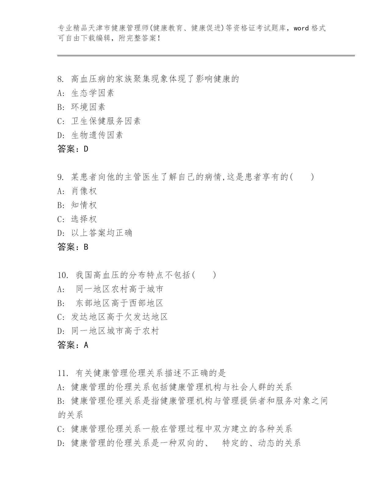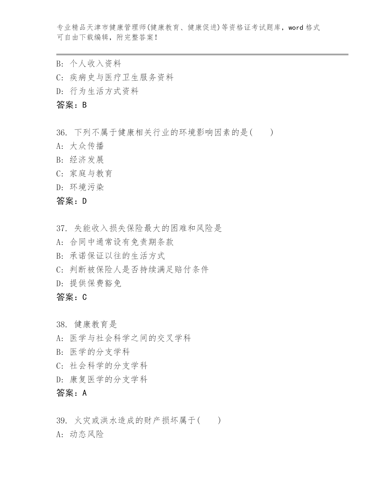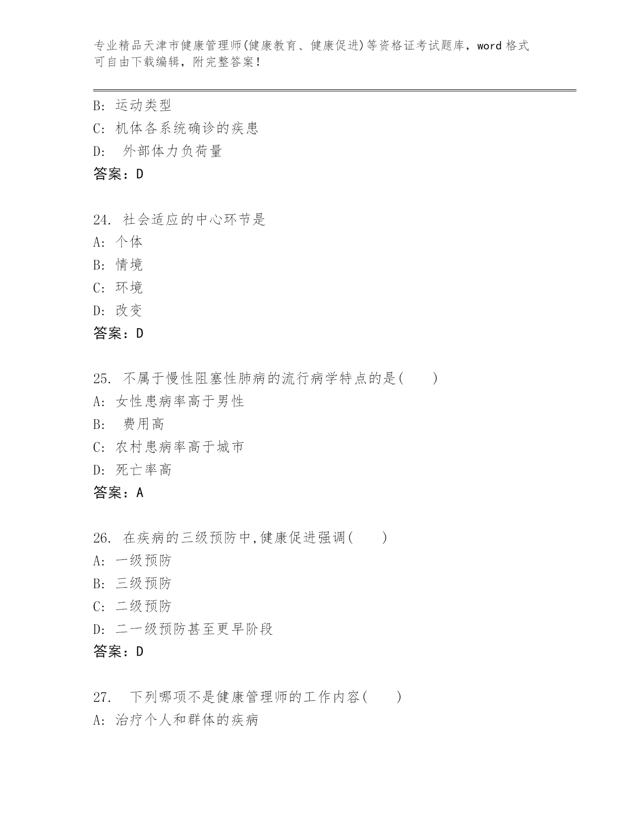 最新天津市健康管理师(健康教育、健康促进)等资格证考试题库【培优A卷】.docx