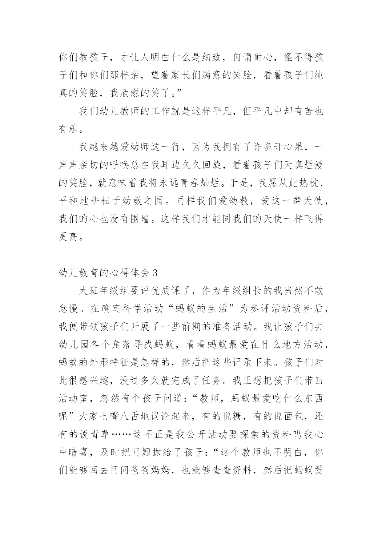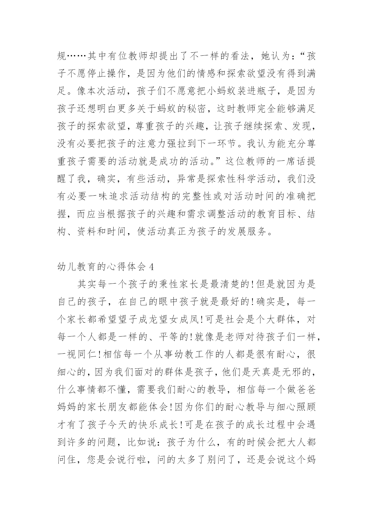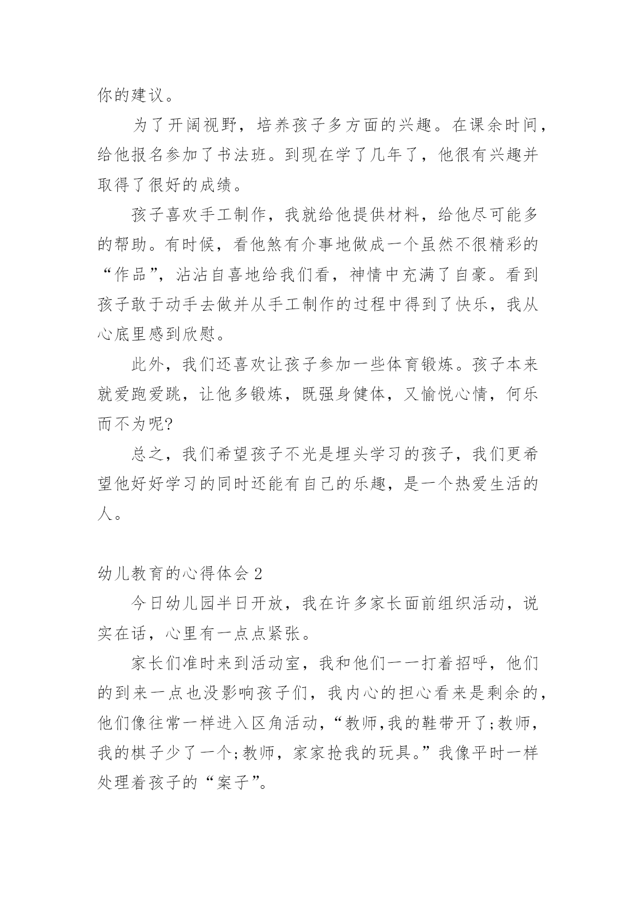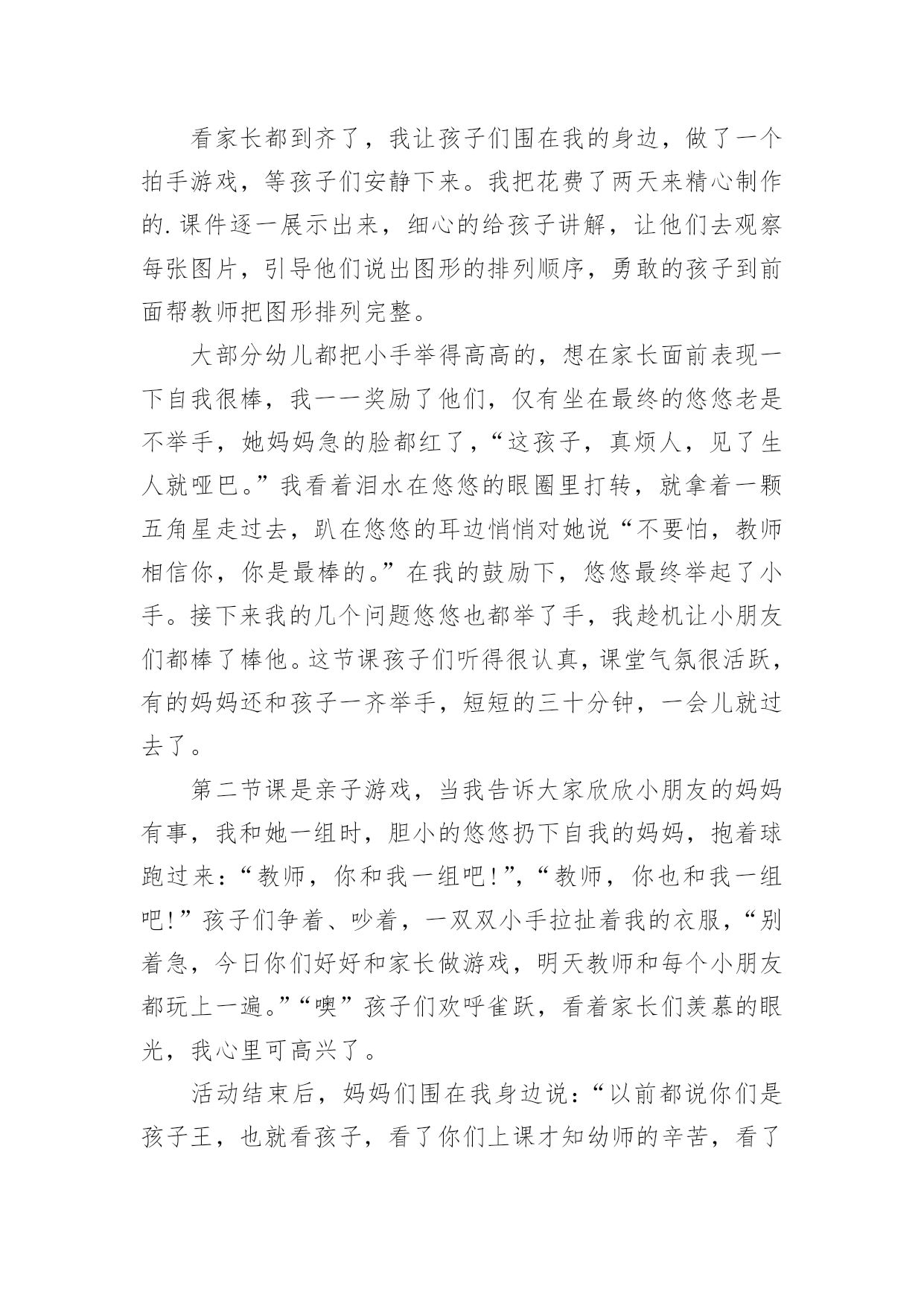 幼儿教育的心得体会当我们受到启发,对生活有了新的感悟时,往往会写一篇心得体会,这么做可以让我们不断思考不断进步。怎样写好心得体会呢?以下是小编帮大家整理的幼儿教育的心得体会,欢迎阅读,希望大家能够喜欢。幼儿教育的心得体会1孩子的教育,每一个做父母的都有一肚子话要说,虽然家庭情况不同,教育方式也各有千秋,但目的都是希望自己的孩子能快快乐乐地健康成长。作为父母,我们究竟应该怎么教育孩子?我曾经为此买了很多的书,买了很多的光盘,请教了许多同事……孩子一天天长大,成绩也渐趋稳定,可是我心里依然不敢有丝毫的松懈。好的学习习惯的养成是非常必要的,它应该体现在生活的细节中。我们家每个人都有爱看书的习惯,孩子小的时候早早开发锻炼他的识字能力,为他今后的学习打下了非常好的基础。孩子大一点后,我们就帮孩子养成读书的习惯,让他每天都抽出一点时间来看书。在我们家经常可以看到这样一幅画面:一家三口人各自捧着自己的书在看。而且,只要有机会就从书店买各种图书给他阅读,“六一”儿童节、春节的礼物都是各类的有趣的或者有益的书籍。时间长了,孩子喜欢上了读书。也养成了良好的`读书习惯。对学习也起到了很大的促进作用。从孩子上学起,我就注意培养他学习习惯,每天回家后先完成老师留下的作业。学新课之前,先预习一下后面的内容。及时同他的老师沟通,帮助孩子养成良好的学习习惯。在家庭生活中,时时处处注意习惯的养成,玩过的玩具要收拾好,晚上睡前洗脸刷牙等等,有时候,孩子想偷懒,就给他讲讲道理,并且告诉他,那样是不可以的。慢慢他就认可了这种行为,习惯也就自然而然的养成了。教育孩子,我们这一代父母是需要学习的,需要学习传承中华民族的传统智慧,我以前心里一直不踏实,就是我感觉自己内心没有建立一个稳定的可信赖的整体价值体系来教育孩子,这一段时间在断断续续对传统启蒙经典的接触过程中,一边反省自身的行为道德规范,一边省思孩子成长的种.种表现,我感觉自己找到了教育孩子的线索和方向,我需要跟孩子共同在学习传统文化的熏陶下成长。不要给孩子定太高的要求,给他一点自由发展的空间,在其中观察孩子的长处和不足,再施加引导。我想我们都是做过孩子的,应该知道孩子喜欢什么,过多的说教,都不如用自己的行为来引导孩子的效果来的好。要求孩子做到的,大人自己首先要做到。比如我儿子看电视的时候,一看到精彩的部分就不自觉地走到了电视机前,我就纠正他,他马上就指斥说:“你也老是天天上网,一玩就老长时间,眼睛也要看坏的。”面对孩子的质问,我只有自己先改正,用自己的行为来影响孩子,我告诉孩子:“你看妈妈改正了,只上一会儿网了,你也应该改正吧!”这时,孩子会欣然的接受你的建议。为了开阔视野,培养孩子多方面的兴趣。在课余时间,给他报名参加了书法班。到现在学了几年了,他很有兴趣并取得了很好的成绩。孩子喜欢手工制作,我就给他提供材料,给他尽可能多的帮助。有时候,看他煞有介事地做成一个虽然不很精彩的“作品”,沾沾自喜地给我们看,神情中充满了自豪。看到孩子敢于动手去做并从手工制作的过程中得到了快乐,我从心底里感到欣慰。此外,我们还喜欢让孩子参加一些体育锻炼。孩子本来就爱跑爱跳,让他多锻炼,既强身健体,又愉悦心情,何乐而不为呢?总之,我们希望孩子不光是埋头学习的孩子,我们更希望他好好学习的同时还能有自己的乐趣,是一个热爱生活的人。幼儿教育的心得体会2今日幼儿园半日开放,我在许多家长面前组织活动,说实在话,心里有一点点紧张。家长们准时来到活动室,我和他们一一打着招呼,他们的到来一点也没影响孩子们,我内心的担心看来是剩余的,他们像往常一样进入区角活动,“教师,我的鞋带开了;教师,我的棋子少了一个;教师,家家抢我的玩具。”我像平时一样处理着孩子的“案子”。看家长都到齐了,我让孩子们围在我的身边,做了一个拍手游戏,等孩子们安静下来。我把花费了两天来精心制作的.课件逐一展示出来,细心的给孩子讲解,让他们去观察每张图片,引导他们说出图形的排列顺序,勇敢的孩子到前面帮教师把图形排列完整。大部分幼儿都把小手举得高高的,想在家长面前表现一下自我很棒,我一一奖励了他们,仅有坐在最终的悠悠老是不举手,她妈妈急的脸都红了,“这孩子,真烦人,见了生人就哑巴。”我看着泪水在悠悠的眼圈里打转,就拿着一颗五角星走过去,趴在悠悠的耳边悄悄对她说“不要怕,教师相信你,你是最棒的。”在我的鼓励下,悠悠最终举起了小手。接下来我的几个问题悠悠也都举了手,我趁机让小朋友们都棒了棒他。这节课孩子们听得很认真,课堂气氛很活跃,有的妈妈还和孩子一齐举手,短短的三十分钟,一会儿就过去了。第二节课是亲子游戏,当我告诉大家欣欣小朋友的妈妈有事,我和她一组时,胆小的悠悠扔下自我的妈妈,抱着球跑过来:“教师,你和我一组吧!”,“教师,你也和我一组吧!”孩子们争着、吵着,一双双小手拉扯着我的衣服,“
