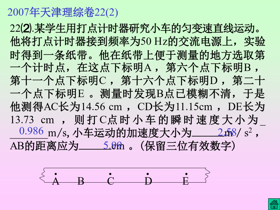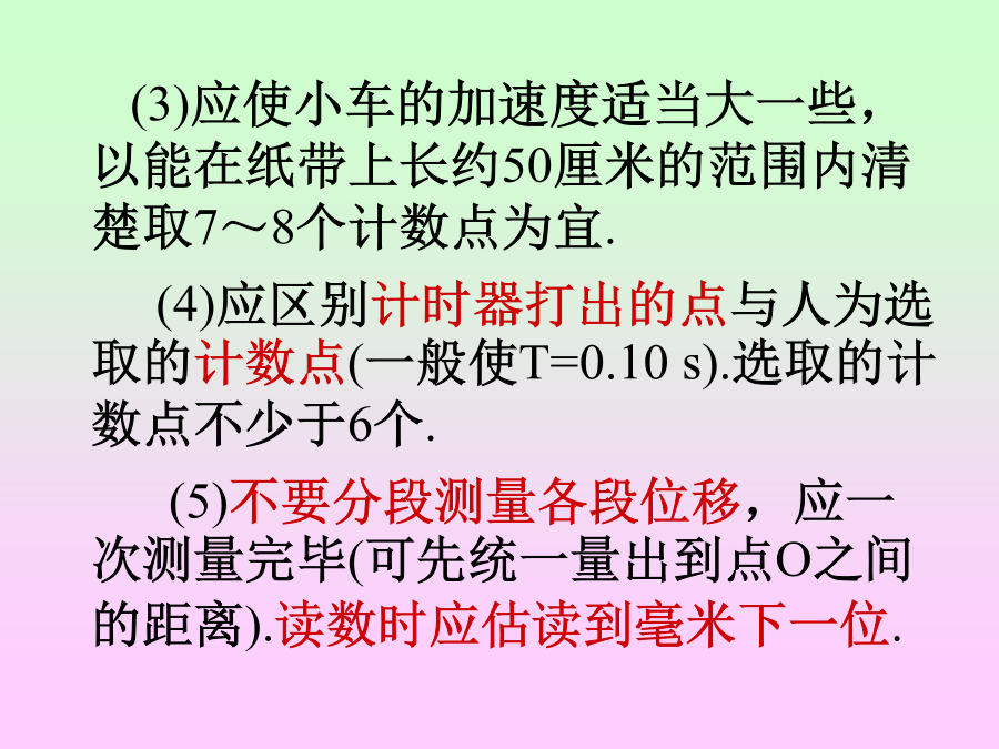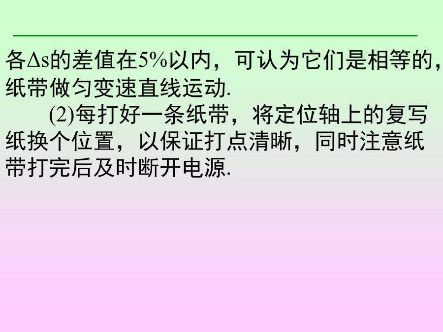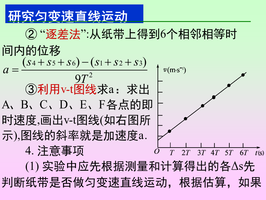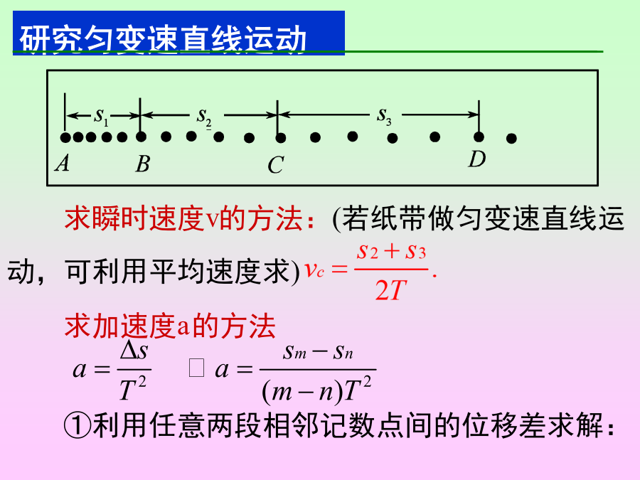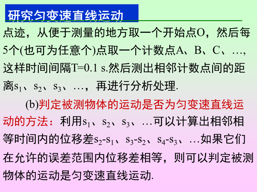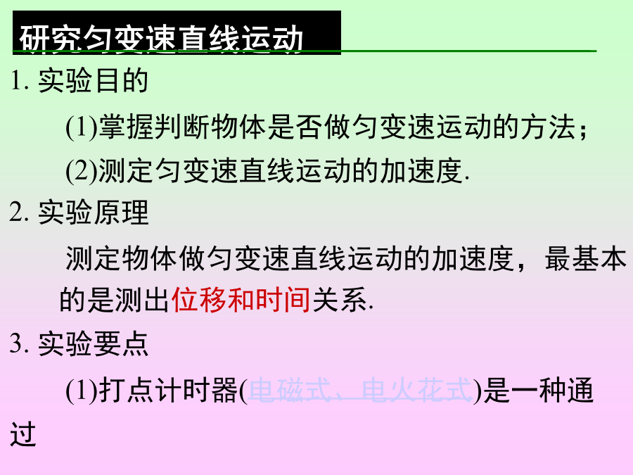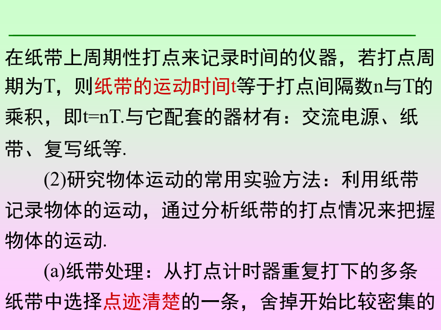 第一单元直线运动研究匀变速直线运动在纸带上周期性打点来记录时间的仪器,若打点周期为T,则纸带的运动时间t等于打点间隔数n与T的乘积,即t=nT.与它配套的器材有:交流电源、纸带、复写纸等.(2)研究物体运动的常用实验方法:利用纸带记录物体的运动,通过分析纸带的打点情况来把握物体的运动.(a)纸带处理:从打点计时器重复打下的多条纸带中选择点迹清楚的一条,舍掉开始比较密集的研究匀变速直线运动研究匀变速直线运动研究匀变速直线运动各Δs的差值在5%以内,可认为它们是相等的,纸带做匀变速直线运动.(2)每打好一条纸带,将定位轴上的复写纸换个位置,以保证打点清晰,同时注意纸带打完后及时断开电源.(3)应使小车的加速度适当大一些,以能在纸带上长约50厘米的范围内清楚取7~8个计数点为宜.(4)应区别计时器打出的点与人为选取的计数点(一般使T=0.10s).选取的计数点不少于6个.(5)不要分段测量各段位移,应一次测量完毕(可先统一量出到点O之间的距离).读数时应估读到毫米下一位.2007年天津理综卷22(2)06年广东东莞中学高考模拟试题11(2)一、两种打点计时器2、电火花计时器(1)构造:(2)原理:脉冲电流经放电针、墨粉纸盘放电(3)工作电压:220V3、打点计时器的作用(1)测时间(电源频率50Hz,每隔___秒打一个点)(2)测位移(3)研究纸带→研究物体运动练习使用打点计时器