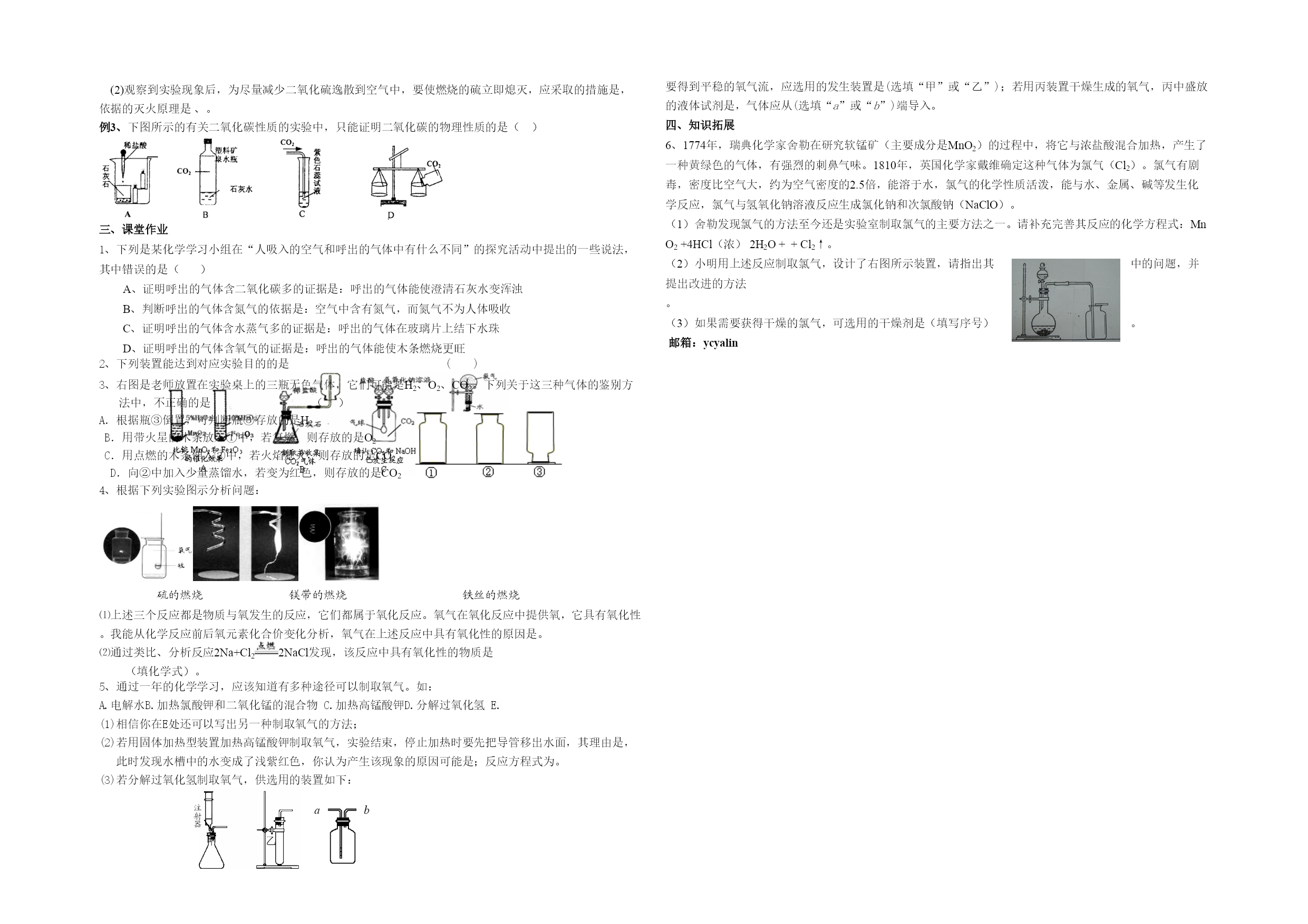 一、一级主题----身边的化学物质知识点1、氧气的实验室制法-----------------------知识维度:简单应用知识点2、二氧化碳的实验室制法-----------------知识维度:简单应用二、典型例题讲解例1、根据下列装置图回答问题。ABCDEFG(1)标号仪器①的名称是(2)实验室制取二氧化碳,应选择的发生装置和收集装置为(填字母序号)。(3)实验室用一定质量的高锰酸钾制取氧气,通过排水量测定所收集到的氧气体积(装置选用A、F、G)。①若各装置的连接顺序是:a→b→c→d,F装置内导管(“b”或“c”)该怎样延伸?请画出。②若改用氯酸钾和二氧化锰来制取氧气,则二氧化锰在反应前后固体混合物中的质量分数将(填“变大”、“变小”或“不变”)三、课堂作业1、下图是实验室制取氧气的两种装置,请回答下列问题。(1)写出甲装置中发生反应的化学方程式。(2)乙装置收集氧气时需要用带火星的木条来验满,这是利用了氧气的。甲、乙两种制取氧气的方法相比,乙方法的优点是。2、实验室部分仪器或装置如下图所示,请回答下列问题:⑴若要组装一套二氧化碳的发生装置,可选择图中的(填仪器下方的字母,下同),ab水收集装置可选用图中的,检验二氧化碳是否收集满的方法是。用该发生装置还可以制取的气体是(填一种)。⑵若用高锰酸钾制取氧气,还需要的实验用品是,⑶用右图所示装置收集氧气,氧气应从(填“a”或“b”)端导入。3、下图是实验室常用的装置。请据图回答:(1)写出仪器①的名称。收集某气体只能采用E装置,由此推测该气体具有的性质;(2)用过氧化氢溶液和二氧化锰制取并收集氧气的装置组合是(填序号),反应的化学方程式为;(3)实验室制得的CO2气体中常含有HCl和水蒸气。为了得到纯净、干燥的CO2气体,除杂装置的导管气流方向连接顺序是(填选项)。4、根据所学知识并结合图11所示装置回答下列问题。⑴图中标有①、②的仪器名称:①,②。⑵用氯酸钾和二氧化锰制取氧气的化学方程式为,若选择A和C装置制取并收集氧气.则要对A装置进行的改进是,证明氧气已收集满的方法是。⑶组装一套实验室制取并收集二氧化碳的装置,可选用图中和(填标号)。用装置B制取二氧化碳气体时,从长颈漏斗中加入稀盐酸至时停止。检验二氧化碳的方法是(用化学方程式表示)。四、知识拓展5、现有实验室制取气体的部分装置,请结合所学化学知识,回答有关问题:mn浓硫酸ABCDEF(1)请写出图中标有字母的仪器名称:abc(2)实验室用高锰酸钾制取氧气,装置A还需做的一点改动是,请写出该反应的化学方程式:。(3)实验室用过氧化氢溶液制取氧气,可用的发生装置是,其中二氧化锰起作用。若用D装置收集氧气,试写出验满的方法(包括操作、现象、结论)。(4)实验室制取二氧化碳的化学方程式为:,若要收集到干燥的二氧化碳气体,应将发生装置与F装置的(填“m”或“n”)相连。能用E装置收集的气体有(任举一例)。知识维度-------问题解决(1)一、一级主题----身边的化学物质知识点1、氧气的主要性质(氧化性—助燃性、与碳、硫、磷、铁的反应)用途知识点2、二氧化碳的主要性质(与水、石灰水的反应)二、典型例题讲解例1、甲、乙、丙是三个实验的示意图,根据图中所发生的化学反应现象及化学反应原理,进行总结归纳并回答下列问题:⑴所发生的三个反应有多个共同的特点,分别是①;②;③;④。⑵任选上述三个实验中的一个,写出反应的化学方程式:例2、用右图装置做硫燃烧的实验。(1)硫在空气中燃烧不如在氧气中剧烈的原因是。(2)观察到实验现象后,为尽量减少二氧化硫逸散到空气中,要使燃烧的硫立即熄灭,应采取的措施是,依据的灭火原理是、。例3、下图所示的有关二氧化碳性质的实验中,只能证明二氧化碳的物理性质的是()三、课堂作业1、下列是某化学学习小组在“人吸入的空气和呼出的气体中有什么不同”的探究活动中提出的一些说法,其中错误的是()A、证明呼出的气体含二氧化碳多的证据是:呼出的气体能使澄清石灰水变浑浊B、判断呼出的气体含氮气的依据是:空气中含有氮气,而氮气不为人体吸收C、证明呼出的气体含水蒸气多的证据是:呼出的气体在玻璃片上结下水珠D、证明呼出的气体含氧气的证据是:呼出的气体能使木条燃烧更旺2、下列装置能达到对应实验目的的是()3、右图是老师放置在实验桌上的三瓶无色气体,它们可能是H2、O2、CO2。下列关于这三种气体的鉴别方法中,不正确的是()A.根据瓶③倒置,可判断瓶③存放的是H2B.用带火星的木条放入①中,若复燃,则存放的是O2C.用点燃的木条伸入②中,若火焰熄灭,则存放的是CO2D.向②中加入少量蒸馏水,若变为