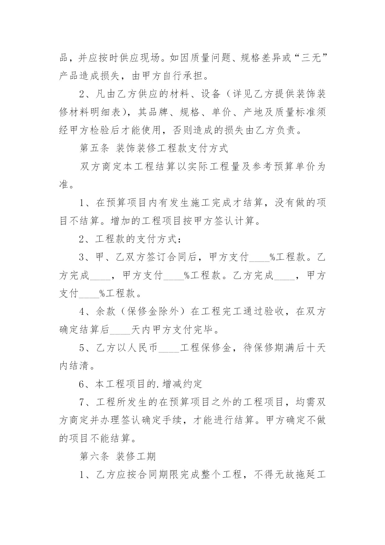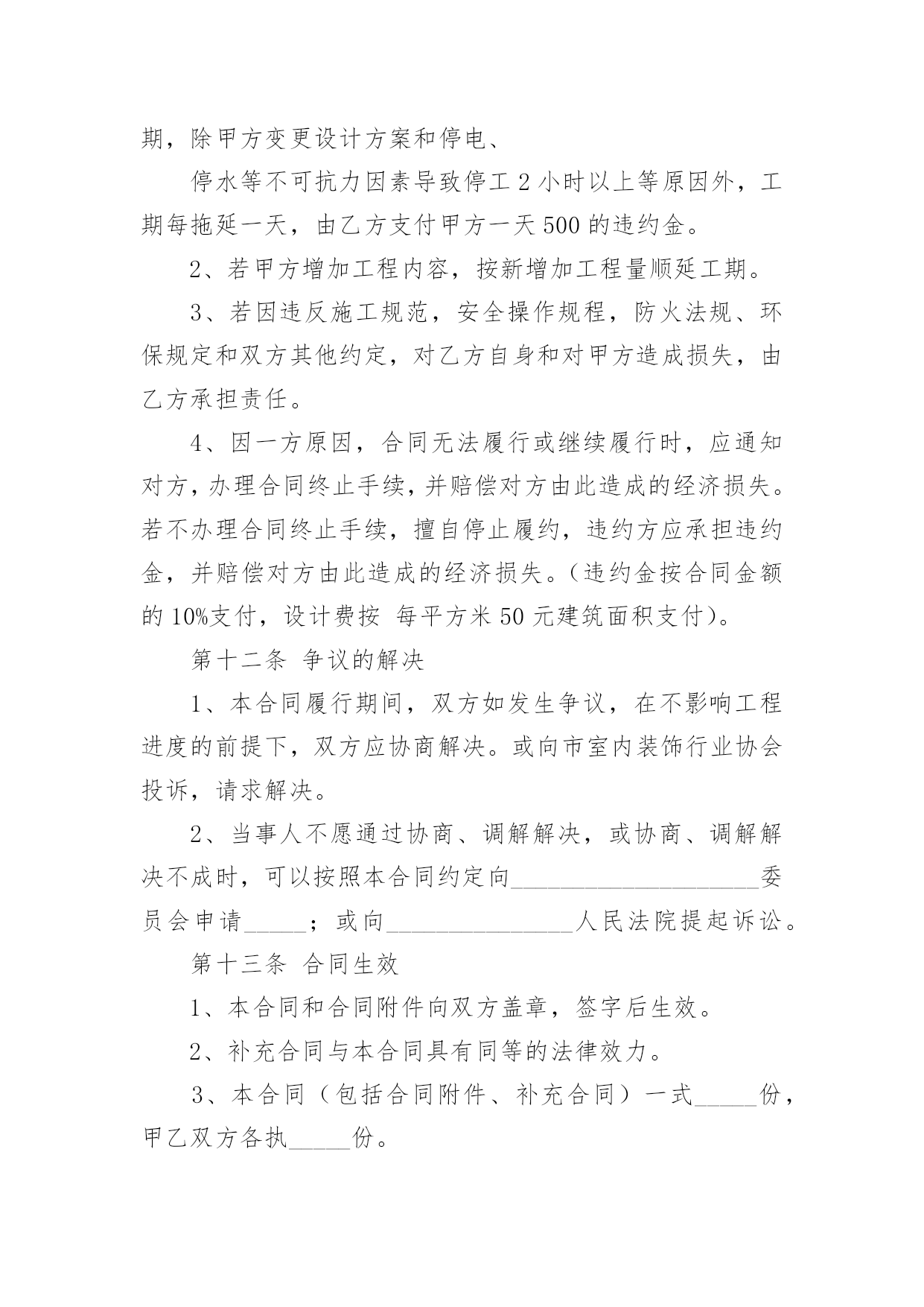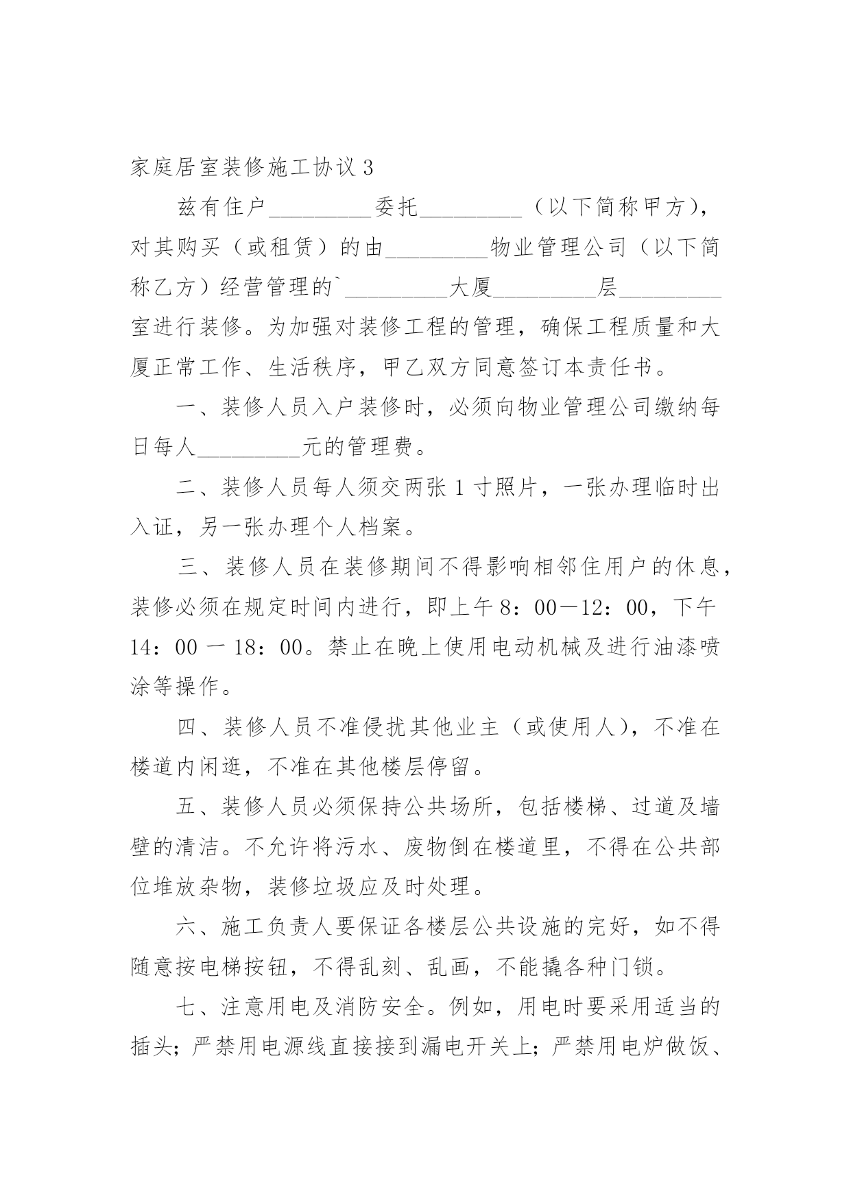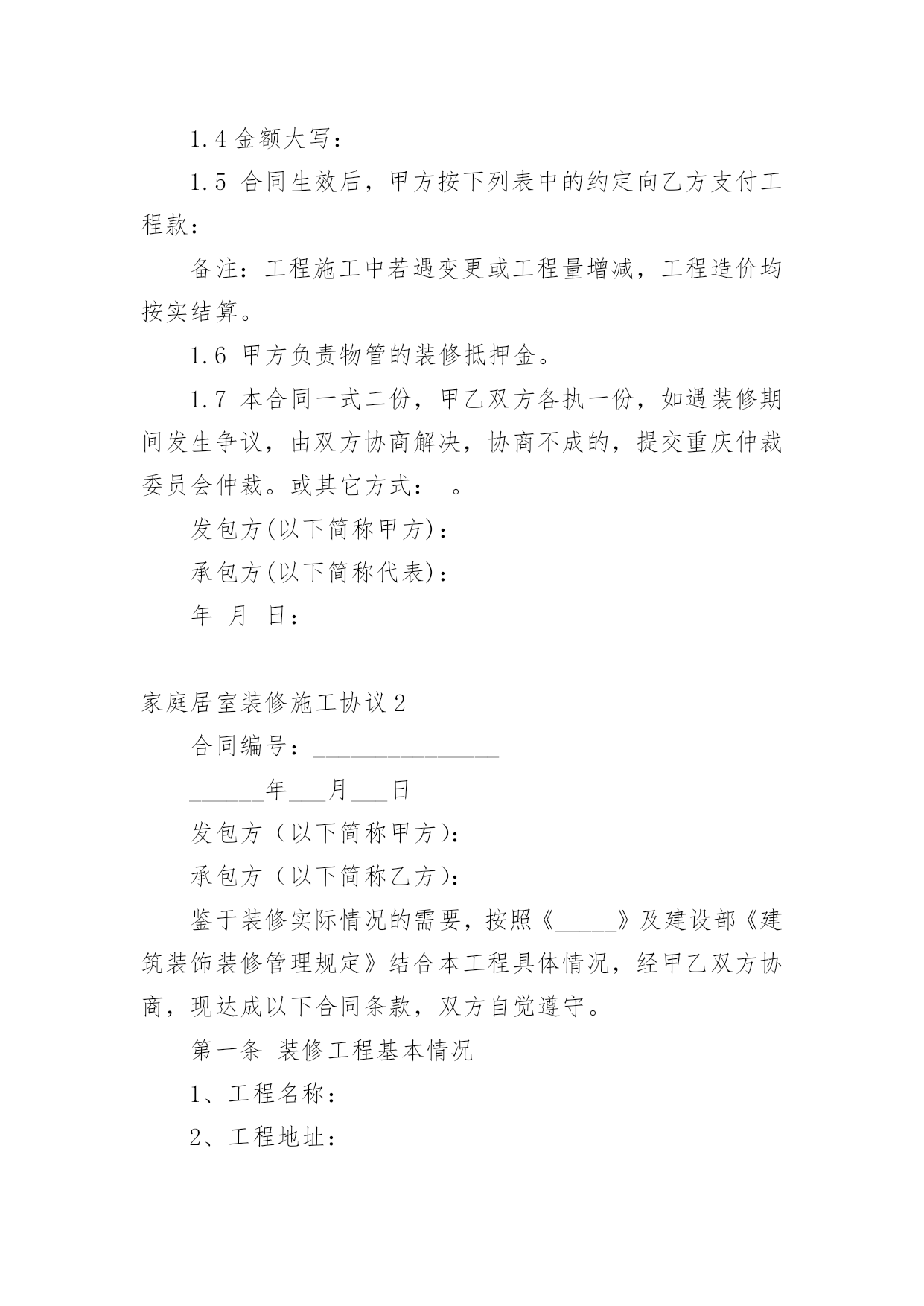 家庭居室装修施工协议在充满活力,日益开放的今天,很多场合都离不了协议,签订协议可以约束双方履行责任。我们该怎么拟定协议呢?下面是小编收集整理的家庭居室装修施工协议,希望对大家有所帮助。家庭居室装修施工协议1发包方(以下简称甲方):委托代理人(或甲方代表):联系地址:联系电话:承包方(以下简称代表):本工程设计人:联系电话:施工负责人:联系电话:根据《中华人民共和国合同法》及其它有关法律、法规结合本市住宅装饰装修的特点,甲乙双方在平等、自愿的基础上协商一致,就乙方承包甲方的住宅装饰装修工作(以下简称工程)的.有关事宜,达成如下协议:第一条工程概况1.1工程地点:1.2工程承包方式,双方商定采取下列第种承包方式。(1)乙方包工、包全部材料;(2)乙方包工、包部分材料,甲方提供部分材料;(乙方包人工费和辅材费)(3)乙方包工、甲方提供全部材料。开工日期年月日竣工日期年月日1.4金额大写:1.5合同生效后,甲方按下列表中的约定向乙方支付工程款:备注:工程施工中若遇变更或工程量增减,工程造价均按实结算。1.6甲方负责物管的装修抵押金。1.7本合同一式二份,甲乙双方各执一份,如遇装修期间发生争议,由双方协商解决,协商不成的,提交重庆仲裁委员会仲裁。或其它方式:。发包方(以下简称甲方):承包方(以下简称代表):年月日:家庭居室装修施工协议2合同编号:_____________________年___月___日发包方(以下简称甲方):承包方(以下简称乙方):鉴于装修实际情况的需要,按照《_____》及建设部《建筑装饰装修管理规定》结合本工程具体情况,经甲乙双方协商,现达成以下合同条款,双方自觉遵守。第一条装修工程基本情况1、工程名称:2、工程地址:3、工程预算:4、工程承包方式:5、工程期限(以实际工作日计算):开工日期:______年___月___日;竣工日期:______年___月___日第二条装修工程造价1、总价款:¥______元,大写:______(不含税金),双方认可,变更施工内容,变更部分的工程款按实另计。2、报价单根据市场经济运作规则,本着优质优价的原则由双方约定,作为本合同的附件。详见本合同附件《装饰工程预算表》。第三条装修工程设计1、乙方根据甲方提供图纸进行本工程施工,甲方必须提供有关本工程的土建施工图及有关设计要求。甲方不得随意更改设计,合同签订后甲方若有设计更改必须提前______个工作日通知乙方并支付由此产生的相应费用。2、乙方需严格按照甲方提供的图纸进行施工,不得随意更改,如因现场需要必须变更,需双方协商后确定最终施工方案,乙方方可进行施工。3、乙方编制本工程的装饰工程预算书提交给甲方,经甲、乙双方共同确认后,作为本工程付款依据。第四条装修材料提供1、本工程甲方采购的材料、设备(详见甲方提供装饰装修材料明细表),应为符合设计要求、正规厂家的合格产品,并应按时供应现场。如因质量问题、规格差异或“三无”产品造成损失,由甲方自行承担。2、凡由乙方供应的材料、设备(详见乙方提供装饰装修材料明细表),其品牌、规格、单价、产地及质量标准须经甲方检验后才能使用,否则造成的损失由乙方负责。第五条装饰装修工程款支付方式双方商定本工程结算以实际工程量及参考预算单价为准。1、在预算项目内有发生施工完成才结算,没有做的项目不结算。增加的工程项目按甲方签认计算。2、工程款的支付方式:3、甲、乙双方签订合同后,甲方支付____%工程款。乙方完成____,甲方支付____%工程款。乙方完成____,甲方支付____%工程款。4、余款(保修金除外)在工程完工通过验收,在双方确定结算后____天内甲方支付完毕。5、乙方以人民币____工程保修金,待保修期满后十天内结清。6、本工程项目的.增减约定7、工程所发生的在预算项目之外的工程项目,均需双方商定并办理签认确定手续,才能进行结算。甲方确定不做的项目不能结算。第六条装修工期1、乙方应按合同期限完成整个工程,不得无故拖延工期,除甲方变更设计方案和停电、停水等不可抗力因素导致停工_______小时以上等原因外,工期每拖延一天,由乙方支付甲方一天_______的违约金。2、若甲方增加工程内容,按新增加工程量顺延工期。第七条装修工程及验收1、本工程质量应达到国家质量评定合格标准,本工程保修期_______。2、甲、乙方应及时办理隐蔽工程和中间工程的检查与验收手续。甲方如不按时参加隐蔽工程和中间工程验收,乙方在征得甲方同意后可自行验收,甲方应予承认。若甲方要求复验,复验合格,甲方应承担复验费用,由此造成停工,工期顺延;若复验不合格,其复验及返工费用由乙方承担,但工期也予顺延。3、工程竣工后,乙方通知甲方验收,甲方自接到验收通知_______天内组织验收,验收合格后办理验收、移交手续。第八条工程监理监理工程