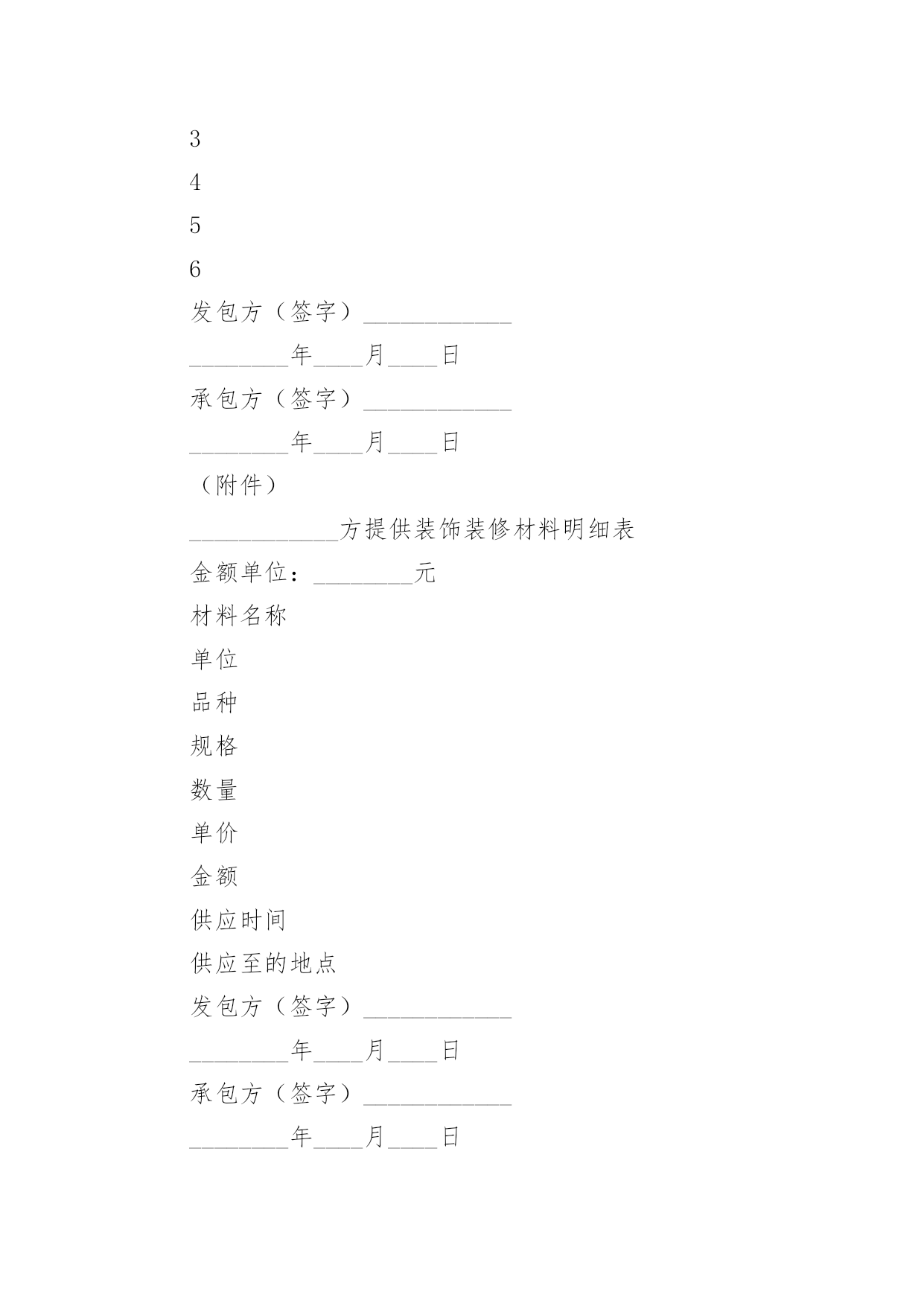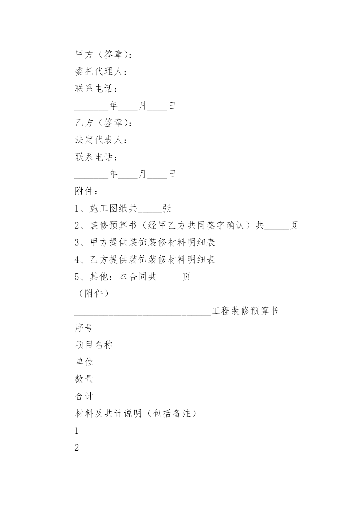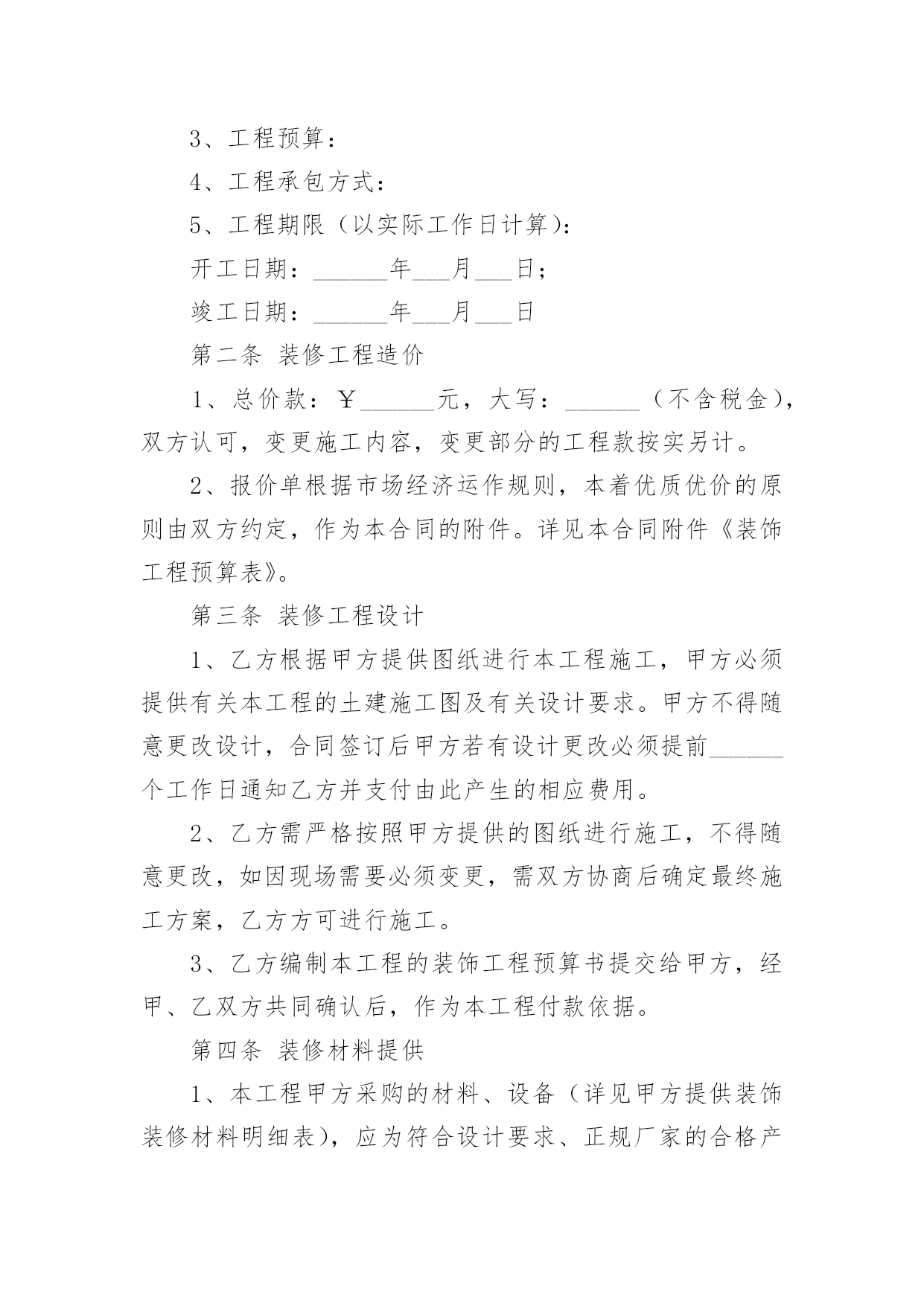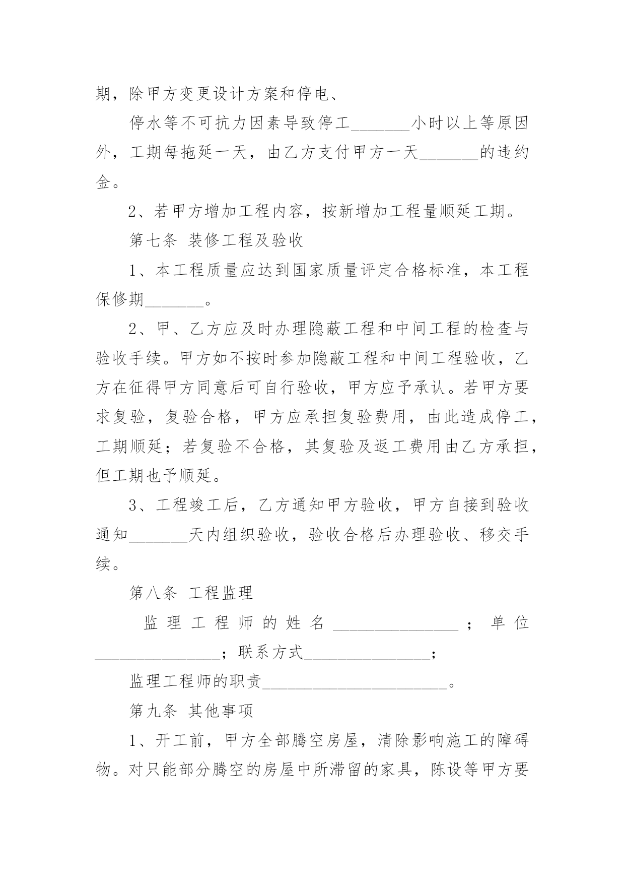 家庭居室装修施工协议在充满活力,日益开放的今天,很多场合都离不了协议,签订协议可以约束双方履行责任。我们该怎么拟定协议呢?下面是小编收集整理的家庭居室装修施工协议,希望对大家有所帮助。家庭居室装修施工协议1发包方(以下简称甲方):委托代理人(或甲方代表):联系地址:联系电话:承包方(以下简称代表):本工程设计人:联系电话:施工负责人:联系电话:根据《中华人民共和国合同法》及其它有关法律、法规结合本市住宅装饰装修的特点,甲乙双方在平等、自愿的基础上协商一致,就乙方承包甲方的住宅装饰装修工作(以下简称工程)的.有关事宜,达成如下协议:第一条工程概况1.1工程地点:1.2工程承包方式,双方商定采取下列第种承包方式。(1)乙方包工、包全部材料;(2)乙方包工、包部分材料,甲方提供部分材料;(乙方包人工费和辅材费)(3)乙方包工、甲方提供全部材料。开工日期年月日竣工日期年月日1.4金额大写:1.5合同生效后,甲方按下列表中的约定向乙方支付工程款:备注:工程施工中若遇变更或工程量增减,工程造价均按实结算。1.6甲方负责物管的装修抵押金。1.7本合同一式二份,甲乙双方各执一份,如遇装修期间发生争议,由双方协商解决,协商不成的,提交重庆仲裁委员会仲裁。或其它方式:。发包方(以下简称甲方):承包方(以下简称代表):年月日:家庭居室装修施工协议2合同编号:_____________________年___月___日发包方(以下简称甲方):承包方(以下简称乙方):鉴于装修实际情况的需要,按照《_____》及建设部《建筑装饰装修管理规定》结合本工程具体情况,经甲乙双方协商,现达成以下合同条款,双方自觉遵守。第一条装修工程基本情况1、工程名称:2、工程地址:3、工程预算:4、工程承包方式:5、工程期限(以实际工作日计算):开工日期:______年___月___日;竣工日期:______年___月___日第二条装修工程造价1、总价款:¥______元,大写:______(不含税金),双方认可,变更施工内容,变更部分的工程款按实另计。2、报价单根据市场经济运作规则,本着优质优价的原则由双方约定,作为本合同的附件。详见本合同附件《装饰工程预算表》。第三条装修工程设计1、乙方根据甲方提供图纸进行本工程施工,甲方必须提供有关本工程的土建施工图及有关设计要求。甲方不得随意更改设计,合同签订后甲方若有设计更改必须提前______个工作日通知乙方并支付由此产生的相应费用。2、乙方需严格按照甲方提供的图纸进行施工,不得随意更改,如因现场需要必须变更,需双方协商后确定最终施工方案,乙方方可进行施工。3、乙方编制本工程的装饰工程预算书提交给甲方,经甲、乙双方共同确认后,作为本工程付款依据。第四条装修材料提供1、本工程甲方采购的材料、设备(详见甲方提供装饰装修材料明细表),应为符合设计要求、正规厂家的合格产品,并应按时供应现场。如因质量问题、规格差异或“三无”产品造成损失,由甲方自行承担。2、凡由乙方供应的材料、设备(详见乙方提供装饰装修材料明细表),其品牌、规格、单价、产地及质量标准须经甲方检验后才能使用,否则造成的损失由乙方负责。第五条装饰装修工程款支付方式双方商定本工程结算以实际工程量及参考预算单价为准。1、在预算项目内有发生施工完成才结算,没有做的项目不结算。增加的工程项目按甲方签认计算。2、工程款的支付方式:3、甲、乙双方签订合同后,甲方支付____%工程款。乙方完成____,甲方支付____%工程款。乙方完成____,甲方支付____%工程款。4、余款(保修金除外)在工程完工通过验收,在双方确定结算后____天内甲方支付完毕。5、乙方以人民币____工程保修金,待保修期满后十天内结清。6、本工程项目的.增减约定7、工程所发生的在预算项目之外的工程项目,均需双方商定并办理签认确定手续,才能进行结算。甲方确定不做的项目不能结算。第六条装修工期1、乙方应按合同期限完成整个工程,不得无故拖延工期,除甲方变更设计方案和停电、停水等不可抗力因素导致停工_______小时以上等原因外,工期每拖延一天,由乙方支付甲方一天_______的违约金。2、若甲方增加工程内容,按新增加工程量顺延工期。第七条装修工程及验收1、本工程质量应达到国家质量评定合格标准,本工程保修期_______。2、甲、乙方应及时办理隐蔽工程和中间工程的检查与验收手续。甲方如不按时参加隐蔽工程和中间工程验收,乙方在征得甲方同意后可自行验收,甲方应予承认。若甲方要求复验,复验合格,甲方应承担复验费用,由此造成停工,工期顺延;若复验不合格,其复验及返工费用由乙方承担,但工期也予顺延。3、工程竣工后,乙方通知甲方验收,甲方自接到验收通知_______天内组织验收,验收合格后办理验收、移交手续。第八条工程监理监理工程