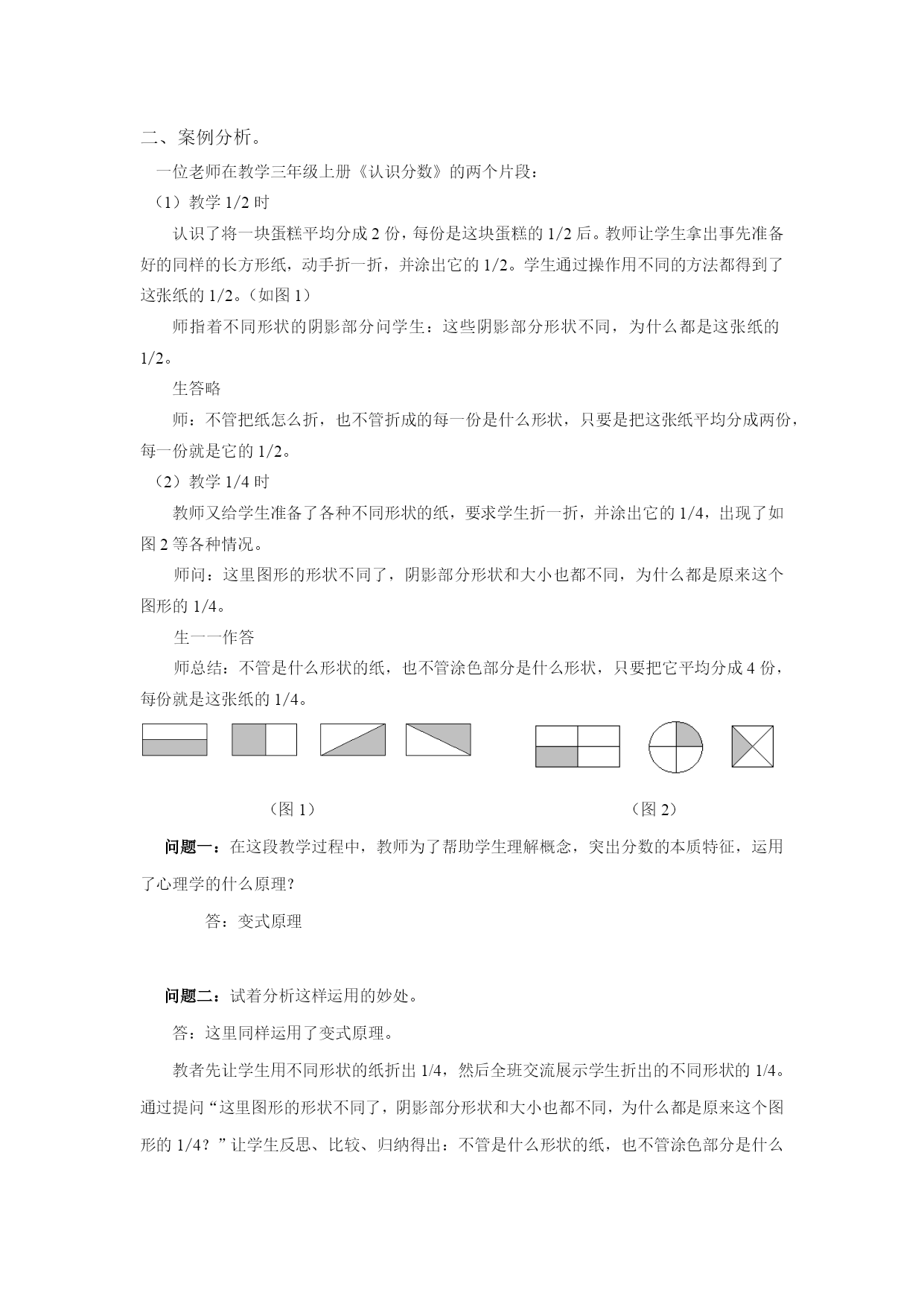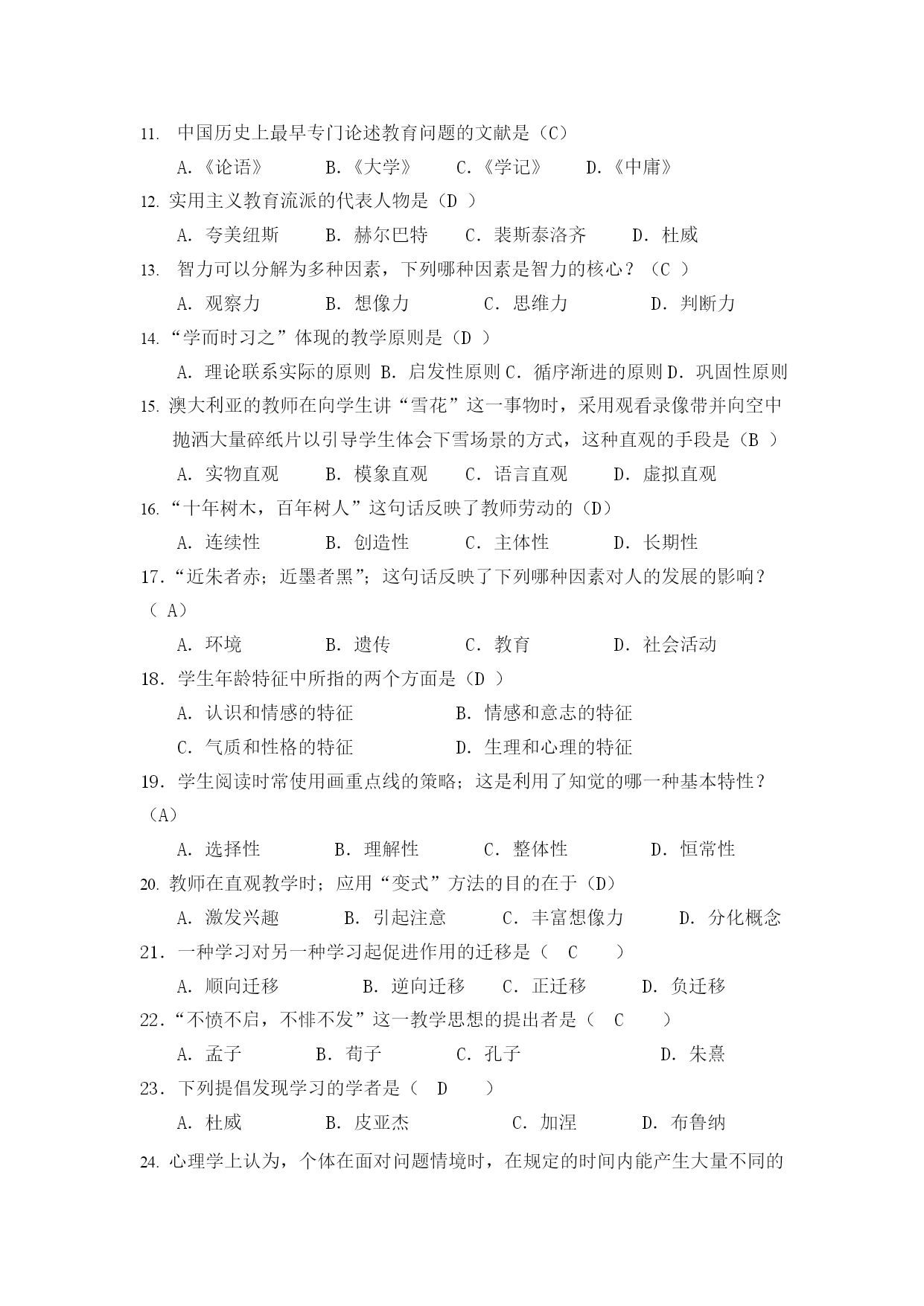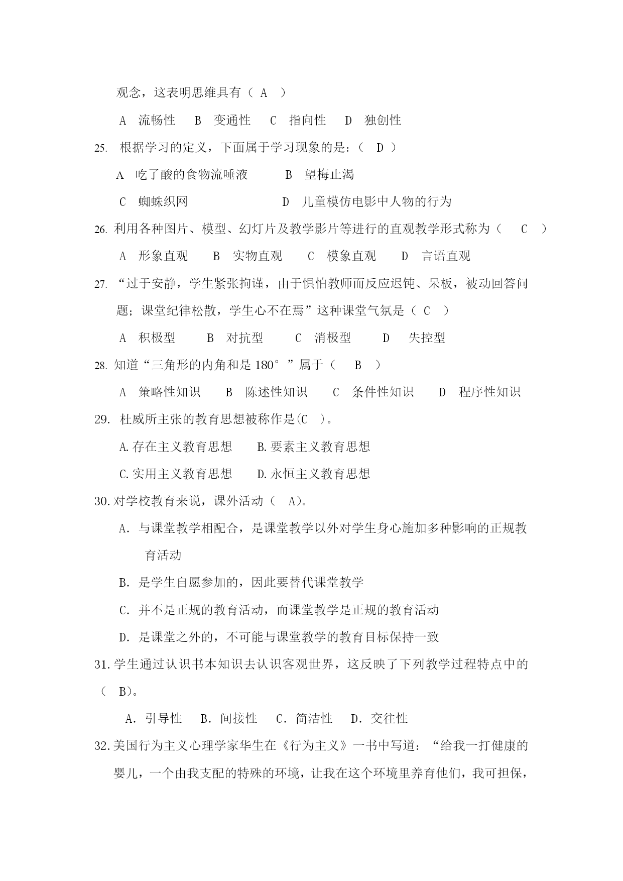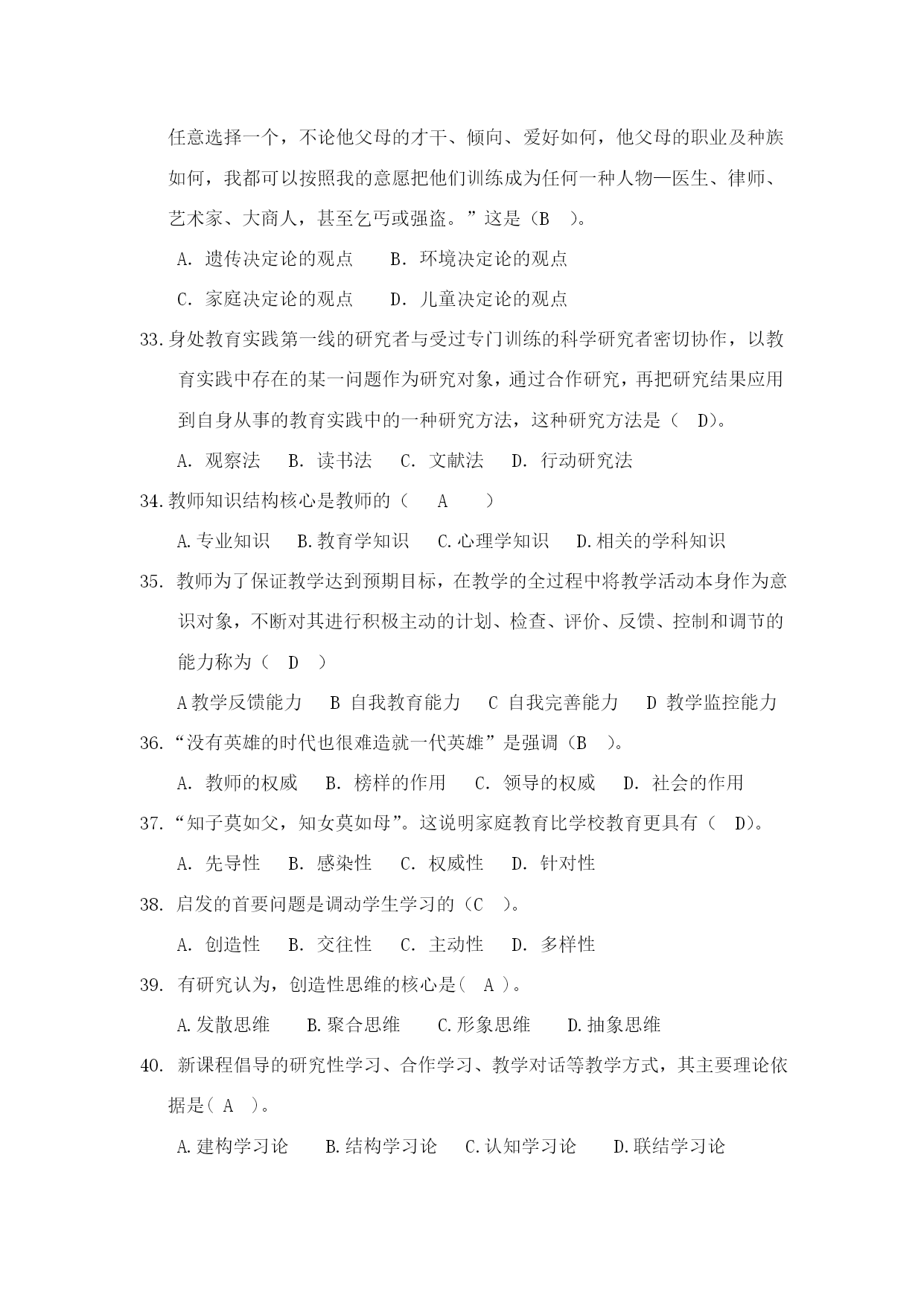《教育学》《心理学》《课标》模拟一一、选择题1.人的身心发展是指(A)。A.身体和心理的发展B.个性的品德的形成C.体重和身高的增加D.技能和技巧的提高2.对一个事件或一个学生进行调查的研究方法是(D)。A.全面调查B.重点调查C.抽样调查D.个案调查3.“一把钥匙开一把锁”遵循了人的发展的(D)。A.阶段性B.不平衡性C.顺序性D.个别差异性4.《学记》上说:“不陵节而施”;这句话体现了(A)。A.循序渐进的教学原则B.启发性教学原则C.因材施教的教学原则D.巩固性教学原则5、学生的数学学习活动应是一个(A)的过程。A.生动活泼的主动的富于个性B.主动和被动的生动活泼的C.生动活泼的被动的富于个性6.教师先准备预备性材料,设想教学进程,然后呈现给学生,并从中抽象出新信息的教学策略属于(B)。A.概念形式策略B.先行组织者策略C.认知发展策略7.下列属于问题解决的是(D)。A.漫无目的幻想B.走路C.联想D.发明创造8.颜回说:“夫子循循然善诱人,博我以文,约我以礼,欲罢不能。”这反映了德育的(B)。A.导向性原则B.疏导原则C.因材施教原则D.教育影响的一致性原则9.“长善救失”、“因材施教”的教育原则是根据人的身心发展的什么特点提出来的?(D)。A.分化与互补的协调性B.阶段性C.不平衡性D.个别差异性10.在古希腊,最早提出发现法的大教育家是(D)。A.德谟克利特B.亚里土多德C.柏拉图D.苏格拉底11.中国历史上最早专门论述教育问题的文献是(C)A.《论语》B.《大学》C.《学记》D.《中庸》12.实用主义教育流派的代表人物是(D)A.夸美纽斯B.赫尔巴特C.裴斯泰洛齐D.杜威13.智力可以分解为多种因素,下列哪种因素是智力的核心?(C)A.观察力B.想像力C.思维力D.判断力14.“学而时习之”体现的教学原则是(D)A.理论联系实际的原则B.启发性原则C.循序渐进的原则D.巩固性原则15.澳大利亚的教师在向学生讲“雪花”这一事物时,采用观看录像带并向空中抛洒大量碎纸片以引导学生体会下雪场景的方式,这种直观的手段是(B)A.实物直观B.模象直观C.语言直观D.虚拟直观16.“十年树木,百年树人”这句话反映了教师劳动的(D)A.连续性B.创造性C.主体性D.长期性17.“近朱者赤;近墨者黑”;这句话反映了下列哪种因素对人的发展的影响?(A)A.环境B.遗传C.教育D.社会活动18.学生年龄特征中所指的两个方面是(D)A.认识和情感的特征B.情感和意志的特征C.气质和性格的特征D.生理和心理的特征19.学生阅读时常使用画重点线的策略;这是利用了知觉的哪一种基本特性?(A)A.选择性B.理解性C.整体性D.恒常性20.教师在直观教学时;应用“变式”方法的目的在于(D)A.激发兴趣B.引起注意C.丰富想像力D.分化概念21.一种学习对另一种学习起促进作用的迁移是(C)A.顺向迁移B.逆向迁移C.正迁移D.负迁移22.“不愤不启,不悱不发”这一教学思想的提出者是(C)A.孟子B.荀子C.孔子D.朱熹23.下列提倡发现学习的学者是(D)A.杜威B.皮亚杰C.加涅D.布鲁纳24.心理学上认为,个体在面对问题情境时,在规定的时间内能产生大量不同的观念,这表明思维具有(A)A流畅性B变通性C指向性D独创性25.根据学习的定义,下面属于学习现象的是:(D)A吃了酸的食物流唾液B望梅止渴C蜘蛛织网D儿童模仿电影中人物的行为26.利用各种图片、模型、幻灯片及教学影片等进行的直观教学形式称为(C)A形象直观B实物直观C模象直观D言语直观27.“过于安静,学生紧张拘谨,由于惧怕教师而反应迟钝、呆板,被动回答问题;课堂纪律松散,学生心不在焉”这种课堂气氛是(C)A积极型B对抗型C消极型D失控型28.知道“三角形的内角和是180°”属于(B)A策略性知识B陈述性知识C条件性知识D程序性知识29.杜威所主张的教育思想被称作是(C)。A.存在主义教育思想B.要素主义教育思想C.实用主义教育思想D.永恒主义教育思想30.对学校教育来说,课外活动(A)。A.与课堂教学相配合,是课堂教学以外对学生身心施加多种影响的正规教育活动B.是学生自愿参加的,因此要替代课堂教学C.并不是正规的教育活动,而课堂教学是正规的教育活动D.是课堂之外的,不可能与课堂教学的教育目标保持一致31.学生通过认识书本知识去认识客观世界,这反映了下列教学过程特点中的(B)。A.引导性B.间接性C.简洁性D.交往性32.美国行为主义心理学家华生在《行为主义》一书中写道:“给我一打健康的婴儿,一个由我支配的特殊的环境,让我在这个环境里养育他们,我可担