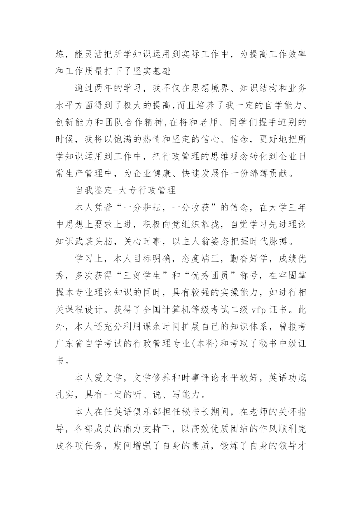 工商管理大专自我鉴定自我鉴定是个人在一个阶段的自我总结,自我鉴定可以使我们更有效率,让我们好好写一份自我鉴定总结一下吧。自我鉴定怎么写才不会千篇一律呢?以下是小编为大家整理的工商管理大专自我鉴定,欢迎大家借鉴与参考,希望对大家有所帮助。一、在思想品德上,我有着良好道德修养,坚定的政治方向。在平日的学习、生活中,我积极地向党组织靠拢,使我对党有了可更为深刻的认识。并参加了学院组织的“入党积极分子”的培训。在学校遵纪守法、爱护公共设施、乐于关在政治思想方面:本人积极要求进步、拥护党的路线、方针、政策,遵纪守法、廉洁自律。具有良好的社会公共道德和职业道德,有较强的集体荣誉感及团队合作精神。在此同时,学习了《新劳动合同法》、《社会保障法》、《安全生产法》等等法律、法规,提高了自己的政策水平和明确是非能力。在业务知识和能力方面:热爱本专业并投入了积极的热情,通过扎实学习《管理学原理》、《组织行为学》、《公共人力资源管理》等各门课程,我系统的掌握了本专业所需要的基本理论、基本知识、技能和方法,在此基础上,结合专业特点及工作实际,增强了公共关系和人力资源应用能力的锻炼,能灵活把所学知识运用到实际工作中,为提高工作效率和工作质量打下了坚实基础通过两年的学习,我不仅在思想境界、知识结构和业务水平方面得到了极大的提高,而且培养了我一定的自学能力、创新能力和团队合作精神,在将和老师、同学们握手道别的时候,我将以饱满的热情和坚定的信心、信念,更好地把所学知识运用到工作中,把行政管理的思维观念转化到企业日常生产管理中,为企业健康、快速发展作一份绵薄贡献。自我鉴定-大专行政管理本人凭着“一分耕耘,一分收获”的信念,在大学三年中思想上要求上进,积极向党组织靠拢,自觉学习先进理论知识武装头脑,关心时事,以主人翁姿态把握时代脉搏。学习上,本人目标明确,态度端正,勤奋好学,成绩优秀,多次获得“三好学生”和“优秀团员”称号,在牢固掌握本专业理论知识的同时,具有较强的实操能力,如进行相关课程设计。获得了全国计算机等级考试二级vfp证书。此外,本人还充分利用课余时间扩展自己的知识体系,曾报考广东省自学考试的行政管理专业(本科)和考取了秘书中级证书。本人爱文学,文学修养和时事评论水平较好,英语功底扎实,具有一定的听、说、写能力。本人在任英语俱乐部担任秘书长期间,在老师的关怀指导,各部成员的鼎力支持下,以高效优质团结的作风顺利完成各项任务,期间增强了自身的素质,锻炼了自身的领导才干和协调能力,还形成了良好的人际关系。在学习和工作之余,我还参加文体活动,如院运动和各种文艺汇演等。在大学期间我一直注重把自己培养成适应社会发展和现代化建设的综合型高素质人才,并得到同学的热心支持帮助,教师的深切关怀辅导,虽然我只是一个将踏入社会的大学生没有丰富的工作经验,但我将会发挥自身优势把大学学到的专业知识和社会经验运用于以后的实际工作中,不负各方厚望,以更高更强的姿态迎接新一轮的挑战。