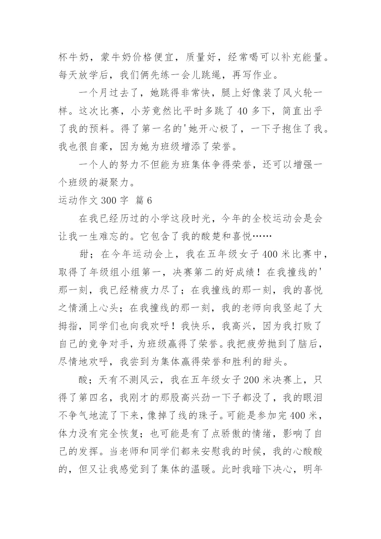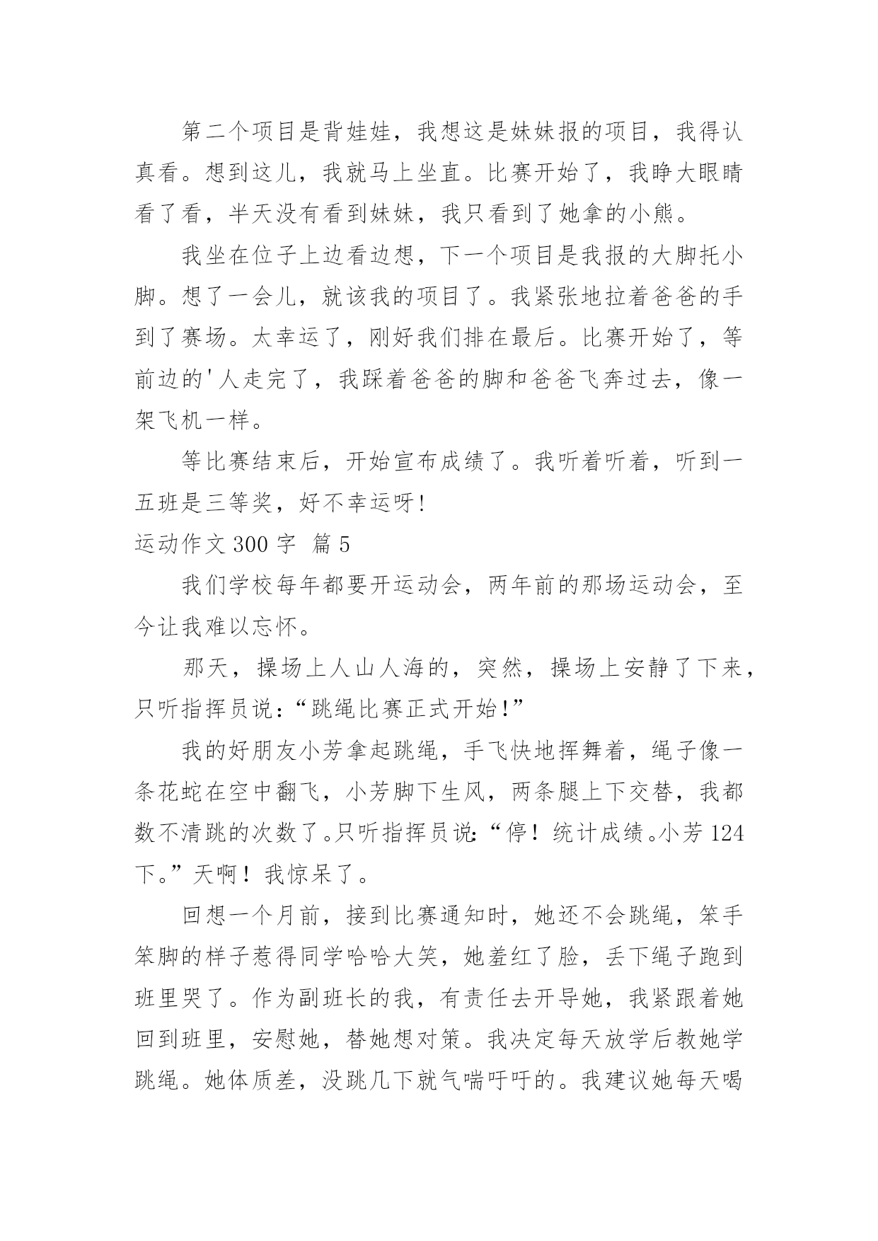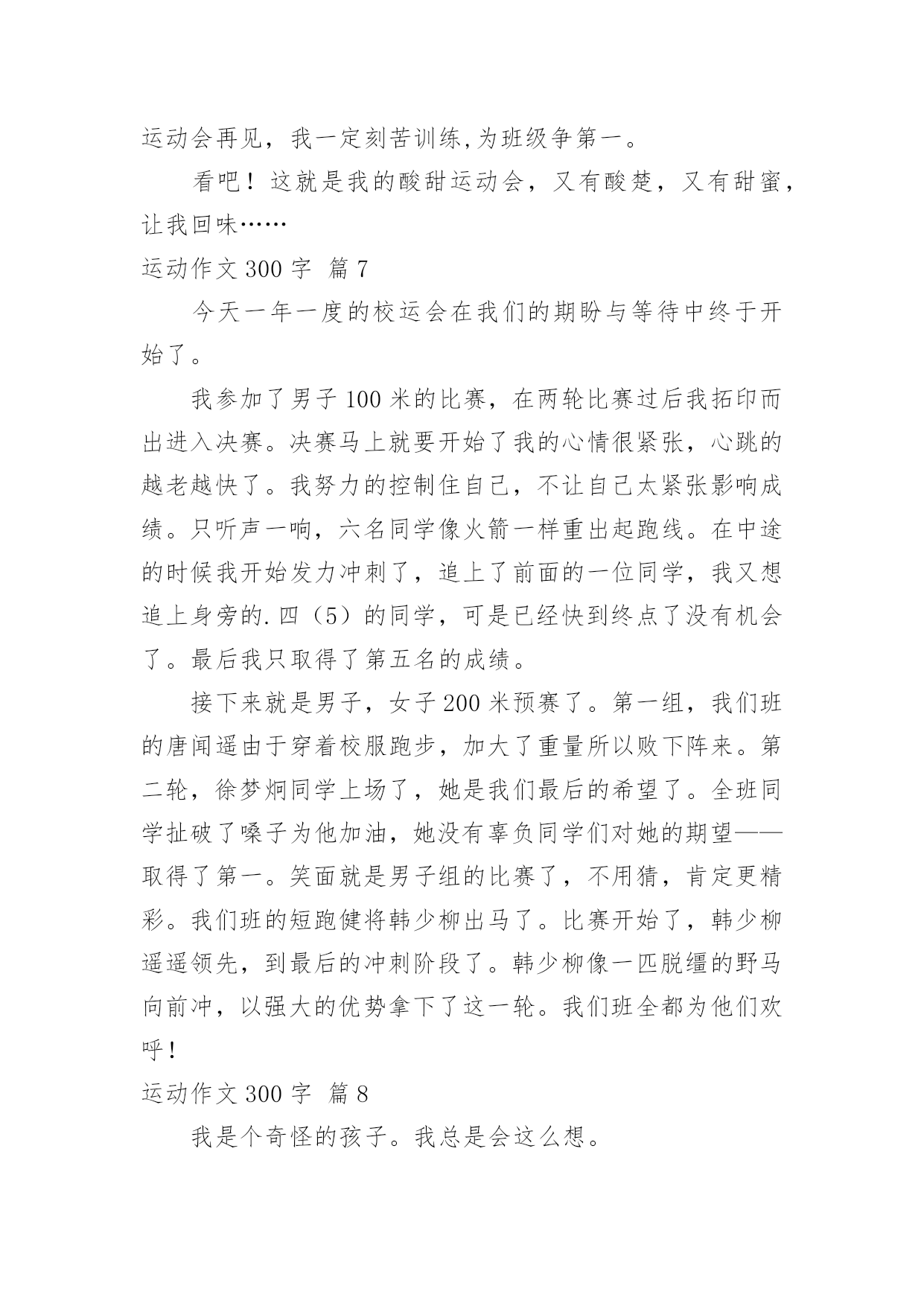 运动作文300字运动作文300字[实用]在学习、工作、生活中,大家都跟作文打过交道吧,作文是人们把记忆中所存储的有关知识、经验和思想用书面形式表达出来的记叙方式。相信很多朋友都对写作文感到非常苦恼吧,下面是小编整理的运动作文300字9篇,欢迎大家分享。运动作文300字篇1一听说学校要开运动会,同学们可开心了——沈关强玩起了“桌上轻功”陆华栋手舞足蹈了起来……其实开运动会是“醉翁之意不在酒”他们是高兴可以带大包小包的零食,可以一饱口福了。自从学校允许学生开运动会可以随身带一些零食之后,原本充满活力的运动会摇身一变——成了一个活脱脱的零食展销会。刚到操场上,同学们的嘴就迫不及待地“开工”了。根本无心理会运动会的进程,也没有人会为运动员呐喊加油,大大影响了运动会的效果。走了,还不忘留下一些“战利品”——满地的垃圾。我们班的陆华栋是“零食集团”的一员。每次开运动会他带的零食最多,他解决零食的`速度最快,留下的“战利品”最多……正版“散财童子”。我希望学校能对同学们携带的零食数量能作一个规定。让学校的运动会≠零食会,让我们拥有一个充满活力的运动会,充满热情的运动会。运动作文300字篇2今天一年一度的春季运动会开始了!一路上我们迈着欢快的步伐来到校园。8:00的时候,开始入场了。刘校长宣布春季运动会现在正式开始!宣布完,我们回到本班的位置上,观看比赛。首先比的是男甲一百米,其次是女甲一百米;接着又比了许多项目。到了最后一个项目,是我期待已久的接力赛。比赛开始了,随着裁判的一声枪响,运动员们像离弦的箭一样,在赛道上尽情地奔跑着。我们班的第一棒虽然有些落后,但很快又追上了。第三棒又落后了,第四棒的'运动员可是我们班的“运动健将”!第四棒的运动员拼尽全力向终点线跑去,可是由于第三棒的落后。没有赢得第一名,只得了第二名。但是没关系,因为我们努力了,参与了。接下来是女子接力赛。裁判员一声令下,我们班的第一棒运动员像脱缰的野马一般,超过了一名运动员,两名运动员,三名运动员。我们班暂居第一。第二名运动员随后飞奔出去,第三棒,第四棒,冲刺!耶!我们班赢得了第一名。我们欢呼着,大笑着。享受着因胜利而喜悦。这次运动会,有笑有泪,有苦有甜,有失望,又有快乐。运动作文300字篇3我是个身高比较矮的小女生,让大家看去好像还在读一年级似的。我有一张胖嘟嘟的小脸蛋,滑滑的,平时,刘童欣和一些女同学都爱摸我的小脸蛋。我的.特长当然就是唱歌了。音乐课上,我和丁晨当过领唱员呢!反正,只要遇到唱歌,我绝不会差到哪去的。别看我长得小巧玲珑的,可爱的样子,其实我可爱运动了!比如:滑板啊、溜冰啊、两轮自行车啊……我都会。但我最擅长滑板了。在一个阳光明媚的早晨我驾驶着滑板,和一个小伙伴到小区广场去玩。我才刚从家里出发,就发现一排凹凸不平的石头,挡住了我的去路。这时,我用后脚使劲地跺了滑板的后端,紧接着,前端立刻翘了起来,嘻嘻,过这排石头,真是张飞吃豆芽——小菜一碟呀!到了那,我就开始练习了。我学滑板的技巧可多了。比如蹲下来边捡东西,边滑;站地笔直,然后和朋友转圈圈;在滑板上故意让自己站地东倒西歪,然后来调整自己正确的位置……这些花招都是我小舅舅教我的。一旁的哥哥姐姐看了,连连鼓掌,啧啧称赞道:“这位小朋友可真棒啊,比我滑地还好呢!”,我听了太兴奋,想要一蹦三尺高,谁知,我摔了个四脚朝天,哦,我已经忘记自己还在滑板上呢这就是我,一个喜爱运动的小女孩!运动作文300字篇4今天下午,我们召开亲子运动会。我们班到达操场后,我一看,操场上全是椅子,椅子都是绿色的,像草坪一样。亲子运动会开始了。第一个项目是抬花轿。比赛开始了,所有的家长抬着孩子飞奔过去,就像赛车一样。比赛结束了,张晨硕告诉我,抬花轿很好玩。第二个项目是背娃娃,我想这是妹妹报的项目,我得认真看。想到这儿,我就马上坐直。比赛开始了,我睁大眼睛看了看,半天没有看到妹妹,我只看到了她拿的小熊。我坐在位子上边看边想,下一个项目是我报的大脚托小脚。想了一会儿,就该我的项目了。我紧张地拉着爸爸的手到了赛场。太幸运了,刚好我们排在最后。比赛开始了,等前边的'人走完了,我踩着爸爸的脚和爸爸飞奔过去,像一架飞机一样。等比赛结束后,开始宣布成绩了。我听着听着,听到一五班是三等奖,好不幸运呀!运动作文300字篇5我们学校每年都要开运动会,两年前的那场运动会,至今让我难以忘怀。那天,操场上人山人海的,突然,操场上安静了下来,只听指挥员说:“跳绳比赛正式开始!”我的好朋友小芳拿起跳绳,手飞快地挥舞着,绳子像一条花蛇在空中翻飞,小芳脚下生风,两条腿上下交替,我都数不清跳的次数了。只听指挥员说:“停!统计成绩。小芳124下。”天啊!我惊呆了。回想一个月前,接到比赛通知时,她还不会跳绳,笨手笨脚的样子惹得同学哈哈大笑,她羞红了脸,丢下绳子跑到班里哭了。作为副