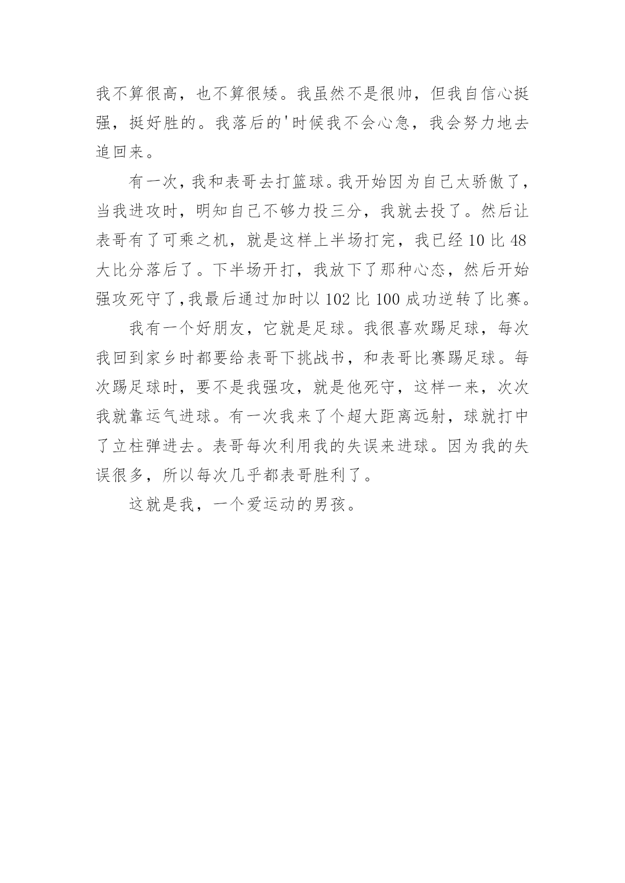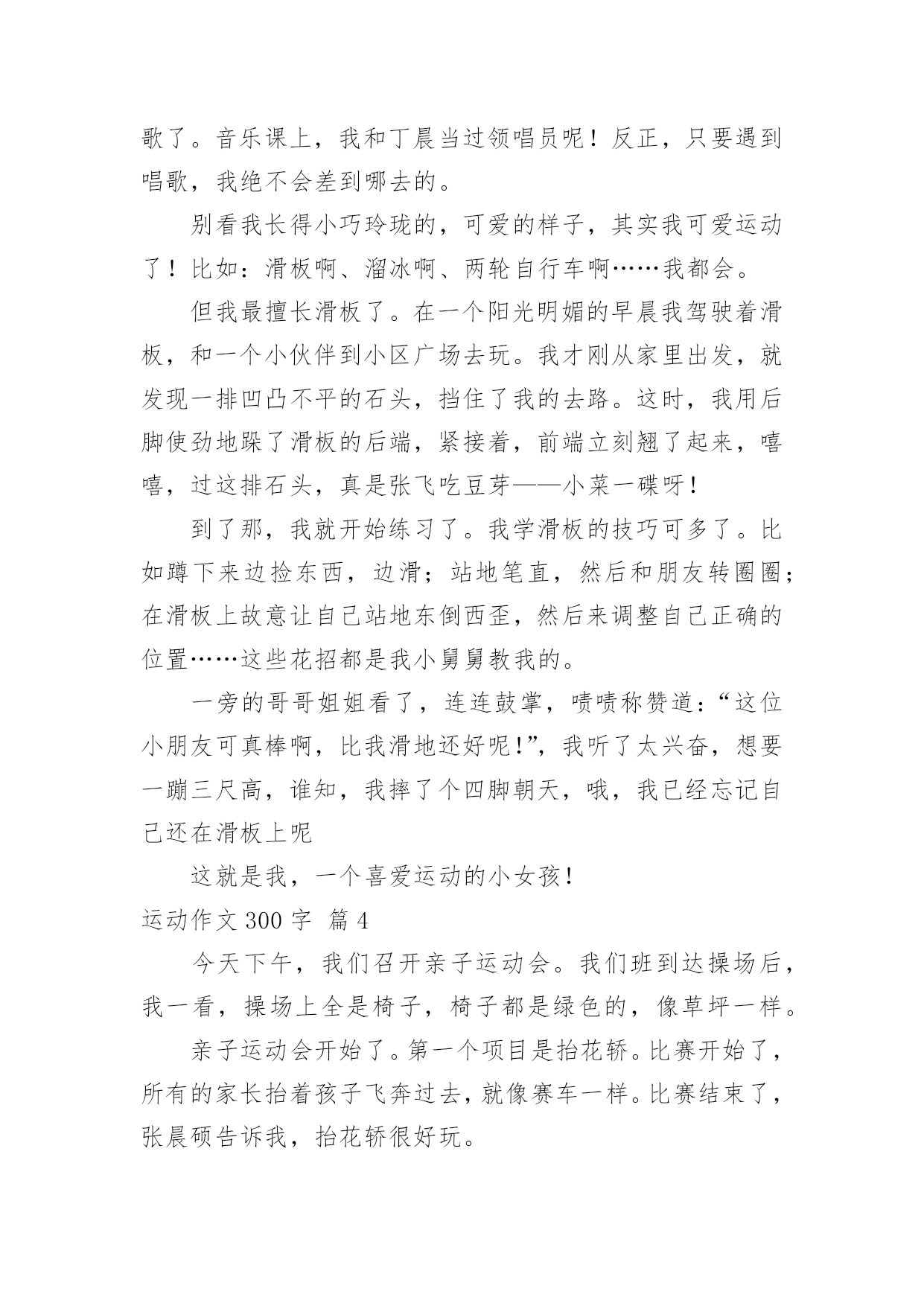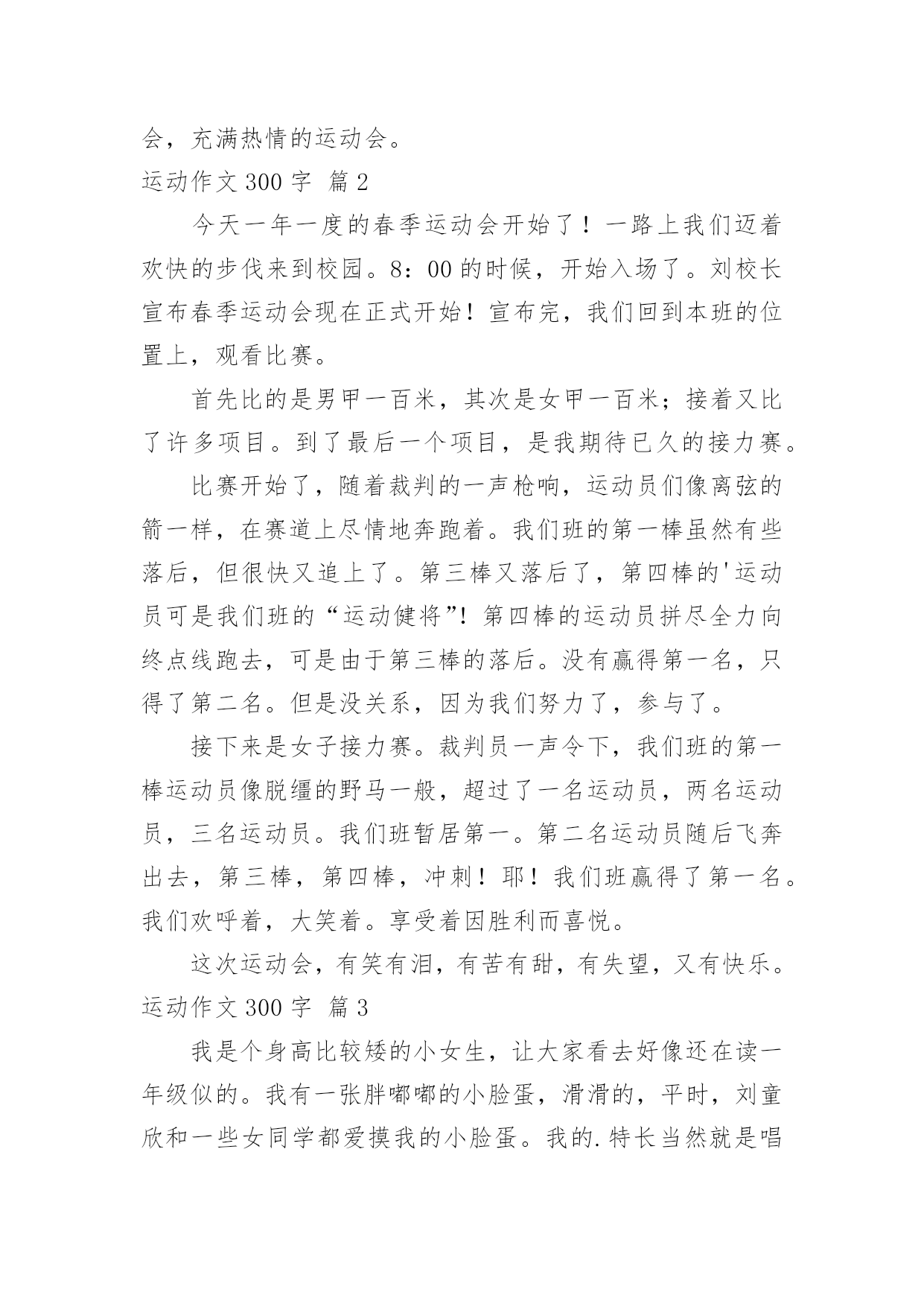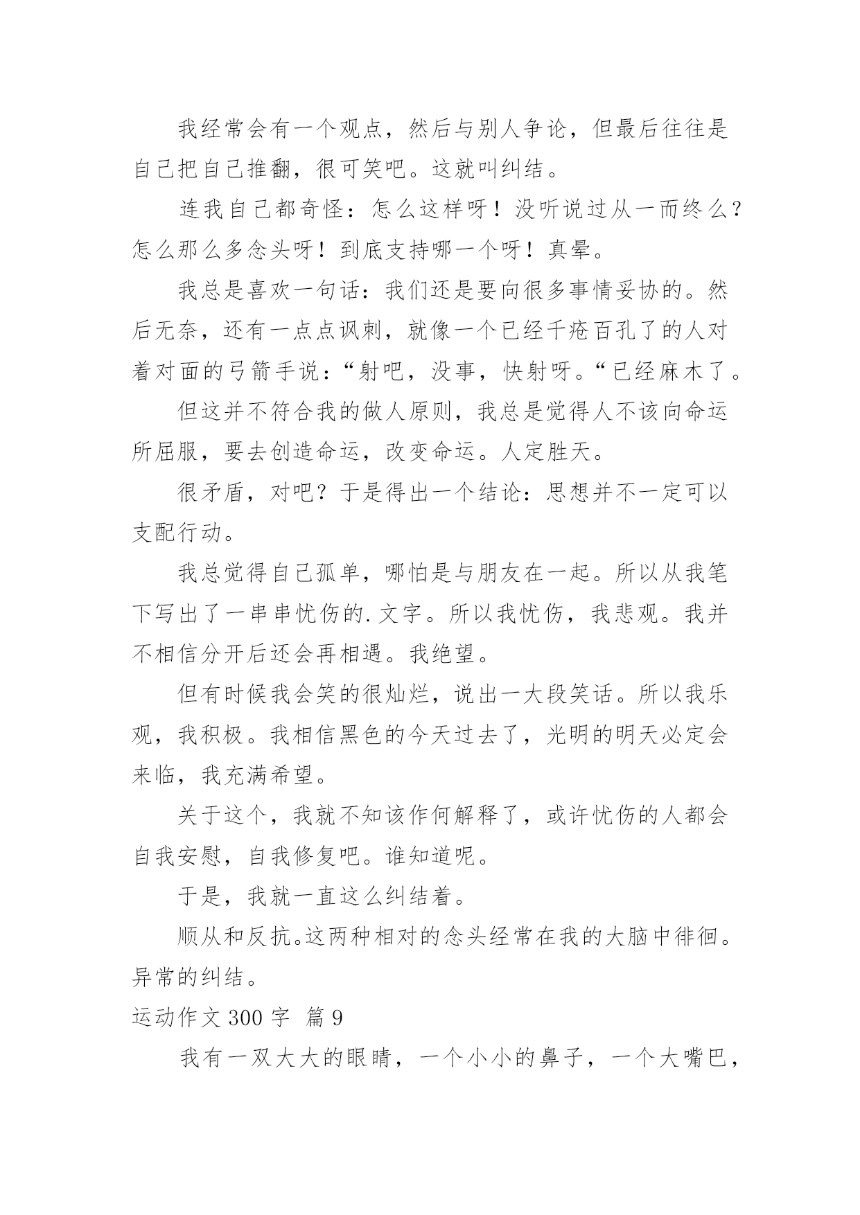 运动作文300字运动作文300字[实用]在学习、工作、生活中,大家都跟作文打过交道吧,作文是人们把记忆中所存储的有关知识、经验和思想用书面形式表达出来的记叙方式。相信很多朋友都对写作文感到非常苦恼吧,下面是小编整理的运动作文300字9篇,欢迎大家分享。运动作文300字篇1一听说学校要开运动会,同学们可开心了——沈关强玩起了“桌上轻功”陆华栋手舞足蹈了起来……其实开运动会是“醉翁之意不在酒”他们是高兴可以带大包小包的零食,可以一饱口福了。自从学校允许学生开运动会可以随身带一些零食之后,原本充满活力的运动会摇身一变——成了一个活脱脱的零食展销会。刚到操场上,同学们的嘴就迫不及待地“开工”了。根本无心理会运动会的进程,也没有人会为运动员呐喊加油,大大影响了运动会的效果。走了,还不忘留下一些“战利品”——满地的垃圾。我们班的陆华栋是“零食集团”的一员。每次开运动会他带的零食最多,他解决零食的`速度最快,留下的“战利品”最多……正版“散财童子”。我希望学校能对同学们携带的零食数量能作一个规定。让学校的运动会≠零食会,让我们拥有一个充满活力的运动会,充满热情的运动会。运动作文300字篇2今天一年一度的春季运动会开始了!一路上我们迈着欢快的步伐来到校园。8:00的时候,开始入场了。刘校长宣布春季运动会现在正式开始!宣布完,我们回到本班的位置上,观看比赛。首先比的是男甲一百米,其次是女甲一百米;接着又比了许多项目。到了最后一个项目,是我期待已久的接力赛。比赛开始了,随着裁判的一声枪响,运动员们像离弦的箭一样,在赛道上尽情地奔跑着。我们班的第一棒虽然有些落后,但很快又追上了。第三棒又落后了,第四棒的'运动员可是我们班的“运动健将”!第四棒的运动员拼尽全力向终点线跑去,可是由于第三棒的落后。没有赢得第一名,只得了第二名。但是没关系,因为我们努力了,参与了。接下来是女子接力赛。裁判员一声令下,我们班的第一棒运动员像脱缰的野马一般,超过了一名运动员,两名运动员,三名运动员。我们班暂居第一。第二名运动员随后飞奔出去,第三棒,第四棒,冲刺!耶!我们班赢得了第一名。我们欢呼着,大笑着。享受着因胜利而喜悦。这次运动会,有笑有泪,有苦有甜,有失望,又有快乐。运动作文300字篇3我是个身高比较矮的小女生,让大家看去好像还在读一年级似的。我有一张胖嘟嘟的小脸蛋,滑滑的,平时,刘童欣和一些女同学都爱摸我的小脸蛋。我的.特长当然就是唱歌了。音乐课上,我和丁晨当过领唱员呢!反正,只要遇到唱歌,我绝不会差到哪去的。别看我长得小巧玲珑的,可爱的样子,其实我可爱运动了!比如:滑板啊、溜冰啊、两轮自行车啊……我都会。但我最擅长滑板了。在一个阳光明媚的早晨我驾驶着滑板,和一个小伙伴到小区广场去玩。我才刚从家里出发,就发现一排凹凸不平的石头,挡住了我的去路。这时,我用后脚使劲地跺了滑板的后端,紧接着,前端立刻翘了起来,嘻嘻,过这排石头,真是张飞吃豆芽——小菜一碟呀!到了那,我就开始练习了。我学滑板的技巧可多了。比如蹲下来边捡东西,边滑;站地笔直,然后和朋友转圈圈;在滑板上故意让自己站地东倒西歪,然后来调整自己正确的位置……这些花招都是我小舅舅教我的。一旁的哥哥姐姐看了,连连鼓掌,啧啧称赞道:“这位小朋友可真棒啊,比我滑地还好呢!”,我听了太兴奋,想要一蹦三尺高,谁知,我摔了个四脚朝天,哦,我已经忘记自己还在滑板上呢这就是我,一个喜爱运动的小女孩!运动作文300字篇4今天下午,我们召开亲子运动会。我们班到达操场后,我一看,操场上全是椅子,椅子都是绿色的,像草坪一样。亲子运动会开始了。第一个项目是抬花轿。比赛开始了,所有的家长抬着孩子飞奔过去,就像赛车一样。比赛结束了,张晨硕告诉我,抬花轿很好玩。第二个项目是背娃娃,我想这是妹妹报的项目,我得认真看。想到这儿,我就马上坐直。比赛开始了,我睁大眼睛看了看,半天没有看到妹妹,我只看到了她拿的小熊。我坐在位子上边看边想,下一个项目是我报的大脚托小脚。想了一会儿,就该我的项目了。我紧张地拉着爸爸的手到了赛场。太幸运了,刚好我们排在最后。比赛开始了,等前边的'人走完了,我踩着爸爸的脚和爸爸飞奔过去,像一架飞机一样。等比赛结束后,开始宣布成绩了。我听着听着,听到一五班是三等奖,好不幸运呀!运动作文300字篇5我们学校每年都要开运动会,两年前的那场运动会,至今让我难以忘怀。那天,操场上人山人海的,突然,操场上安静了下来,只听指挥员说:“跳绳比赛正式开始!”我的好朋友小芳拿起跳绳,手飞快地挥舞着,绳子像一条花蛇在空中翻飞,小芳脚下生风,两条腿上下交替,我都数不清跳的次数了。只听指挥员说:“停!统计成绩。小芳124下。”天啊!我惊呆了。回想一个月前,接到比赛通知时,她还不会跳绳,笨手笨脚的样子惹得同学哈哈大笑,她羞红了脸,丢下绳子跑到班里哭了。作为副