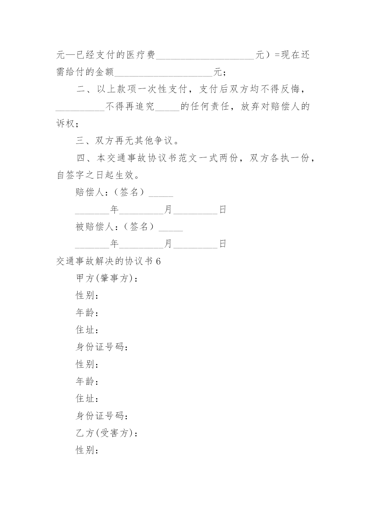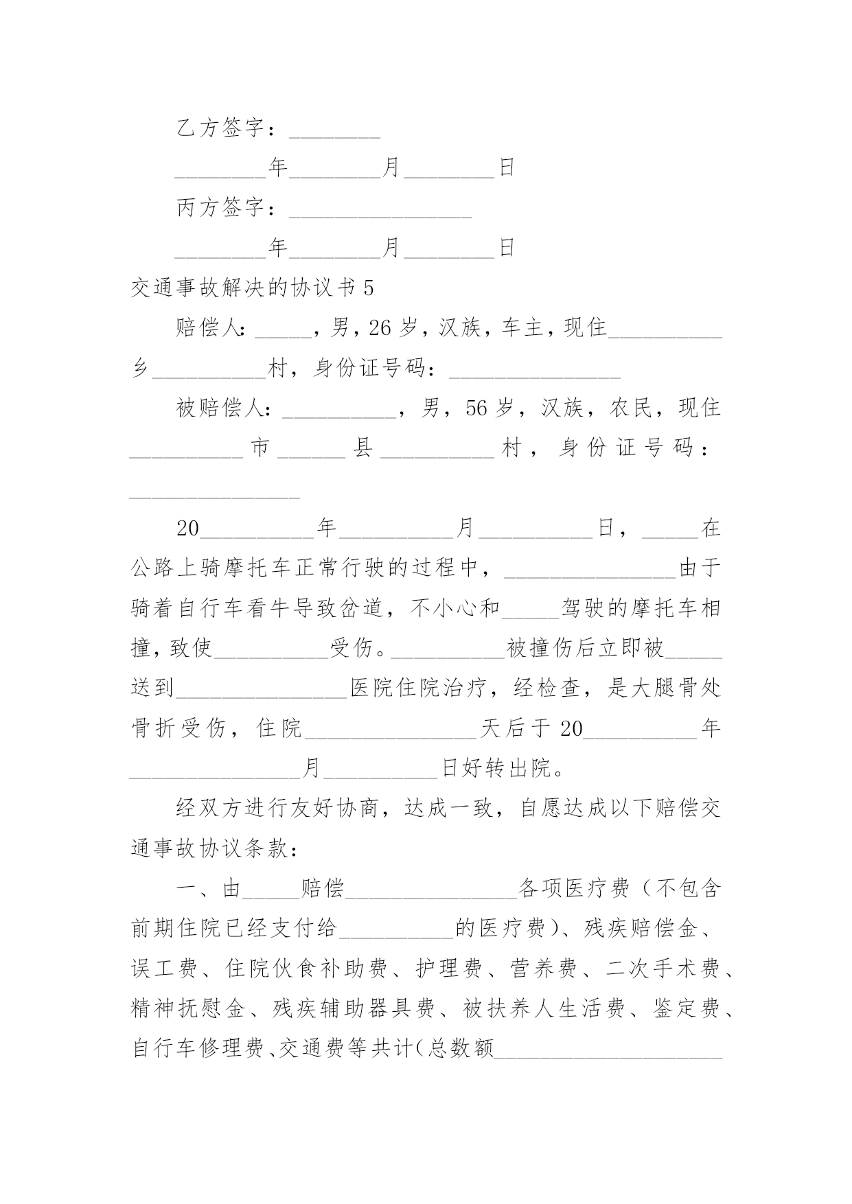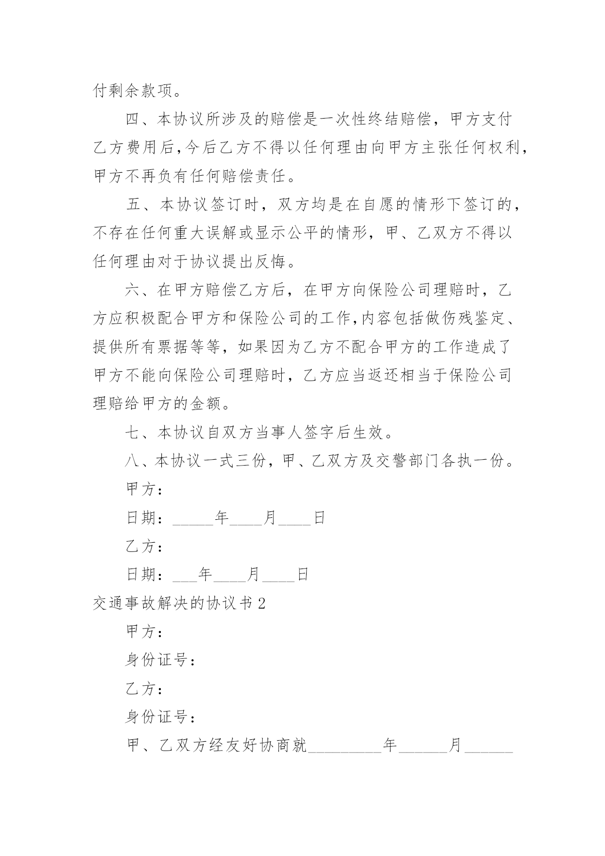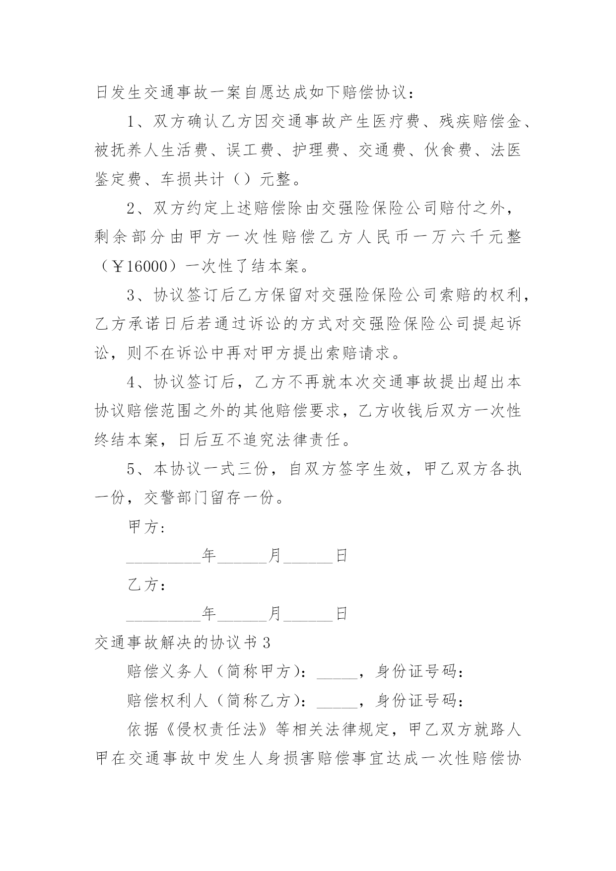 交通事故解决的协议书交通事故解决的协议书随着社会一步步向前发展,协议使用的情况越来越多,签订协议是提高经济效益的手段。到底应如何拟定协议呢?下面是小编整理的交通事故解决的协议书,欢迎阅读,希望大家能够喜欢。交通事故解决的协议书1甲方:身份证号:乙方:身份证号:对于年月日发生的交通事故,经甲、乙双方充分协商一致达成如下协议:一、甲方自愿赔偿乙方住院费___元整。护理费、误工费、后续治疗各项损失赔偿计币捌仟元整(小写:___元)。费用共计壹万元整(小写:___元)二、损失赔偿包括乙方的护理费、误工费、后续治疗费等各项损失赔偿。三、本协议签定时,甲方支付乙方___元,余款在交警大队签订责任认定书后支付。乙方的具体配合工作是指本协议第七条的约定。乙方不配合甲方工作的,甲方有权拒绝支付剩余款项。四、本协议所涉及的赔偿是一次性终结赔偿,甲方支付乙方费用后,今后乙方不得以任何理由向甲方主张任何权利,甲方不再负有任何赔偿责任。五、本协议签订时,双方均是在自愿的情形下签订的,不存在任何重大误解或显示公平的情形,甲、乙双方不得以任何理由对于协议提出反悔。六、在甲方赔偿乙方后,在甲方向保险公司理赔时,乙方应积极配合甲方和保险公司的工作,内容包括做伤残鉴定、提供所有票据等等,如果因为乙方不配合甲方的工作造成了甲方不能向保险公司理赔时,乙方应当返还相当于保险公司理赔给甲方的金额。七、本协议自双方当事人签字后生效。八、本协议一式三份,甲、乙双方及交警部门各执一份。甲方:日期:_____年____月____日乙方:日期:___年____月____日交通事故解决的协议书2甲方:身份证号:乙方:身份证号:甲、乙双方经友好协商就_________年______月______日发生交通事故一案自愿达成如下赔偿协议:1、双方确认乙方因交通事故产生医疗费、残疾赔偿金、被抚养人生活费、误工费、护理费、交通费、伙食费、法医鉴定费、车损共计()元整。2、双方约定上述赔偿除由交强险保险公司赔付之外,剩余部分由甲方一次性赔偿乙方人民币一万六千元整(¥16000)一次性了结本案。3、协议签订后乙方保留对交强险保险公司索赔的权利,乙方承诺日后若通过诉讼的方式对交强险保险公司提起诉讼,则不在诉讼中再对甲方提出索赔请求。4、协议签订后,乙方不再就本次交通事故提出超出本协议赔偿范围之外的其他赔偿要求,乙方收钱后双方一次性终结本案,日后互不追究法律责任。5、本协议一式三份,自双方签字生效,甲乙双方各执一份,交警部门留存一份。甲方:_________年______月______日乙方:_________年______月______日交通事故解决的协议书3赔偿义务人(简称甲方):_____,身份证号码:赔偿权利人(简称乙方):_____,身份证号码:依据《侵权责任法》等相关法律规定,甲乙双方就路人甲在交通事故中发生人身损害赔偿事宜达成一次性赔偿协议书,供双方谨守遵行:一、甲方承诺:一次性赔偿乙方币_____元。一次性赔偿包含但不限于乙方的`医疗费、误工费、护理费、交通费、住院伙食补助费、营养费、伤残赔偿金和精神抚慰金。一次性赔偿金采用银行转账(金额较大时建议采用银行转账)方式支付给乙方;乙方在协议书上签字时应亲笔书写一份收条。二、乙方承诺:1、赔偿协议书签字且收到上述赔偿金之日起,因该起交通事故引起的民事赔偿事宜终结,双方再无其他任何纠纷。乙方及其亲属不得再以诉讼、非诉讼方式向甲方主张任何权利。2、乙方需向甲方提供身份证复印件、门诊病历、处方、住院病案、费用明细清单、诊断证明书、医疗费收据等保险理赔资料。乙方保证提供的全部资料具有真实性、合法性、完整性。乙方需提供其名下的银行账户:因乙方过错提供银行账户引起的纠纷由乙方自行解决且甲方无需再次支付赔偿金(银行转账用)。三、本协议书自签字之日起生效。协议书一式三份,甲方执两份、乙方执一份,每份具有同等法律效力。甲方:日期:_____年_____月_____日乙方:日期:_____年_____月_____日交通事故解决的协议书4甲方:乙方:丙方:________年11月4日,甲方驾驶小型普通客车与由乙方驾驶普通二轮摩托车(搭乘丙方)在德昌县交通路邮电宾馆路段相撞,造成乙方、丙方受伤住院,两车受损的交通事故。现经当事双方协商,达成以下协议:1、乙方、丙方住院期间医疗费用由甲方全部承担(费用已付),伤情自负;2、两车车损修复费用及取车费用由甲方承担(费用已付);3、现由甲方一次性赔偿乙方,丙方各种费用55000.00元(伍万伍仟元整),此款于甲方在报得保险公司赔付款当日在德昌县公安局交警大队特勤中队支付;4、此事故就此协商了结结案,当事双方不得因此事故再发生任何纠纷;5、此协议自签字之日起生效。甲方签字:________年________月_____