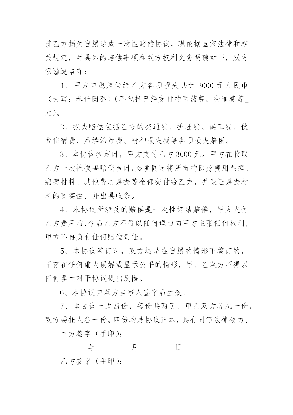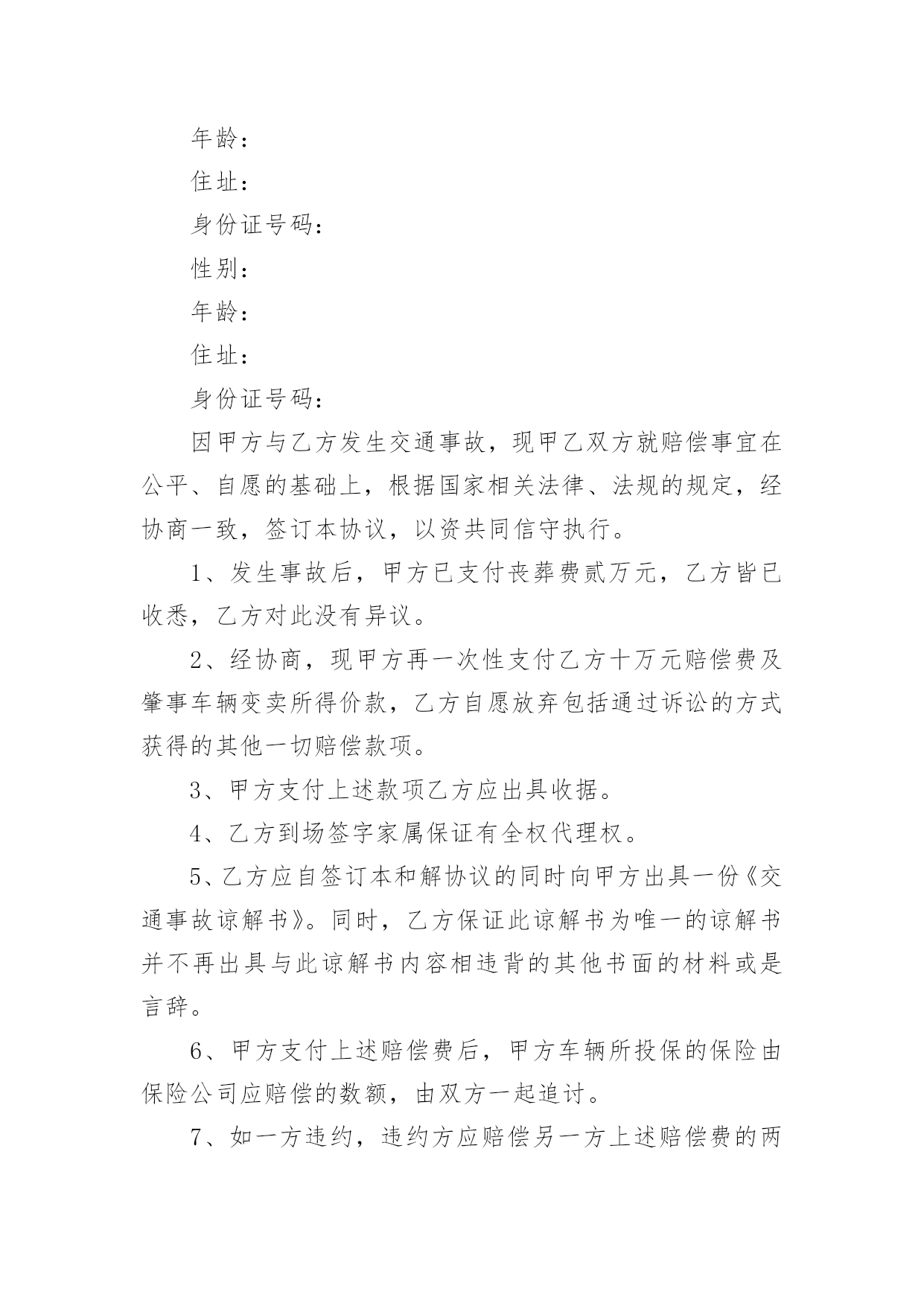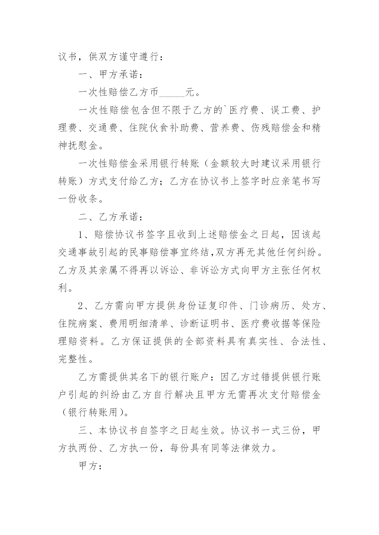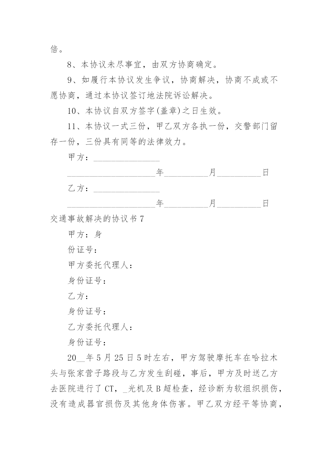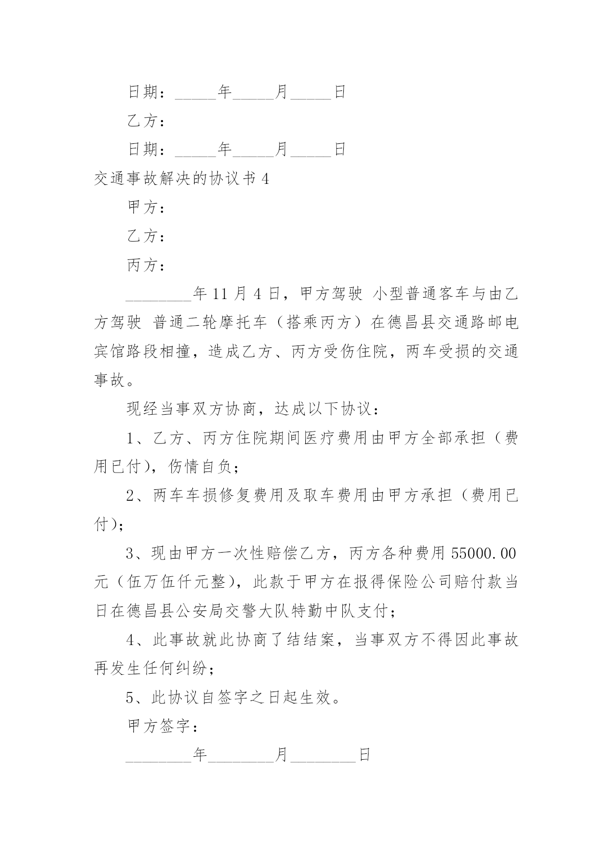 交通事故解决的协议书交通事故解决的协议书随着社会一步步向前发展,协议使用的情况越来越多,签订协议是提高经济效益的手段。到底应如何拟定协议呢?下面是小编整理的交通事故解决的协议书,欢迎阅读,希望大家能够喜欢。交通事故解决的协议书1甲方:身份证号:乙方:身份证号:对于年月日发生的交通事故,经甲、乙双方充分协商一致达成如下协议:一、甲方自愿赔偿乙方住院费___元整。护理费、误工费、后续治疗各项损失赔偿计币捌仟元整(小写:___元)。费用共计壹万元整(小写:___元)二、损失赔偿包括乙方的护理费、误工费、后续治疗费等各项损失赔偿。三、本协议签定时,甲方支付乙方___元,余款在交警大队签订责任认定书后支付。乙方的具体配合工作是指本协议第七条的约定。乙方不配合甲方工作的,甲方有权拒绝支付剩余款项。四、本协议所涉及的赔偿是一次性终结赔偿,甲方支付乙方费用后,今后乙方不得以任何理由向甲方主张任何权利,甲方不再负有任何赔偿责任。五、本协议签订时,双方均是在自愿的情形下签订的,不存在任何重大误解或显示公平的情形,甲、乙双方不得以任何理由对于协议提出反悔。六、在甲方赔偿乙方后,在甲方向保险公司理赔时,乙方应积极配合甲方和保险公司的工作,内容包括做伤残鉴定、提供所有票据等等,如果因为乙方不配合甲方的工作造成了甲方不能向保险公司理赔时,乙方应当返还相当于保险公司理赔给甲方的金额。七、本协议自双方当事人签字后生效。八、本协议一式三份,甲、乙双方及交警部门各执一份。甲方:日期:_____年____月____日乙方:日期:___年____月____日交通事故解决的协议书2甲方:身份证号:乙方:身份证号:甲、乙双方经友好协商就_________年______月______日发生交通事故一案自愿达成如下赔偿协议:1、双方确认乙方因交通事故产生医疗费、残疾赔偿金、被抚养人生活费、误工费、护理费、交通费、伙食费、法医鉴定费、车损共计()元整。2、双方约定上述赔偿除由交强险保险公司赔付之外,剩余部分由甲方一次性赔偿乙方人民币一万六千元整(¥16000)一次性了结本案。3、协议签订后乙方保留对交强险保险公司索赔的权利,乙方承诺日后若通过诉讼的方式对交强险保险公司提起诉讼,则不在诉讼中再对甲方提出索赔请求。4、协议签订后,乙方不再就本次交通事故提出超出本协议赔偿范围之外的其他赔偿要求,乙方收钱后双方一次性终结本案,日后互不追究法律责任。5、本协议一式三份,自双方签字生效,甲乙双方各执一份,交警部门留存一份。甲方:_________年______月______日乙方:_________年______月______日交通事故解决的协议书3赔偿义务人(简称甲方):_____,身份证号码:赔偿权利人(简称乙方):_____,身份证号码:依据《侵权责任法》等相关法律规定,甲乙双方就路人甲在交通事故中发生人身损害赔偿事宜达成一次性赔偿协议书,供双方谨守遵行:一、甲方承诺:一次性赔偿乙方币_____元。一次性赔偿包含但不限于乙方的`医疗费、误工费、护理费、交通费、住院伙食补助费、营养费、伤残赔偿金和精神抚慰金。一次性赔偿金采用银行转账(金额较大时建议采用银行转账)方式支付给乙方;乙方在协议书上签字时应亲笔书写一份收条。二、乙方承诺:1、赔偿协议书签字且收到上述赔偿金之日起,因该起交通事故引起的民事赔偿事宜终结,双方再无其他任何纠纷。乙方及其亲属不得再以诉讼、非诉讼方式向甲方主张任何权利。2、乙方需向甲方提供身份证复印件、门诊病历、处方、住院病案、费用明细清单、诊断证明书、医疗费收据等保险理赔资料。乙方保证提供的全部资料具有真实性、合法性、完整性。乙方需提供其名下的银行账户:因乙方过错提供银行账户引起的纠纷由乙方自行解决且甲方无需再次支付赔偿金(银行转账用)。三、本协议书自签字之日起生效。协议书一式三份,甲方执两份、乙方执一份,每份具有同等法律效力。甲方:日期:_____年_____月_____日乙方:日期:_____年_____月_____日交通事故解决的协议书4甲方:乙方:丙方:________年11月4日,甲方驾驶小型普通客车与由乙方驾驶普通二轮摩托车(搭乘丙方)在德昌县交通路邮电宾馆路段相撞,造成乙方、丙方受伤住院,两车受损的交通事故。现经当事双方协商,达成以下协议:1、乙方、丙方住院期间医疗费用由甲方全部承担(费用已付),伤情自负;2、两车车损修复费用及取车费用由甲方承担(费用已付);3、现由甲方一次性赔偿乙方,丙方各种费用55000.00元(伍万伍仟元整),此款于甲方在报得保险公司赔付款当日在德昌县公安局交警大队特勤中队支付;4、此事故就此协商了结结案,当事双方不得因此事故再发生任何纠纷;5、此协议自签字之日起生效。甲方签字:________年________月_____