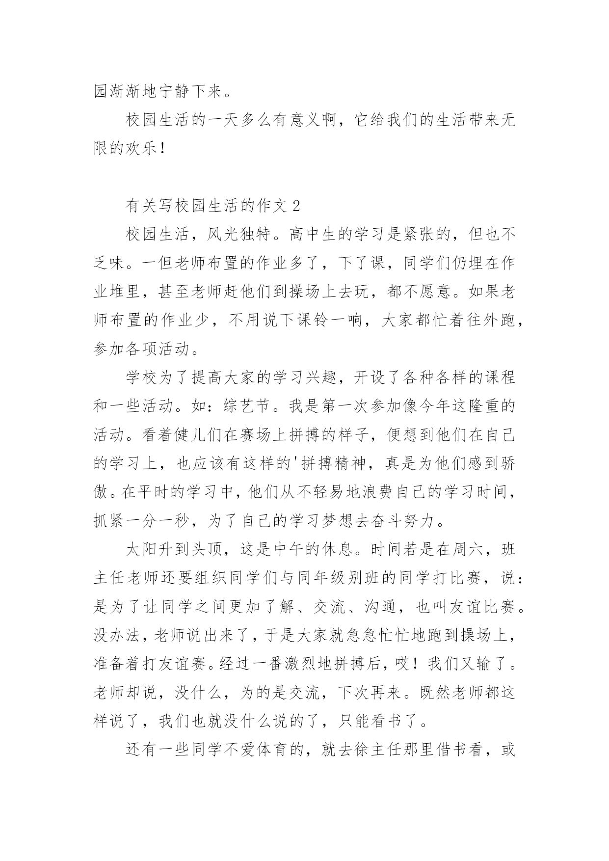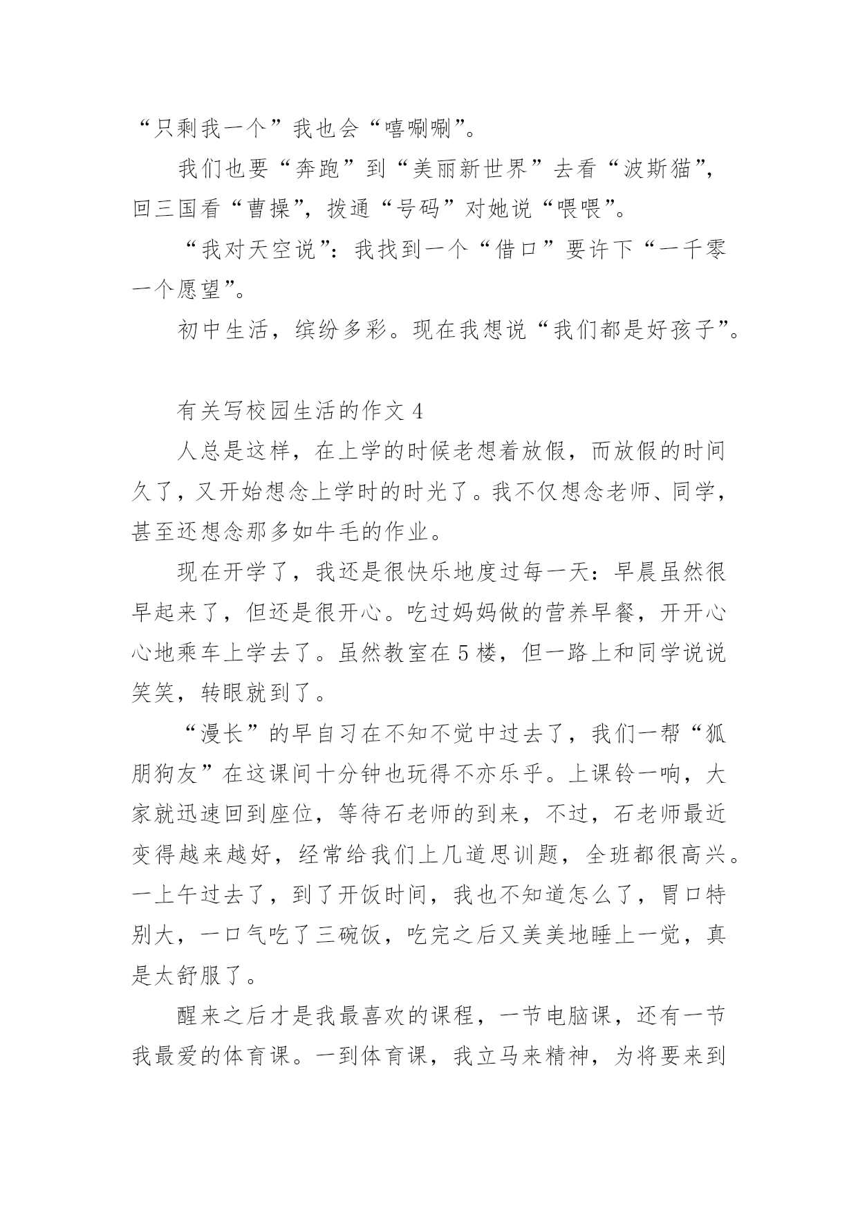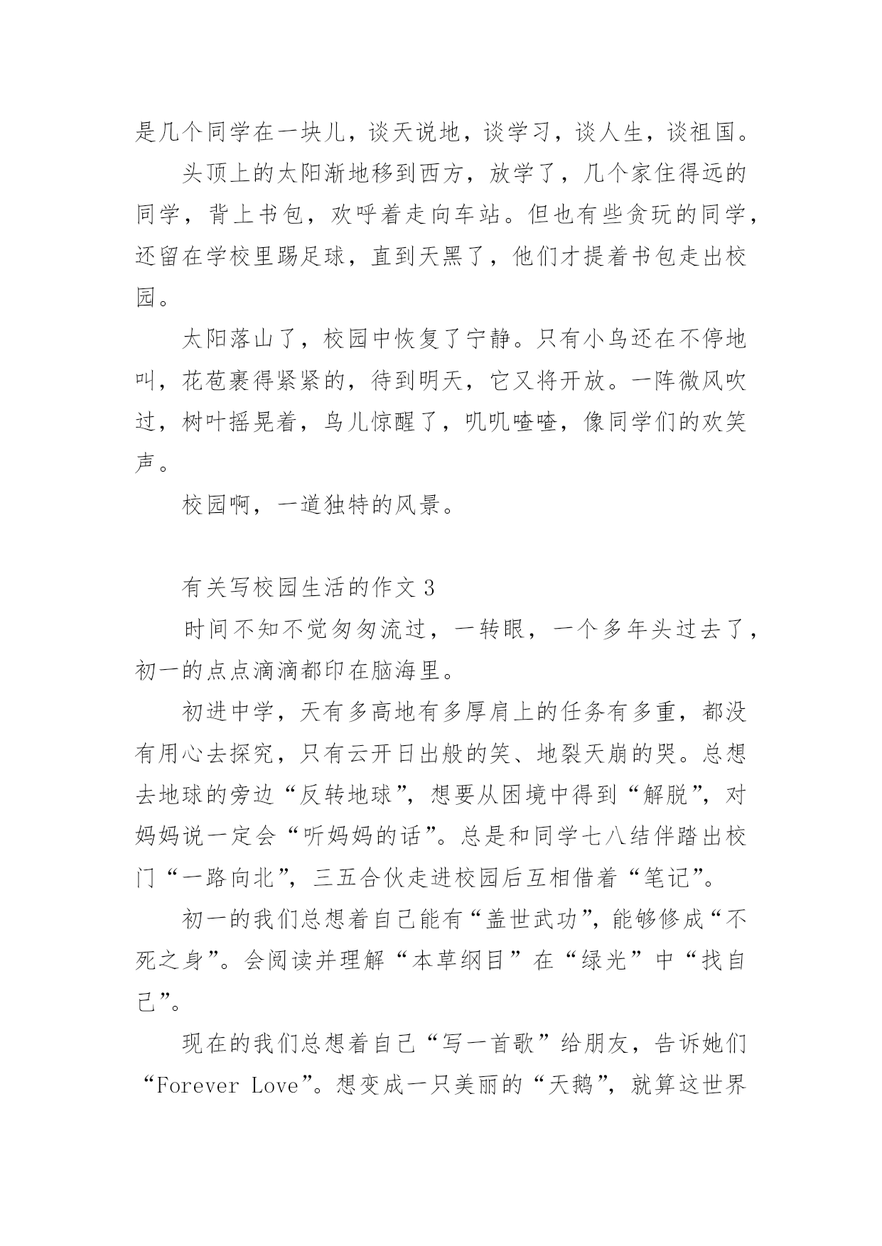写校园生活的作文有关写校园生活的作文4篇有关写校园生活的作文1清晨,金色的阳光洒满了大地,校园了盛开的鲜花显得格外娇艳,一棵棵树木也变得更加翠绿。同学们拿着扫帚,在校园中不断地扫掉灰尘,使校园变得更加干净、美丽,使空气变得更加清新。今天是星期一,要举行升旗仪式。同学们列队来到操场,大家秩序井然地站到各自的位置上,等待着升旗。升旗仪式开始了,全体少先队员庄严地肃立着,向五星红旗致敬。鲜艳的五星红旗随着雄壮的国歌冉冉升起。“我们万众一心,冒着敌人的炮火前进……”在嘹亮的歌声中,升旗仪式结素了,同学们列队回到教室。“丁零零……”上课铃声响另外,在宽敞的教室里,同学们聚精会神地听着老师朗读课文。“黄河之摈,集合着/一群中华民族/优秀的子孙……”老师深情的朗诵,使同学们渐渐地深入沉思。“丁零零”下课的铃声打破校园的宁静,同学们都像小鸟一般飞快地跑出教室,跑到操场上参加自己喜欢的活动,校园里顿时沸腾起来。同学们有的跳橡皮筋,有的玩老鹰捉小鸡,有的踢足球,大家都玩得不亦乐乎。放学了,同学们都背着书包陆续地走出教室,热闹的校园渐渐地宁静下来。校园生活的一天多么有意义啊,它给我们的生活带来无限的欢乐!有关写校园生活的作文2校园生活,风光独特。高中生的学习是紧张的,但也不乏味。一但老师布置的作业多了,下了课,同学们仍埋在作业堆里,甚至老师赶他们到操场上去玩,都不愿意。如果老师布置的作业少,不用说下课铃一响,大家都忙着往外跑,参加各项活动。学校为了提高大家的学习兴趣,开设了各种各样的课程和一些活动。如:综艺节。我是第一次参加像今年这隆重的活动。看着健儿们在赛场上拼搏的样子,便想到他们在自己的学习上,也应该有这样的'拼搏精神,真是为他们感到骄傲。在平时的学习中,他们从不轻易地浪费自己的学习时间,抓紧一分一秒,为了自己的学习梦想去奋斗努力。太阳升到头顶,这是中午的休息。时间若是在周六,班主任老师还要组织同学们与同年级别班的同学打比赛,说:是为了让同学之间更加了解、交流、沟通,也叫友谊比赛。没办法,老师说出来了,于是大家就急急忙忙地跑到操场上,准备着打友谊赛。经过一番激烈地拼搏后,哎!我们又输了。老师却说,没什么,为的是交流,下次再来。既然老师都这样说了,我们也就没什么说的了,只能看书了。还有一些同学不爱体育的,就去徐主任那里借书看,或是几个同学在一块儿,谈天说地,谈学习,谈人生,谈祖国。头顶上的太阳渐地移到西方,放学了,几个家住得远的同学,背上书包,欢呼着走向车站。但也有些贪玩的同学,还留在学校里踢足球,直到天黑了,他们才提着书包走出校园。太阳落山了,校园中恢复了宁静。只有小鸟还在不停地叫,花苞裹得紧紧的,待到明天,它又将开放。一阵微风吹过,树叶摇晃着,鸟儿惊醒了,叽叽喳喳,像同学们的欢笑声。校园啊,一道独特的风景。有关写校园生活的作文3时间不知不觉匆匆流过,一转眼,一个多年头过去了,初一的点点滴滴都印在脑海里。初进中学,天有多高地有多厚肩上的任务有多重,都没有用心去探究,只有云开日出般的笑、地裂天崩的哭。总想去地球的旁边“反转地球”,想要从困境中得到“解脱”,对妈妈说一定会“听妈妈的话”。总是和同学七八结伴踏出校门“一路向北”,三五合伙走进校园后互相借着“笔记”。初一的我们总想着自己能有“盖世武功”,能够修成“不死之身”。会阅读并理解“本草纲目”在“绿光”中“找自己”。现在的我们总想着自己“写一首歌”给朋友,告诉她们“ForeverLove”。想变成一只美丽的“天鹅”,就算这世界“只剩我一个”我也会“嘻唰唰”。我们也要“奔跑”到“美丽新世界”去看“波斯猫”,回三国看“曹操”,拨通“号码”对她说“喂喂”。“我对天空说”:我找到一个“借口”要许下“一千零一个愿望”。初中生活,缤纷多彩。现在我想说“我们都是好孩子”。有关写校园生活的作文4人总是这样,在上学的时候老想着放假,而放假的时间久了,又开始想念上学时的时光了。我不仅想念老师、同学,甚至还想念那多如牛毛的作业。现在开学了,我还是很快乐地度过每一天:早晨虽然很早起来了,但还是很开心。吃过妈妈做的营养早餐,开开心心地乘车上学去了。虽然教室在5楼,但一路上和同学说说笑笑,转眼就到了。“漫长”的早自习在不知不觉中过去了,我们一帮“狐朋狗友”在这课间十分钟也玩得不亦乐乎。上课铃一响,大家就迅速回到座位,等待石老师的到来,不过,石老师最近变得越来越好,经常给我们上几道思训题,全班都很高兴。一上午过去了,到了开饭时间,我也不知道怎么了,胃口特别大,一口气吃了三碗饭,吃完之后又美美地睡上一觉,真是太舒服了。醒来之后才是我最喜欢的课程,一节电脑课,还有一节我最爱的体育课。一到体育课,我立马来精神,为将要来到的体能训练做准备,可谁知是近距离定位投篮,虽然对同学们来说是个大挑战,可对我和蔡珂圯这俩老篮球队队员来说,简直