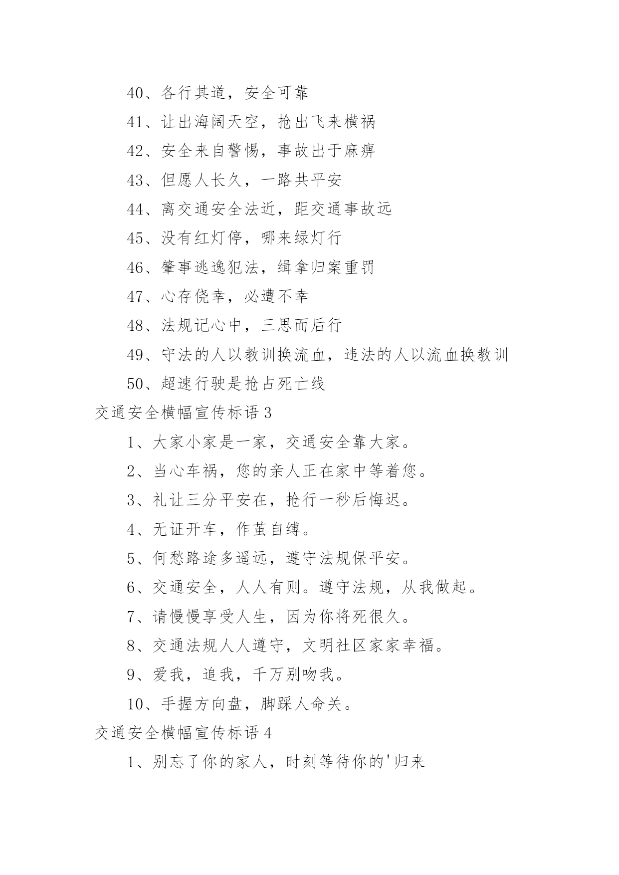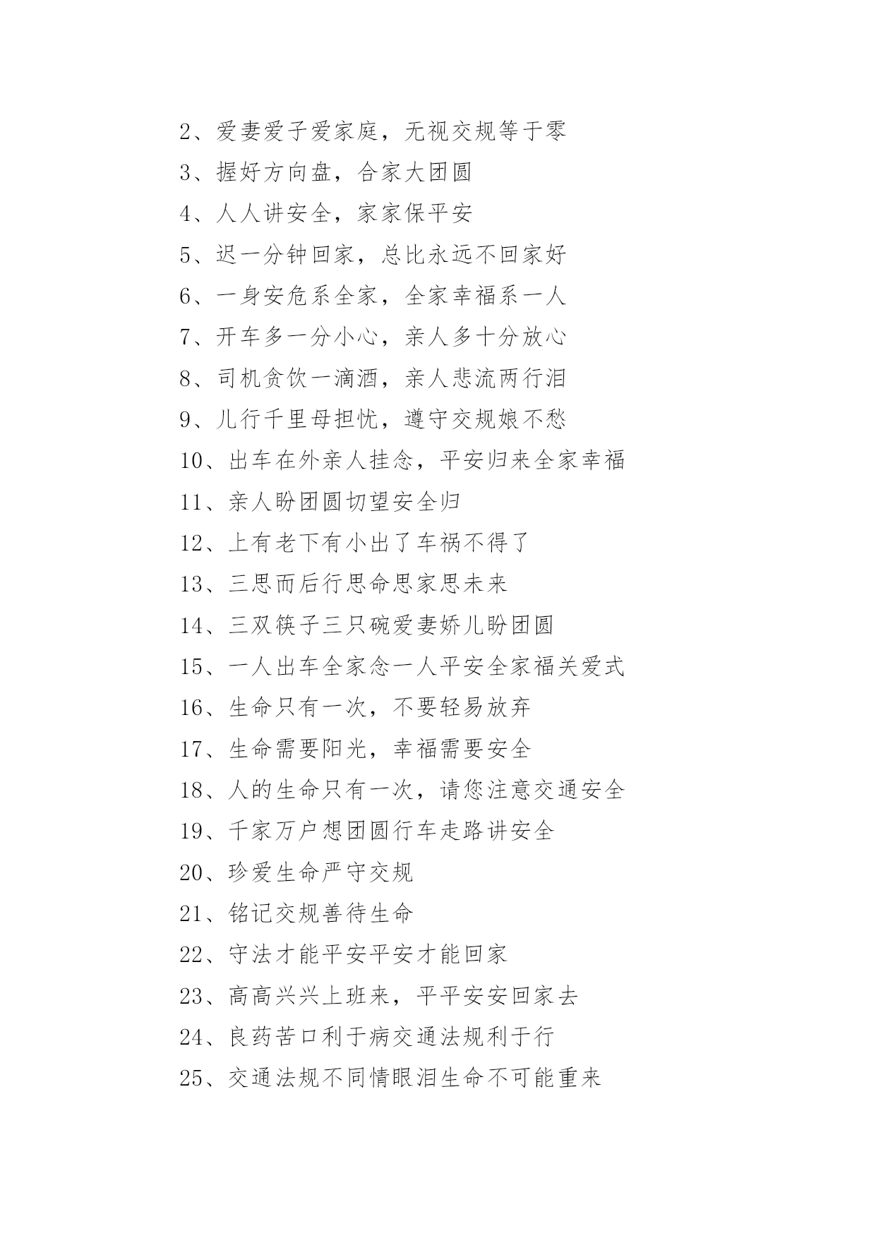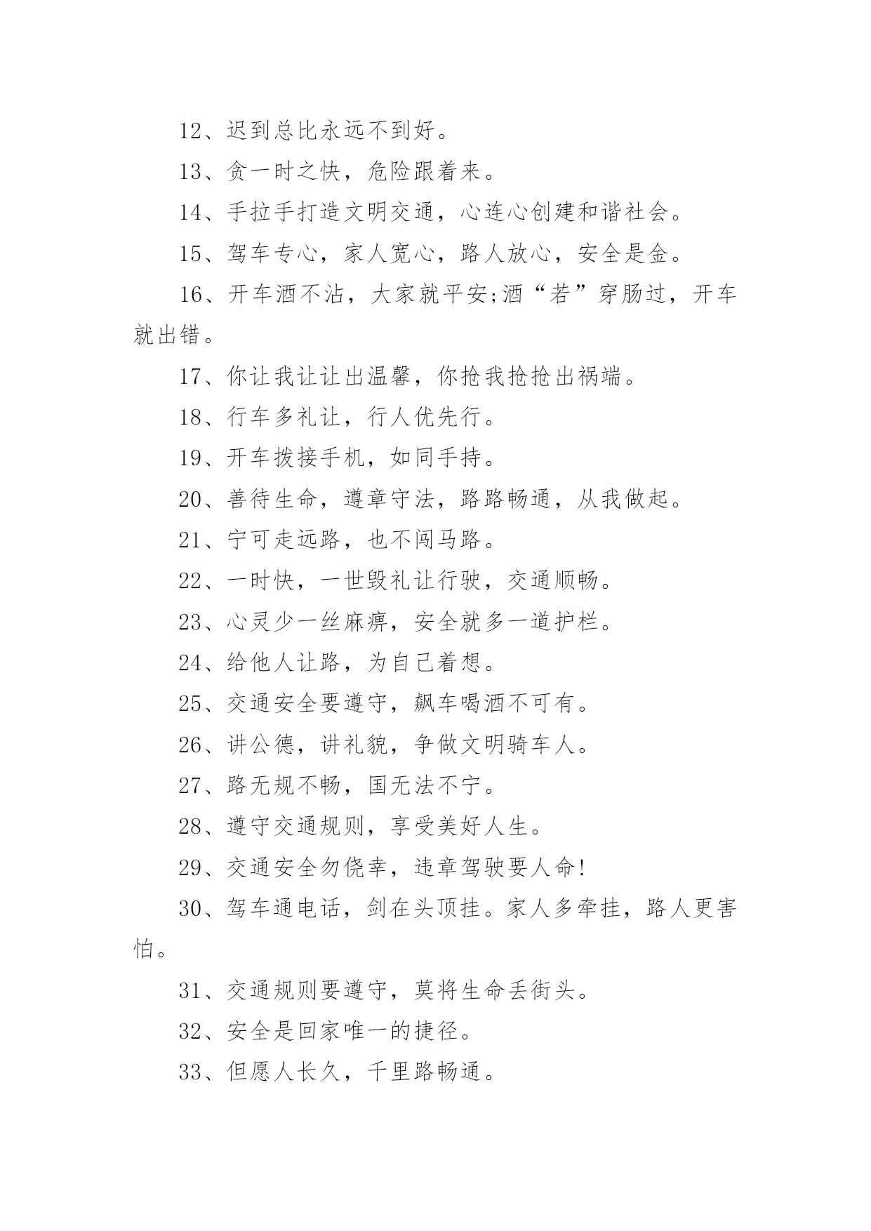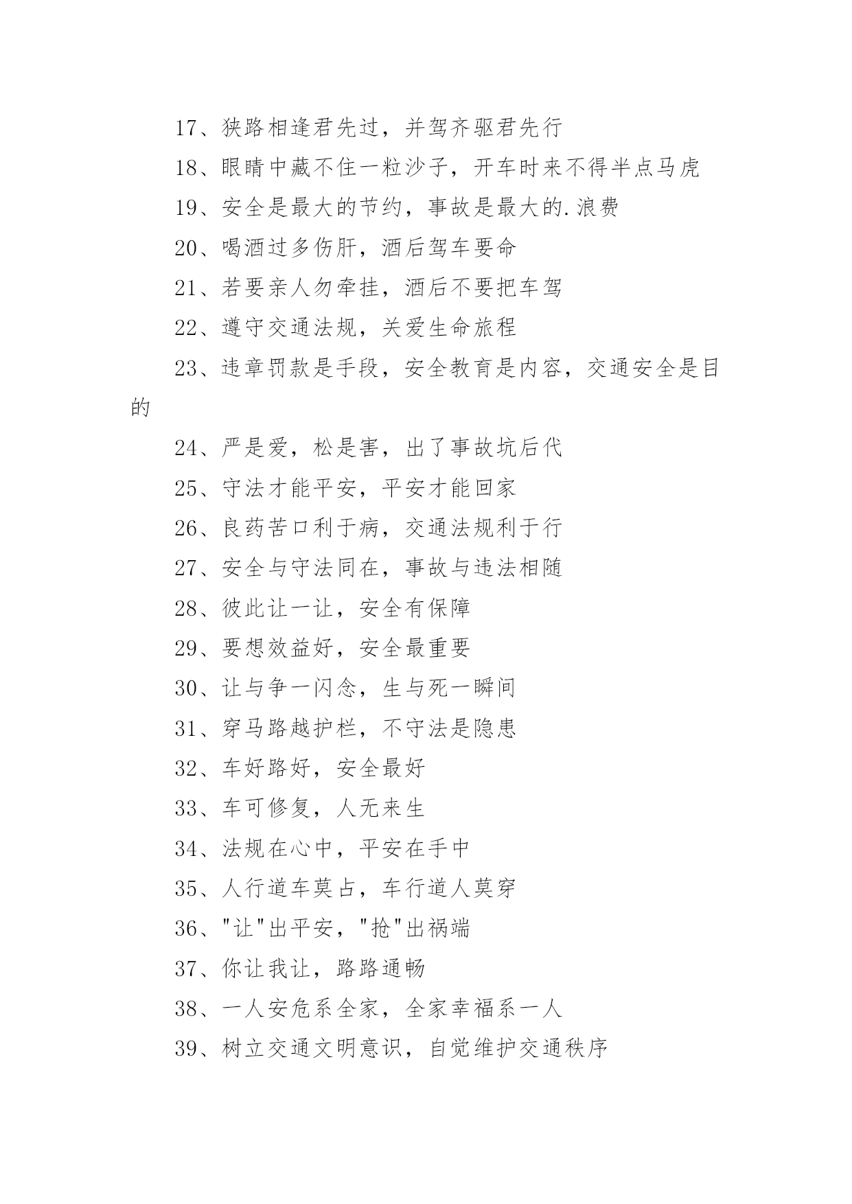交通安全横幅宣传标语交通安全横幅宣传标语在日常的学习、工作、生活中,大家一定没少看到过标语吧,标语是指文字简练、意义鲜明的宣传、鼓动口号。你所见过的标语是什么样的呢?下面是小编整理的交通安全横幅宣传标语,仅供参考,大家一起来看看吧。交通安全横幅宣传标语11、不追不跑不打闹,平平安安到学校。2、我要快乐,不要悲伤,爸爸开车不要喝酒。3、快快乐乐出门去,平平安安回家来。4、人人关心交通安全,路路小心伴您平安。5、红灯亮时,管好你的'脚步;绿灯亮时,管好你的速度!6、靠边接手机,疲劳请休息,安全带要系,请别拼运气。7、交通规则看清楚,开车上路不辛苦。8、谨慎驾驶千趟少大意行车一回多。9、拐弯路面尚危险,降速行驶好相闪,虽然车辆有投险,安全意识不得减。10、红灯停,绿灯行,不越线,不抢行。11、开车拨接电话,行人危险大。12、迟到总比永远不到好。13、贪一时之快,危险跟着来。14、手拉手打造文明交通,心连心创建和谐社会。15、驾车专心,家人宽心,路人放心,安全是金。16、开车酒不沾,大家就平安;酒“若”穿肠过,开车就出错。17、你让我让让出温馨,你抢我抢抢出祸端。18、行车多礼让,行人优先行。19、开车拨接手机,如同手持。20、善待生命,遵章守法,路路畅通,从我做起。21、宁可走远路,也不闯马路。22、一时快,一世毁礼让行驶,交通顺畅。23、心灵少一丝麻痹,安全就多一道护栏。24、给他人让路,为自己着想。25、交通安全要遵守,飙车喝酒不可有。26、讲公德,讲礼貌,争做文明骑车人。27、路无规不畅,国无法不宁。28、遵守交通规则,享受美好人生。29、交通安全勿侥幸,违章驾驶要人命!30、驾车通电话,剑在头顶挂。家人多牵挂,路人更害怕。31、交通规则要遵守,莫将生命丢街头。32、安全是回家唯一的捷径。33、但愿人长久,千里路畅通。34、请您上下公共汽车时切勿从车前车后猛跑!35、开车路上马大哈,随时随地把命搭。36、礼让礼让,人车无恙。37、交通规则若遵守,全国各地安心走。38、文明行车千里共婵娟,遵纪守法万家得团圆。39、只要你我多用心,交通恶运不降临。40、酒后驾车,拿命。交通安全横幅宣传标语21、十次肇事九次快,莫和死神去比赛2、文明礼让安全在,瞬间麻痹事故来3、人要安全靠右行,车要安全靠慢行4、实线虚线斑马线,都是生命安全线5、虽为坦途——超速者戒;纵有捷径——乱穿者止6、超车超速痛快一时,酿成车祸悔恨一生7、礼让三分平安在,抢行一秒后悔迟8、道路非比球场,不要合理冲撞9、骑车请戴安全帽,流汗总比流血好10、爱妻爱子爱家庭,无视交规等于零11、安全带常系生命线,红绿灯常护遵章人12、乱穿马路最危险,文明行路保安全13、违章横穿高速路,难免踏上黄泉路14、心无交规,路有坎坷15、你让我让,安全保障;我争他抢,只有伤亡16、大事小事不如不出事,早到快到不如安全到17、狭路相逢君先过,并驾齐驱君先行18、眼睛中藏不住一粒沙子,开车时来不得半点马虎19、安全是最大的节约,事故是最大的.浪费20、喝酒过多伤肝,酒后驾车要命21、若要亲人勿牵挂,酒后不要把车驾22、遵守交通法规,关爱生命旅程23、违章罚款是手段,安全教育是内容,交通安全是目的24、严是爱,松是害,出了事故坑后代25、守法才能平安,平安才能回家26、良药苦口利于病,交通法规利于行27、安全与守法同在,事故与违法相随28、彼此让一让,安全有保障29、要想效益好,安全最重要30、让与争一闪念,生与死一瞬间31、穿马路越护栏,不守法是隐患32、车好路好,安全最好33、车可修复,人无来生34、法规在心中,平安在手中35、人行道车莫占,车行道人莫穿36、"让"出平安,"抢"出祸端37、你让我让,路路通畅38、一人安危系全家,全家幸福系一人39、树立交通文明意识,自觉维护交通秩序40、各行其道,安全可靠41、让出海阔天空,抢出飞来横祸42、安全来自警惕,事故出于麻痹43、但愿人长久,一路共平安44、离交通安全法近,距交通事故远45、没有红灯停,哪来绿灯行46、肇事逃逸犯法,缉拿归案重罚47、心存侥幸,必遭不幸48、法规记心中,三思而后行49、守法的人以教训换流血,违法的人以流血换教训50、超速行驶是抢占死亡线交通安全横幅宣传标语31、大家小家是一家,交通安全靠大家。2、当心车祸,您的亲人正在家中等着您。3、礼让三分平安在,抢行一秒后悔迟。4、无证开车,作茧自缚。5、何愁路途多遥远,遵守法规保平安。6、交通安全,人人有则。遵守法规,从我做起。7、请慢慢享受人生,因为你将死很久。8、交通法规人人遵守,文明社区家家幸福。9、爱我,追我,千万别吻我。10、手握方向盘,脚踩人命关。交通安全横幅宣传标语41、别忘了你的家人,时刻等待你的'归来2、爱妻爱子爱家庭,无视交规等于零3、握好方向盘,合家大