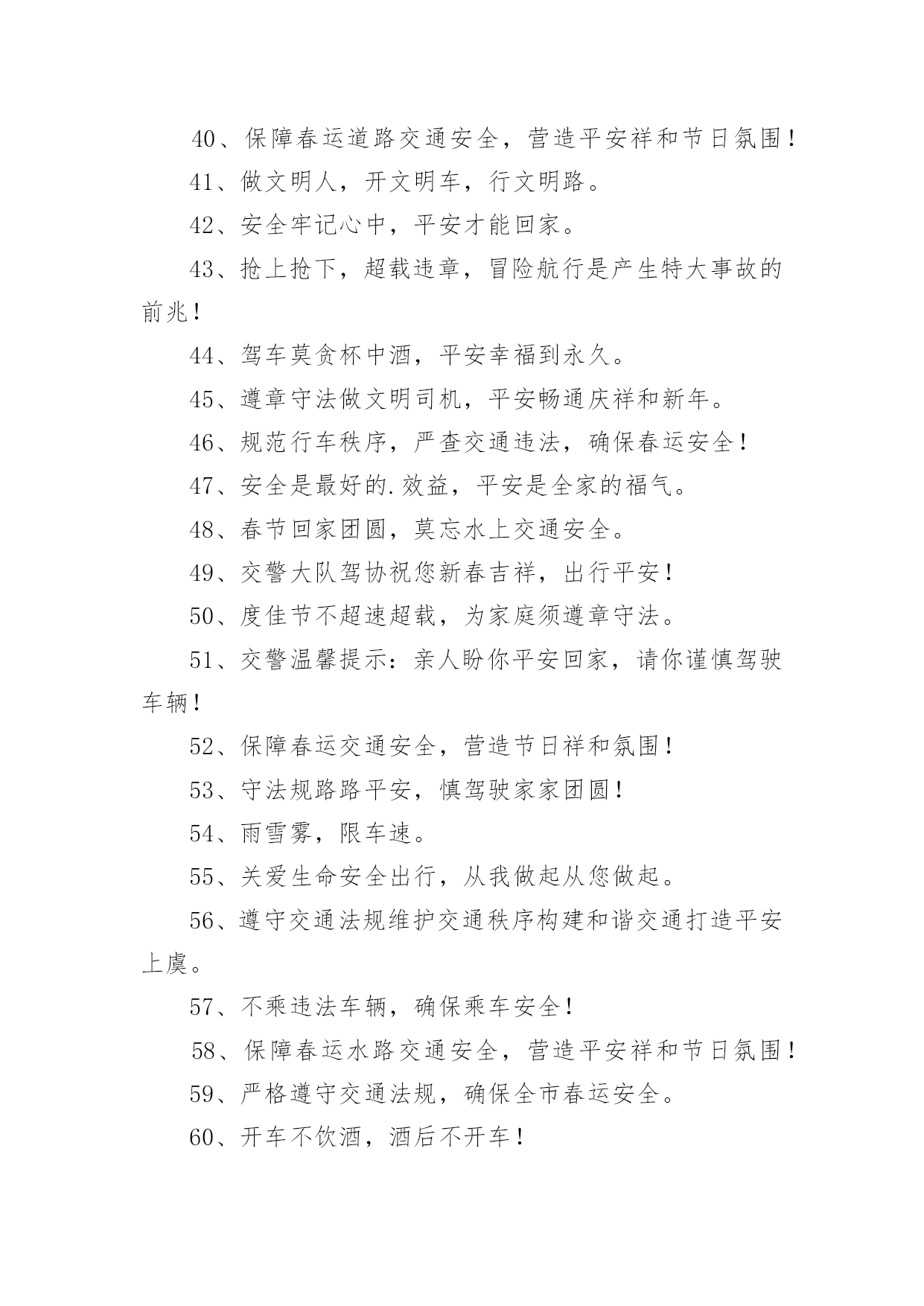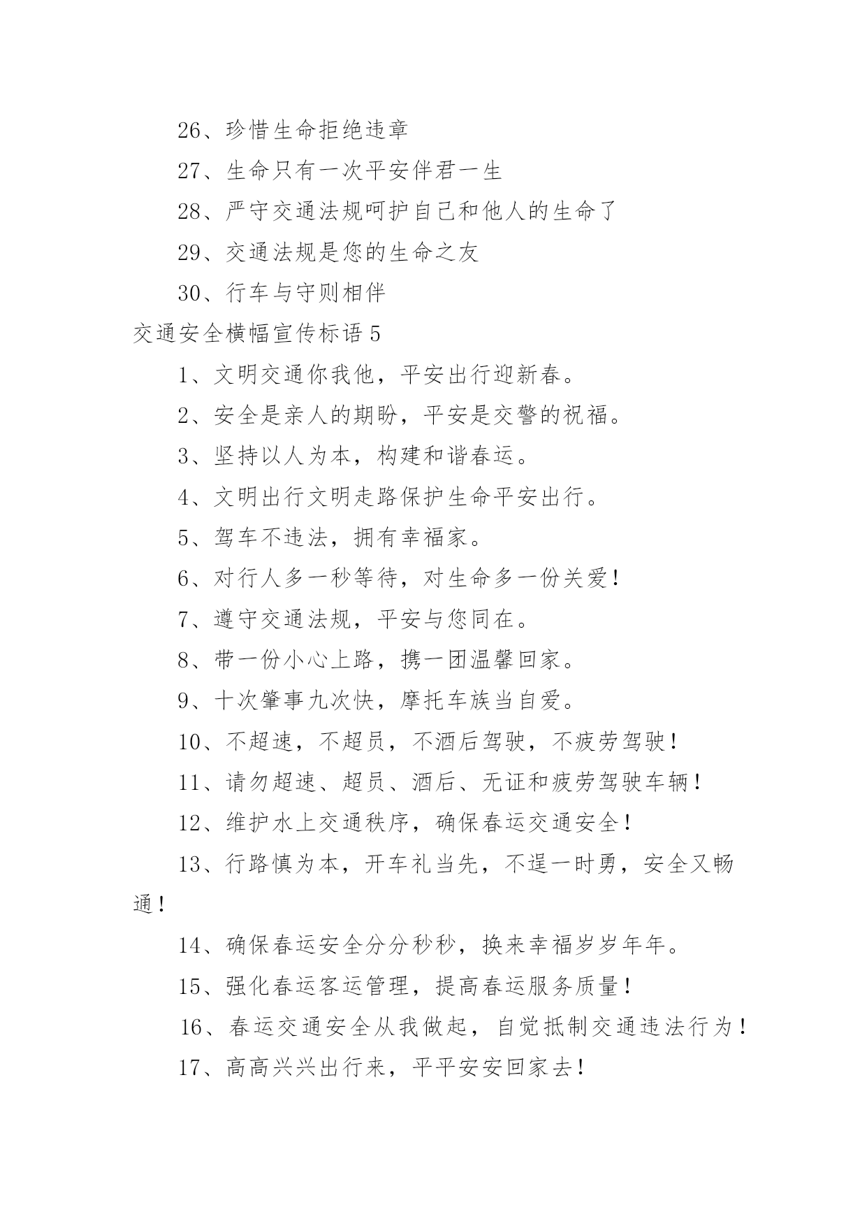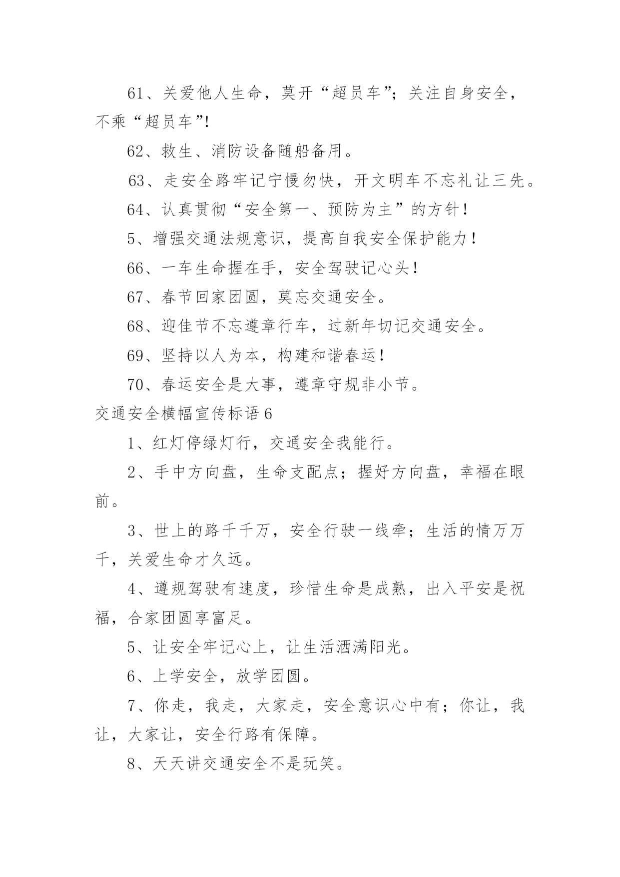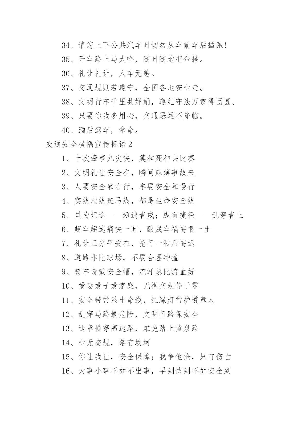 交通安全横幅宣传标语交通安全横幅宣传标语在日常的学习、工作、生活中,大家一定没少看到过标语吧,标语是指文字简练、意义鲜明的宣传、鼓动口号。你所见过的标语是什么样的呢?下面是小编整理的交通安全横幅宣传标语,仅供参考,大家一起来看看吧。交通安全横幅宣传标语11、不追不跑不打闹,平平安安到学校。2、我要快乐,不要悲伤,爸爸开车不要喝酒。3、快快乐乐出门去,平平安安回家来。4、人人关心交通安全,路路小心伴您平安。5、红灯亮时,管好你的'脚步;绿灯亮时,管好你的速度!6、靠边接手机,疲劳请休息,安全带要系,请别拼运气。7、交通规则看清楚,开车上路不辛苦。8、谨慎驾驶千趟少大意行车一回多。9、拐弯路面尚危险,降速行驶好相闪,虽然车辆有投险,安全意识不得减。10、红灯停,绿灯行,不越线,不抢行。11、开车拨接电话,行人危险大。12、迟到总比永远不到好。13、贪一时之快,危险跟着来。14、手拉手打造文明交通,心连心创建和谐社会。15、驾车专心,家人宽心,路人放心,安全是金。16、开车酒不沾,大家就平安;酒“若”穿肠过,开车就出错。17、你让我让让出温馨,你抢我抢抢出祸端。18、行车多礼让,行人优先行。19、开车拨接手机,如同手持。20、善待生命,遵章守法,路路畅通,从我做起。21、宁可走远路,也不闯马路。22、一时快,一世毁礼让行驶,交通顺畅。23、心灵少一丝麻痹,安全就多一道护栏。24、给他人让路,为自己着想。25、交通安全要遵守,飙车喝酒不可有。26、讲公德,讲礼貌,争做文明骑车人。27、路无规不畅,国无法不宁。28、遵守交通规则,享受美好人生。29、交通安全勿侥幸,违章驾驶要人命!30、驾车通电话,剑在头顶挂。家人多牵挂,路人更害怕。31、交通规则要遵守,莫将生命丢街头。32、安全是回家唯一的捷径。33、但愿人长久,千里路畅通。34、请您上下公共汽车时切勿从车前车后猛跑!35、开车路上马大哈,随时随地把命搭。36、礼让礼让,人车无恙。37、交通规则若遵守,全国各地安心走。38、文明行车千里共婵娟,遵纪守法万家得团圆。39、只要你我多用心,交通恶运不降临。40、酒后驾车,拿命。交通安全横幅宣传标语21、十次肇事九次快,莫和死神去比赛2、文明礼让安全在,瞬间麻痹事故来3、人要安全靠右行,车要安全靠慢行4、实线虚线斑马线,都是生命安全线5、虽为坦途——超速者戒;纵有捷径——乱穿者止6、超车超速痛快一时,酿成车祸悔恨一生7、礼让三分平安在,抢行一秒后悔迟8、道路非比球场,不要合理冲撞9、骑车请戴安全帽,流汗总比流血好10、爱妻爱子爱家庭,无视交规等于零11、安全带常系生命线,红绿灯常护遵章人12、乱穿马路最危险,文明行路保安全13、违章横穿高速路,难免踏上黄泉路14、心无交规,路有坎坷15、你让我让,安全保障;我争他抢,只有伤亡16、大事小事不如不出事,早到快到不如安全到17、狭路相逢君先过,并驾齐驱君先行18、眼睛中藏不住一粒沙子,开车时来不得半点马虎19、安全是最大的节约,事故是最大的.浪费20、喝酒过多伤肝,酒后驾车要命21、若要亲人勿牵挂,酒后不要把车驾22、遵守交通法规,关爱生命旅程23、违章罚款是手段,安全教育是内容,交通安全是目的24、严是爱,松是害,出了事故坑后代25、守法才能平安,平安才能回家26、良药苦口利于病,交通法规利于行27、安全与守法同在,事故与违法相随28、彼此让一让,安全有保障29、要想效益好,安全最重要30、让与争一闪念,生与死一瞬间31、穿马路越护栏,不守法是隐患32、车好路好,安全最好33、车可修复,人无来生34、法规在心中,平安在手中35、人行道车莫占,车行道人莫穿36、"让"出平安,"抢"出祸端37、你让我让,路路通畅38、一人安危系全家,全家幸福系一人39、树立交通文明意识,自觉维护交通秩序40、各行其道,安全可靠41、让出海阔天空,抢出飞来横祸42、安全来自警惕,事故出于麻痹43、但愿人长久,一路共平安44、离交通安全法近,距交通事故远45、没有红灯停,哪来绿灯行46、肇事逃逸犯法,缉拿归案重罚47、心存侥幸,必遭不幸48、法规记心中,三思而后行49、守法的人以教训换流血,违法的人以流血换教训50、超速行驶是抢占死亡线交通安全横幅宣传标语31、大家小家是一家,交通安全靠大家。2、当心车祸,您的亲人正在家中等着您。3、礼让三分平安在,抢行一秒后悔迟。4、无证开车,作茧自缚。5、何愁路途多遥远,遵守法规保平安。6、交通安全,人人有则。遵守法规,从我做起。7、请慢慢享受人生,因为你将死很久。8、交通法规人人遵守,文明社区家家幸福。9、爱我,追我,千万别吻我。10、手握方向盘,脚踩人命关。交通安全横幅宣传标语41、别忘了你的家人,时刻等待你的'归来2、爱妻爱子爱家庭,无视交规等于零3、握好方向盘,合家大