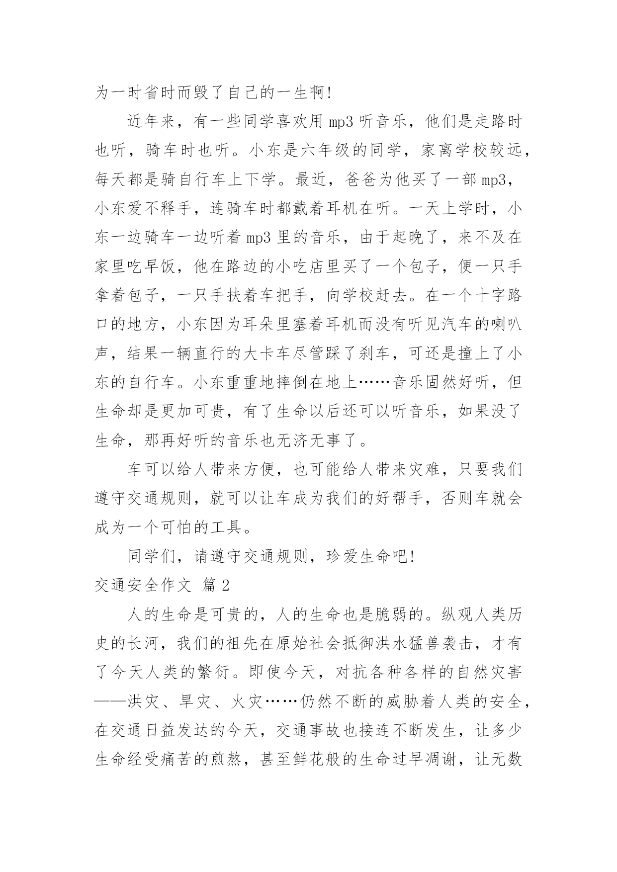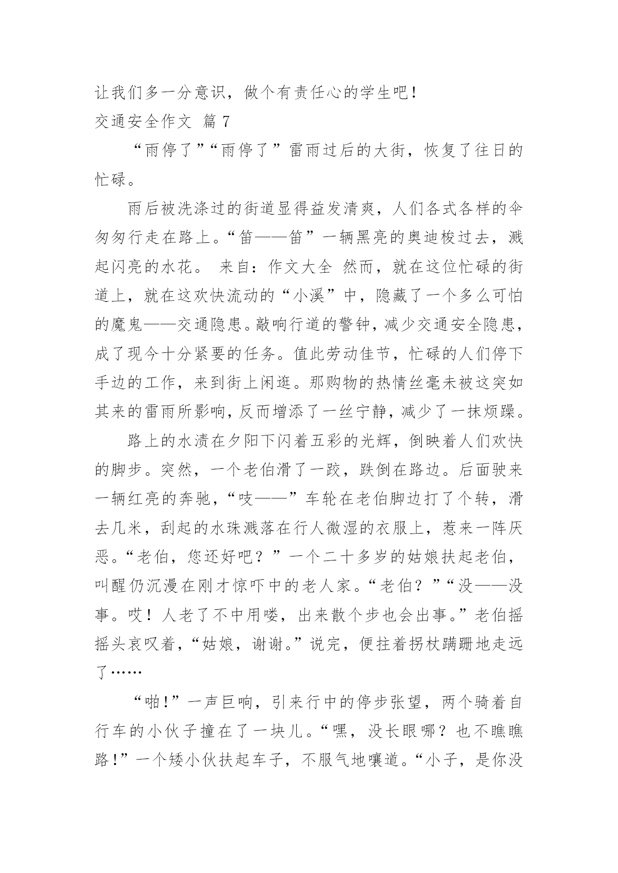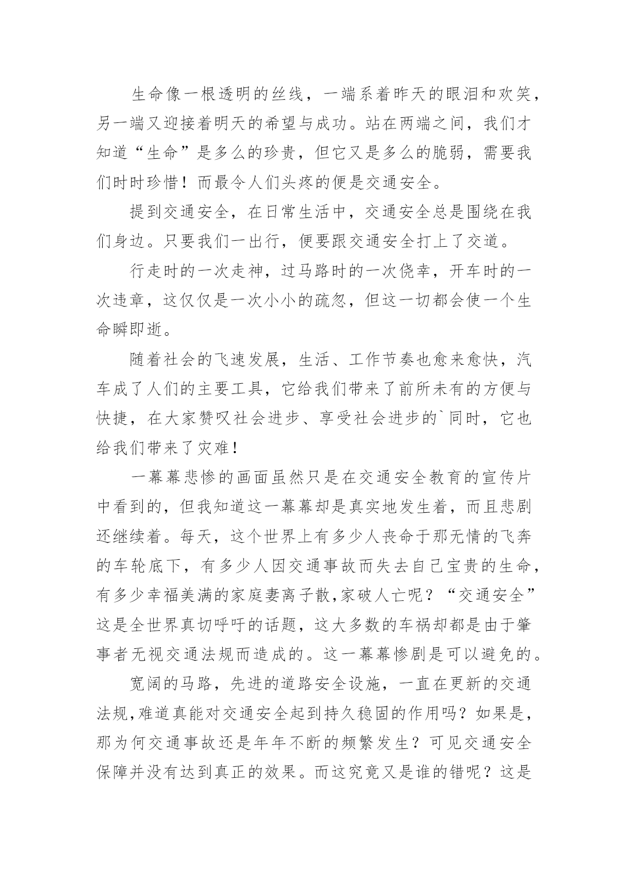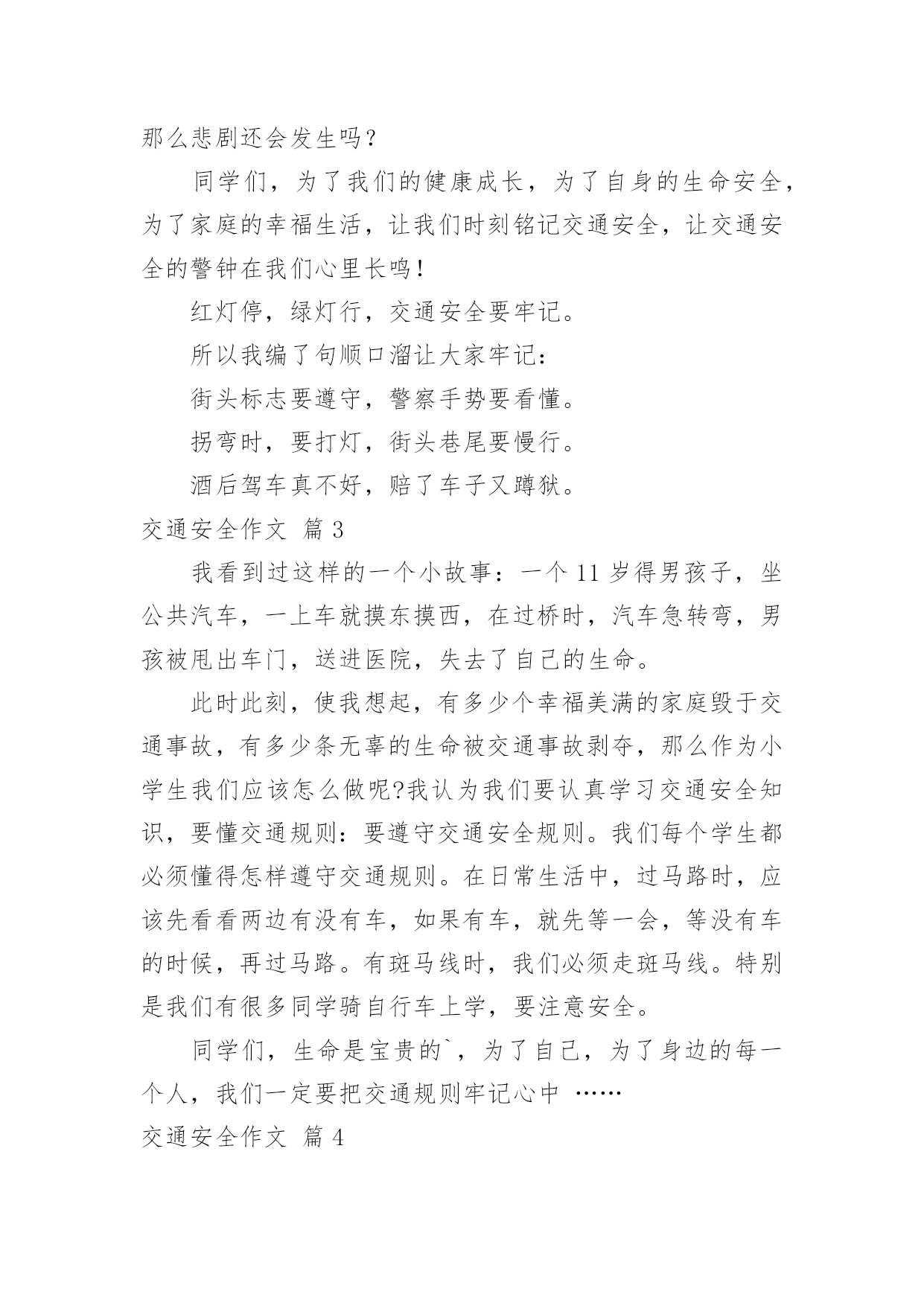 交通安全作文【必备】交通安全作文合集7篇在平凡的学习、工作、生活中,大家或多或少都会接触过作文吧,写作文可以锻炼我们的独处习惯,让自己的心静下来,思考自己未来的方向。相信很多朋友都对写作文感到非常苦恼吧,下面是小编精心整理的交通安全作文7篇,希望能够帮助到大家。交通安全作文篇1有这样一句话:当你遵守交通规则时,安全与你同行;当你违反交通规则时,危险正向你走来。我觉得这句话说得很好,我们只有自觉遵守交通规则才能一生平安。在生活中,家长和老师也经常叮嘱我们,要遵守交通规则。然而还是有许多同学听不进去,依然我行我素,直到最后酿成了悲剧。我的同学小明,就是一个活生生的例子。小明是一个篮球健将,是学校篮球队的主力。一天早上,小明因为起床迟了,眼看上课就要迟到了。他急匆匆地赶往学校,到了学校对面的马路上,为了节省时间,小明没有走在人行横道线上,而是翻越了马路中间的隔离防护栏。谁知,小明的双脚刚落地,一辆疾驰而过的面包车将他撞倒在地上,结果造成了腿骨骨折。从此,小明再也不能打篮球了。如果当初小明宁愿多花几分钟时间去走人行横道,就不会发生这样惨痛的`事了,也不会为此放弃了自己的爱好。这件事给了我一个深刻的教训:过马路时一定要走人行横道,不要因为一时省时而毁了自己的一生啊!近年来,有一些同学喜欢用mp3听音乐,他们是走路时也听,骑车时也听。小东是六年级的同学,家离学校较远,每天都是骑自行车上下学。最近,爸爸为他买了一部mp3,小东爱不释手,连骑车时都戴着耳机在听。一天上学时,小东一边骑车一边听着mp3里的音乐,由于起晚了,来不及在家里吃早饭,他在路边的小吃店里买了一个包子,便一只手拿着包子,一只手扶着车把手,向学校赶去。在一个十字路口的地方,小东因为耳朵里塞着耳机而没有听见汽车的喇叭声,结果一辆直行的大卡车尽管踩了刹车,可还是撞上了小东的自行车。小东重重地摔倒在地上……音乐固然好听,但生命却是更加可贵,有了生命以后还可以听音乐,如果没了生命,那再好听的音乐也无济无事了。车可以给人带来方便,也可能给人带来灾难,只要我们遵守交通规则,就可以让车成为我们的好帮手,否则车就会成为一个可怕的工具。同学们,请遵守交通规则,珍爱生命吧!交通安全作文篇2人的生命是可贵的,人的生命也是脆弱的。纵观人类历史的长河,我们的祖先在原始社会抵御洪水猛兽袭击,才有了今天人类的繁衍。即使今天,对抗各种各样的自然灾害——洪灾、旱灾、火灾……仍然不断的威胁着人类的安全,在交通日益发达的今天,交通事故也接连不断发生,让多少生命经受痛苦的煎熬,甚至鲜花般的生命过早凋谢,让无数家庭蒙上阴影。而我们的身边,也不乏曾经因为忽略交通安全而尝尽苦头的事情,带给我们不该承受的伤痛。我的同学A是个长得标标致致的男孩,运动场上常可以见到他矫健的'身姿,尤其是篮球场上,更是一员勇将。可是却因为一次意外的交通事故,至今还靠拄着拐杖过日子。不幸的事情发生在暑假,那时,A因为特别向往和自己年纪差不多的人骑着摩托车兜风,羡慕他们的神气和潇洒。于是就和父亲商量,也要学着骑摩托,虽然家长不愿意,可到底因为拗不过孩子,答应有空的时候指点指点。没想到,A同学接受能力特强,没多大工夫,就能够自己操纵驾驶。从此,只要摩托车一有空,他就想尽办法骑着出去溜达溜达,就在他自认为摩托车水平日臻熟练的时候,有一天他骑着摩托车回家,在离家不远的一个拐弯处,突然有一辆大货车迎面而来,由于摩托车车速太快,他无法面对突如其来的意外,慌了,来不及刹车、也无法控制摩托车的方向,就面对面硬生生的撞向了货车……当他在医院里痛不欲生的时候,要面对的就是无法承受的事实,脚部骨头断了几根,必须接受完全卧床两个多月的治疗,才能够勉强拄着拐杖走路,脚部的骨头用钢钎栓住,露在外面,让人看了都胆战心惊……因为忽略了交通安全,A同学给自己和家庭造成了多大的伤害,事情过去几个月了,每天,都还要由家长接送上学放学、在学校需要同学照顾,是多么不方便……我想此刻,留给他的,大概只有无尽的悔恨吧。如果他能够自觉遵守交通安全,在没有取得摩托车驾驶证的时候,不骑摩托车上路,那么悲剧还会发生吗?同学们,为了我们的健康成长,为了自身的生命安全,为了家庭的幸福生活,让我们时刻铭记交通安全,让交通安全的警钟在我们心里长鸣!红灯停,绿灯行,交通安全要牢记。所以我编了句顺口溜让大家牢记:街头标志要遵守,警察手势要看懂。拐弯时,要打灯,街头巷尾要慢行。酒后驾车真不好,赔了车子又蹲狱。交通安全作文篇3我看到过这样的一个小故事:一个11岁得男孩子,坐公共汽车,一上车就摸东摸西,在过桥时,汽车急转弯,男孩被甩出车门,送进医院,失去了自己的生命。此时此刻,使我想起,有多少个幸福美满的家庭毁于交通事故,有多少条无辜的生命被交通事故剥夺,那么作为小学生我们应该怎么做呢?我认为我们要认真学习交通安
