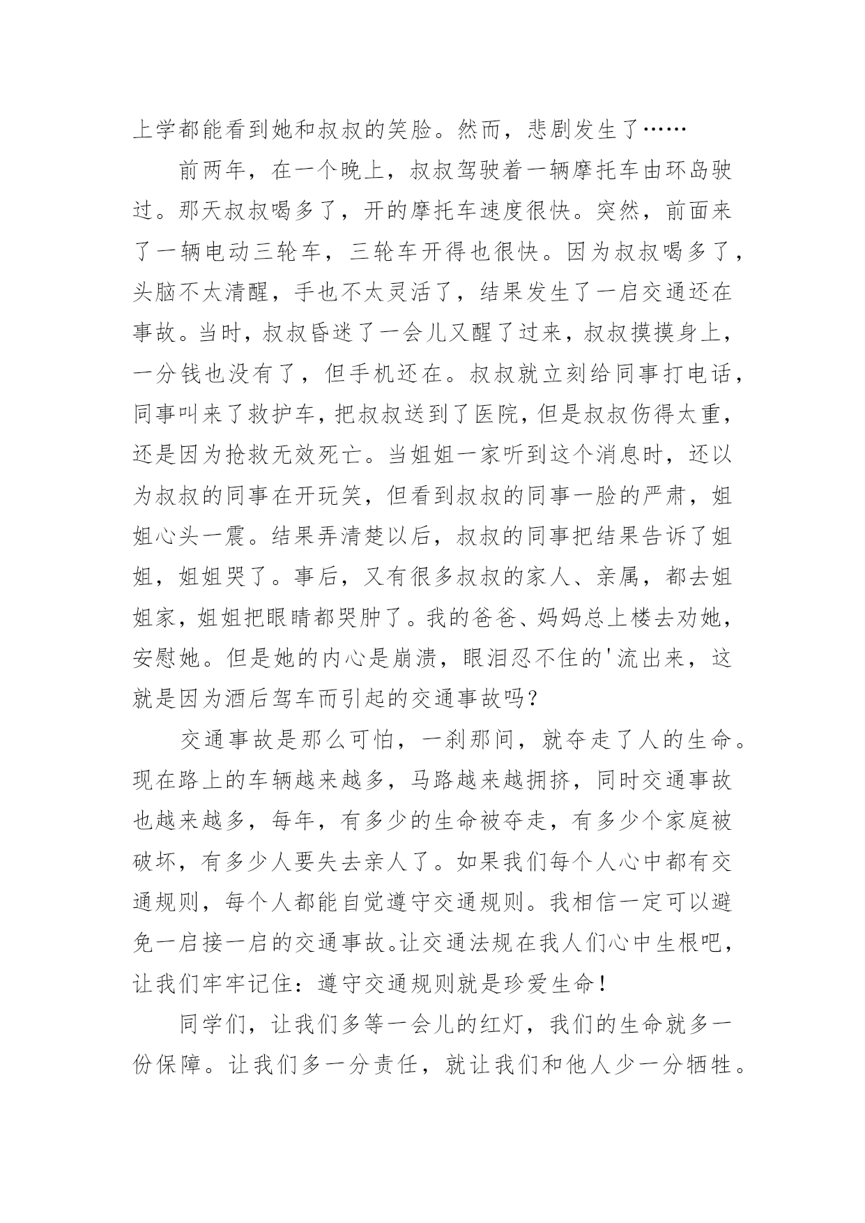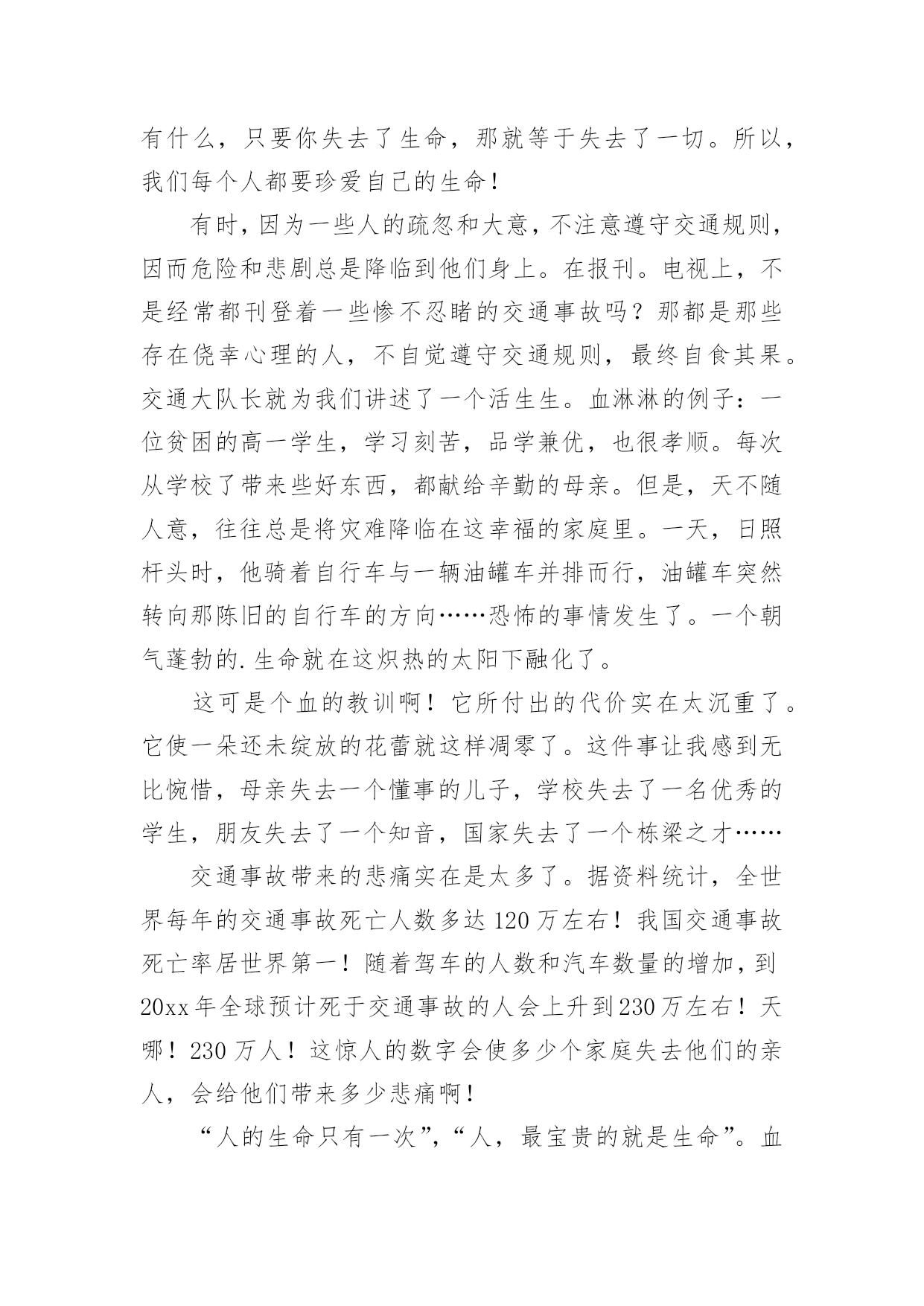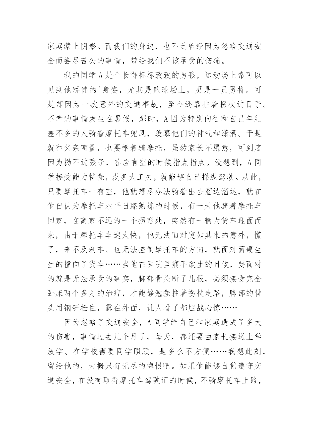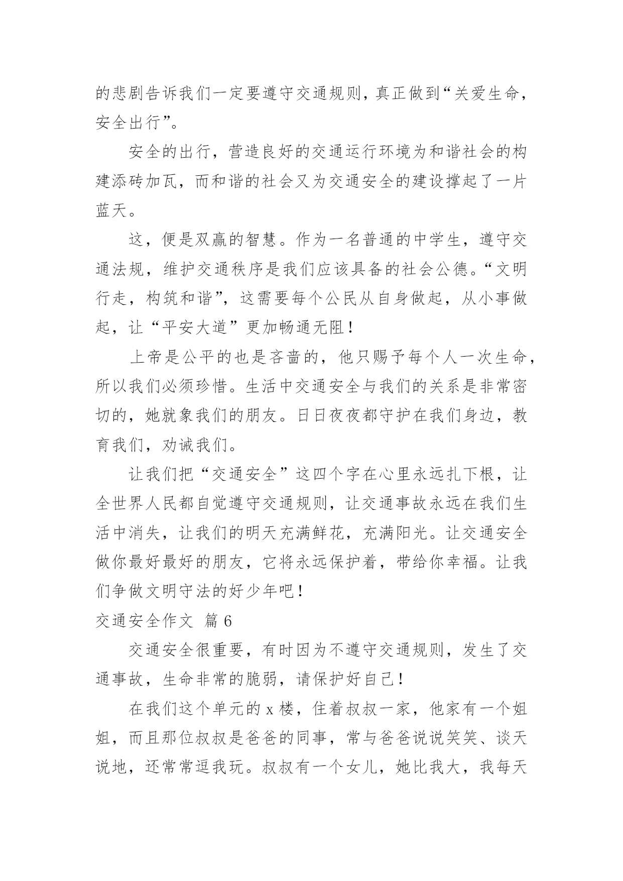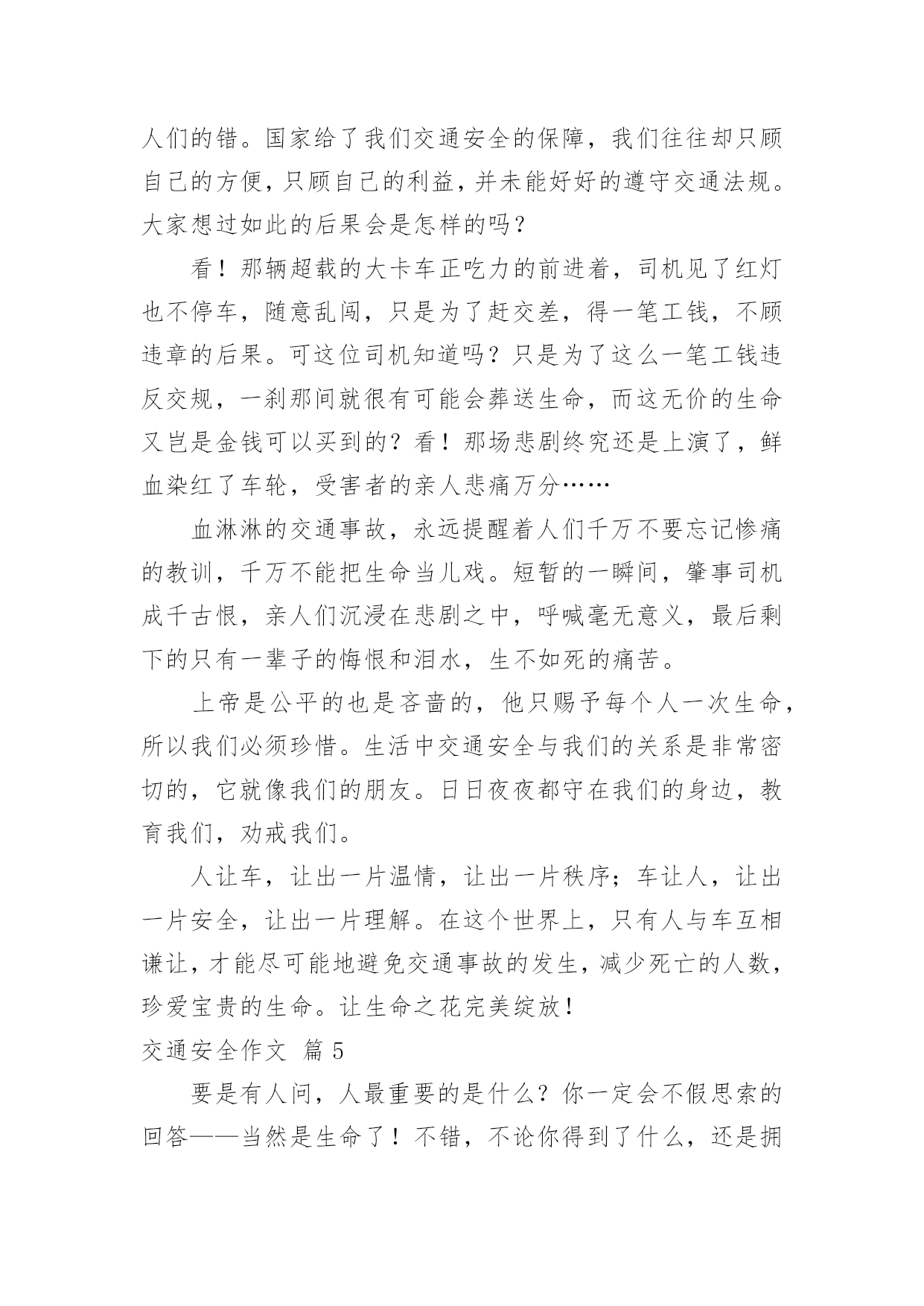 交通安全作文【必备】交通安全作文合集7篇在平凡的学习、工作、生活中,大家或多或少都会接触过作文吧,写作文可以锻炼我们的独处习惯,让自己的心静下来,思考自己未来的方向。相信很多朋友都对写作文感到非常苦恼吧,下面是小编精心整理的交通安全作文7篇,希望能够帮助到大家。交通安全作文篇1有这样一句话:当你遵守交通规则时,安全与你同行;当你违反交通规则时,危险正向你走来。我觉得这句话说得很好,我们只有自觉遵守交通规则才能一生平安。在生活中,家长和老师也经常叮嘱我们,要遵守交通规则。然而还是有许多同学听不进去,依然我行我素,直到最后酿成了悲剧。我的同学小明,就是一个活生生的例子。小明是一个篮球健将,是学校篮球队的主力。一天早上,小明因为起床迟了,眼看上课就要迟到了。他急匆匆地赶往学校,到了学校对面的马路上,为了节省时间,小明没有走在人行横道线上,而是翻越了马路中间的隔离防护栏。谁知,小明的双脚刚落地,一辆疾驰而过的面包车将他撞倒在地上,结果造成了腿骨骨折。从此,小明再也不能打篮球了。如果当初小明宁愿多花几分钟时间去走人行横道,就不会发生这样惨痛的`事了,也不会为此放弃了自己的爱好。这件事给了我一个深刻的教训:过马路时一定要走人行横道,不要因为一时省时而毁了自己的一生啊!近年来,有一些同学喜欢用mp3听音乐,他们是走路时也听,骑车时也听。小东是六年级的同学,家离学校较远,每天都是骑自行车上下学。最近,爸爸为他买了一部mp3,小东爱不释手,连骑车时都戴着耳机在听。一天上学时,小东一边骑车一边听着mp3里的音乐,由于起晚了,来不及在家里吃早饭,他在路边的小吃店里买了一个包子,便一只手拿着包子,一只手扶着车把手,向学校赶去。在一个十字路口的地方,小东因为耳朵里塞着耳机而没有听见汽车的喇叭声,结果一辆直行的大卡车尽管踩了刹车,可还是撞上了小东的自行车。小东重重地摔倒在地上……音乐固然好听,但生命却是更加可贵,有了生命以后还可以听音乐,如果没了生命,那再好听的音乐也无济无事了。车可以给人带来方便,也可能给人带来灾难,只要我们遵守交通规则,就可以让车成为我们的好帮手,否则车就会成为一个可怕的工具。同学们,请遵守交通规则,珍爱生命吧!交通安全作文篇2人的生命是可贵的,人的生命也是脆弱的。纵观人类历史的长河,我们的祖先在原始社会抵御洪水猛兽袭击,才有了今天人类的繁衍。即使今天,对抗各种各样的自然灾害——洪灾、旱灾、火灾……仍然不断的威胁着人类的安全,在交通日益发达的今天,交通事故也接连不断发生,让多少生命经受痛苦的煎熬,甚至鲜花般的生命过早凋谢,让无数家庭蒙上阴影。而我们的身边,也不乏曾经因为忽略交通安全而尝尽苦头的事情,带给我们不该承受的伤痛。我的同学A是个长得标标致致的男孩,运动场上常可以见到他矫健的'身姿,尤其是篮球场上,更是一员勇将。可是却因为一次意外的交通事故,至今还靠拄着拐杖过日子。不幸的事情发生在暑假,那时,A因为特别向往和自己年纪差不多的人骑着摩托车兜风,羡慕他们的神气和潇洒。于是就和父亲商量,也要学着骑摩托,虽然家长不愿意,可到底因为拗不过孩子,答应有空的时候指点指点。没想到,A同学接受能力特强,没多大工夫,就能够自己操纵驾驶。从此,只要摩托车一有空,他就想尽办法骑着出去溜达溜达,就在他自认为摩托车水平日臻熟练的时候,有一天他骑着摩托车回家,在离家不远的一个拐弯处,突然有一辆大货车迎面而来,由于摩托车车速太快,他无法面对突如其来的意外,慌了,来不及刹车、也无法控制摩托车的方向,就面对面硬生生的撞向了货车……当他在医院里痛不欲生的时候,要面对的就是无法承受的事实,脚部骨头断了几根,必须接受完全卧床两个多月的治疗,才能够勉强拄着拐杖走路,脚部的骨头用钢钎栓住,露在外面,让人看了都胆战心惊……因为忽略了交通安全,A同学给自己和家庭造成了多大的伤害,事情过去几个月了,每天,都还要由家长接送上学放学、在学校需要同学照顾,是多么不方便……我想此刻,留给他的,大概只有无尽的悔恨吧。如果他能够自觉遵守交通安全,在没有取得摩托车驾驶证的时候,不骑摩托车上路,那么悲剧还会发生吗?同学们,为了我们的健康成长,为了自身的生命安全,为了家庭的幸福生活,让我们时刻铭记交通安全,让交通安全的警钟在我们心里长鸣!红灯停,绿灯行,交通安全要牢记。所以我编了句顺口溜让大家牢记:街头标志要遵守,警察手势要看懂。拐弯时,要打灯,街头巷尾要慢行。酒后驾车真不好,赔了车子又蹲狱。交通安全作文篇3我看到过这样的一个小故事:一个11岁得男孩子,坐公共汽车,一上车就摸东摸西,在过桥时,汽车急转弯,男孩被甩出车门,送进医院,失去了自己的生命。此时此刻,使我想起,有多少个幸福美满的家庭毁于交通事故,有多少条无辜的生命被交通事故剥夺,那么作为小学生我们应该怎么做呢?我认为我们要认真学习交通安