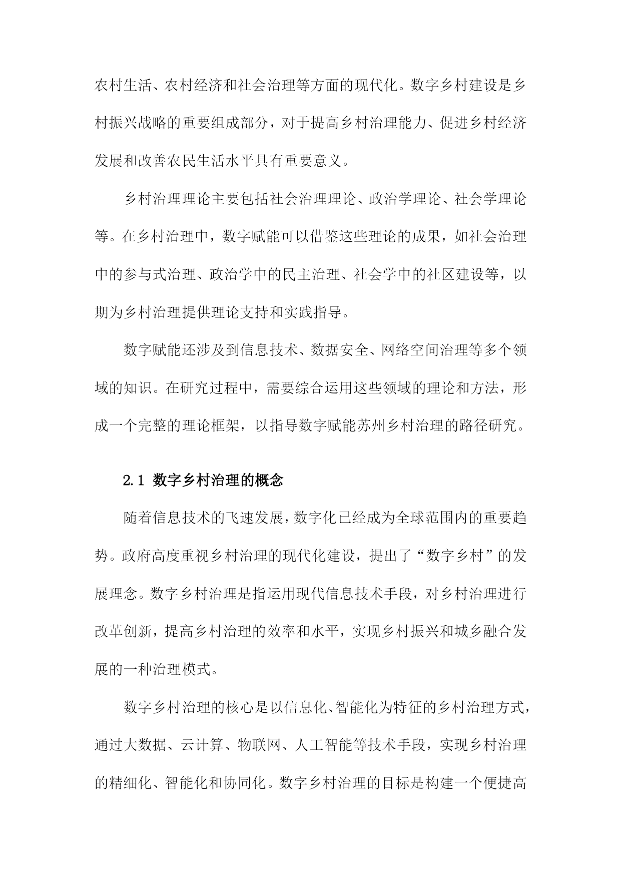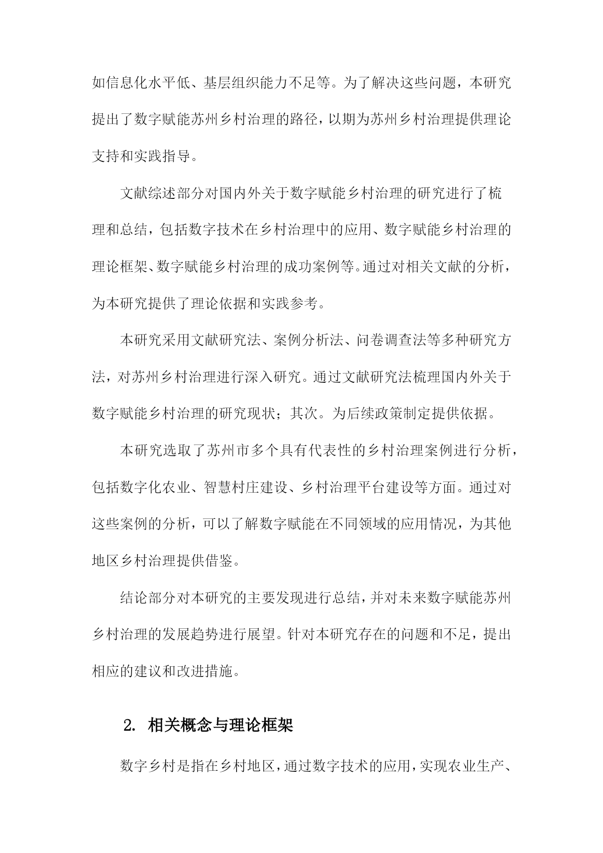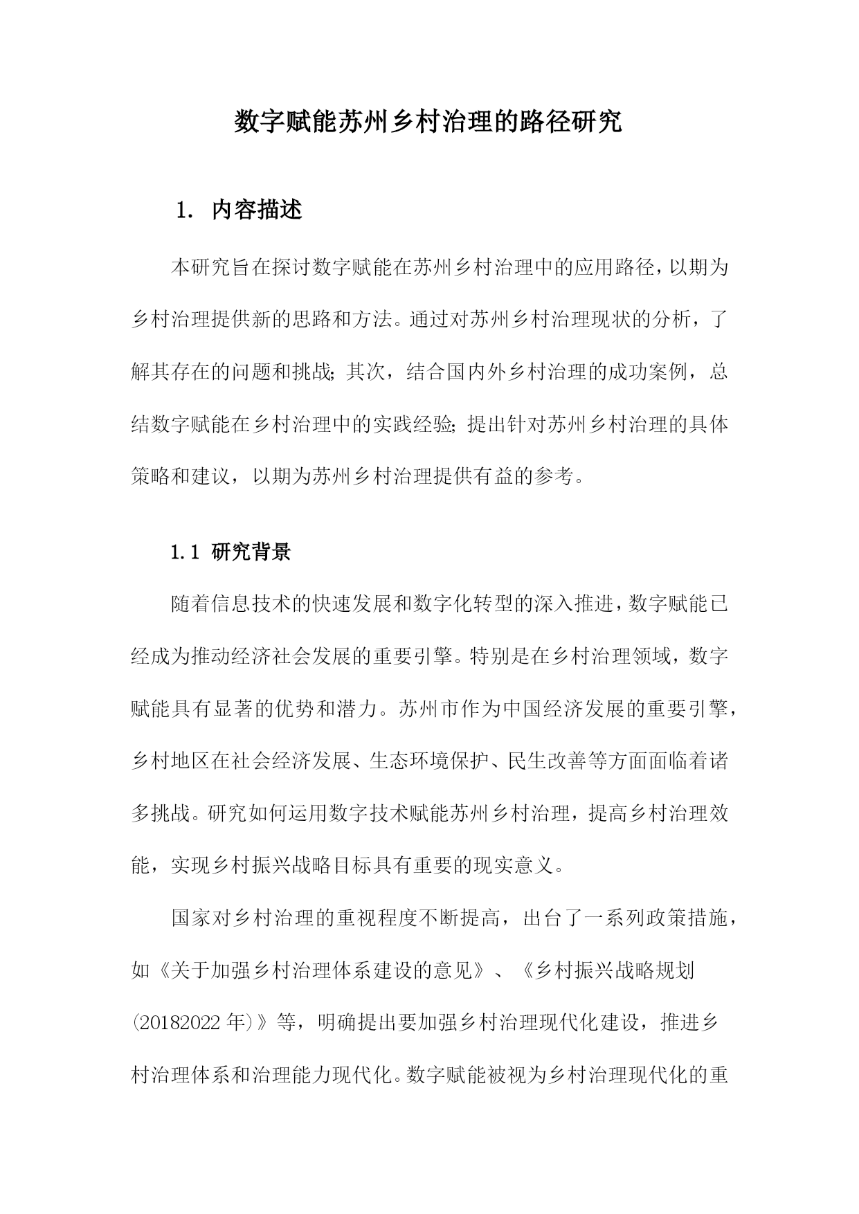 数字赋能苏州乡村治理的路径研究1.内容描述本研究旨在探讨数字赋能在苏州乡村治理中的应用路径,以期为乡村治理提供新的思路和方法。通过对苏州乡村治理现状的分析,了解其存在的问题和挑战;其次,结合国内外乡村治理的成功案例,总结数字赋能在乡村治理中的实践经验;提出针对苏州乡村治理的具体策略和建议,以期为苏州乡村治理提供有益的参考。1.1研究背景随着信息技术的快速发展和数字化转型的深入推进,数字赋能已经成为推动经济社会发展的重要引擎。特别是在乡村治理领域,数字赋能具有显著的优势和潜力。苏州市作为中国经济发展的重要引擎,乡村地区在社会经济发展、生态环境保护、民生改善等方面面临着诸多挑战。研究如何运用数字技术赋能苏州乡村治理,提高乡村治理效能,实现乡村振兴战略目标具有重要的现实意义。国家对乡村治理的重视程度不断提高,出台了一系列政策措施,如《关于加强乡村治理体系建设的意见》、《乡村振兴战略规划(20182022年)》等,明确提出要加强乡村治理现代化建设,推进乡村治理体系和治理能力现代化。数字赋能被视为乡村治理现代化的重要手段之一,对于提高乡村治理效能具有重要意义。苏州市乡村地区在经济、社会、文化等方面取得了显著的发展成果,但同时也面临着一些问题,如基层组织薄弱、村务公开不透明、乡村治理能力不足等。这些问题在一定程度上制约了苏州市乡村治理水平的提升,研究如何在现有基础上运用数字技术赋能苏州乡村治理,提高乡村治理水平具有重要的现实意义。学术界对数字赋能乡村治理的研究逐渐增多,提出了一系列理论观点和方法。这些研究成果为本文的研究提供了理论基础和参考依据。研究数字赋能苏州乡村治理的路径具有重要的现实意义和理论价值。本研究将从政策背景、苏州市乡村治理现状和数字赋能理论基础等方面入手,探讨数字赋能苏州乡村治理的有效路径,为苏州市乡村治理提供有益的借鉴和启示。1.2研究目的分析当前苏州乡村治理面临的挑战和问题,如信息不对称、资源配置不合理、服务供给不足等,为乡村治理提供理论支持。梳理数字技术在乡村治理中的应用现状,包括智慧农业、智慧社区、智慧政务等方面的典型案例,总结经验教训。构建数字赋能苏州乡村治理的理论框架,提出数字技术在乡村治理中的适用场景和方法,为政策制定提供参考。设计并实施一套数字赋能苏州乡村治理的实践方案,通过试点项目验证方案的有效性,为全面推进乡村治理现代化提供实践经验。1.3研究方法本研究采用文献分析法、实地调研法和案例分析法相结合的研究方法,以全面了解数字赋能苏州乡村治理的现状、问题和发展趋势。通过收集和整理国内外关于数字赋能乡村治理的相关文献资料,对数字赋能的理论体系、实践经验和技术应用进行深入研究,为后续实地调研提供理论支持。根据苏州市乡村治理的特点和需求,选择具有代表性的乡村进行实地调研,了解其数字化治理的现状、问题和挑战,以及取得的成效。通过对典型案例的分析,总结提炼数字赋能苏州乡村治理的成功经验和可行路径,为政策制定和实践提供参考。在研究过程中,本研究将充分利用互联网、大数据、人工智能等现代信息技术手段,对苏州市乡村治理的数据进行挖掘和分析,以期为数字赋能苏州乡村治理提供科学依据。本研究还将邀请相关领域的专家学者参与讨论,以确保研究的客观性和权威性。1.4论文结构引言部分主要介绍研究背景、研究目的、研究意义以及论文的结构安排。通过对乡村治理现状的分析,指出当前乡村治理面临的挑战,如信息化水平低、基层组织能力不足等。为了解决这些问题,本研究提出了数字赋能苏州乡村治理的路径,以期为苏州乡村治理提供理论支持和实践指导。文献综述部分对国内外关于数字赋能乡村治理的研究进行了梳理和总结,包括数字技术在乡村治理中的应用、数字赋能乡村治理的理论框架、数字赋能乡村治理的成功案例等。通过对相关文献的分析,为本研究提供了理论依据和实践参考。本研究采用文献研究法、案例分析法、问卷调查法等多种研究方法,对苏州乡村治理进行深入研究。通过文献研究法梳理国内外关于数字赋能乡村治理的研究现状;其次。为后续政策制定提供依据。本研究选取了苏州市多个具有代表性的乡村治理案例进行分析,包括数字化农业、智慧村庄建设、乡村治理平台建设等方面。通过对这些案例的分析,可以了解数字赋能在不同领域的应用情况,为其他地区乡村治理提供借鉴。结论部分对本研究的主要发现进行总结,并对未来数字赋能苏州乡村治理的发展趋势进行展望。针对本研究存在的问题和不足,提出相应的建议和改进措施。2.相关概念与理论框架数字乡村是指在乡村地区,通过数字技术的应用,实现农业生产、农村生活、农村经济和社会治理等方面的现代化。数字乡村建设是乡村振兴战略的重要组成部分,对于提高乡村治理能力、促进乡村经济发展和改善农民生活水平具有重要意义。乡村治理理论主要包括社会治